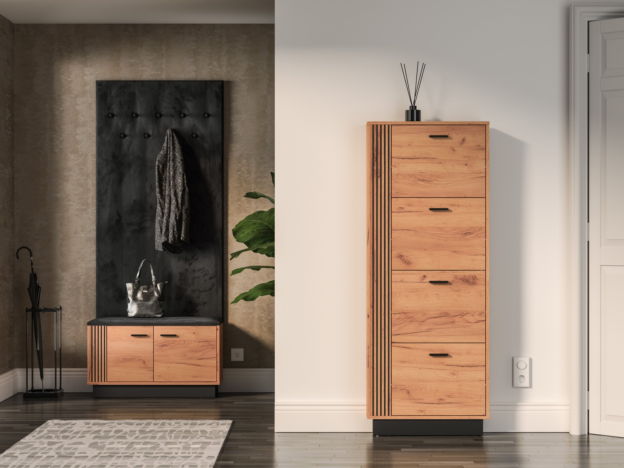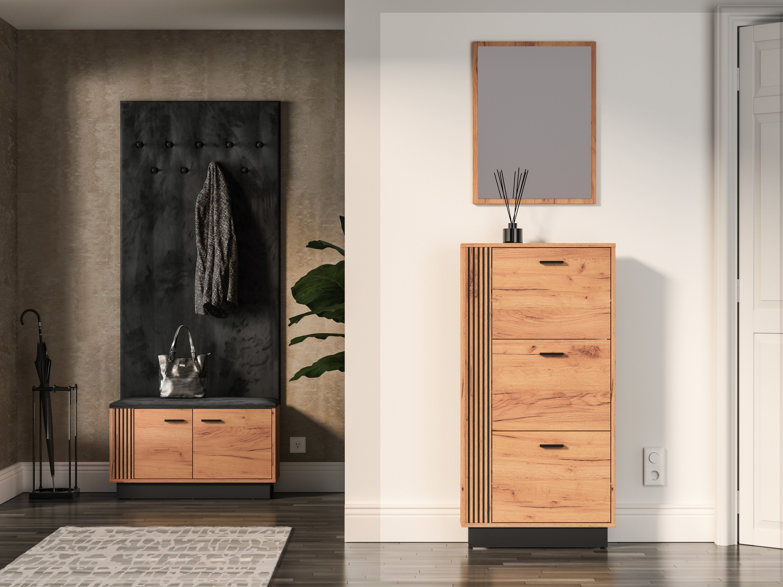 • Set za predsoblje Vasco je moderan i funkcionalan set namještaja u kombinaciji zlatnog hrasta i snažne crne boje.