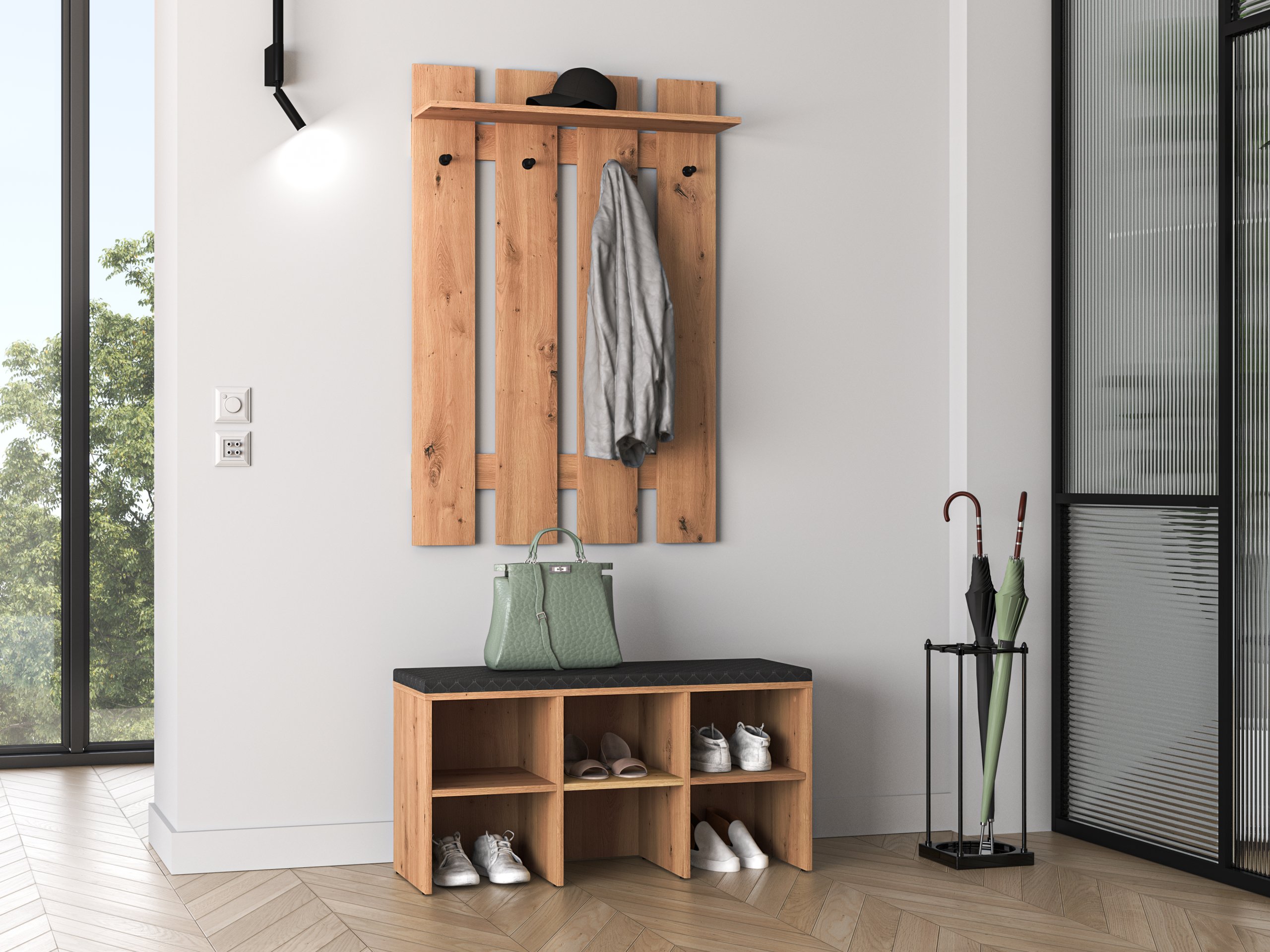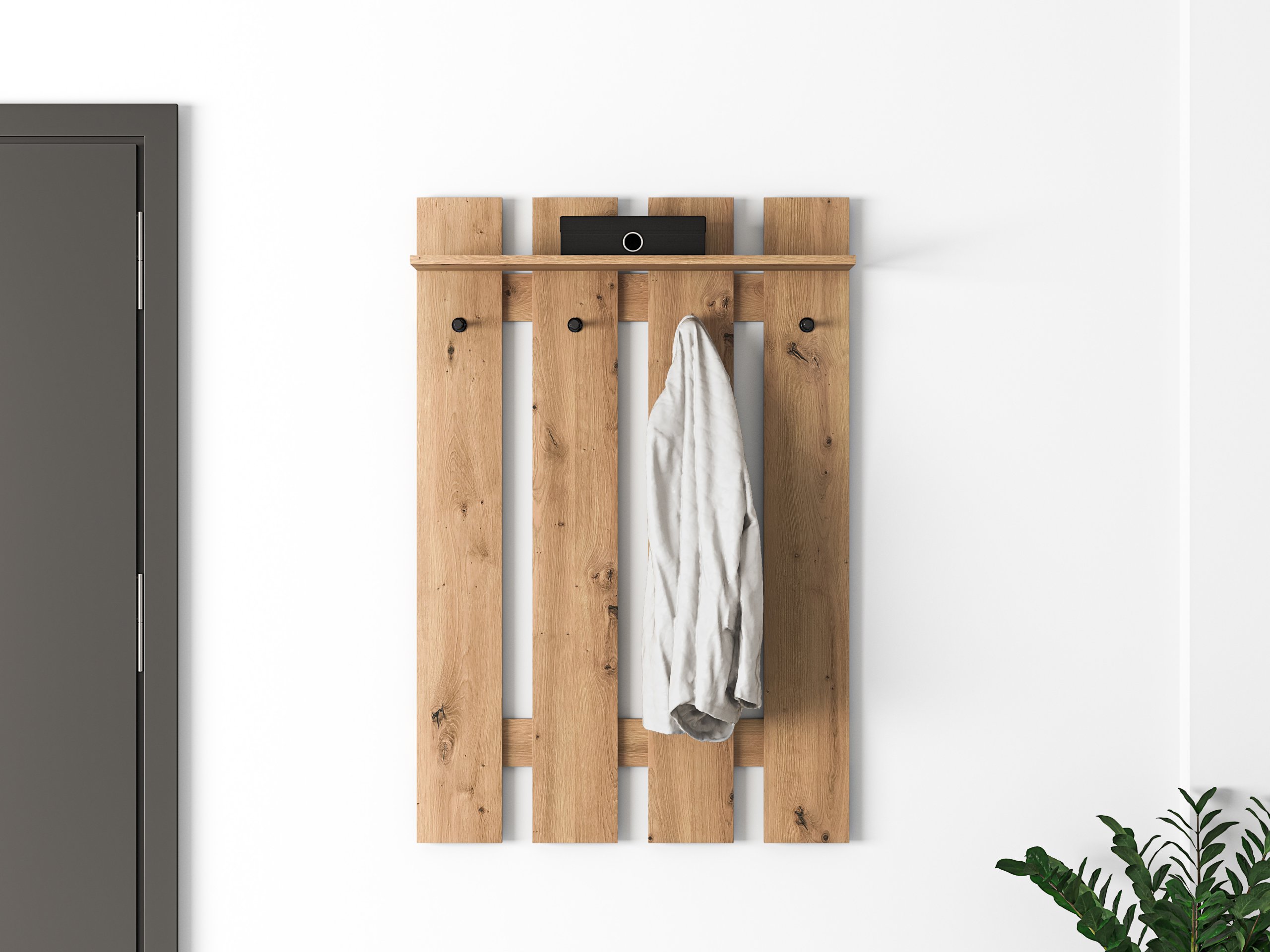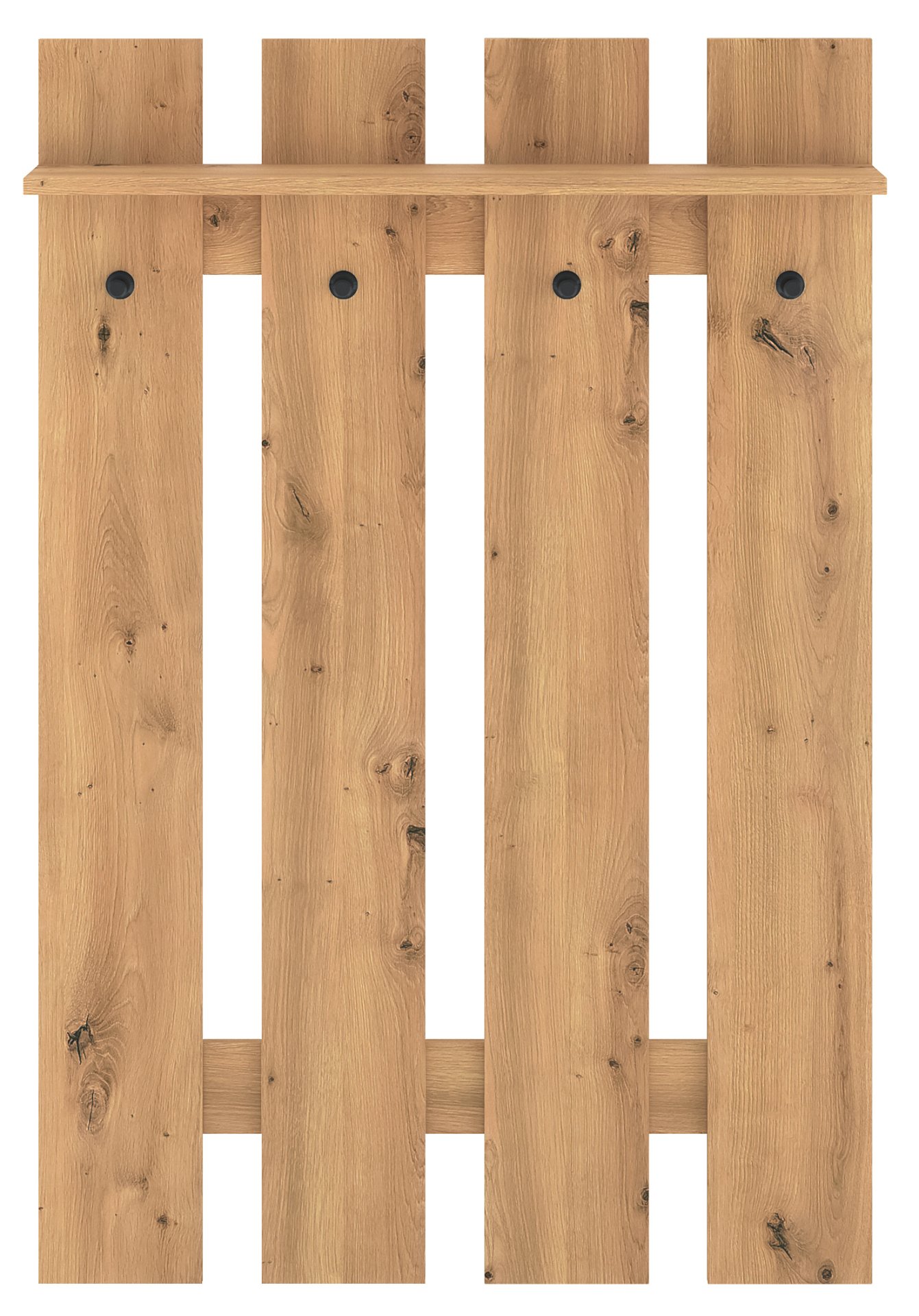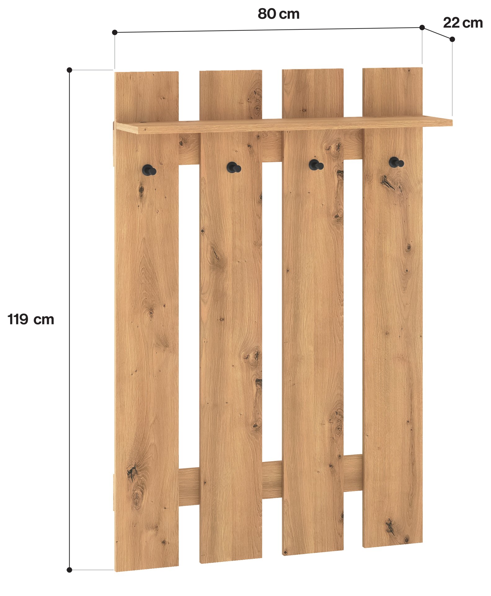 Vješalica Renes nije samo praktičan komad namještaja, već i estetski dodatak koji će obogatiti svaki prostor vašeg doma. S dimenzijama 80x22x119 cm idealna je za sve vrste interijera, bez obzira na to tražite li rješenje za predsoblje, spavaću sobu ili hodnik. Izrađena je od visokokvalitetnog MDF materijala koji osigurava čvrstoću i trajnost, a njezina boja u profinjenoj nijansi artisan hrasta unosi toplinu i prirodan izgled u prostor.