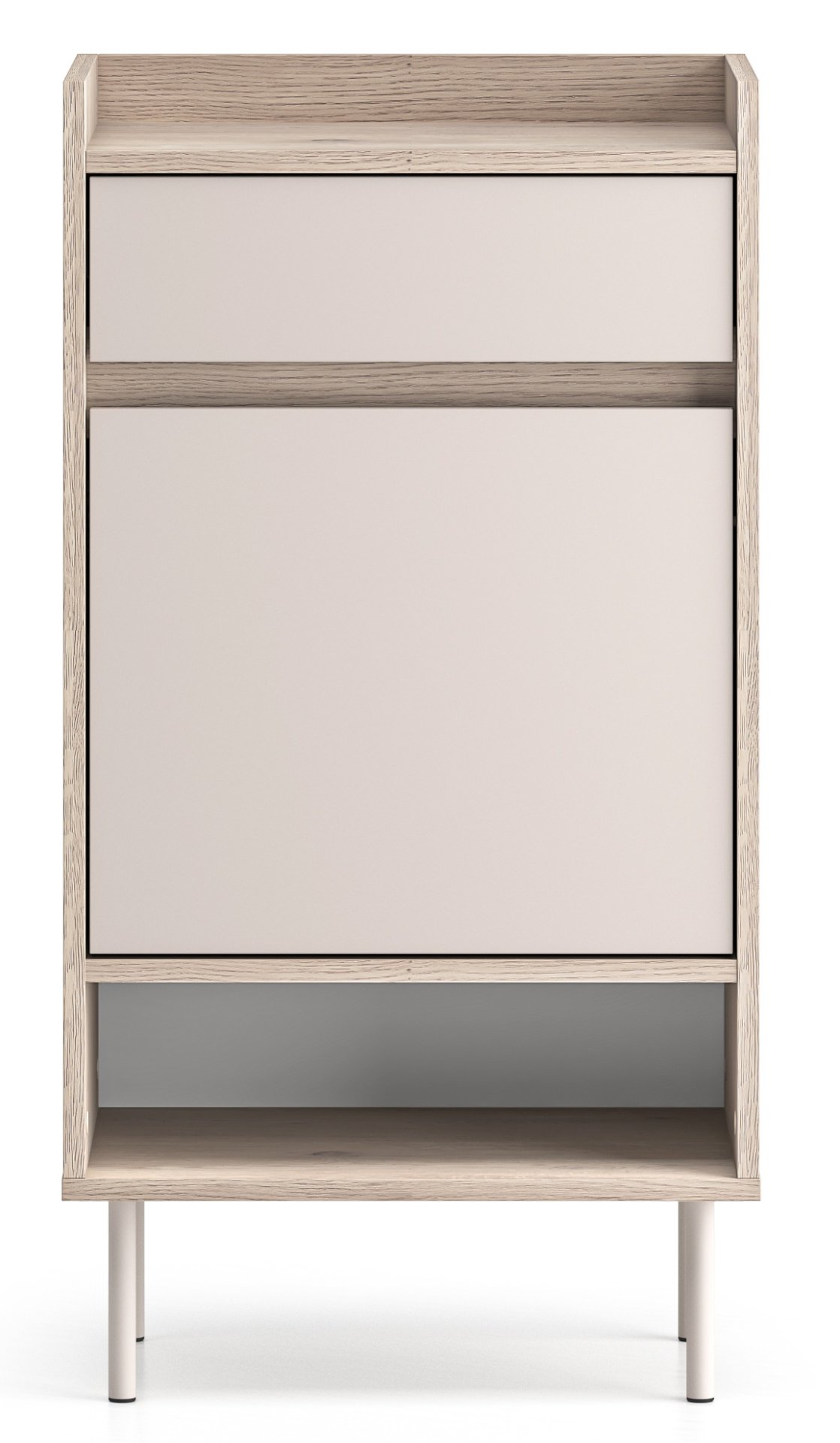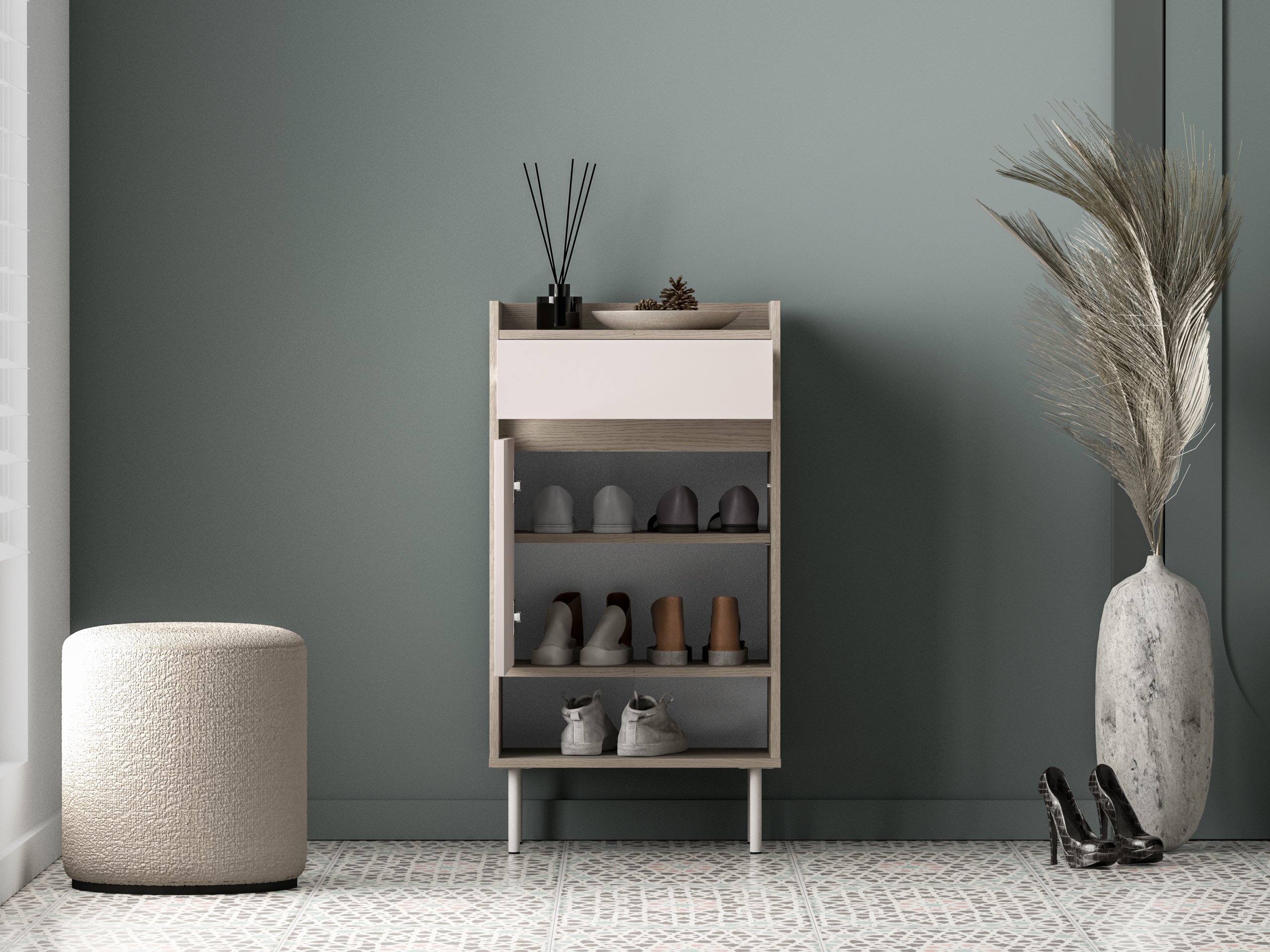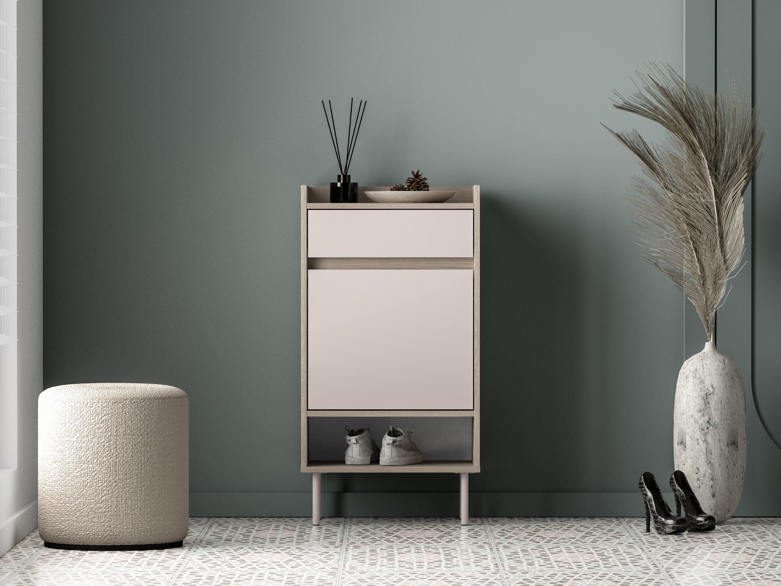 Kombinacija dviju nijansi – smirenog kašmira i toplog hrasta Cremona Terracotta – stvara ugodan kontrast koji se lijepo uklapa u različite sheme boja interijera. Ormarić za cipele Voco 04 odlično se slaže s ostalim elementima kolekcije Voco, ali zbog svoje univerzalne forme i boja može uspješno stajati i kao samostalan komad. Drveni dekor daje prostoru prirodan osjećaj topline, dok svjetliji ton kašmira osigurava dojam prozračnosti i reda.