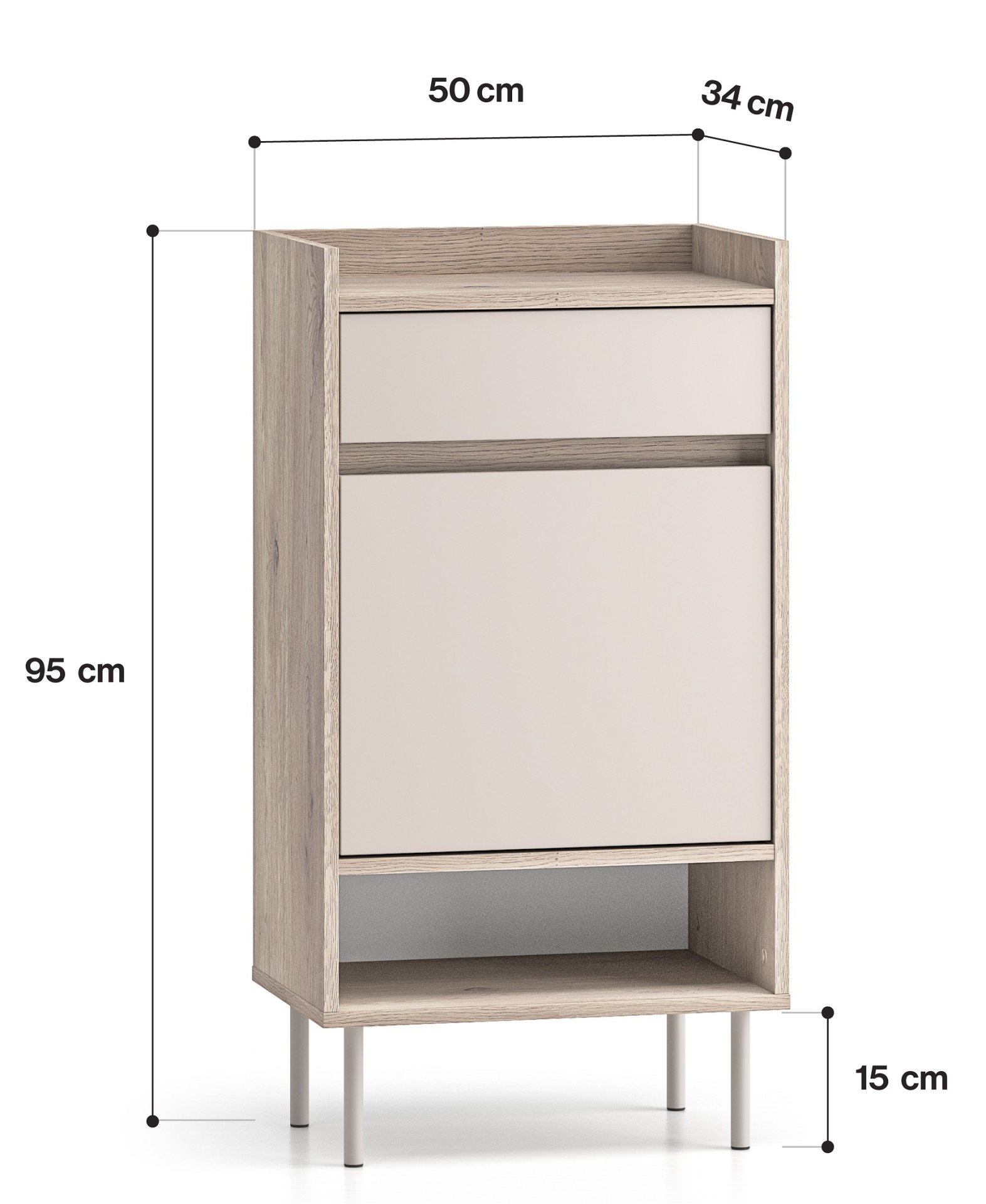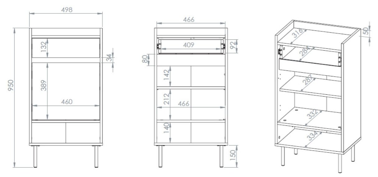 Ormarić mjeri 50 cm u širinu, 34 cm u dubinu i 95 cm u visinu. Dizajn omogućuje pohranu više pari cipela, pri čemu su police i ladica raspoređene tako da se prostor maksimalno iskoristi. Gornja ploča prikladna je za manje dodatke, poput torbica ili ključeva, jer podnosi maksimalno opterećenje od 10 kg. Istu težinu podnosi i unutarnja polica, dok ladica ima nosivost 5 kg. Ovakav raspored nudi ravnotežu između prostranosti i stabilnosti, što je ključno kod namještaja za svakodnevnu uporabu.