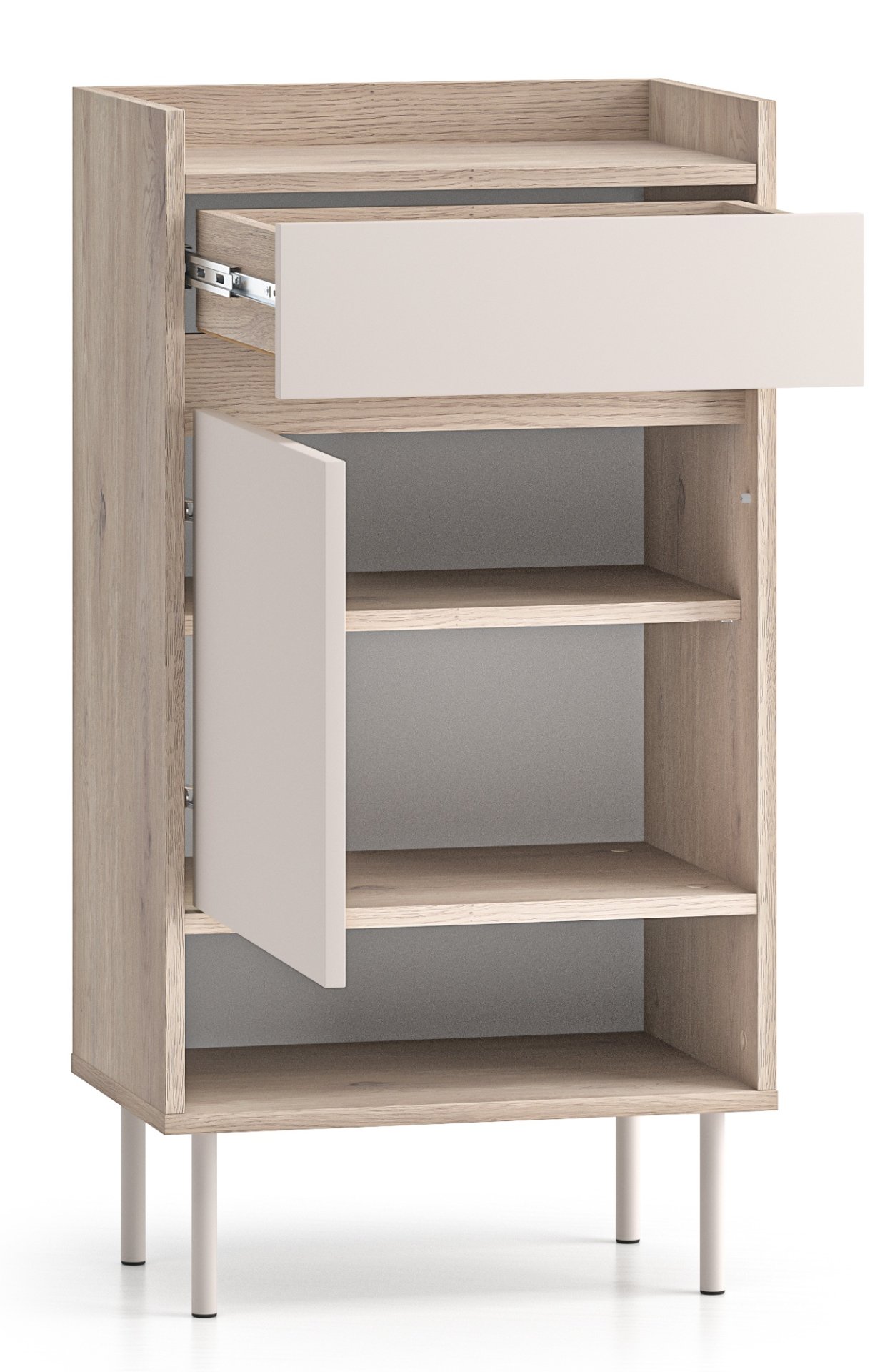 Vrata se otvaraju povlačenjem, što omogućuje jednostavan pristup sadržaju, bez obzira na to postavite li ormarić uza zid ili u uži hodnik. Ugrađen je tihi mehanizam zatvaranja, koji sprječava nepotrebno lupanje i štiti površinu od oštećenja. Ladica je postavljena na kugličnim vodilicama, što osigurava glatko i tiho klizanje. Takvo rješenje povećava udobnost uporabe i produžuje vijek trajanja namještajnih komponenti.