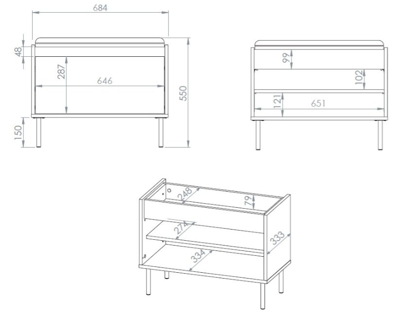 Baršunasta presvlaka na sjedećem dijelu omogućuje da se ormarić koristi i kao klupa za obuvanje, što je posebno praktično u manjim prostorima. Mekana površina pruža udobnost, dok čvrsta konstrukcija podnosi opterećenje do 100 kg. Zahvaljujući kombinaciji kvalitetnih materijala i precizne izrade, ormarić zadržava svoj izgled i funkcionalnost i nakon dugotrajne upotrebe.