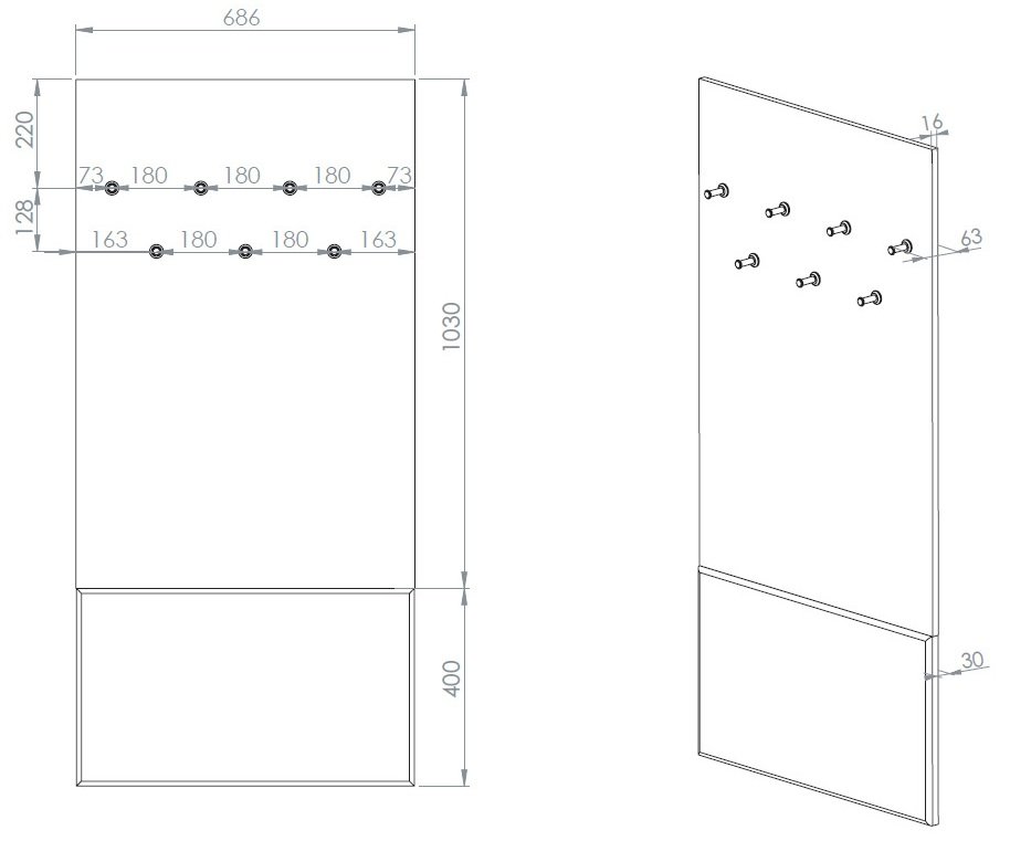 Dimenzije 69 cm širine, 6 cm dubine i 143 cm visine omogućuju da se vješalica postavi i u užim prostorima, a da pri tome ne izgubi funkcionalnu vrijednost. Svojim vitkim oblikom nudi dovoljno prostora za odlaganje kaputa, jakni, šalova i druge odjeće, a istovremeno zadržava prohodnost prostora. Zbog male dubine pogodna je za montažu uz ulaze ili u uskim hodnicima, gdje je svaki centimetar dragocjen. Unatoč kompaktnim mjerama, pruža vizualno bogat dojam i pomaže u održavanju reda u svakodnevnom životu.