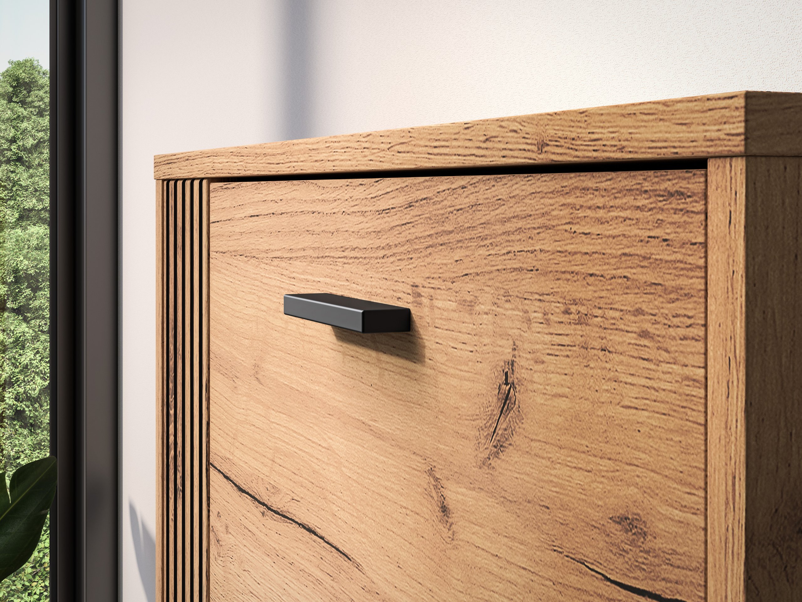 Jedna od najvećih prednosti ormara Vasco 11 je njegov funkcionalni dizajn. Zbog vertikalnog rasporeda omogućuje pohranu većeg broja pari cipela na maloj tlocrtnoj površini. To ga čini idealnim izborom za stanove gdje je prostor ograničen, ali i za veće obitelji koje trebaju dodatnu površinu za pohranu. Ormar je jednostavan za sastavljanje i održavanje – glatke površine omogućuju brzo čišćenje, što pridonosi očuvanju svježeg izgleda prostora. Osim praktičnosti donosi i estetsku vrijednost, jer njegov izgled s prirodnom teksturom drva i crnim linijama stvara ugodnu vizualnu ravnotežu.