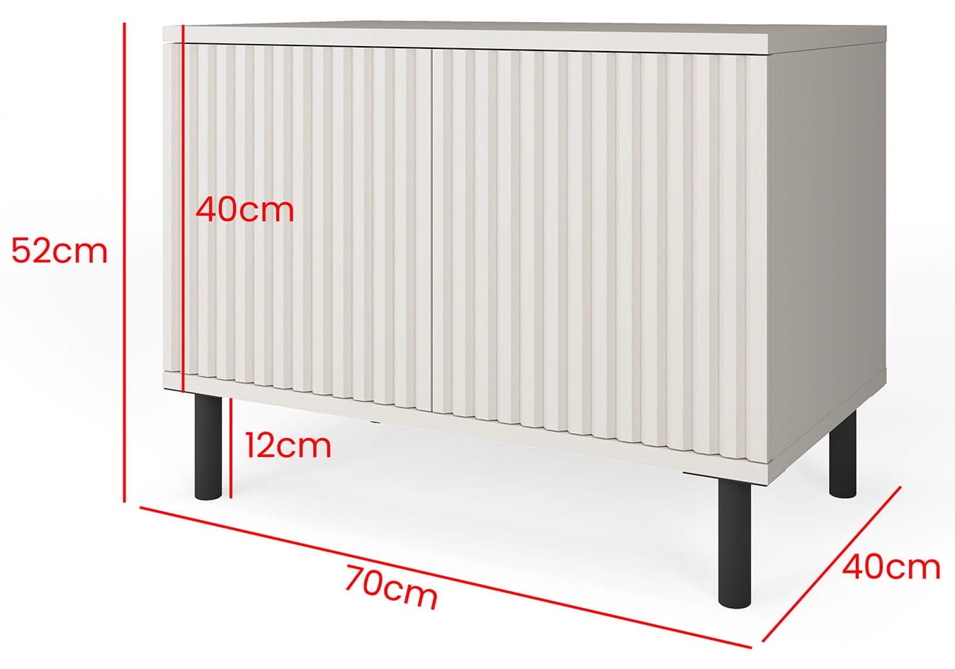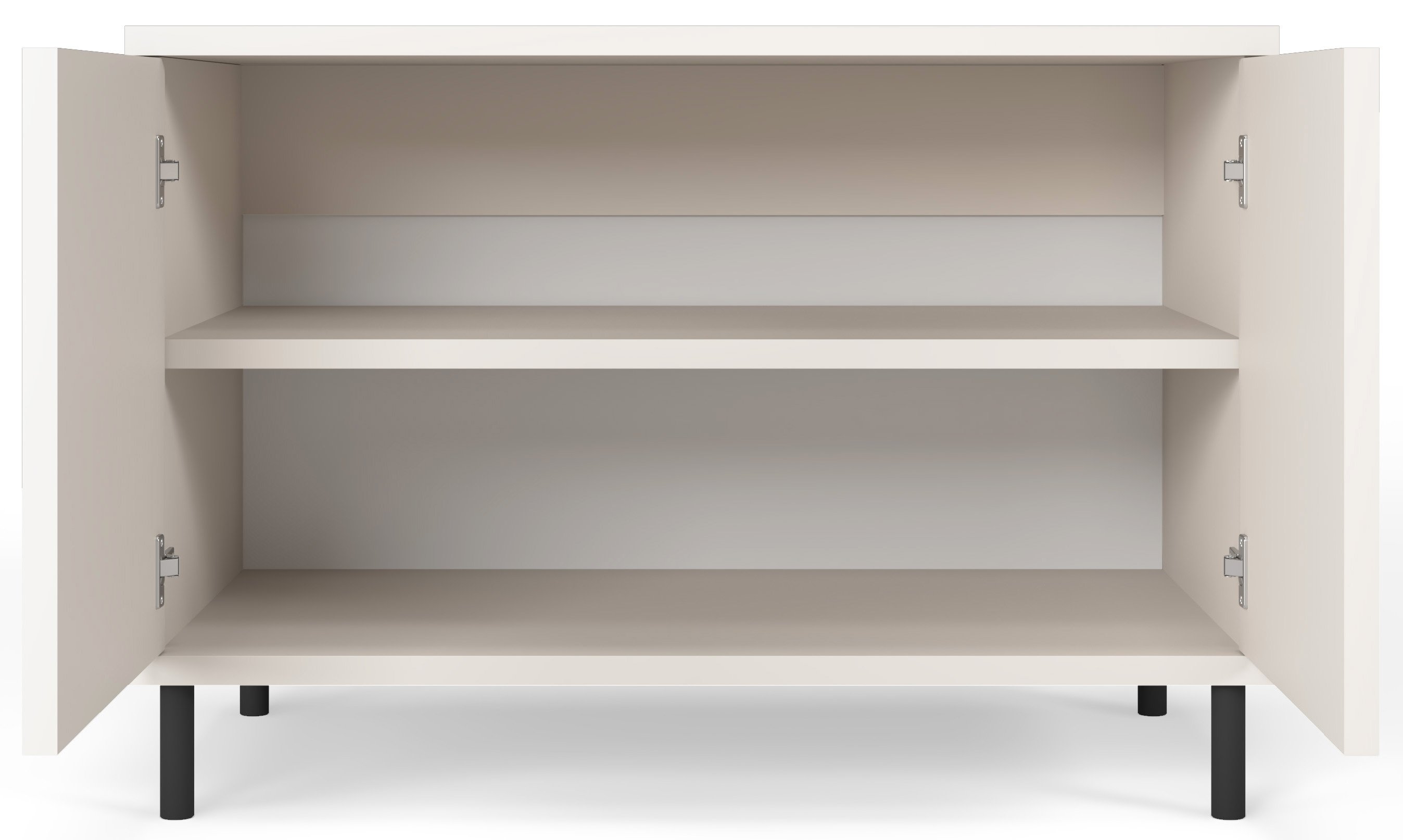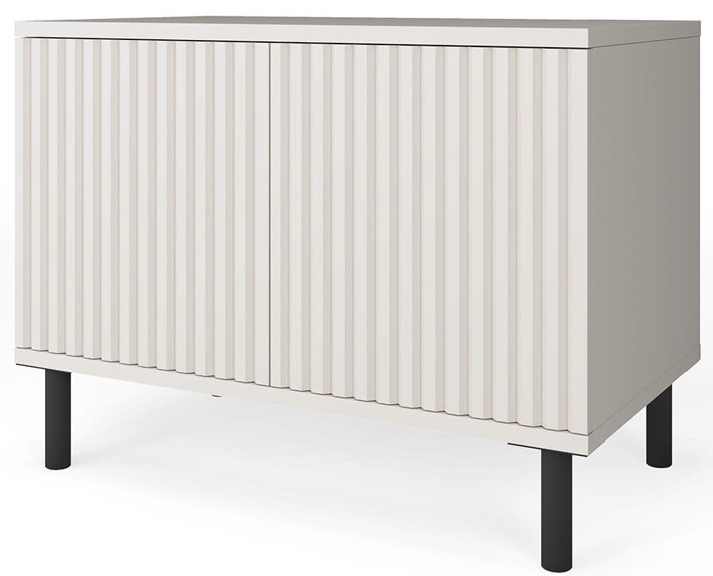 Metalne noge visine 12 cm ne samo da osiguravaju stabilnost konstrukcije, već i olakšavaju čišćenje ispod namještaja, što je posebno praktično u svakodnevnom održavanju doma. Zahvaljujući sustavu otvaranja na pritisak (push-to-open), vrata se otvaraju jednostavno i elegantno – bez vidljivih ručki, što naglašava minimalistički i suvremeni dizajn. Ovaj detalj čini komodu izuzetno funkcionalnom, ali i vizualno privlačnom, savršeno prilagođenom modernom načinu života.