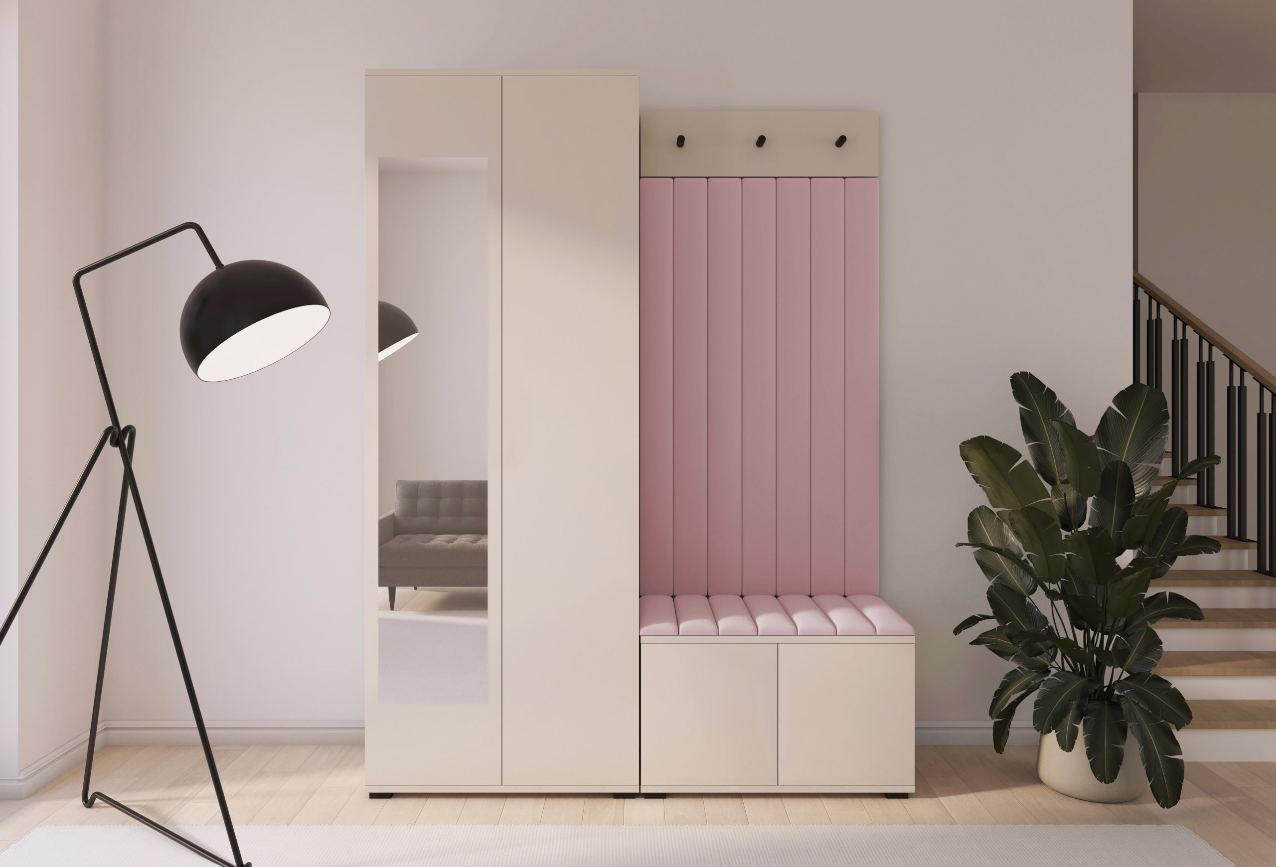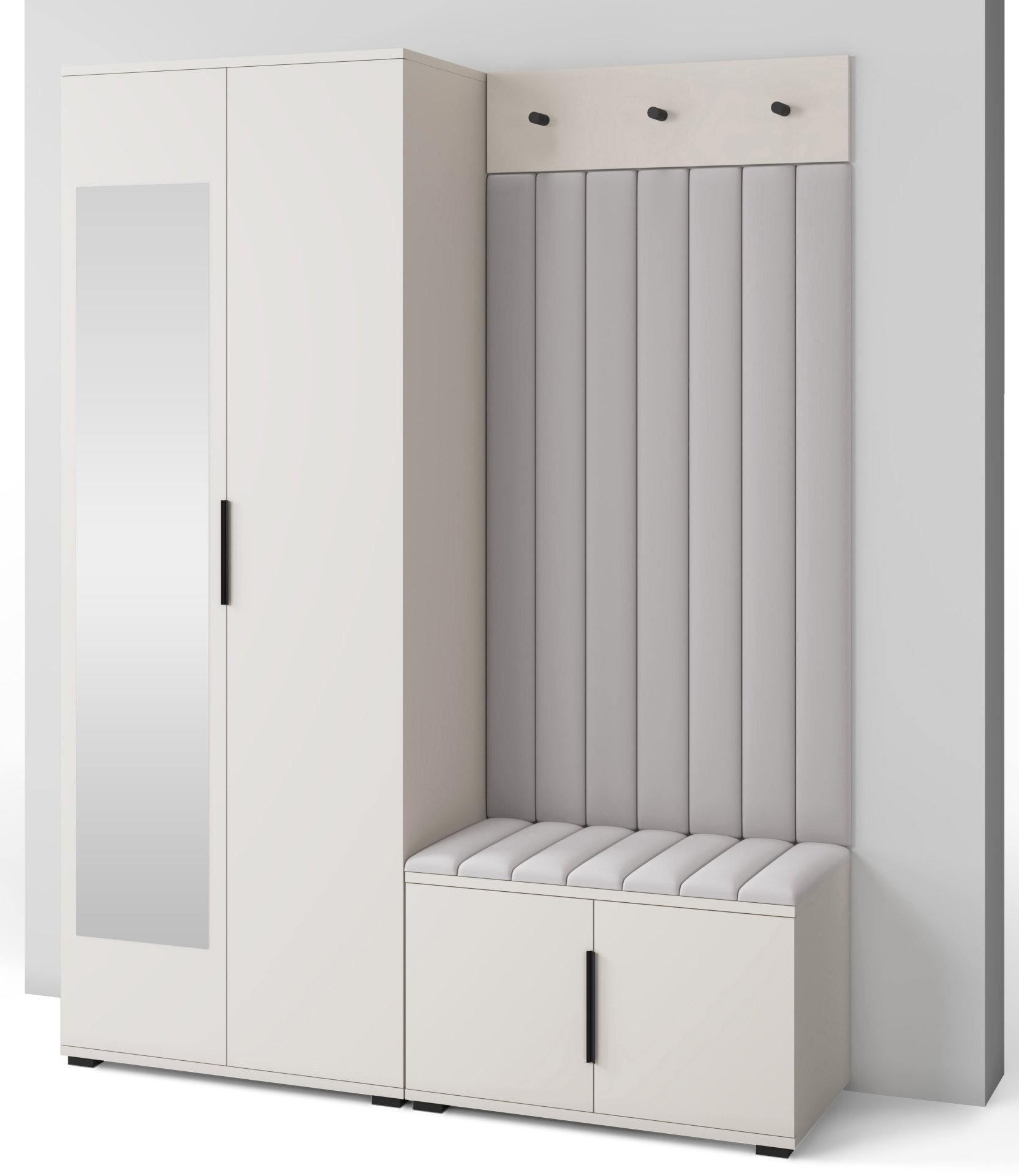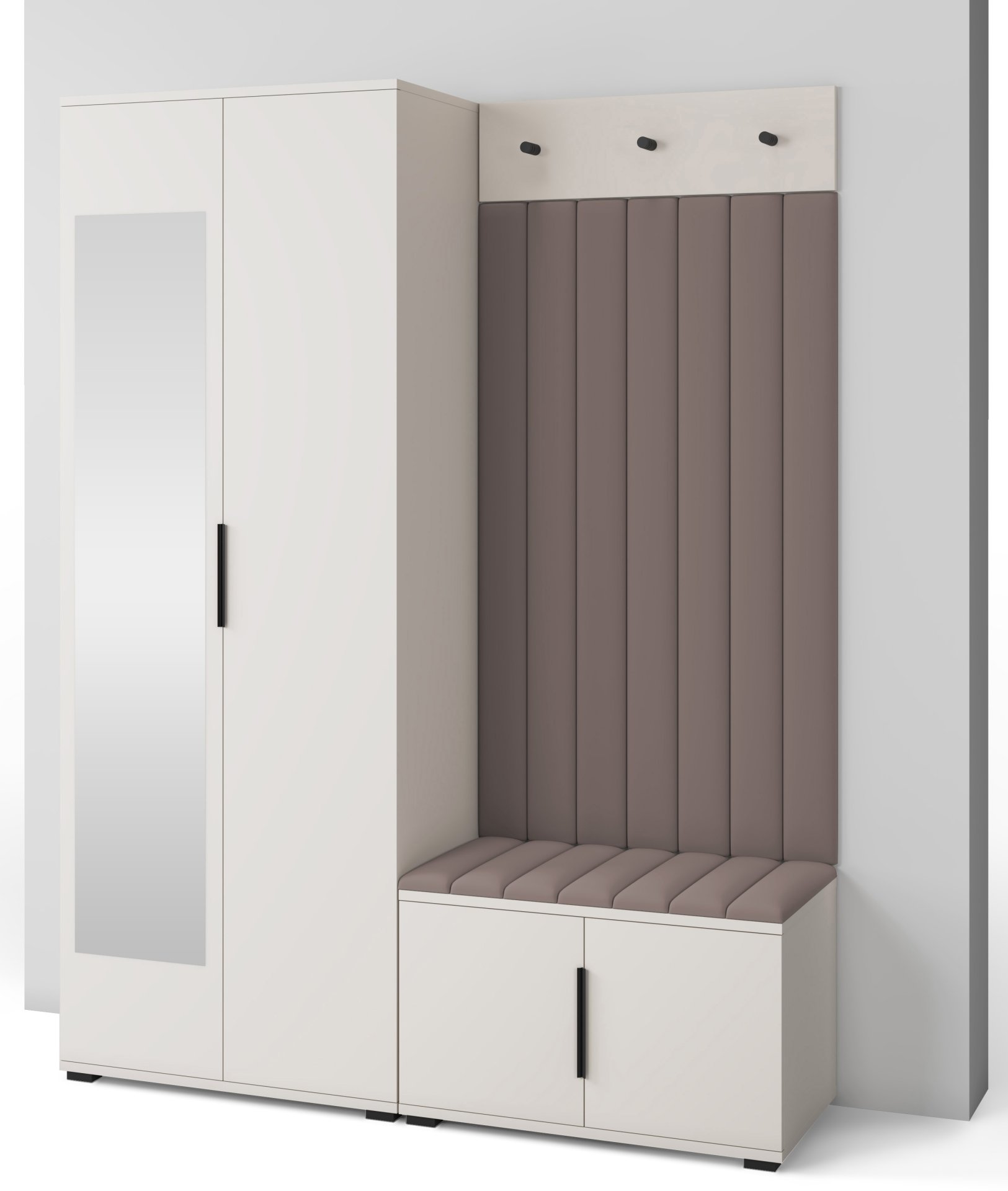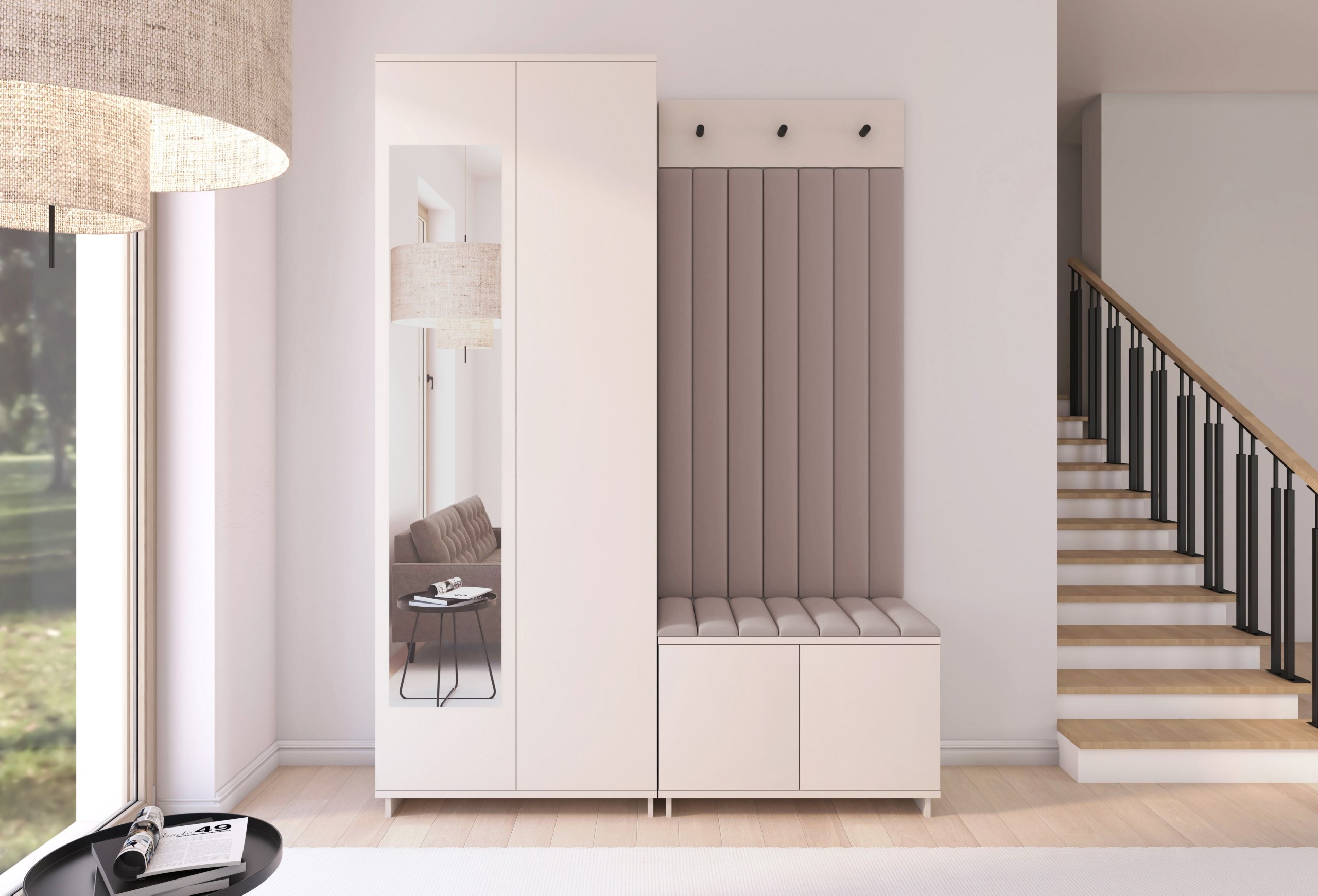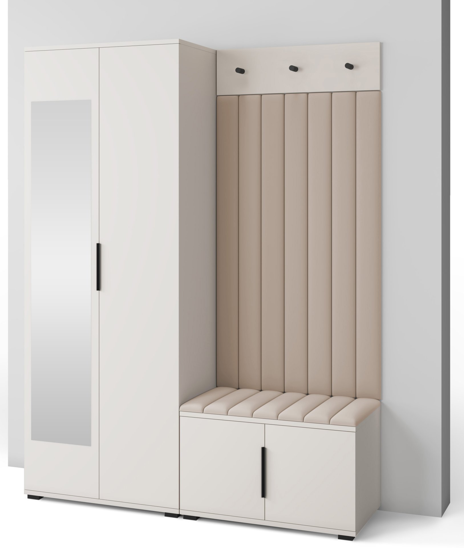 Boja kašmir namještaja Bianco 13 donosi nježnu toplinu i savršeno se uklapa s različitim nijansama zidova i podnih obloga. Zbog neutralnog tona komplet se lijepo slaže i sa svjetlijim i s tamnijim interijerima. Tapecirani paneli nisu samo dekorativni, već i funkcionalni – štite zid od prljavštine i oštećenja, a istovremeno stvaraju osjećaj udobnosti i domaće atmosfere.