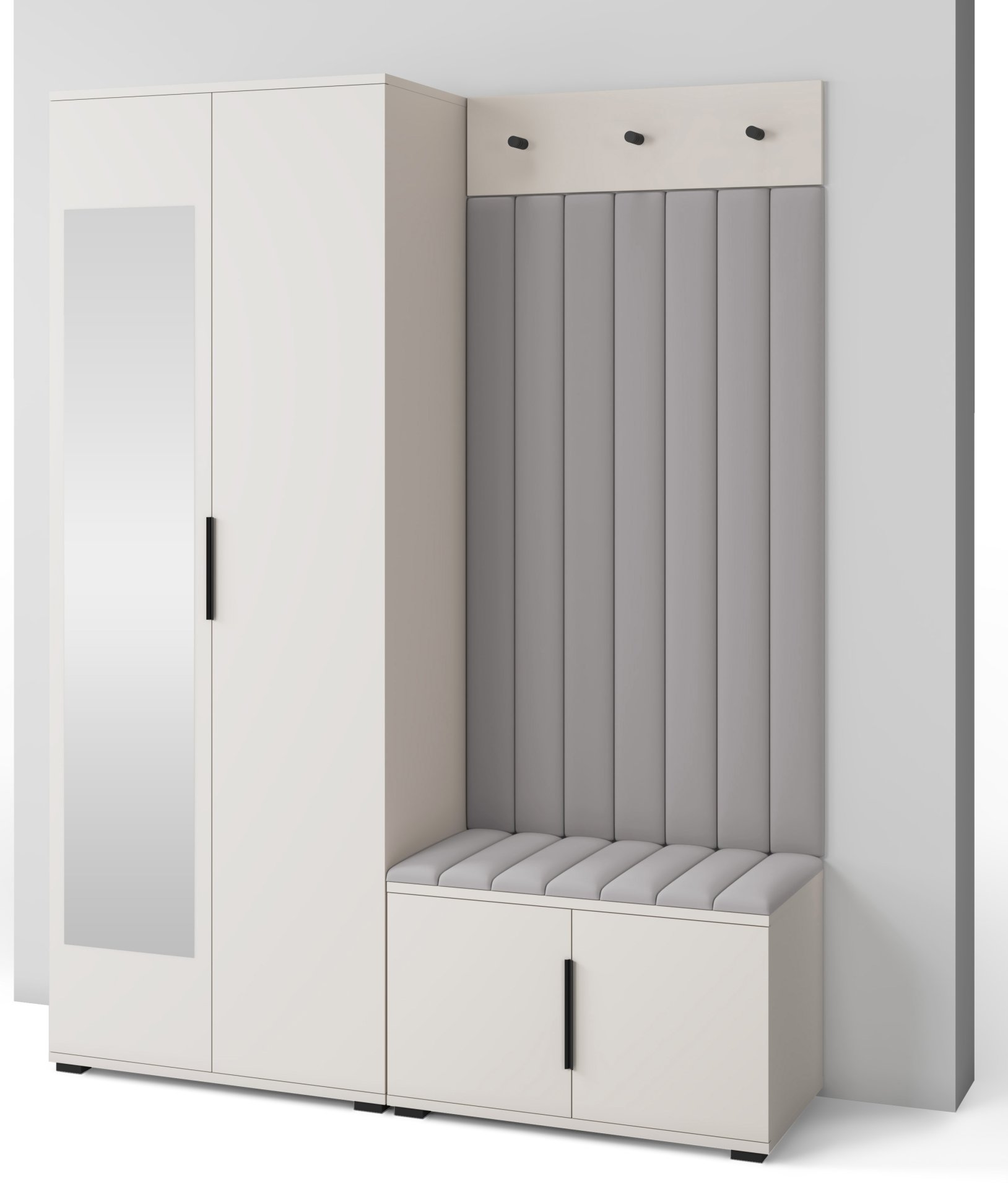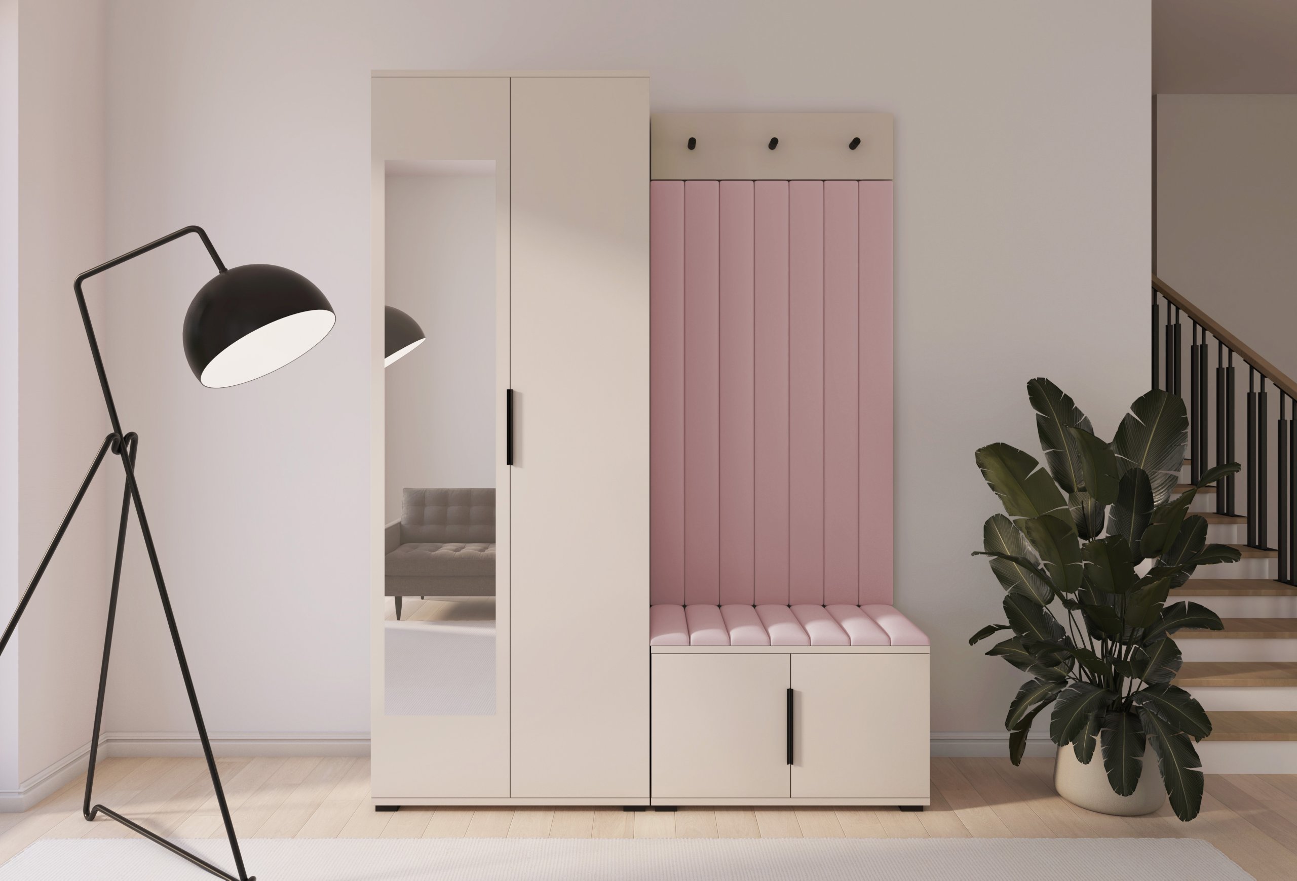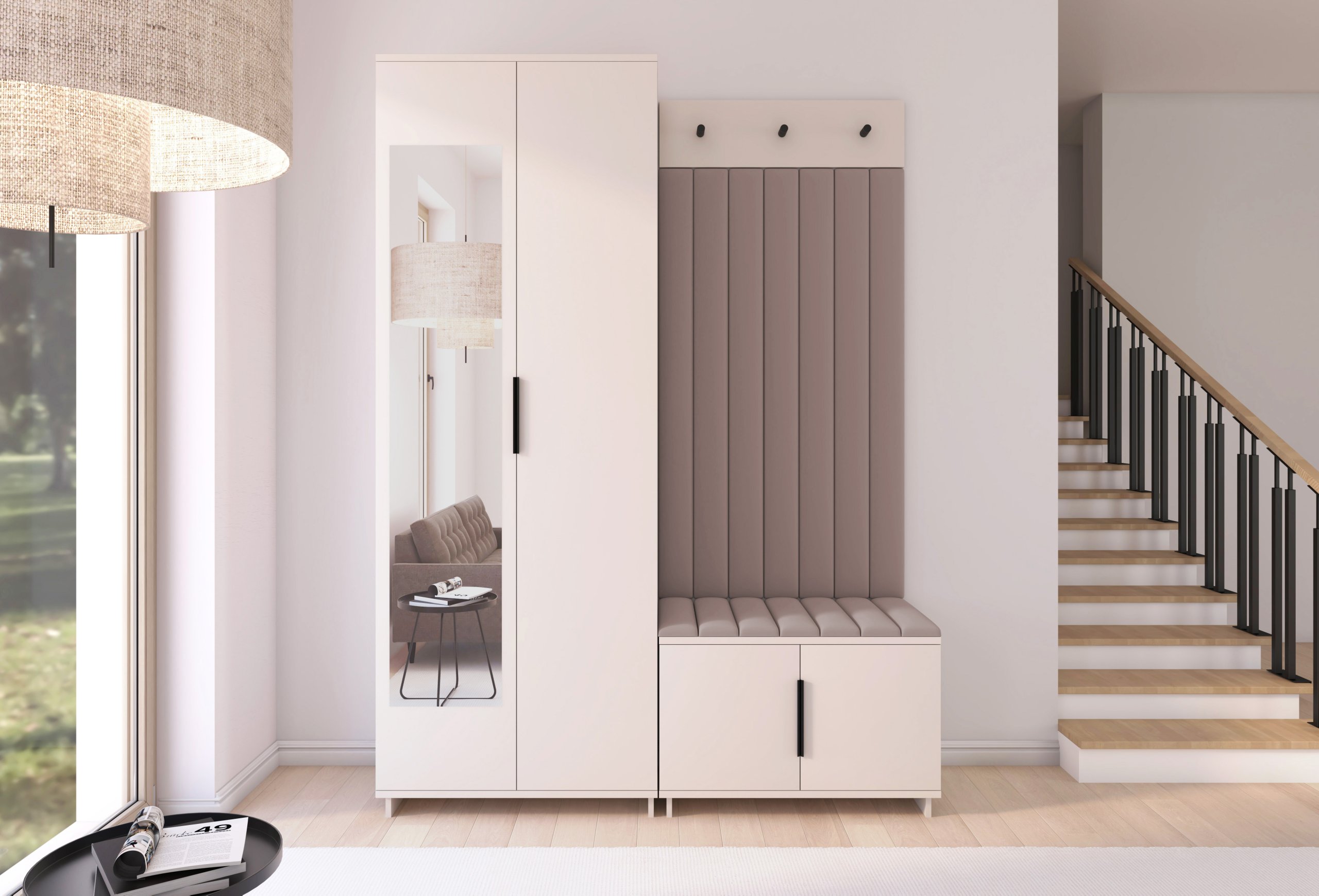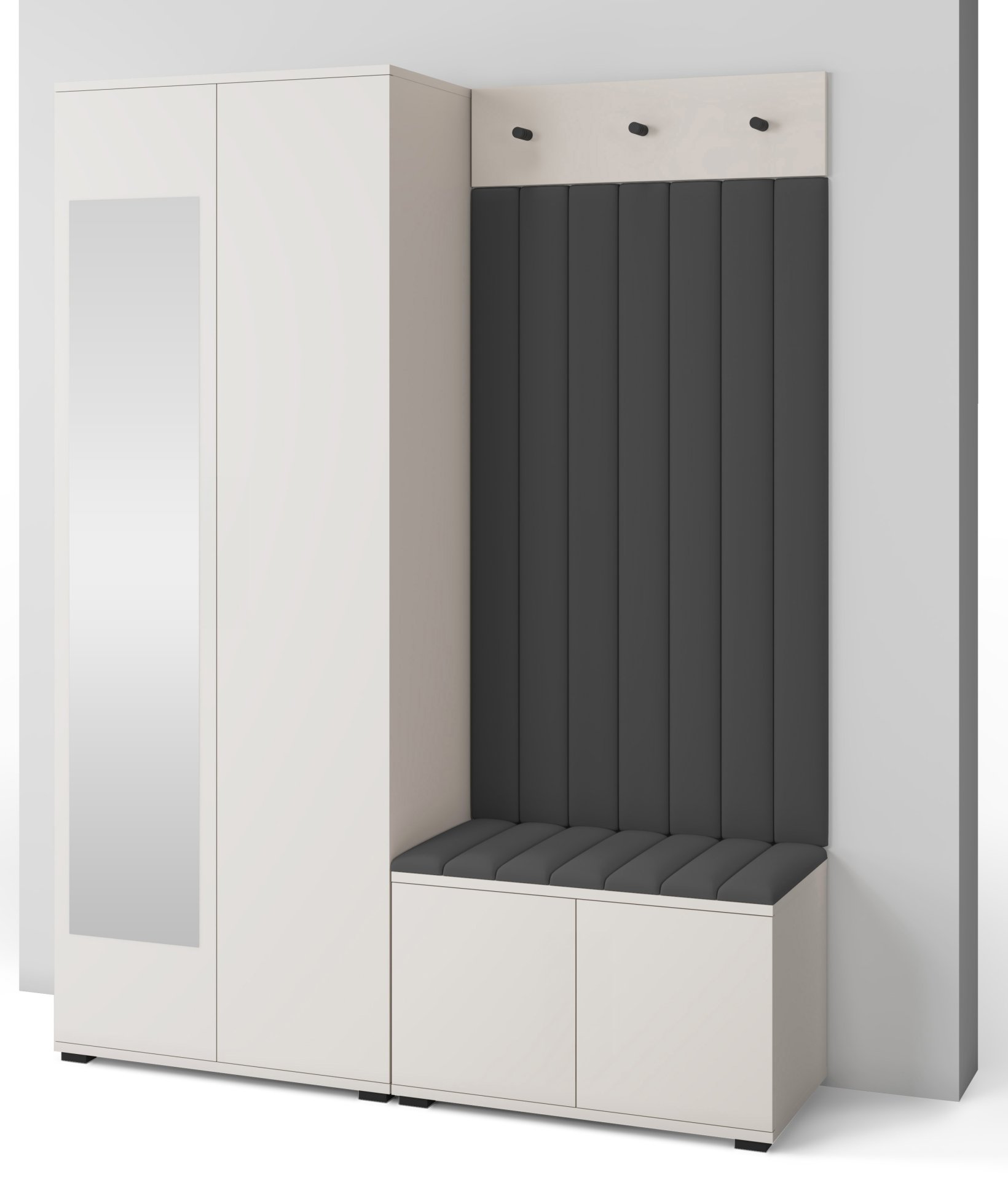 Boja kašmir namještaja Bianco 13 donosi nježnu toplinu i savršeno se uklapa s različitim nijansama zidova i podnih obloga. Zbog neutralnog tona komplet se lijepo slaže i sa svjetlijim i s tamnijim interijerima. Tapecirani paneli nisu samo dekorativni, već i funkcionalni – štite zid od prljavštine i oštećenja, a istovremeno stvaraju osjećaj udobnosti i domaće atmosfere.