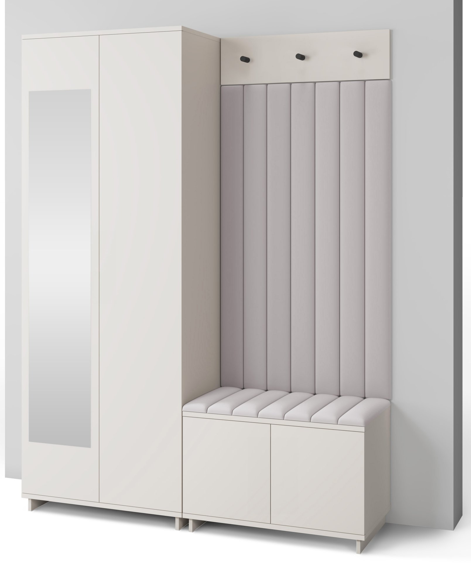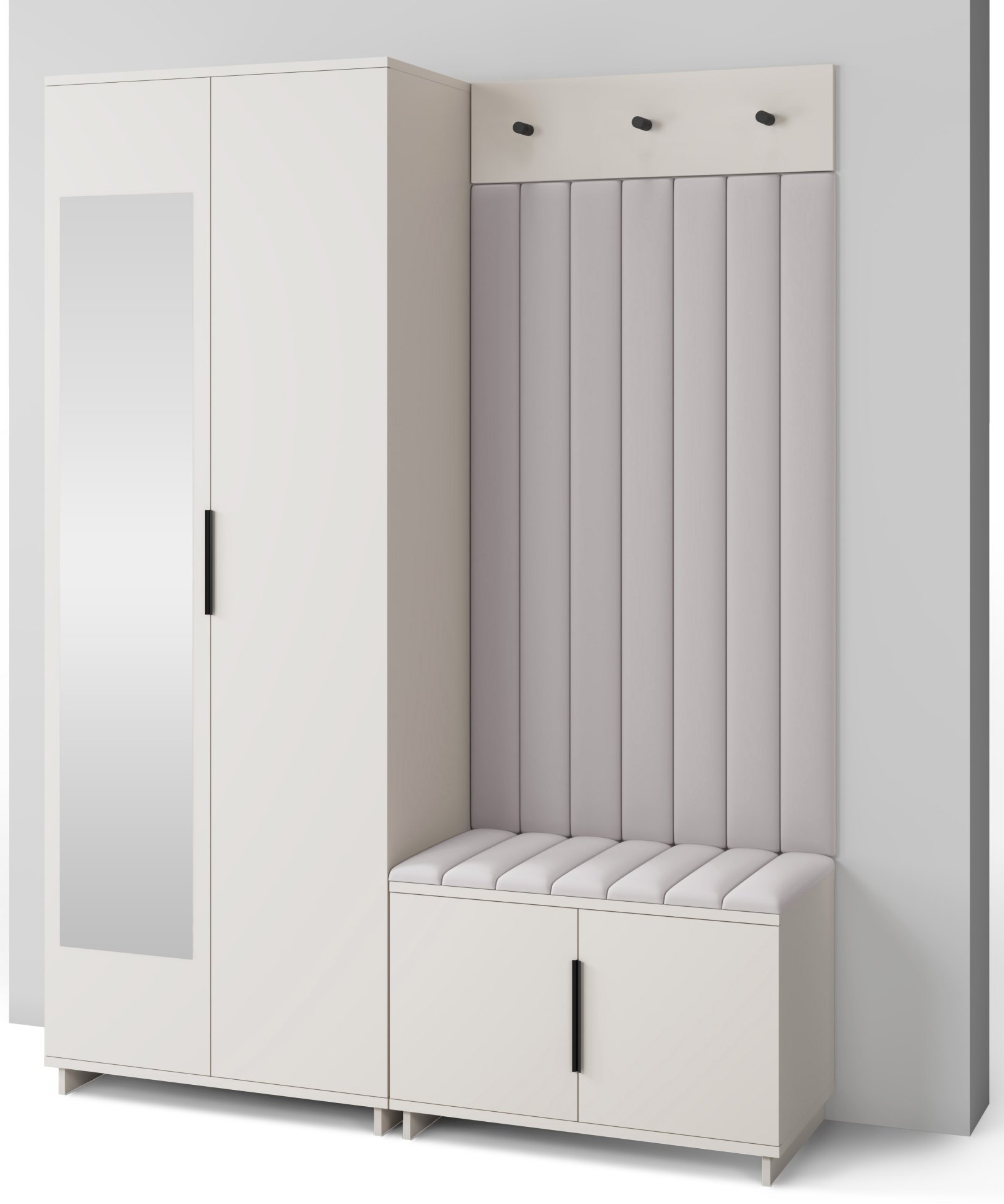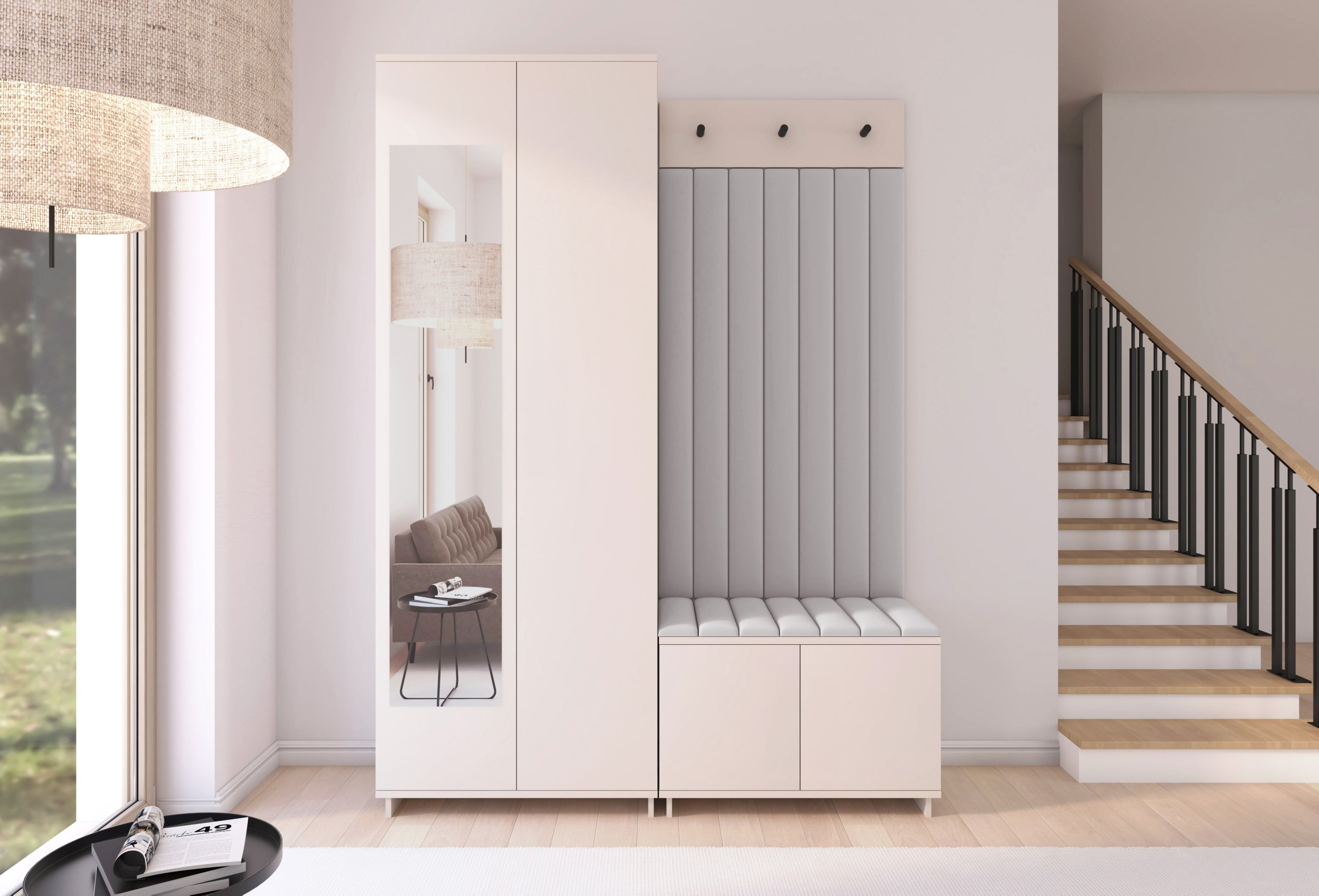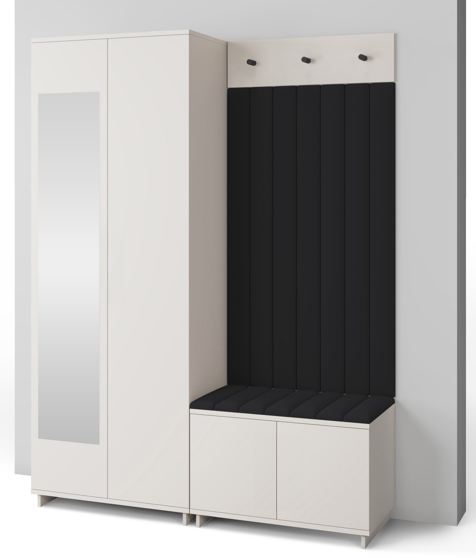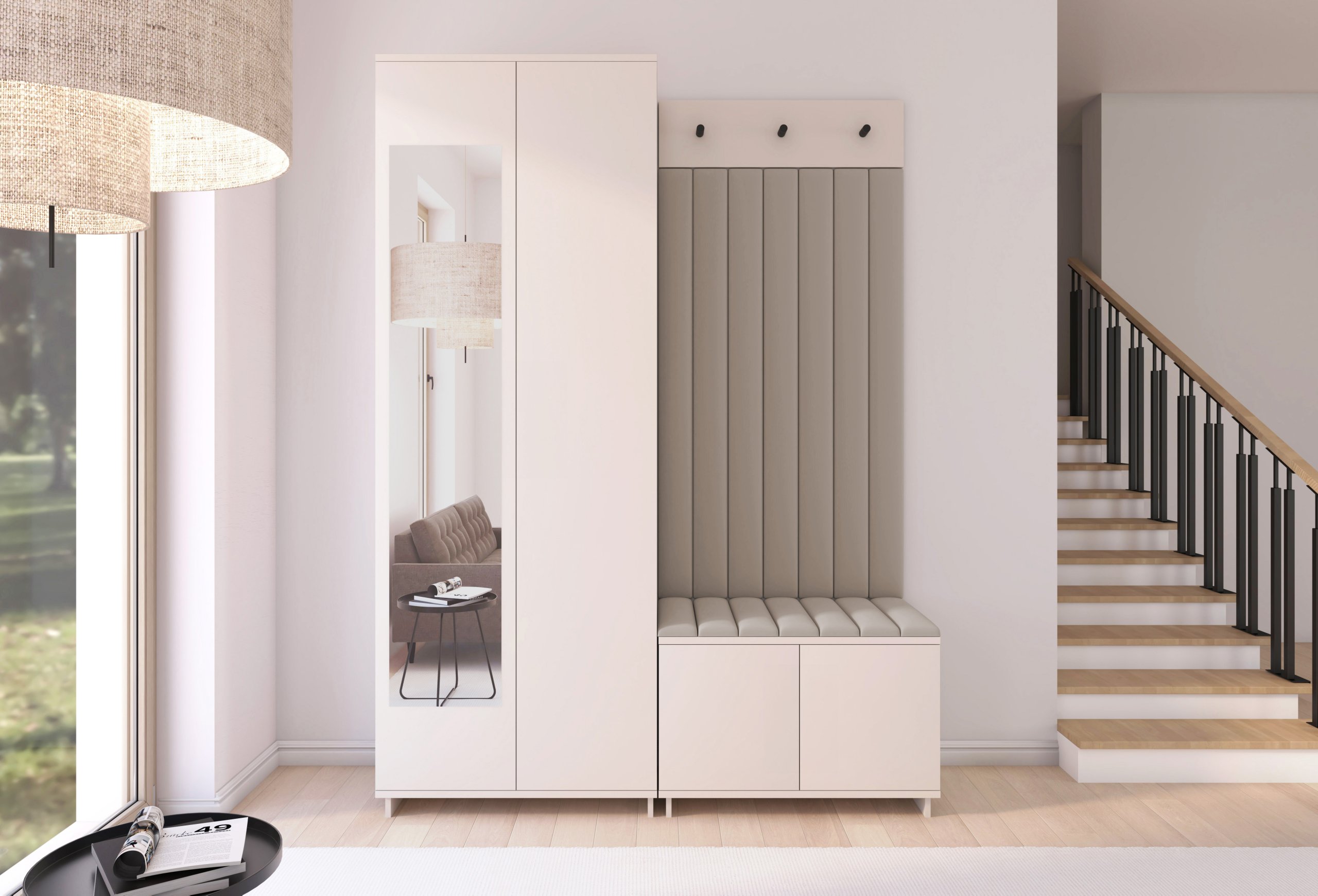 Boja kašmir namještaja Bianco 13 donosi nježnu toplinu i savršeno se uklapa s različitim nijansama zidova i podnih obloga. Zbog neutralnog tona komplet se lijepo slaže i sa svjetlijim i s tamnijim interijerima. Tapecirani paneli nisu samo dekorativni, već i funkcionalni – štite zid od prljavštine i oštećenja, a istovremeno stvaraju osjećaj udobnosti i domaće atmosfere.
