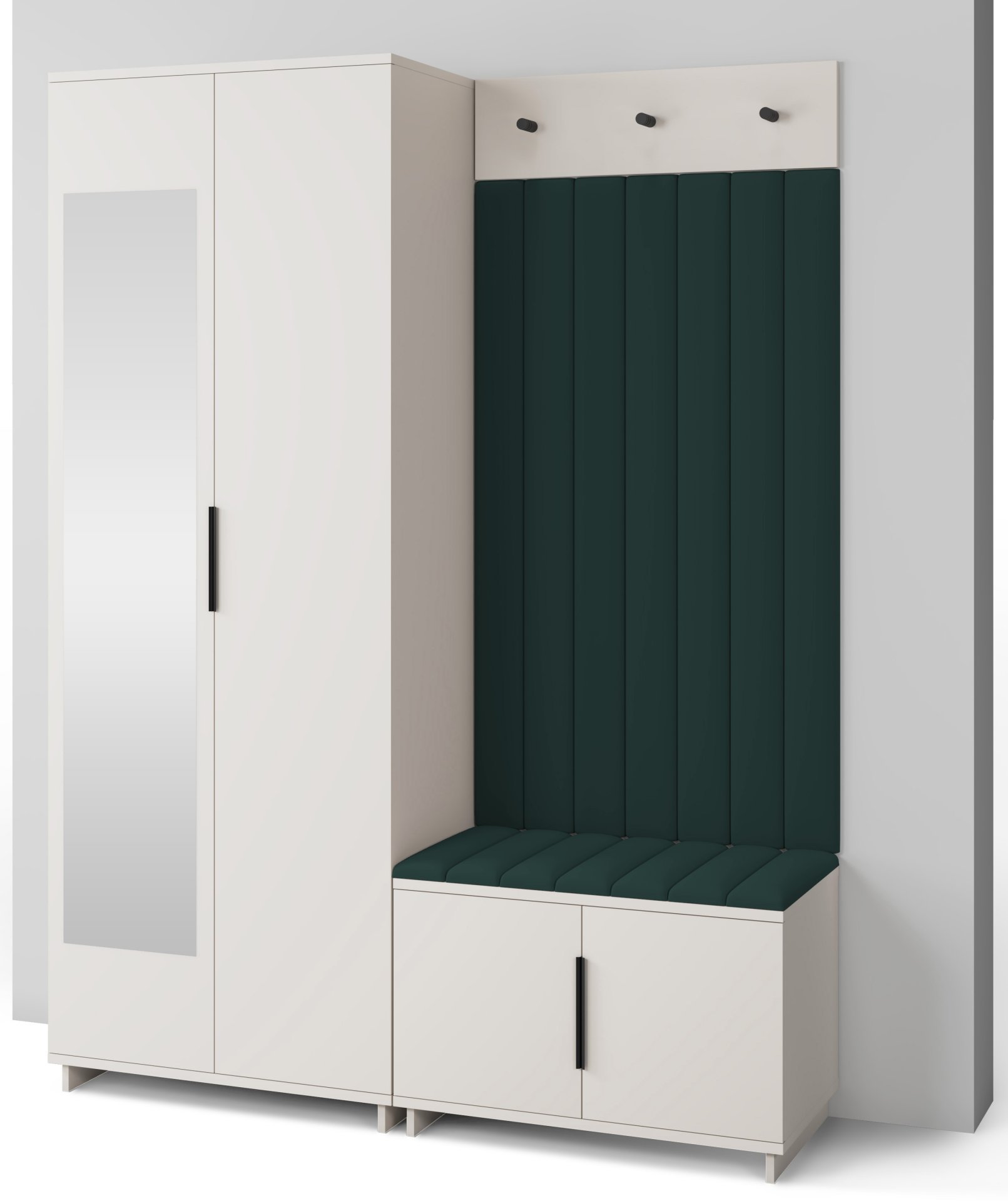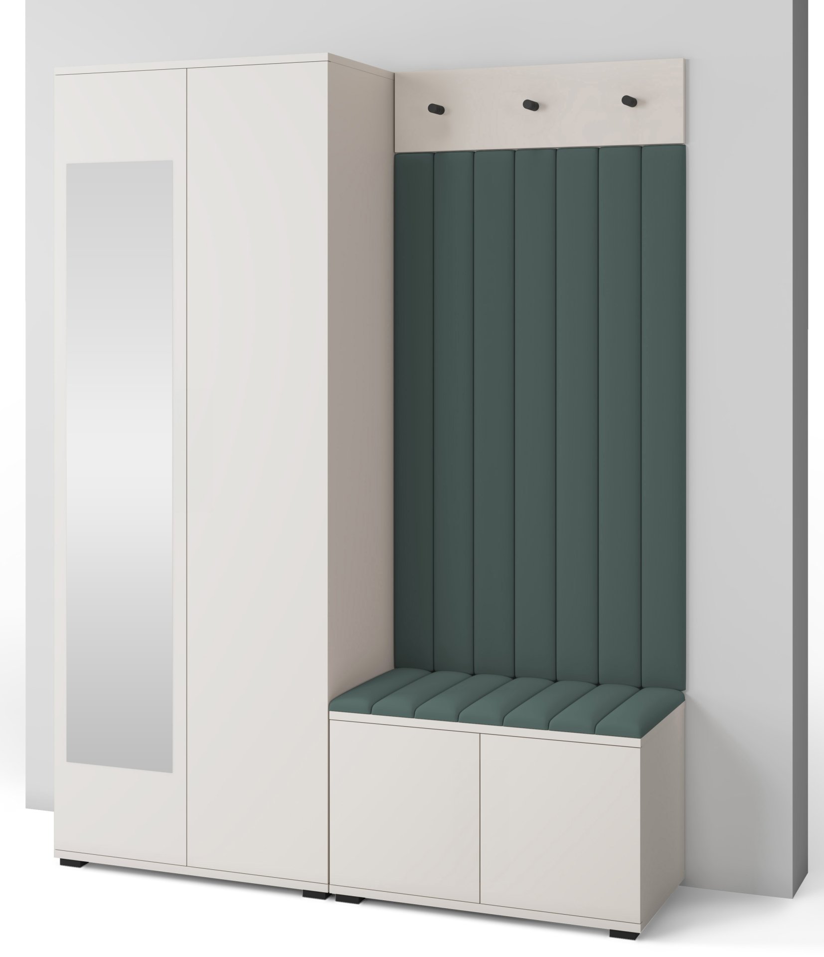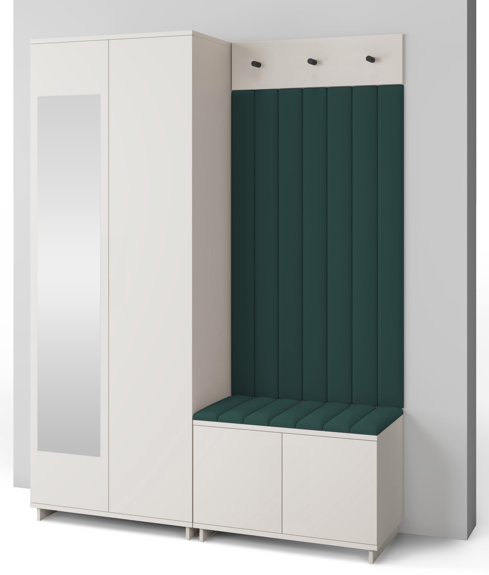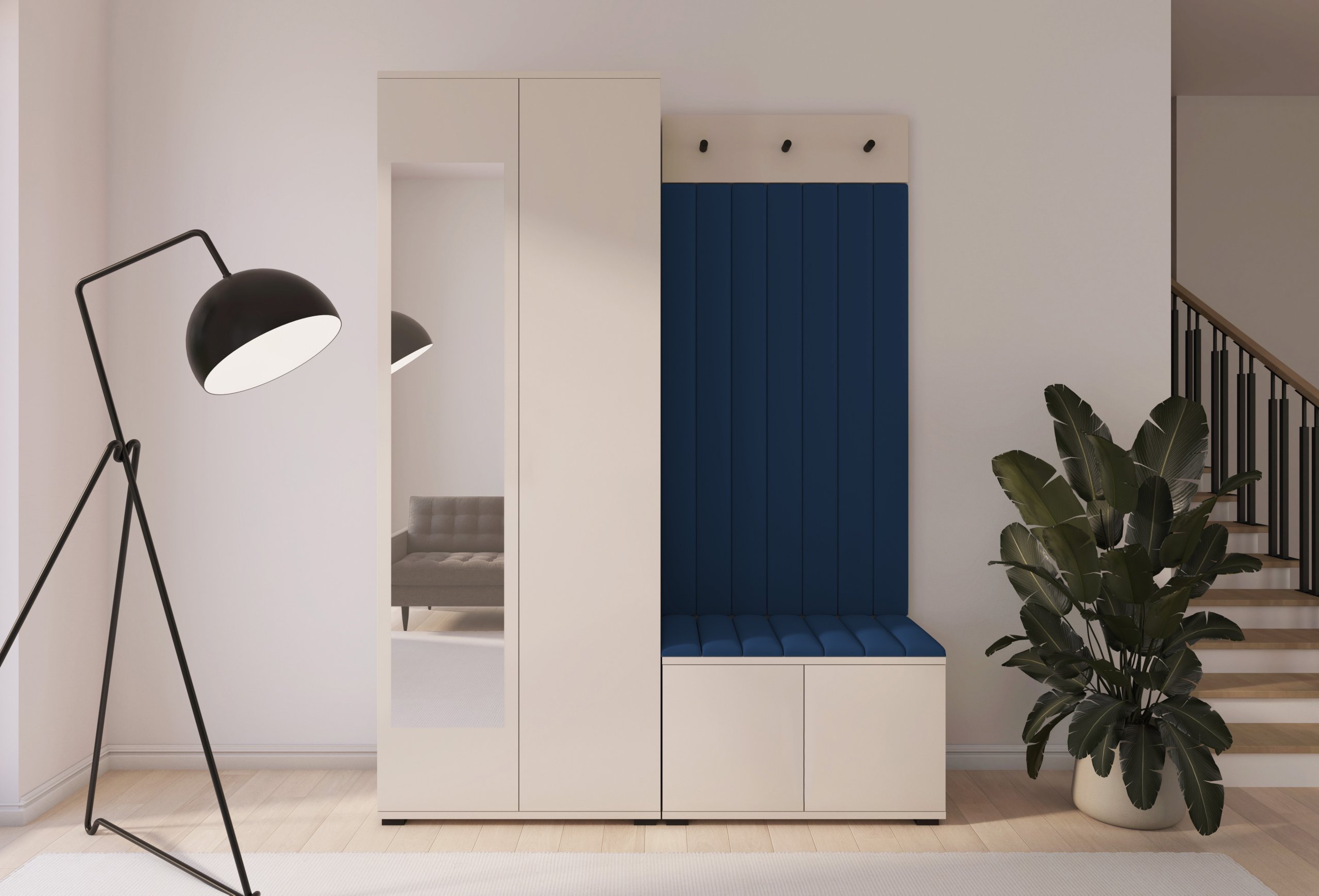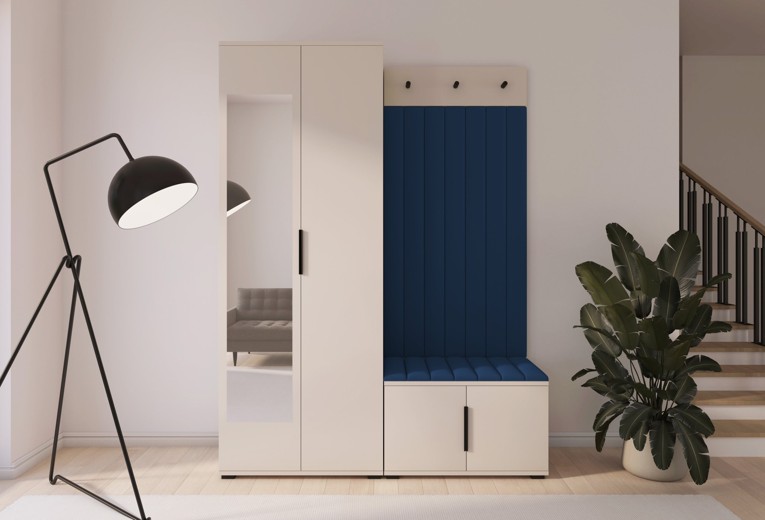 Boja kašmir namještaja Bianco 13 donosi nježnu toplinu i savršeno se uklapa s različitim nijansama zidova i podnih obloga. Zbog neutralnog tona komplet se lijepo slaže i sa svjetlijim i s tamnijim interijerima. Tapecirani paneli nisu samo dekorativni, već i funkcionalni – štite zid od prljavštine i oštećenja, a istovremeno stvaraju osjećaj udobnosti i domaće atmosfere.