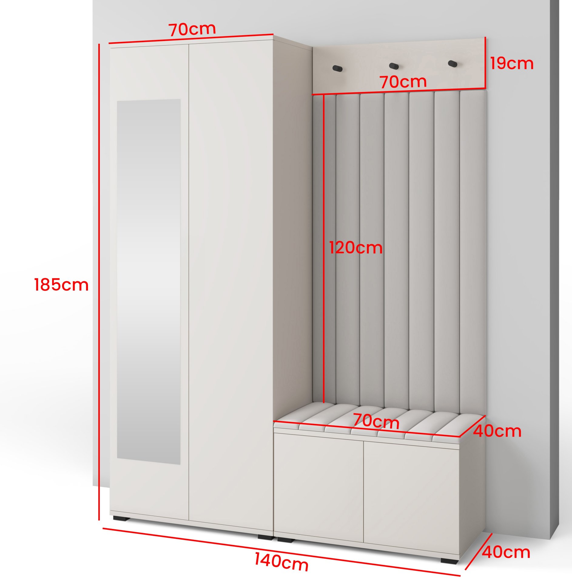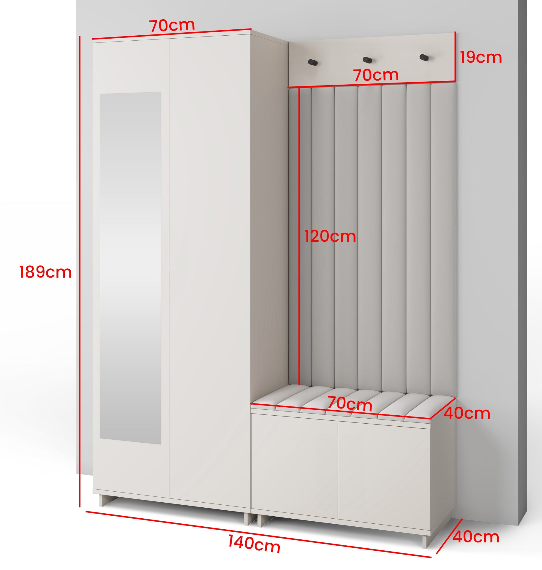 Komplet za hodnik Bianco 13 marke PKMebel donosi profinjenu kombinaciju suvremene elegancije i funkcionalnosti. S dimenzijama 140x40x189 cm savršeno se uklapa i u manje hodnike, a istovremeno nudi dovoljno prostora za pohranu i odlaganje. Njegova boja kašmir stvara umirujući, topao dojam, dok tapecirani paneli od tkanine Trinity osiguravaju mekan izgled i dodatnu udobnost pri korištenju. Komplet je proizveden u tvornici PKMebel u Poljskoj, što jamči kvalitetnu izradu i promišljene detalje.