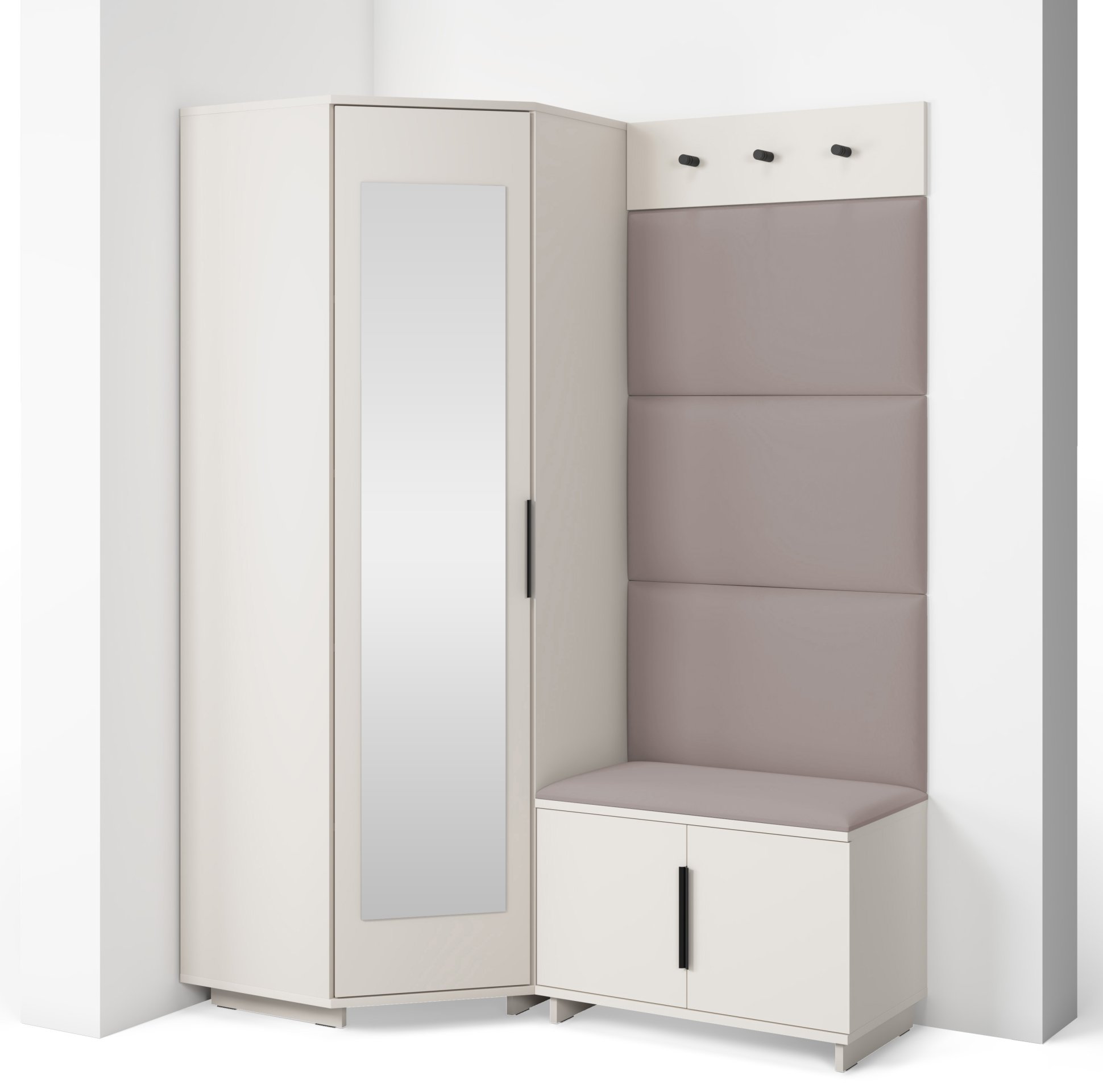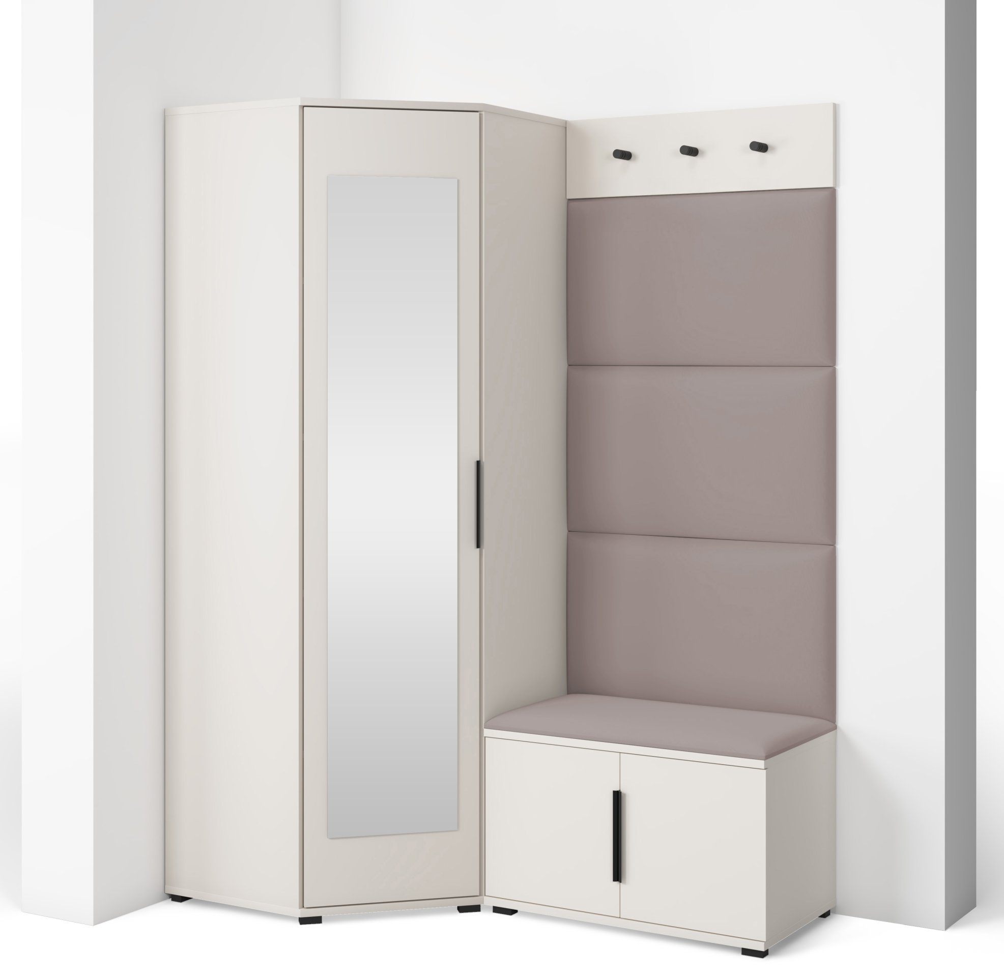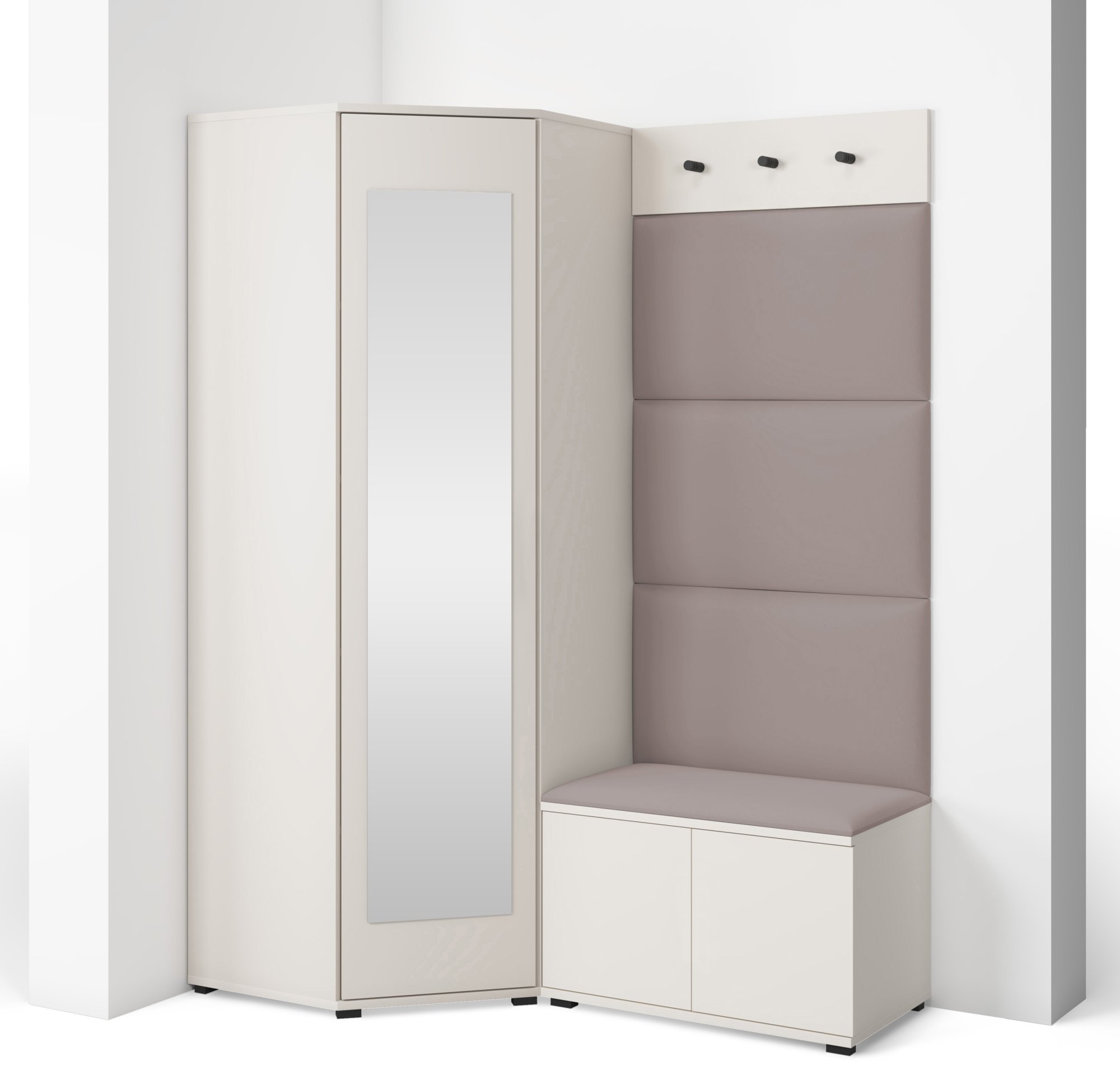Svi su elementi međusobno vizualno usklađeni, što stvara cjelovitu kompoziciju namještaja u suvremenom stilu. Površine u boji kašmira nježne su i elegantne, a istodobno dovoljno neutralne da se lijepo uklapaju s različitim kombinacijama boja zidova i podova.