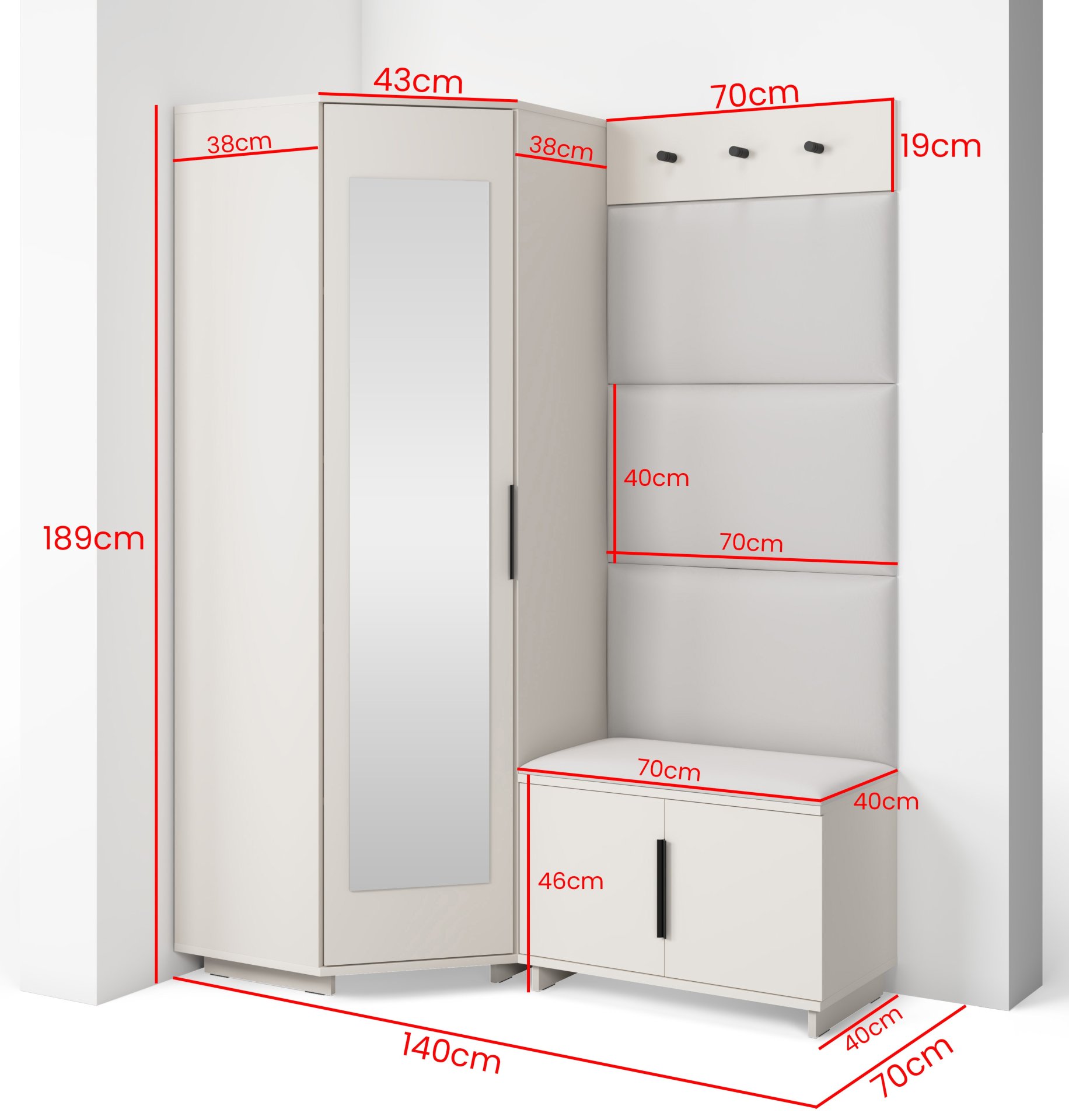 Ovaj komplet idealan je za one koji traže elegantno i funkcionalno rješenje za organizaciju svog hodnika ili predsoblje. Zbog kompaktnih dimenzija (140x70x189 cm) prikladan je i za manje prostore, gdje je svaka površina dragocjena. Istodobno nudi dovoljno mogućnosti za pohranu da zadovolji potrebe višečlanih kućanstava. Njegova modularna struktura omogućuje postavljanje u različitim rasporedima, ovisno o raspoloživom prostoru.