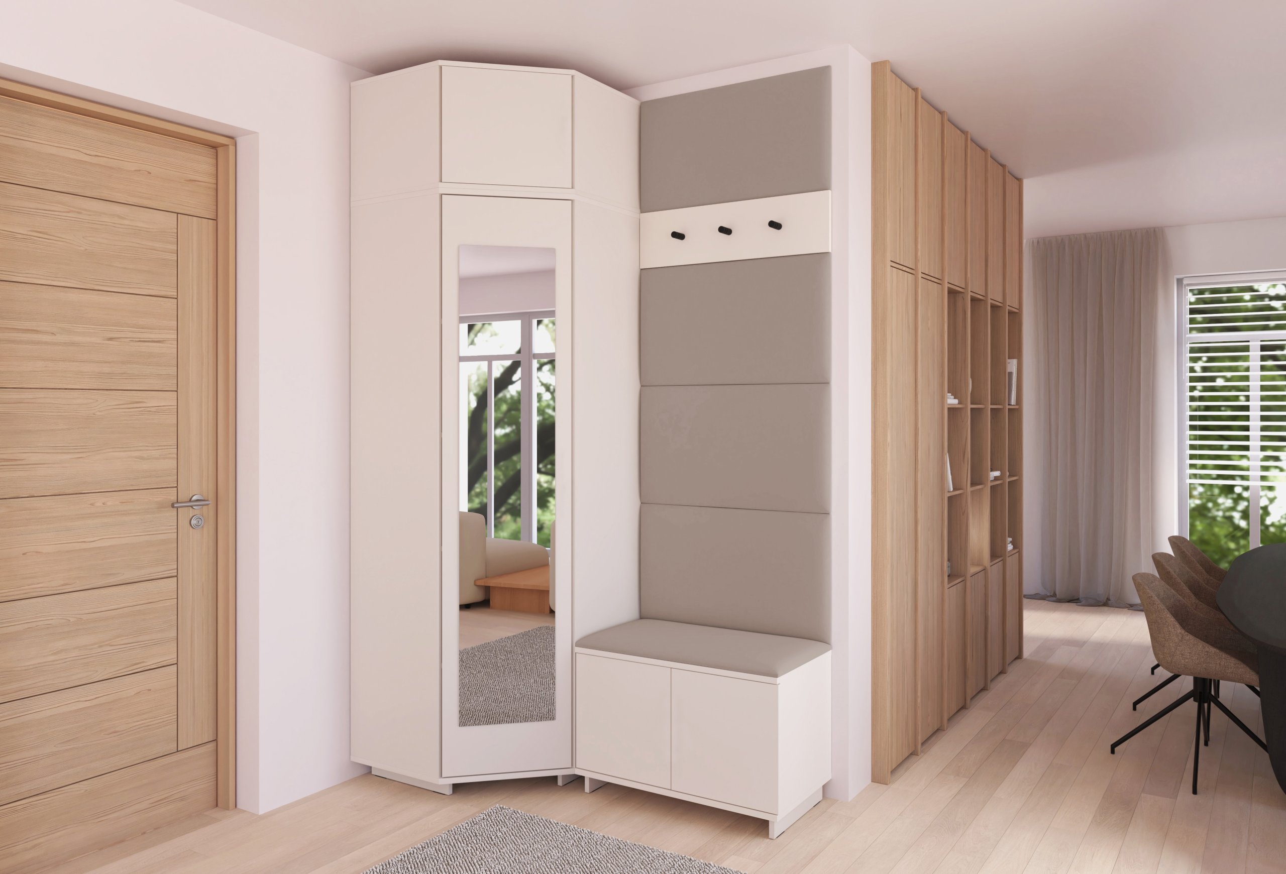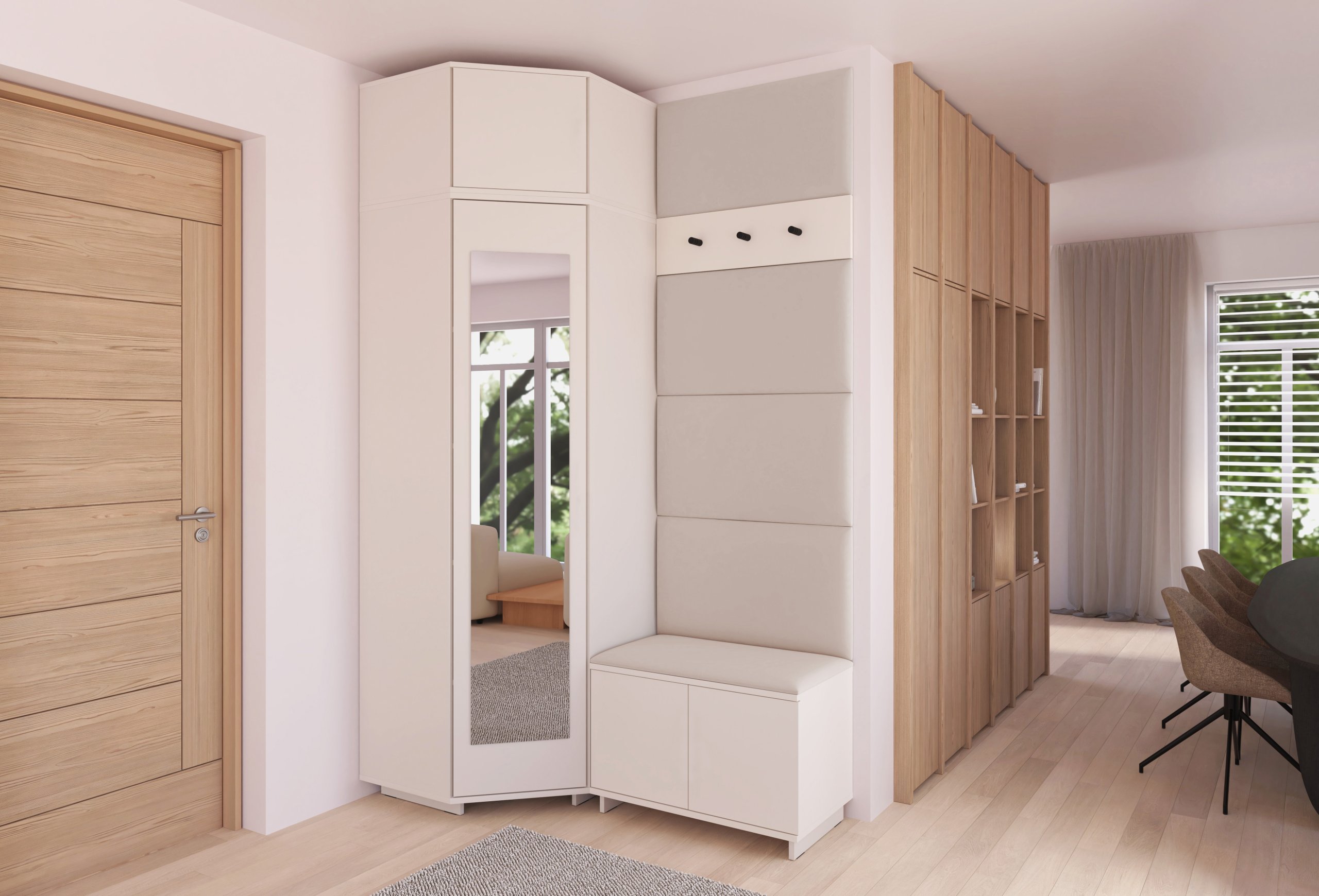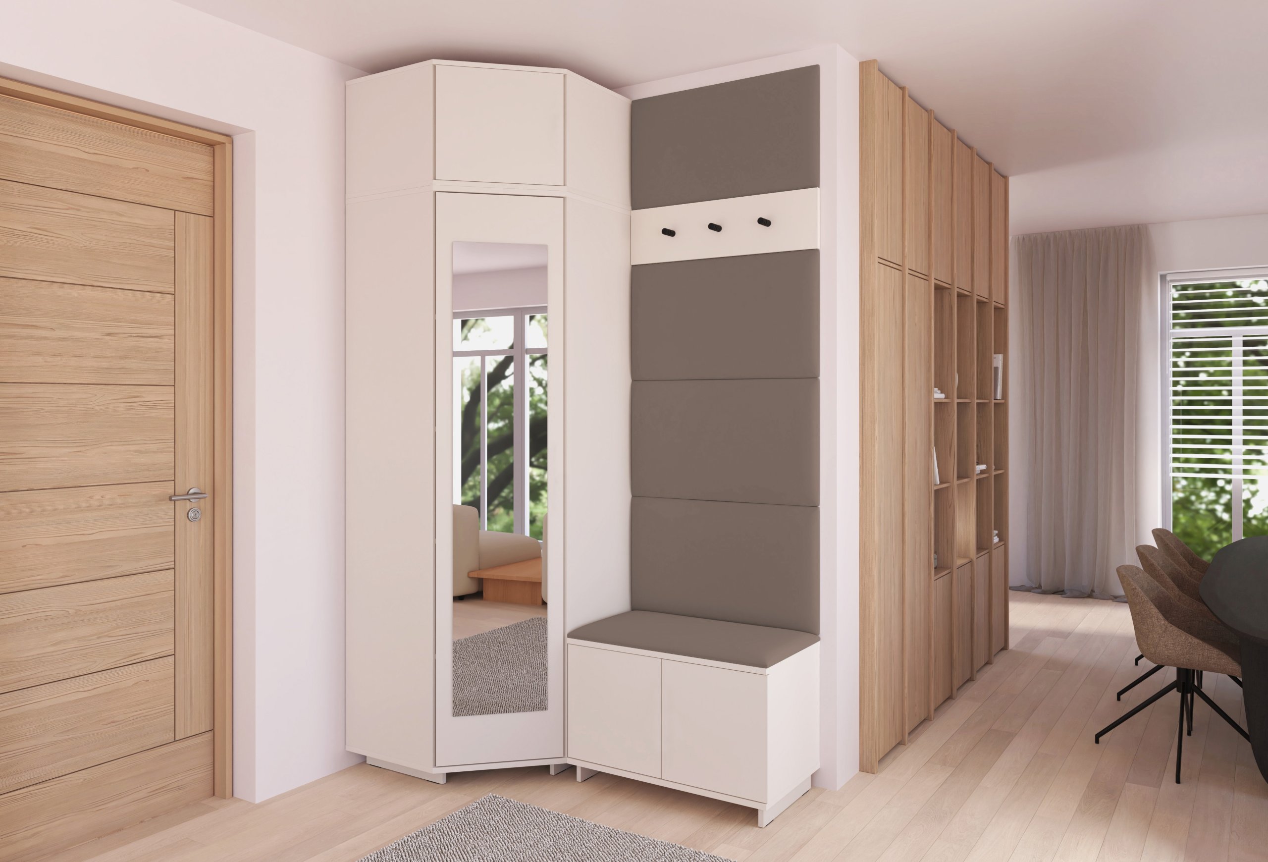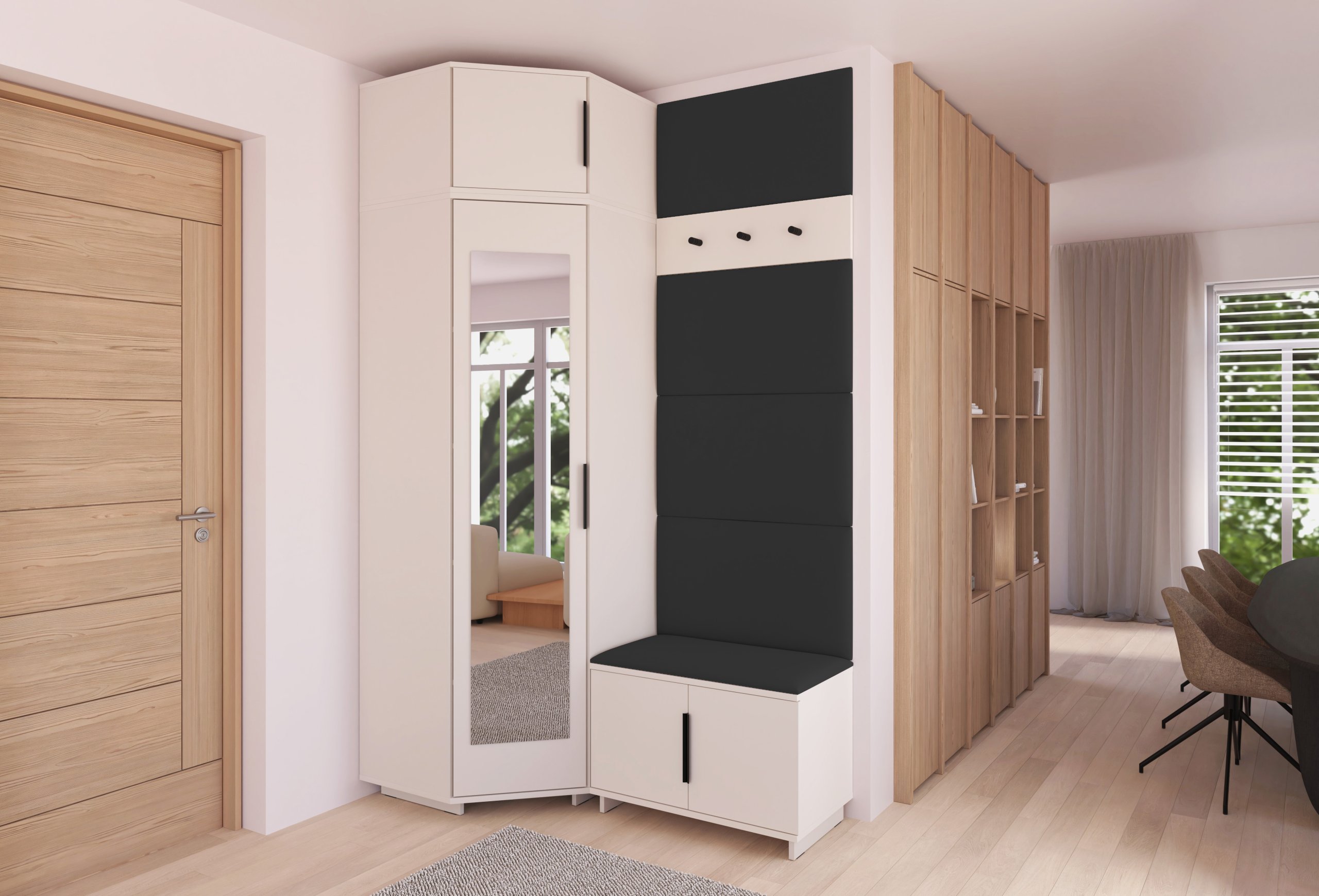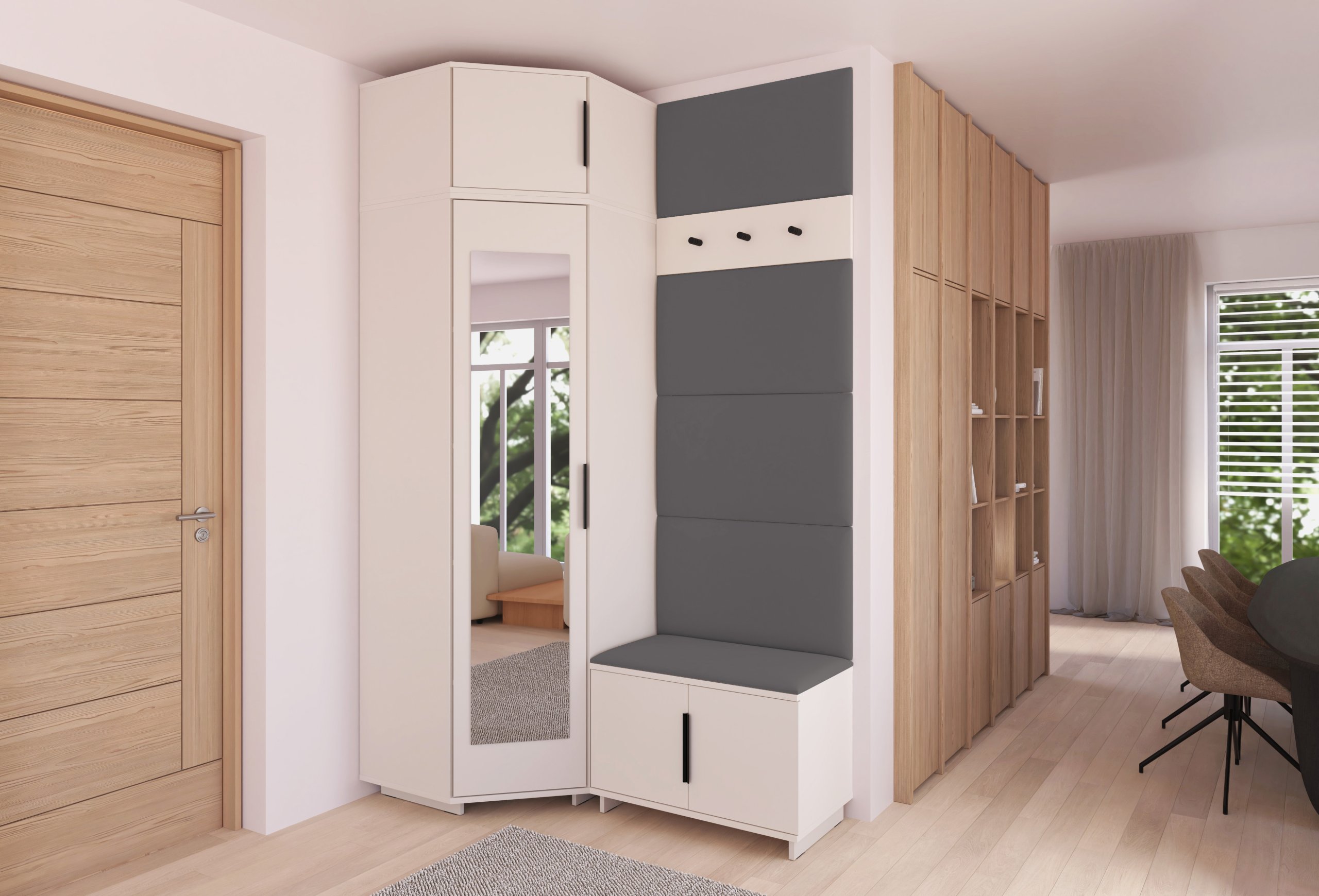 Svaki element kompleta Bianco 18 osmišljen je s mišlju na praktičnost. Kutni ormar omogućuje iskorištavanje inače neupotrebljivog kuta prostora, čime se povećava kapacitet za pohranu bez žrtvovanja prostranosti hodnika. Vješalice i tapecirane ploče stvaraju ugodno i privlačno okruženje, gdje se funkcionalnost isprepliće s estetskom dovršenošću.