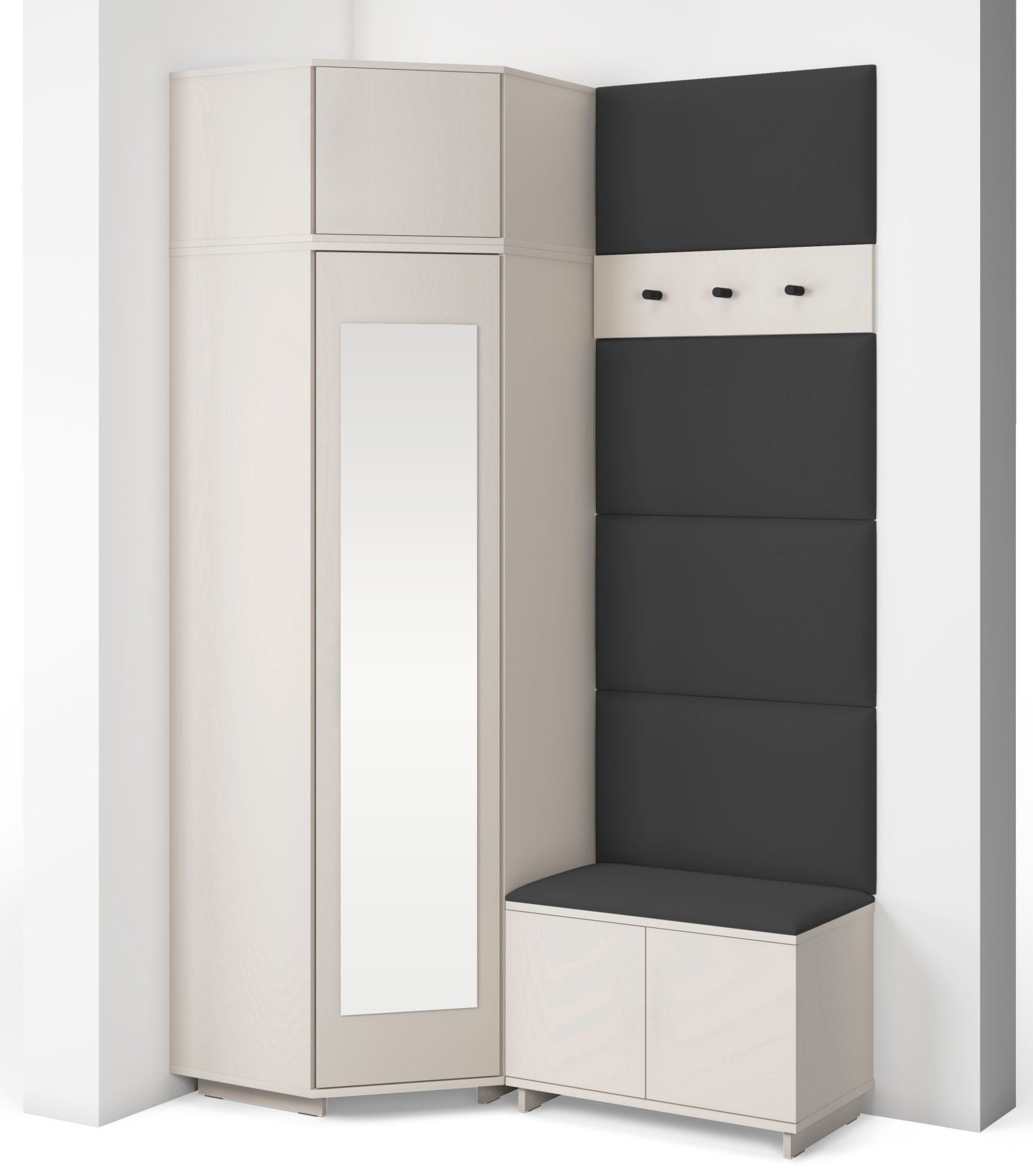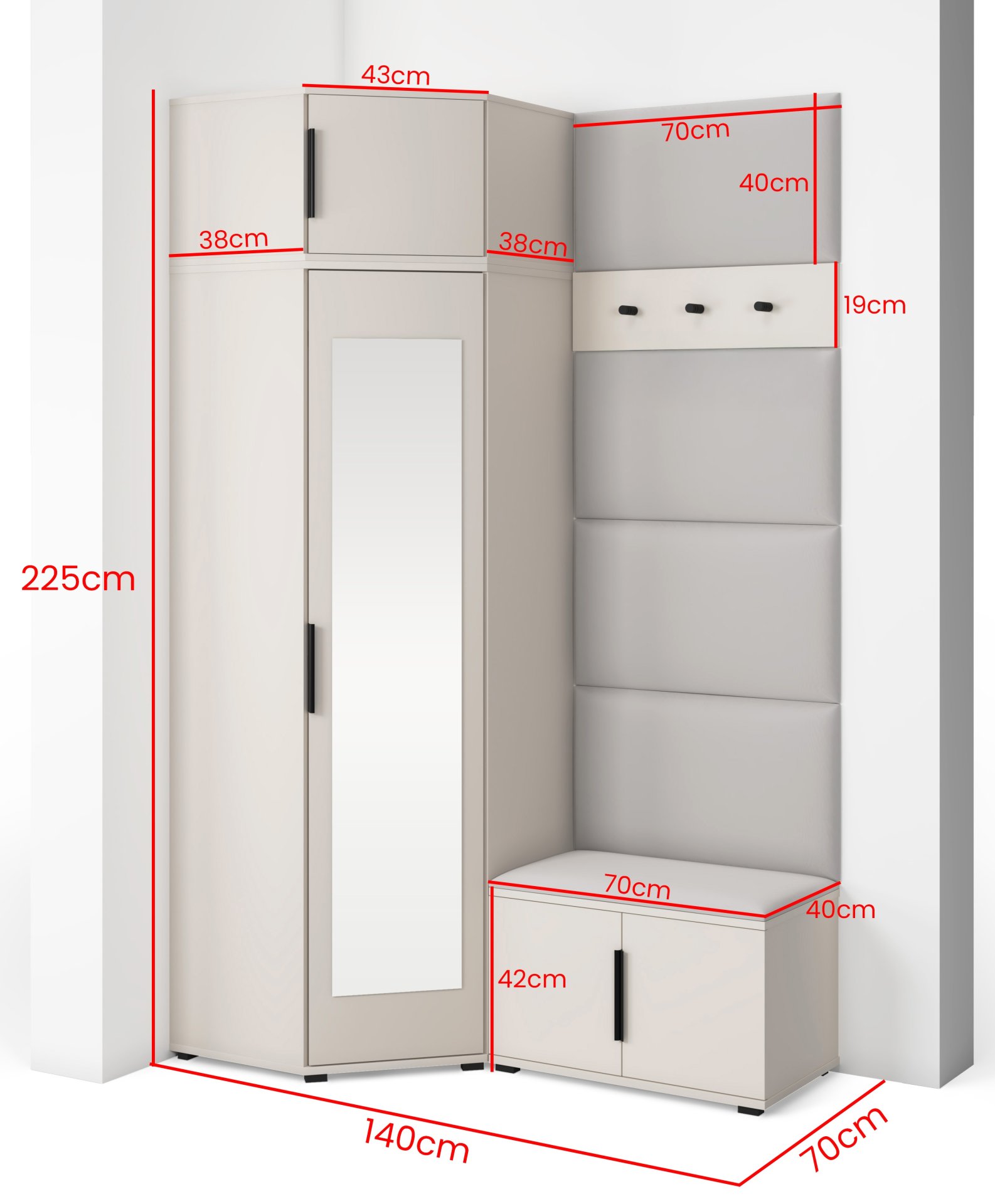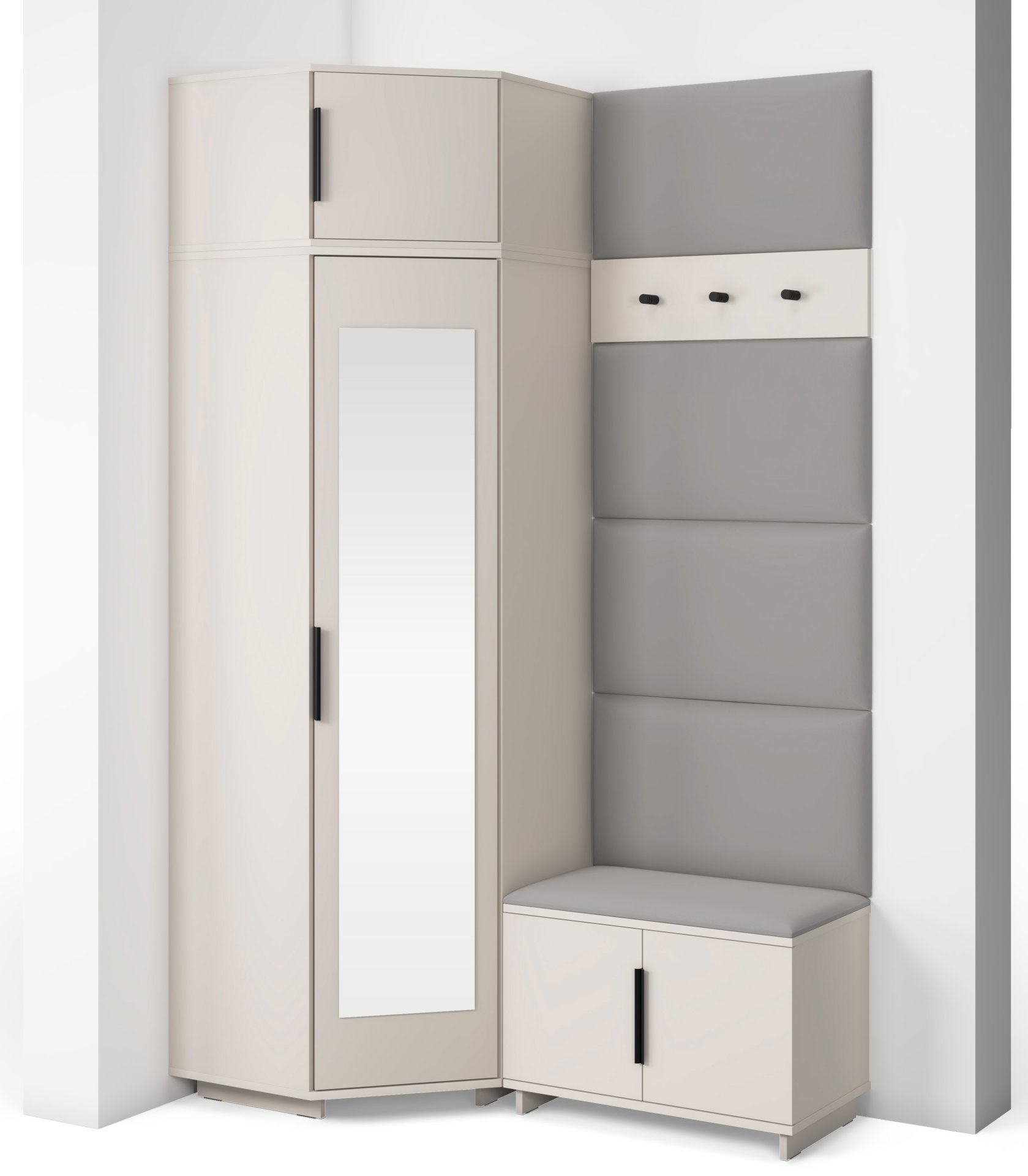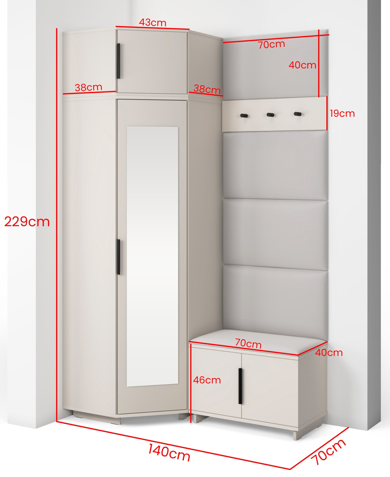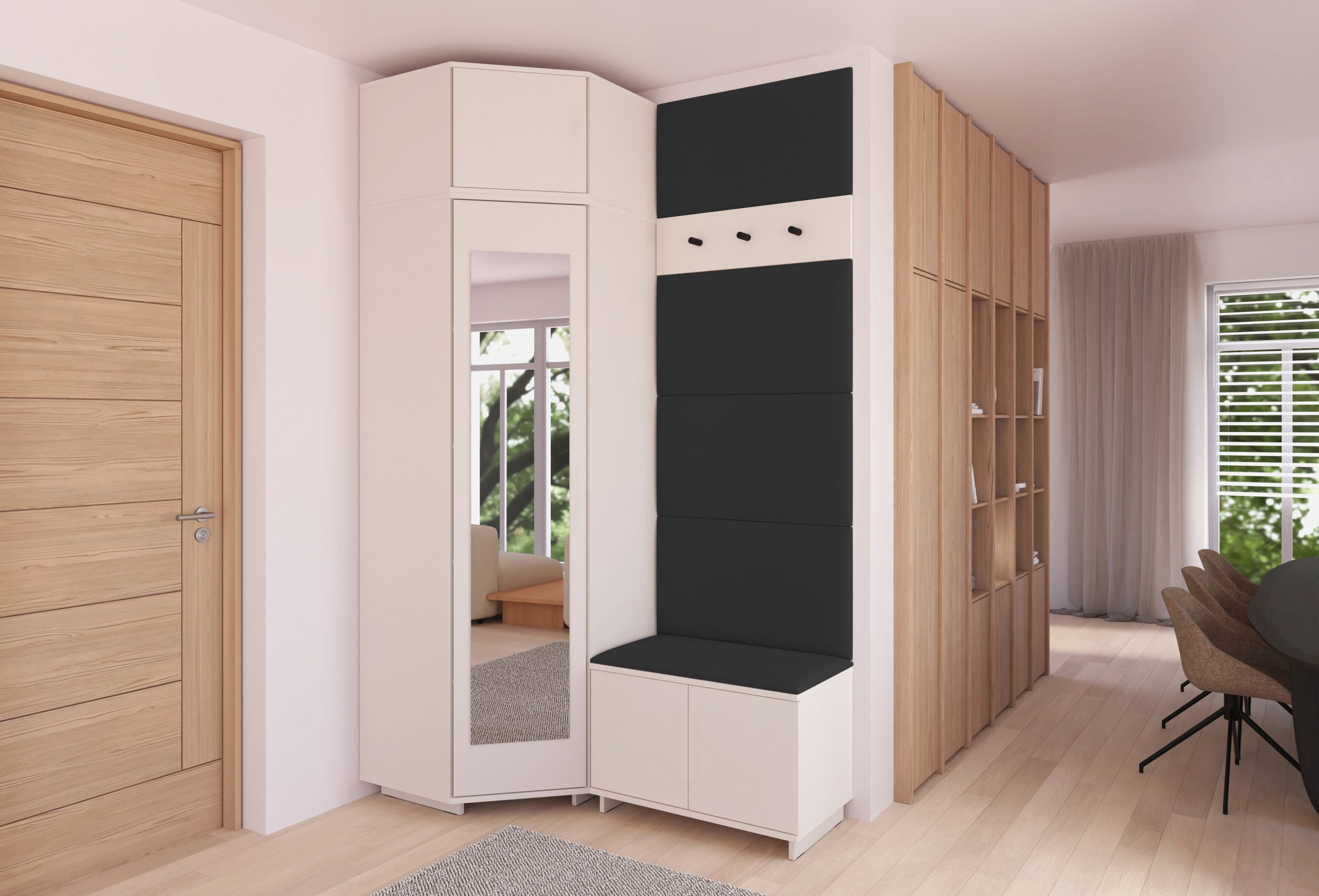 Svaki element kompleta Bianco 18 osmišljen je s mišlju na praktičnost. Kutni ormar omogućuje iskorištavanje inače neupotrebljivog kuta prostora, čime se povećava kapacitet za pohranu bez žrtvovanja prostranosti hodnika. Vješalice i tapecirane ploče stvaraju ugodno i privlačno okruženje, gdje se funkcionalnost isprepliće s estetskom dovršenošću.