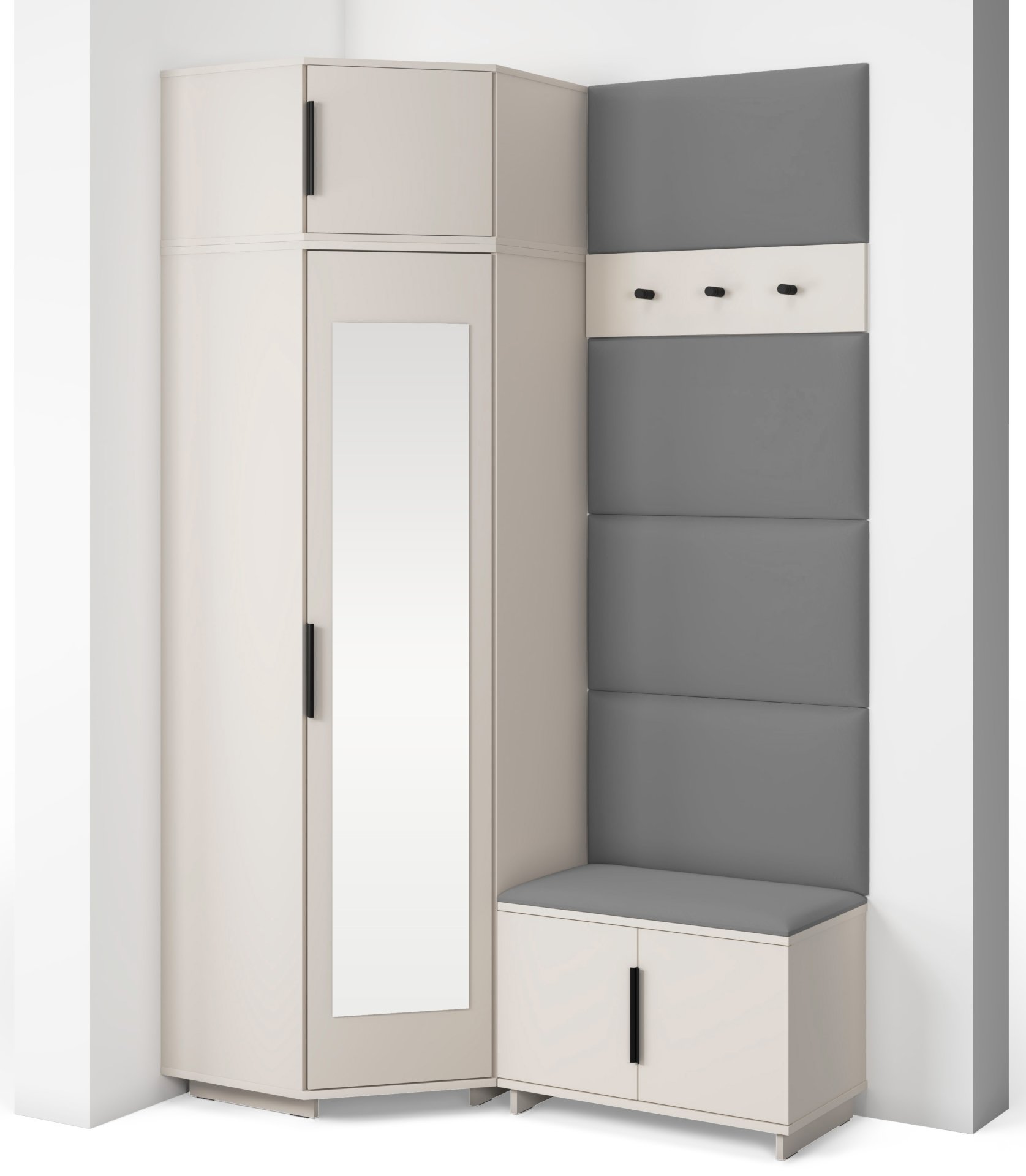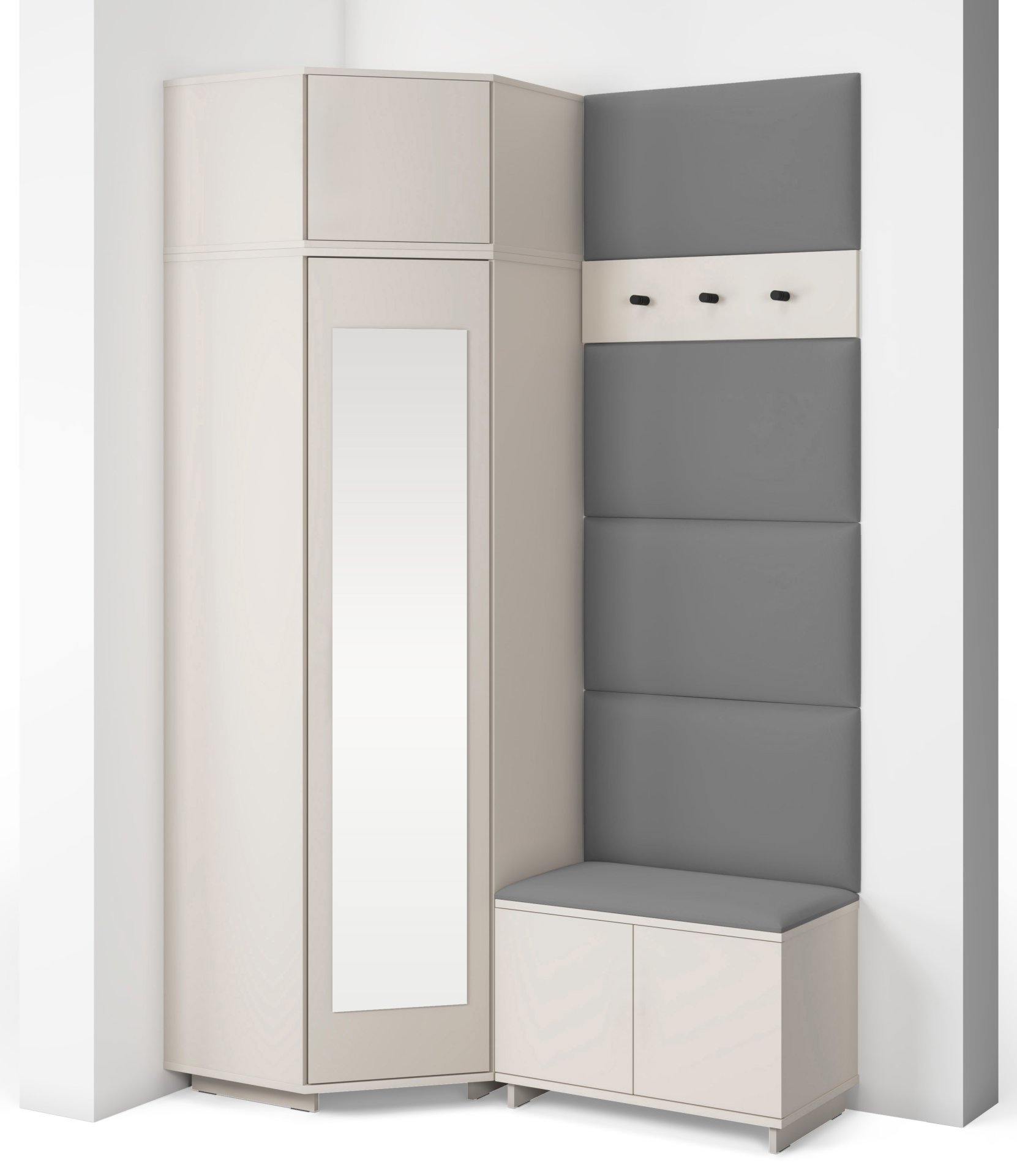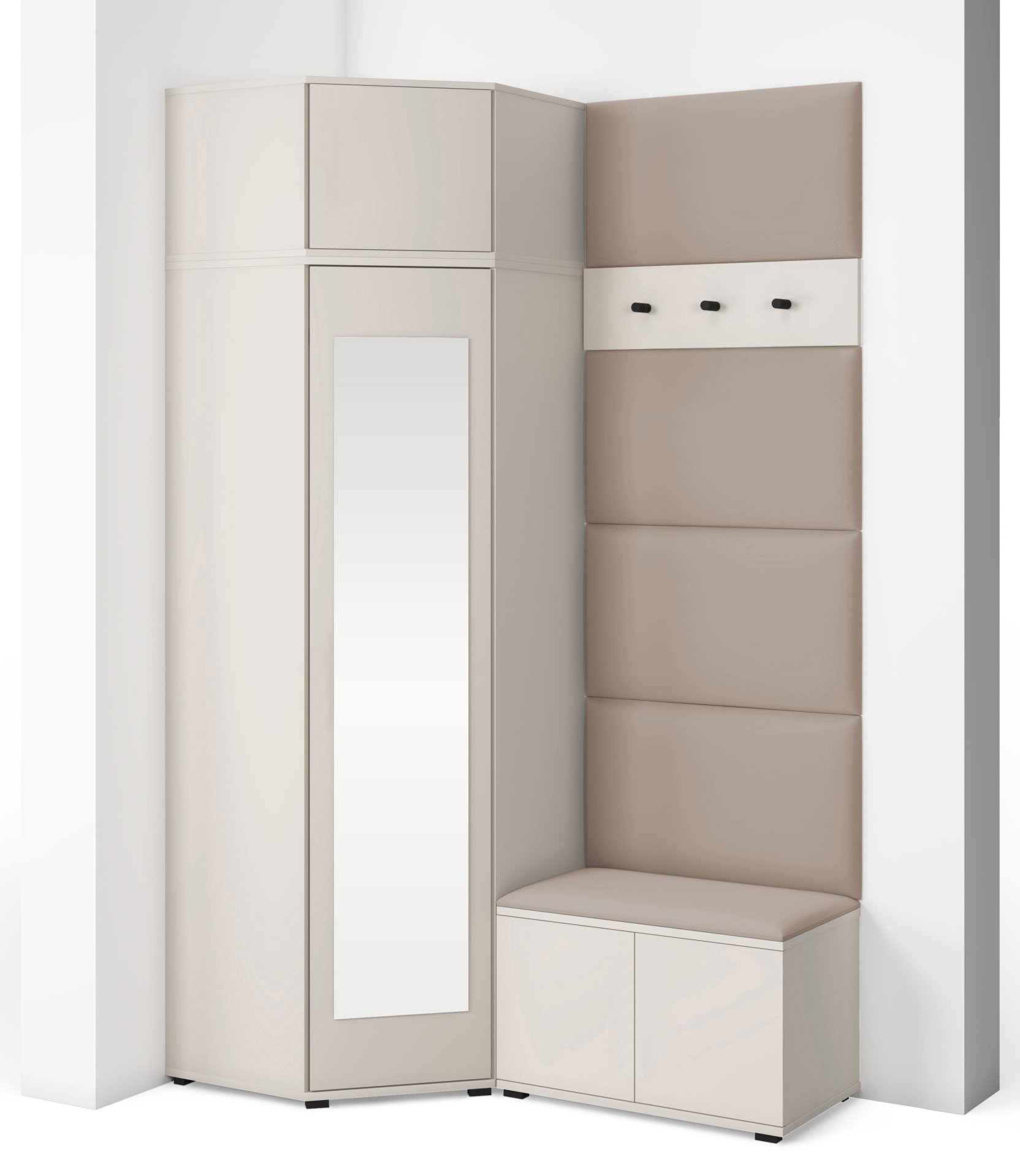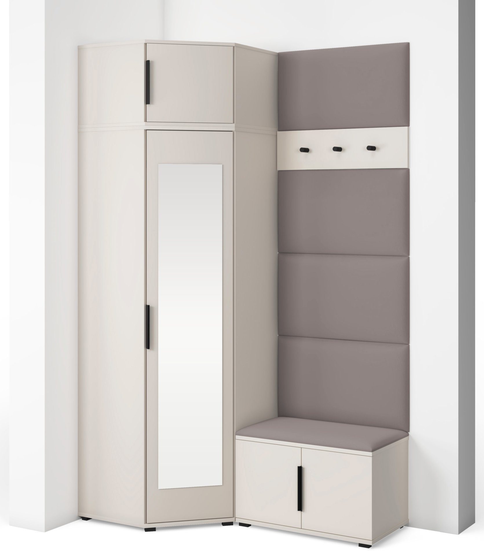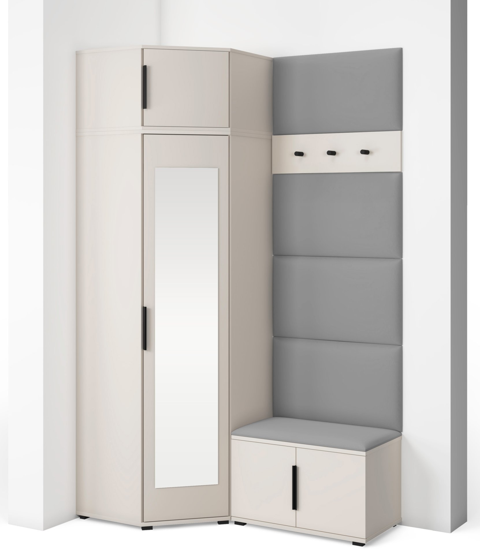 Svaki element kompleta Bianco 18 osmišljen je s mišlju na praktičnost. Kutni ormar omogućuje iskorištavanje inače neupotrebljivog kuta prostora, čime se povećava kapacitet za pohranu bez žrtvovanja prostranosti hodnika. Vješalice i tapecirane ploče stvaraju ugodno i privlačno okruženje, gdje se funkcionalnost isprepliće s estetskom dovršenošću.