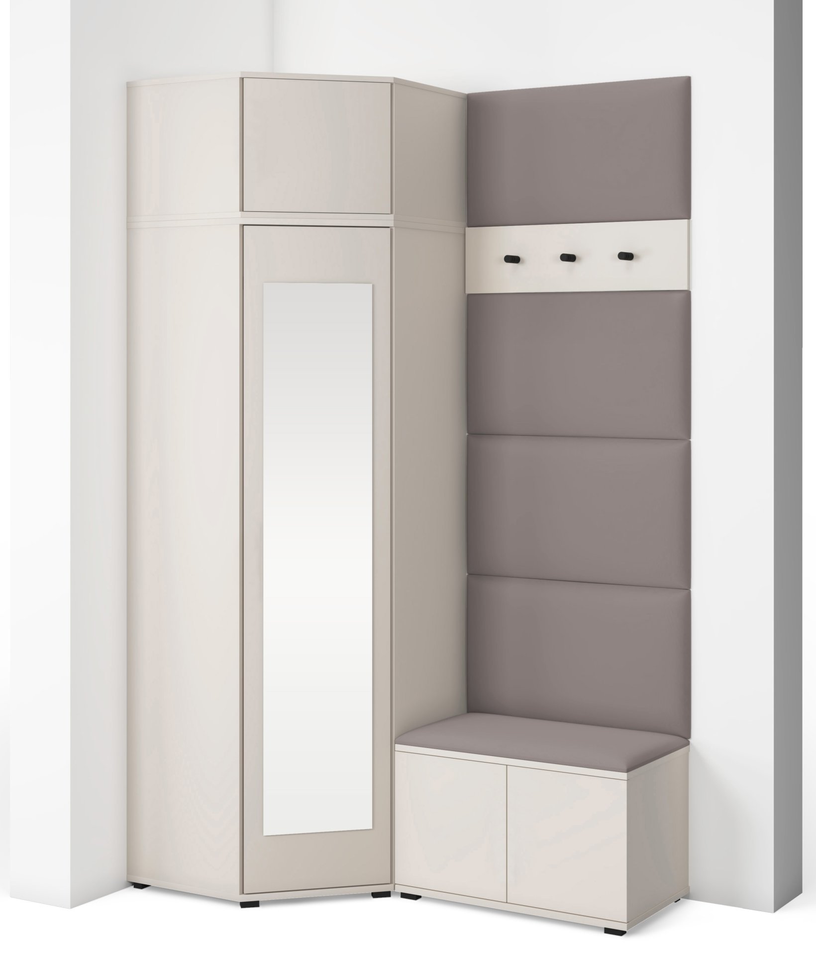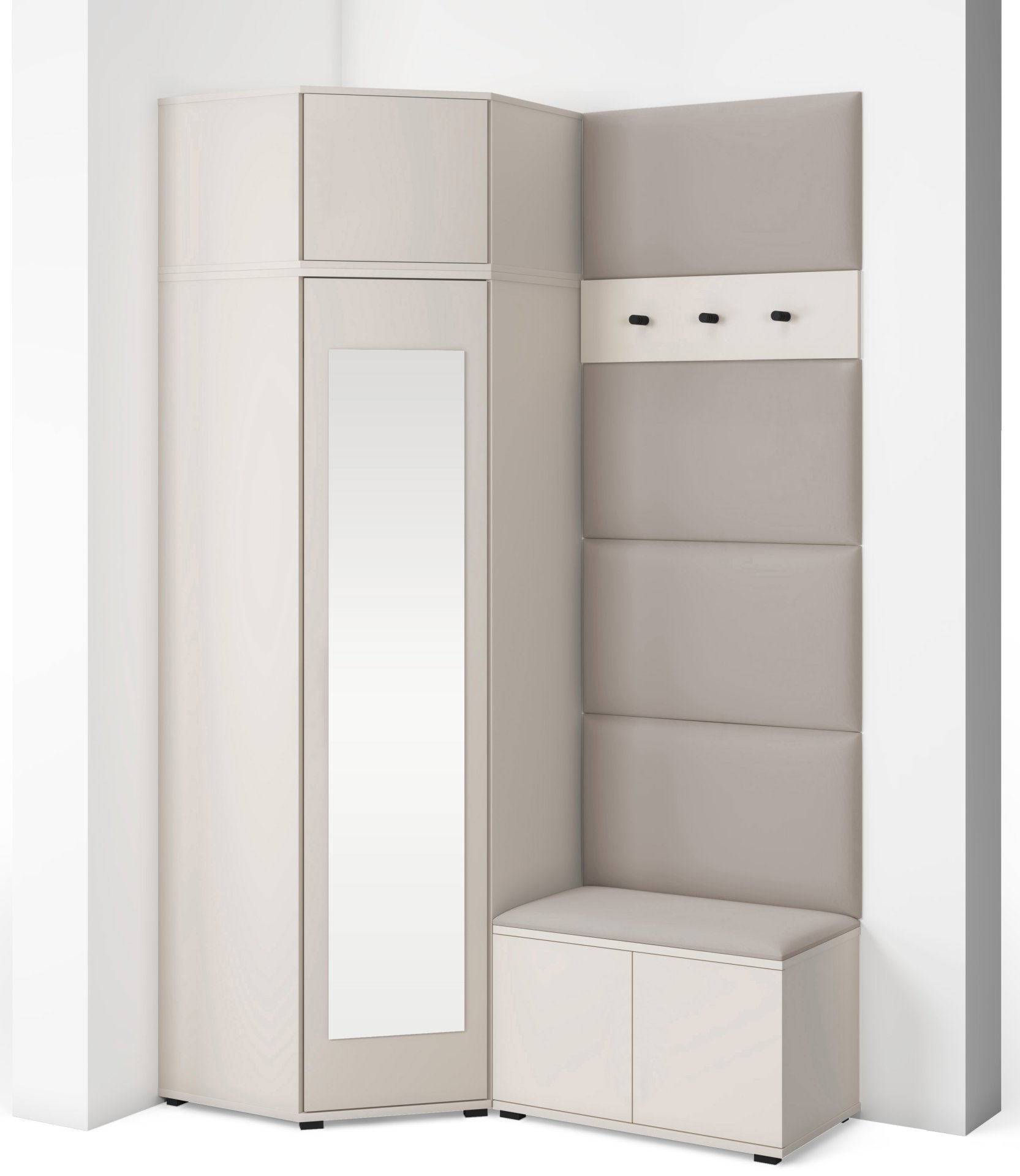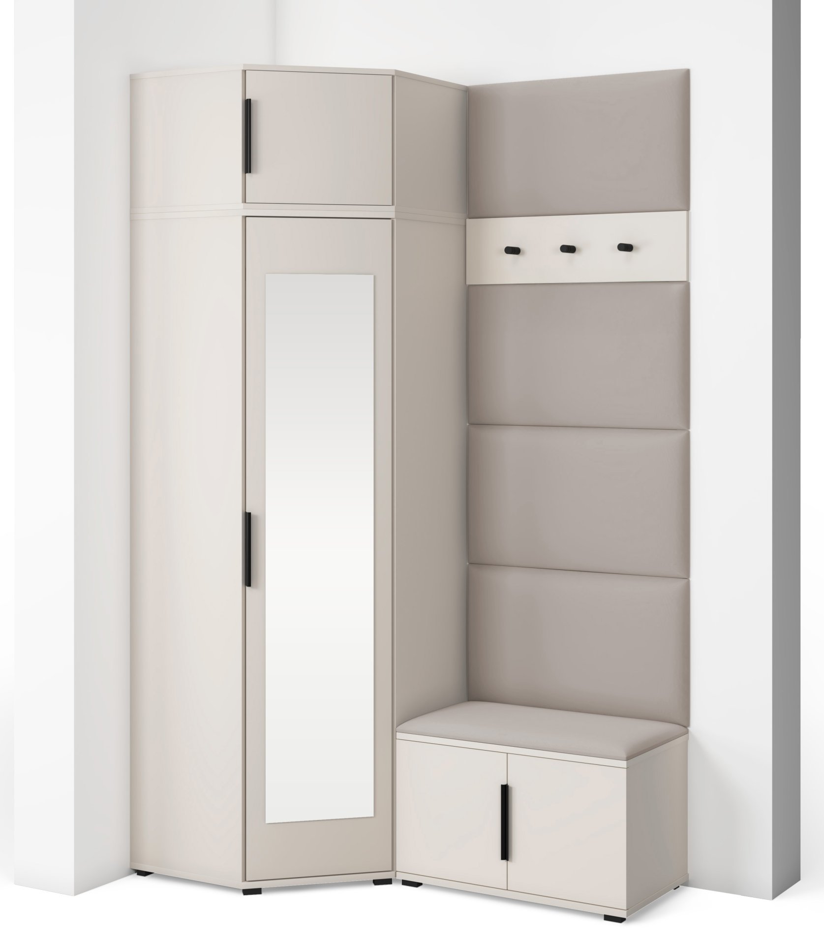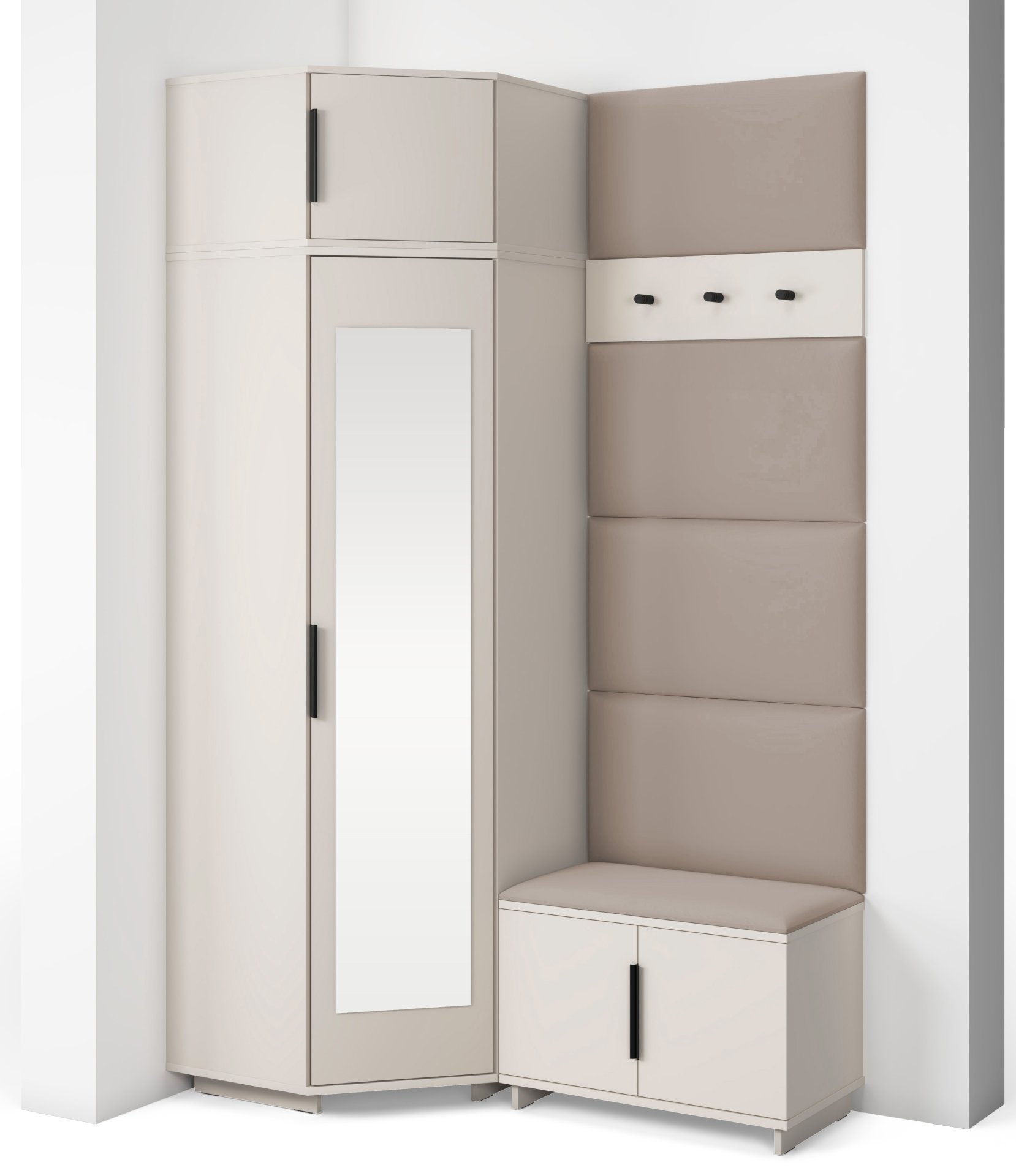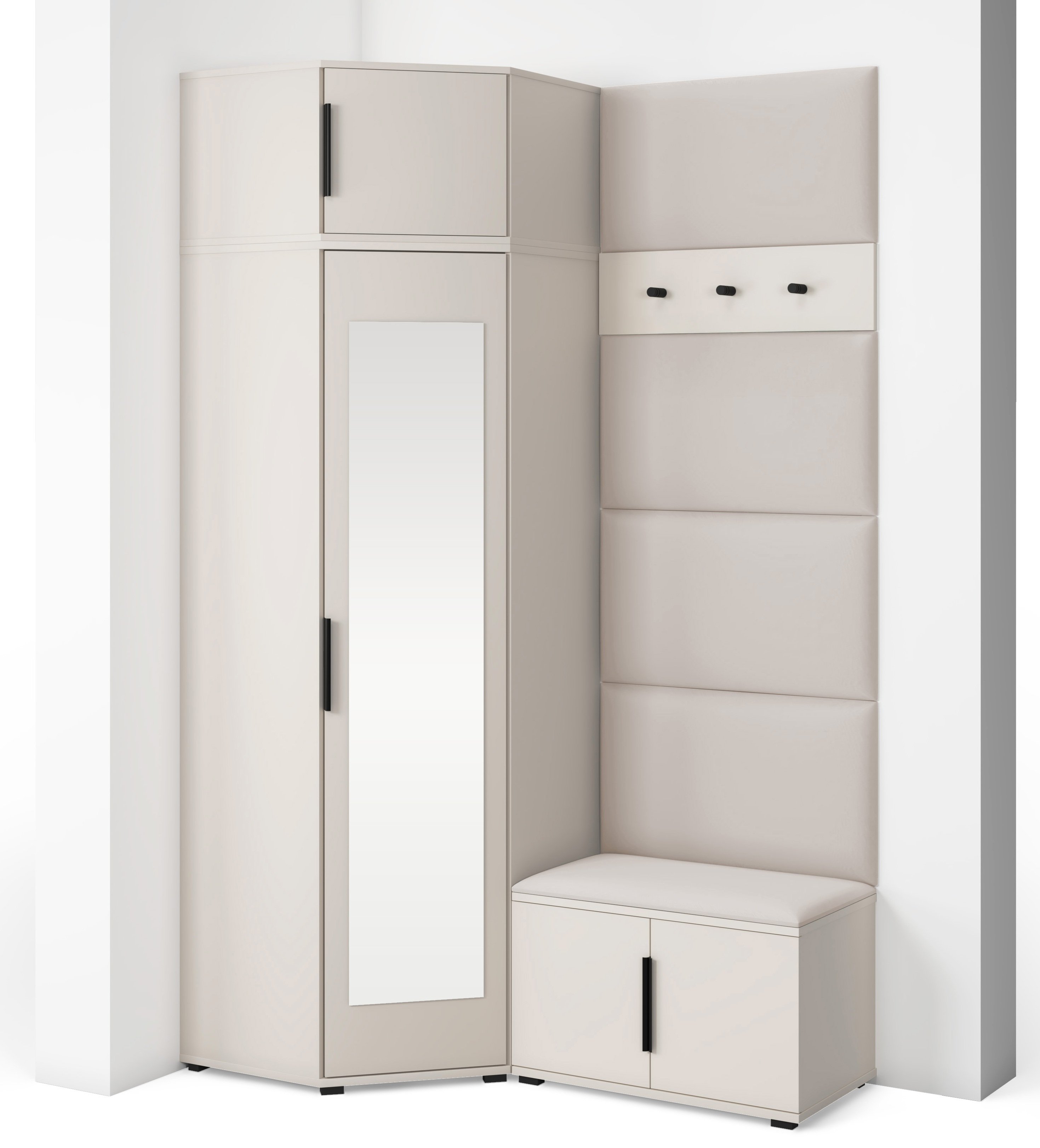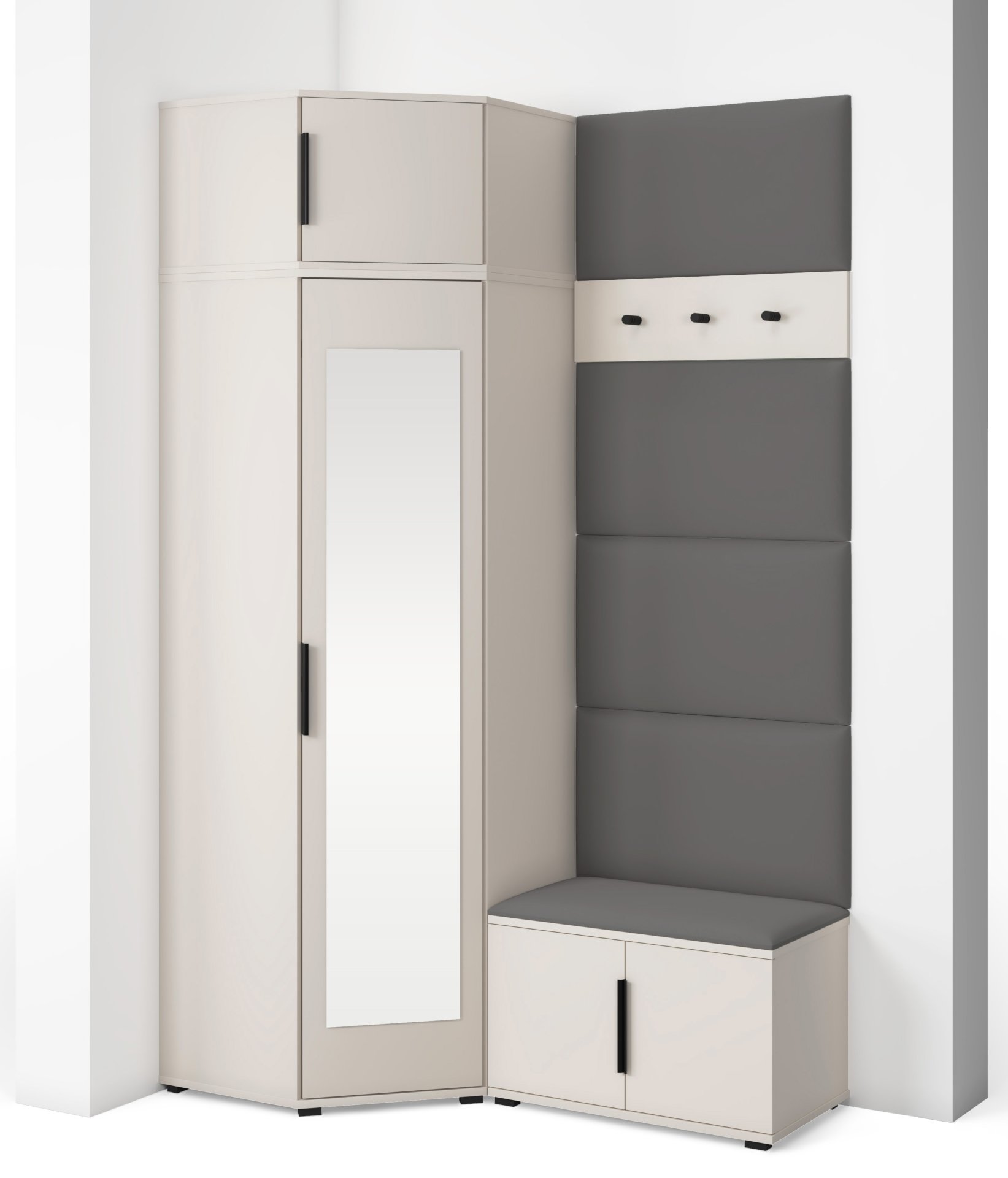 Svaki element kompleta Bianco 18 osmišljen je s mišlju na praktičnost. Kutni ormar omogućuje iskorištavanje inače neupotrebljivog kuta prostora, čime se povećava kapacitet za pohranu bez žrtvovanja prostranosti hodnika. Vješalice i tapecirane ploče stvaraju ugodno i privlačno okruženje, gdje se funkcionalnost isprepliće s estetskom dovršenošću.