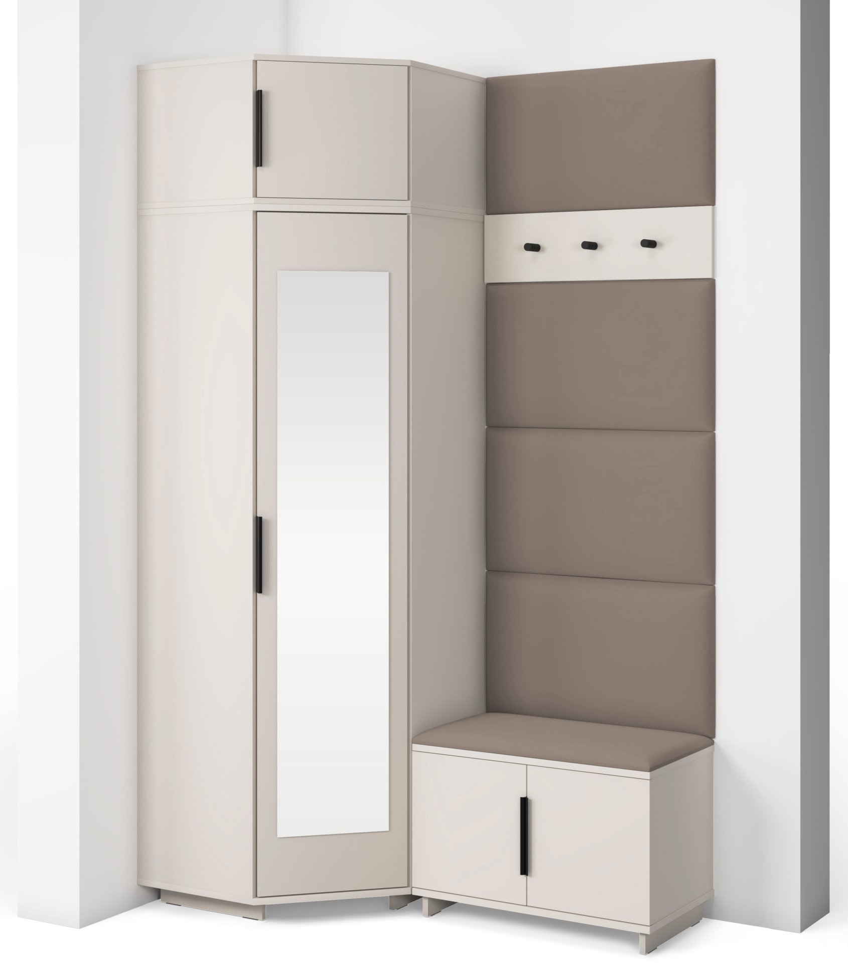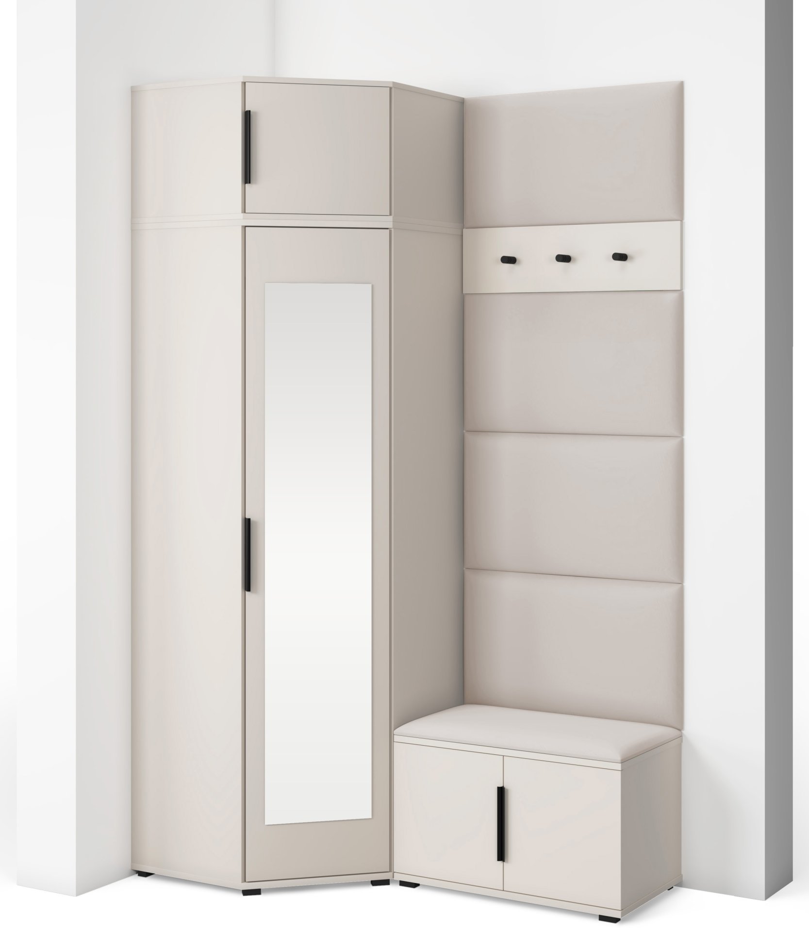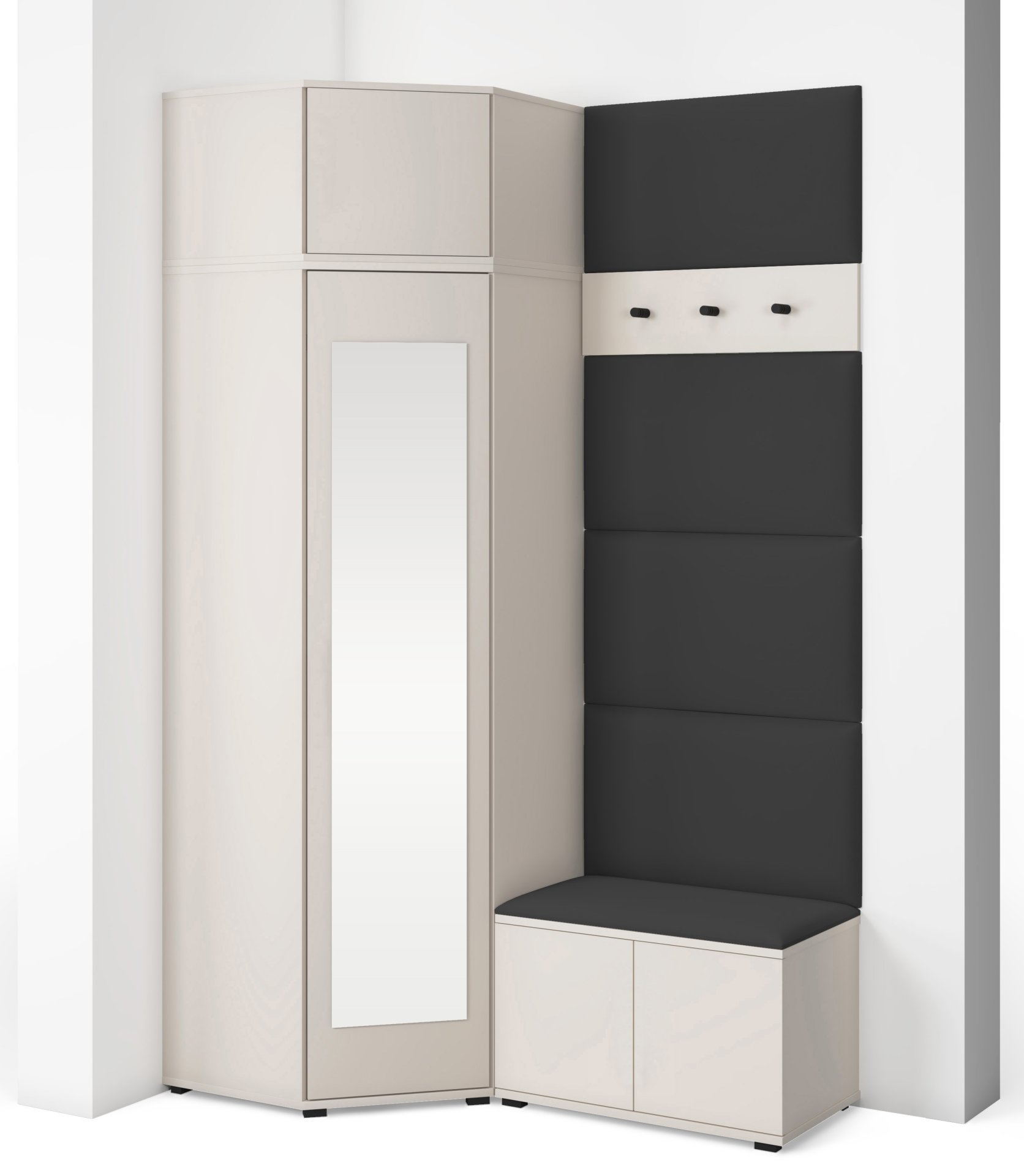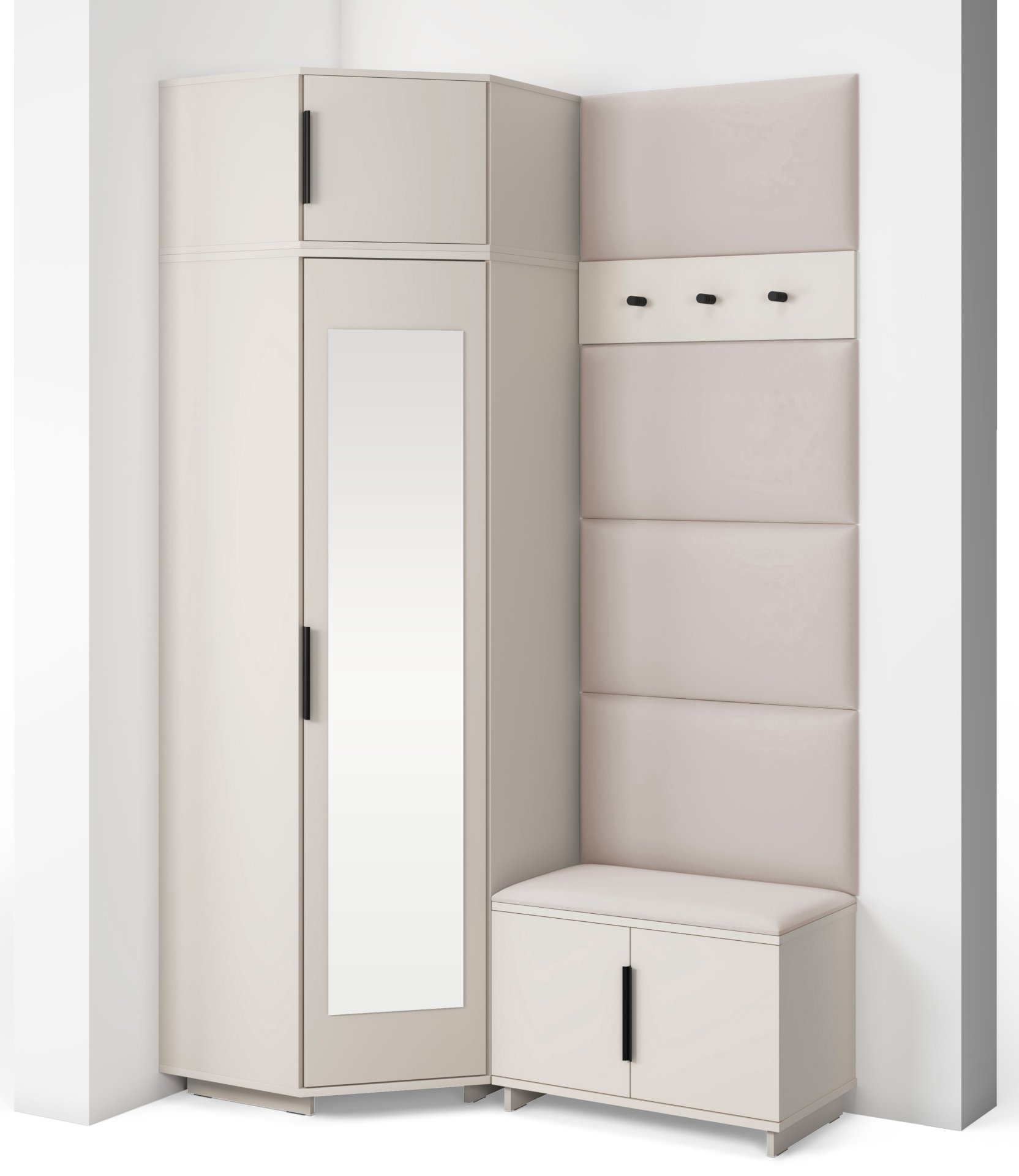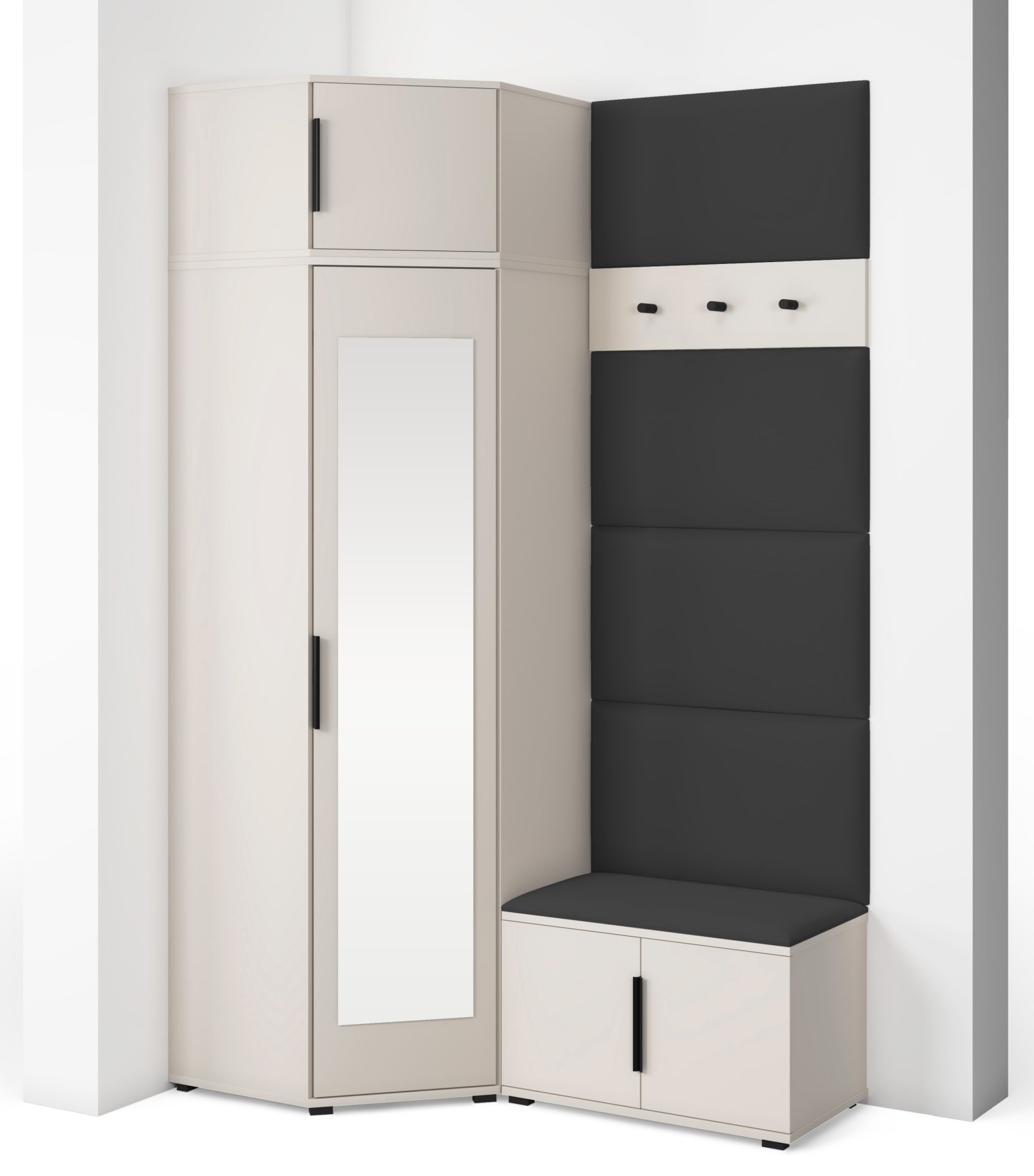 Svaki element kompleta Bianco 18 osmišljen je s mišlju na praktičnost. Kutni ormar omogućuje iskorištavanje inače neupotrebljivog kuta prostora, čime se povećava kapacitet za pohranu bez žrtvovanja prostranosti hodnika. Vješalice i tapecirane ploče stvaraju ugodno i privlačno okruženje, gdje se funkcionalnost isprepliće s estetskom dovršenošću.