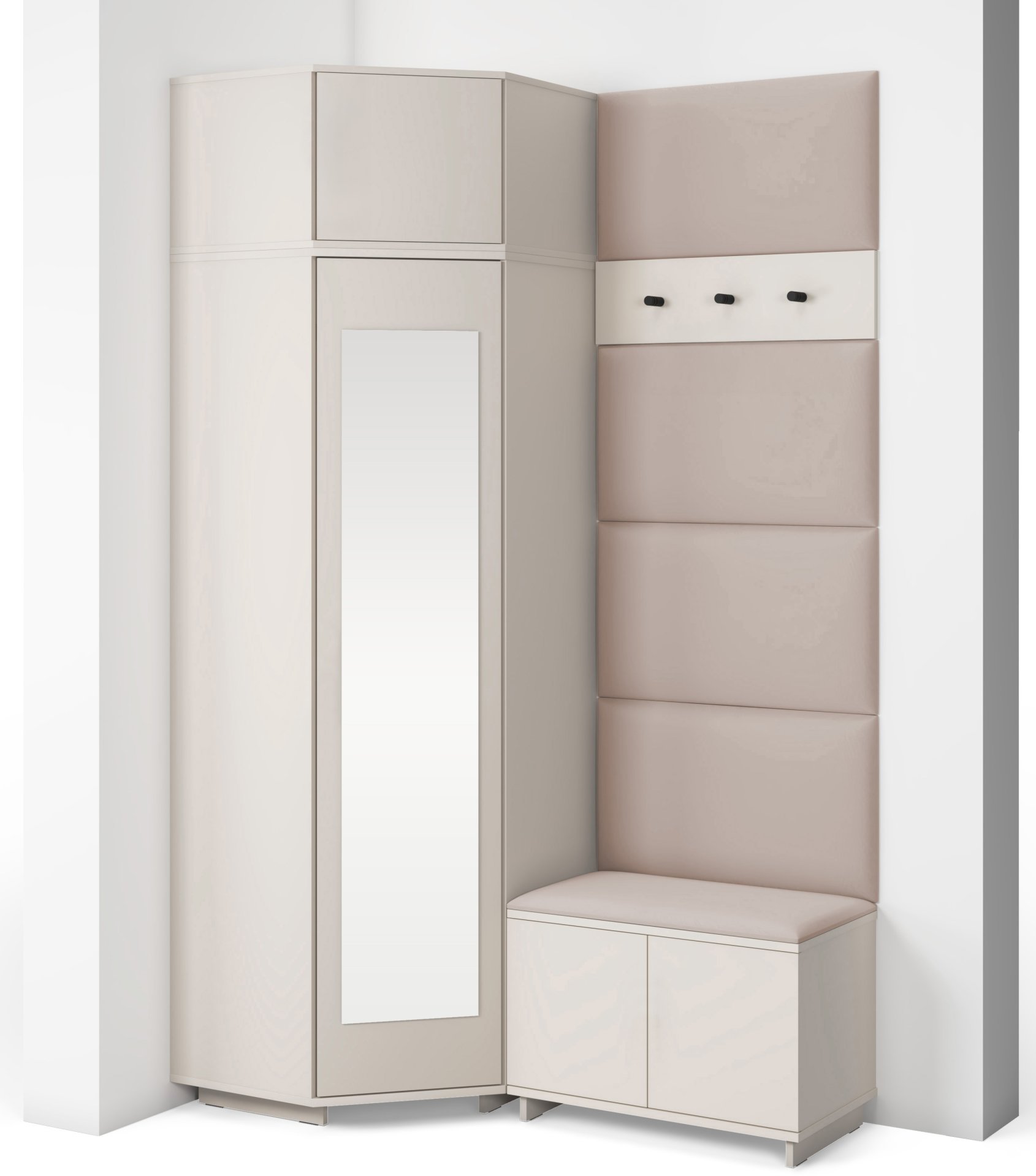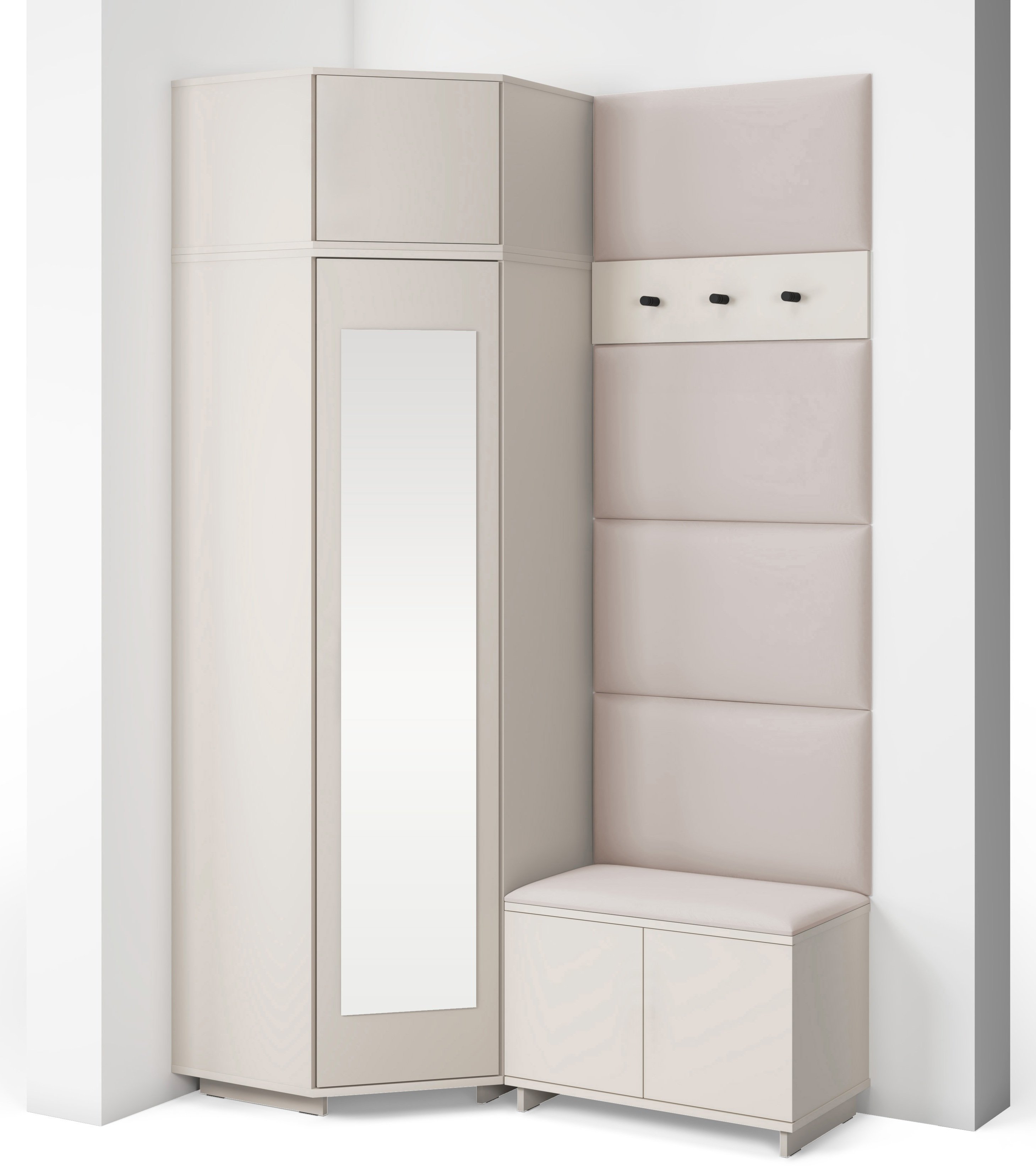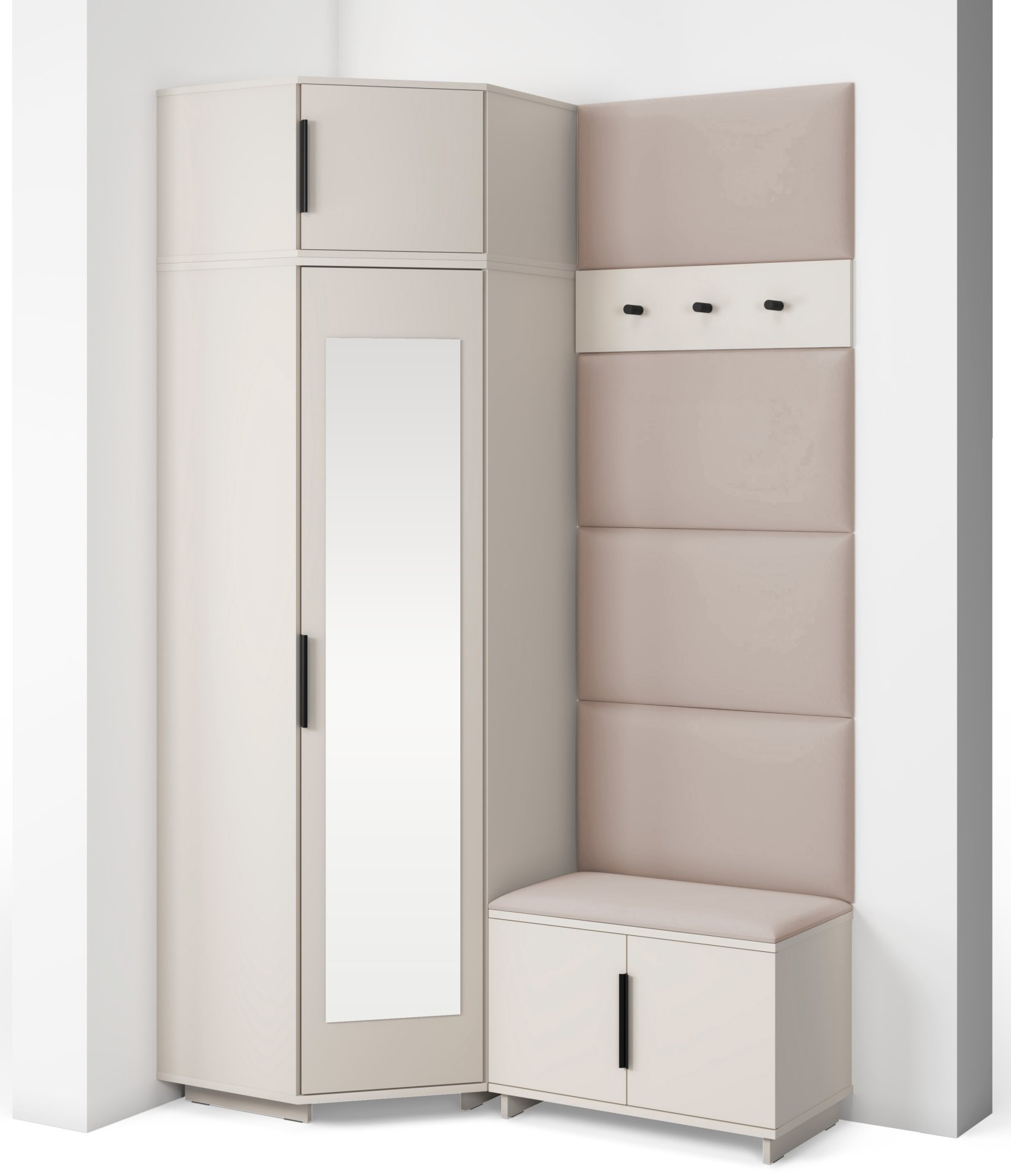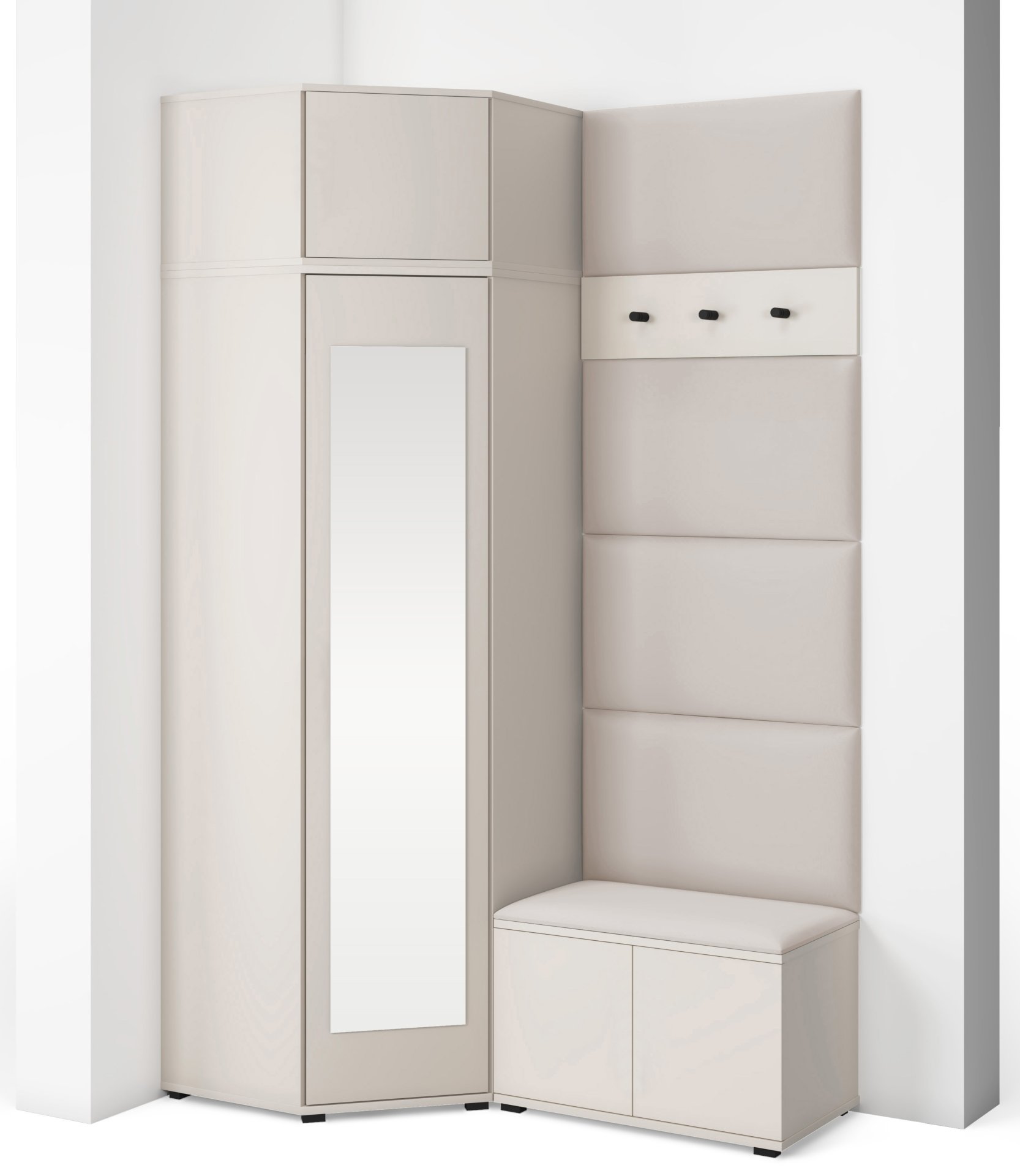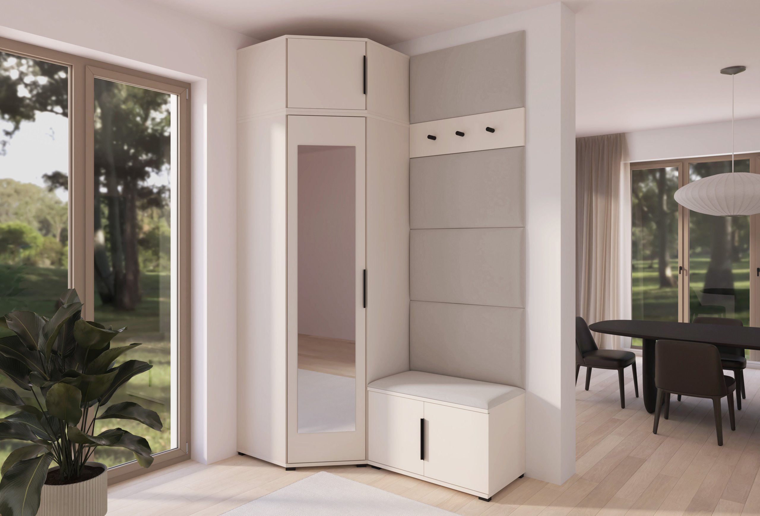 Svaki element kompleta Bianco 18 osmišljen je s mišlju na praktičnost. Kutni ormar omogućuje iskorištavanje inače neupotrebljivog kuta prostora, čime se povećava kapacitet za pohranu bez žrtvovanja prostranosti hodnika. Vješalice i tapecirane ploče stvaraju ugodno i privlačno okruženje, gdje se funkcionalnost isprepliće s estetskom dovršenošću.