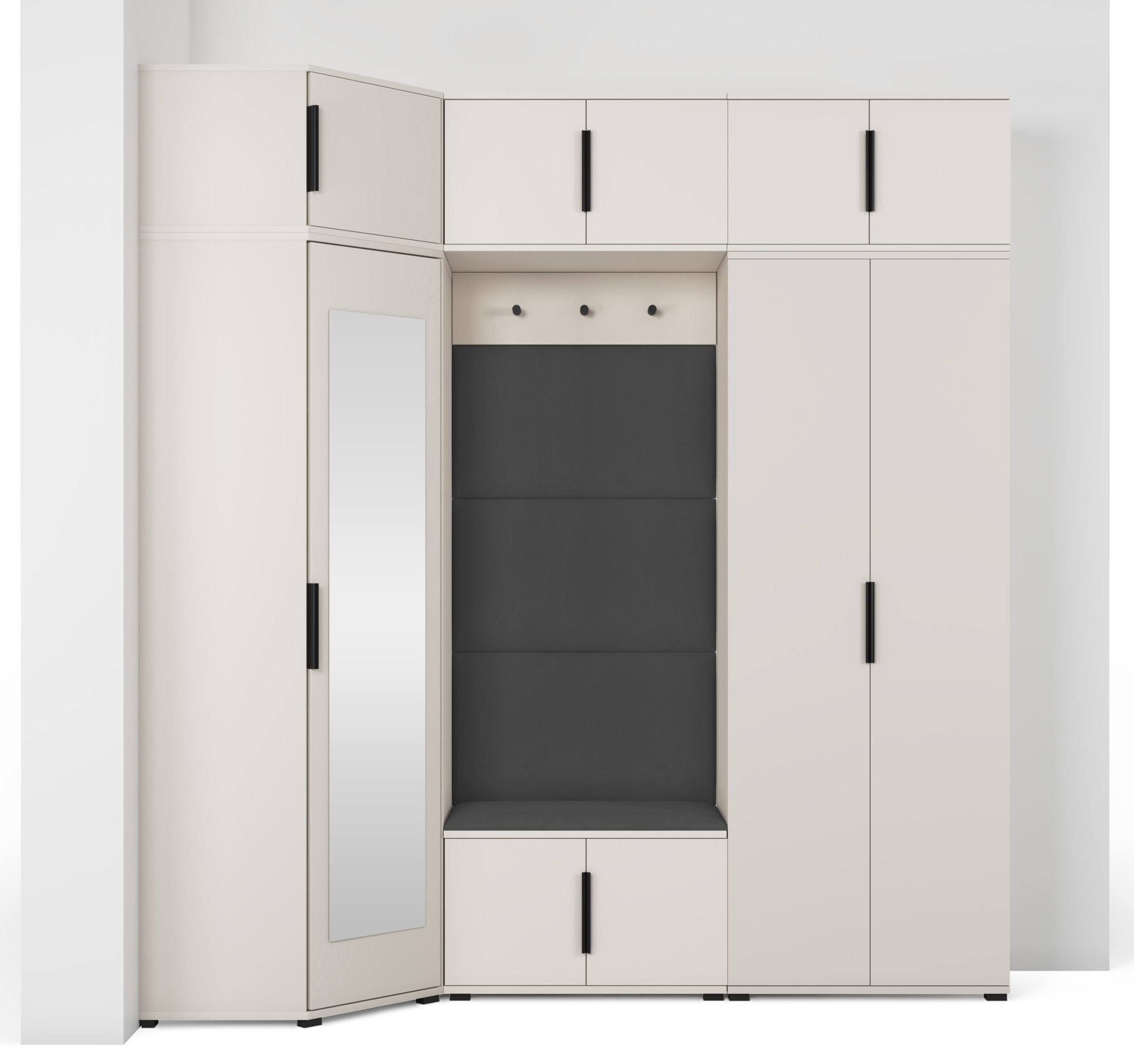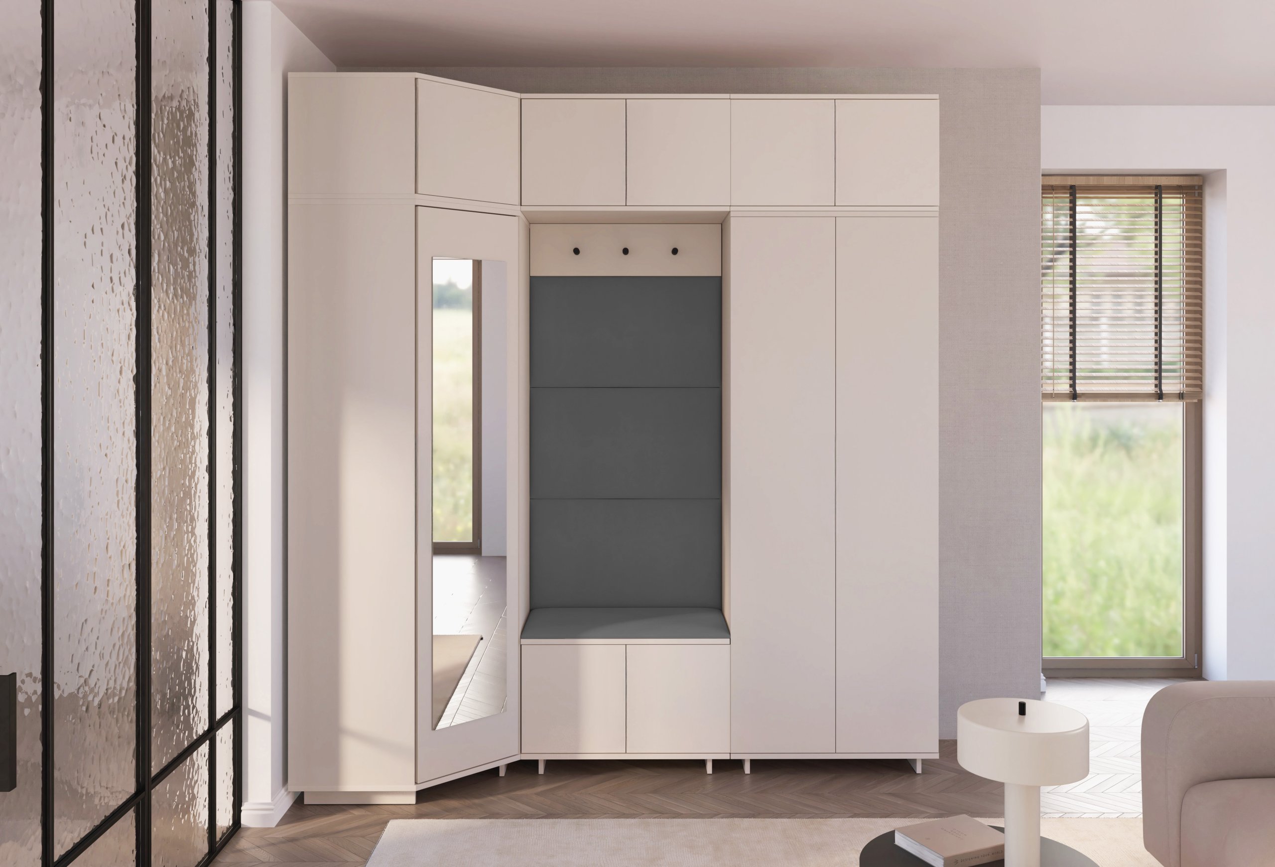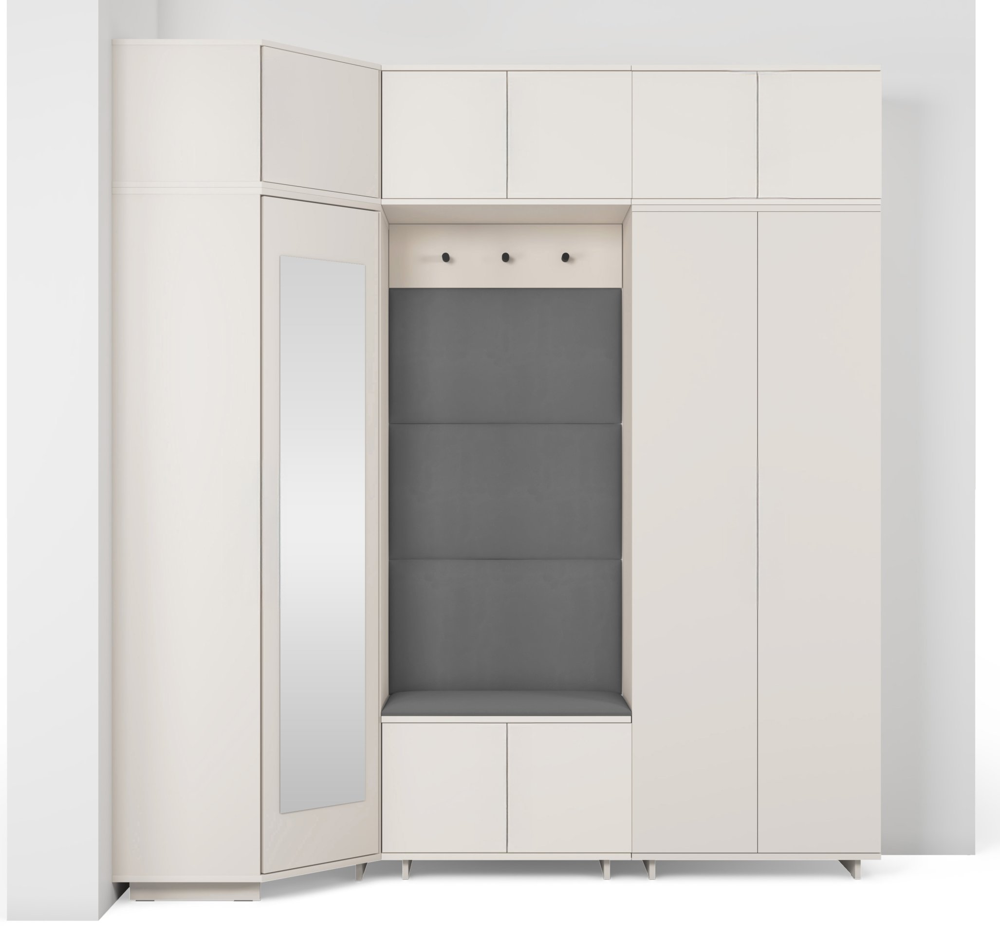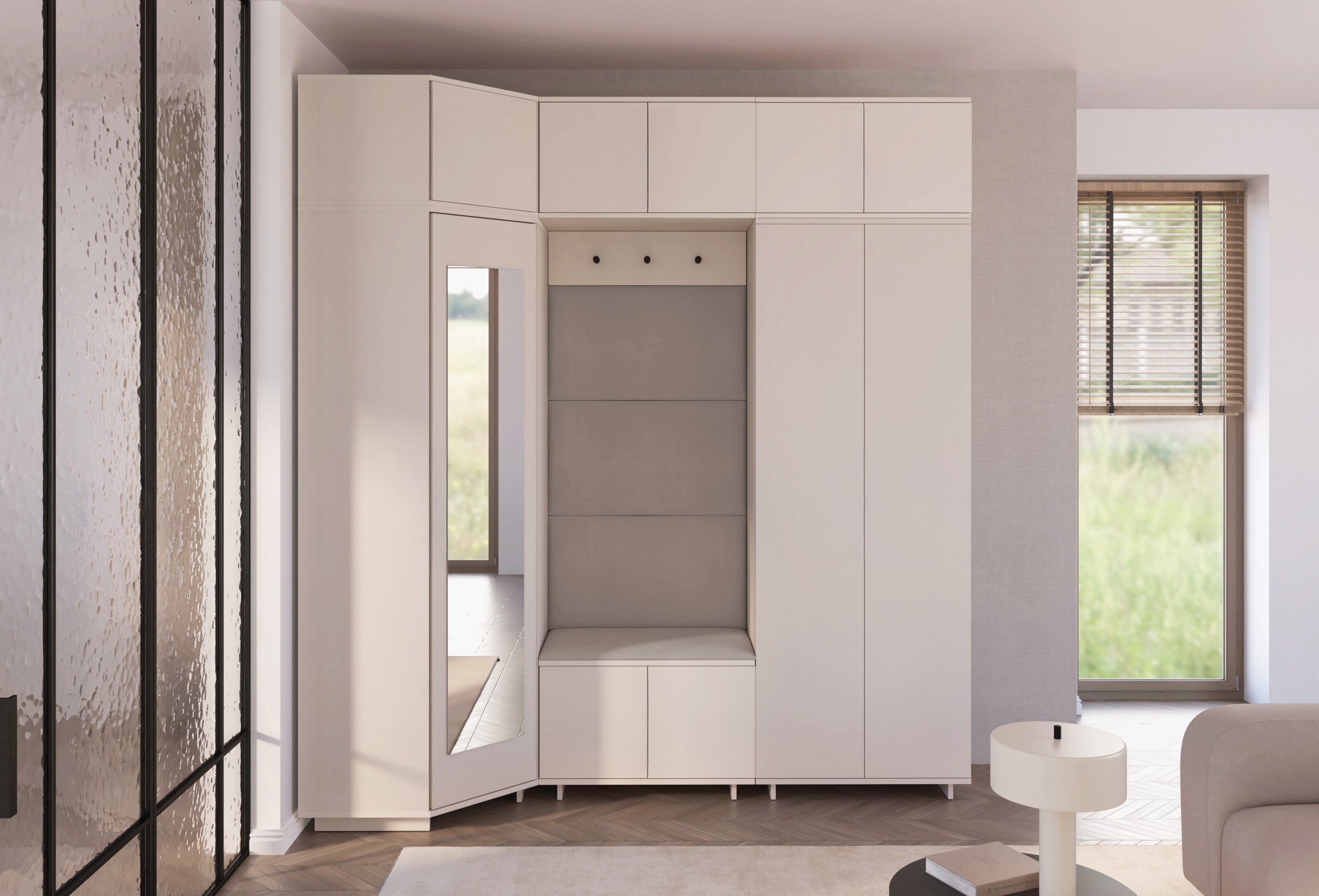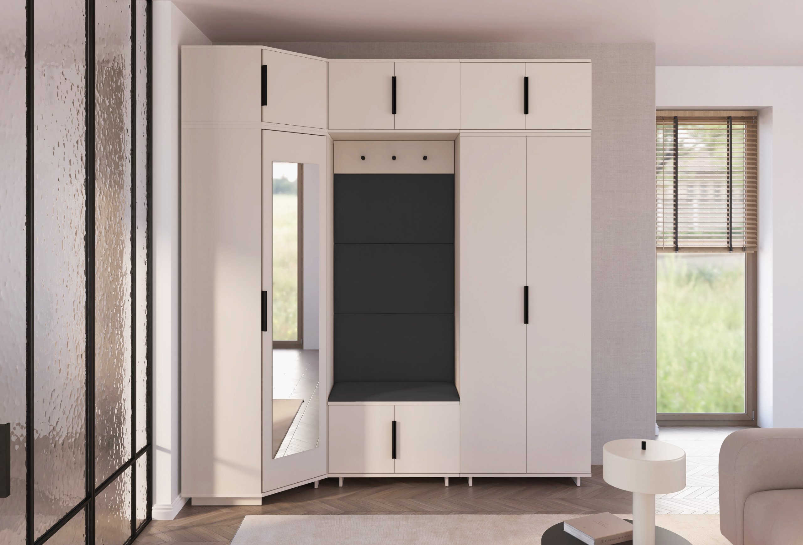 Komplet za hodnik Bianco 20 dizajniran je tako da spaja estetiku i uporabnost. Ogledalo u kutnom ormaru omogućuje brzo provjeravanje izgleda prije izlaska, dok brojni prostori za odlaganje pomažu u održavanju reda. Sjedeći dio pruža udobnost pri obuvanju, a tapecirane ploče osiguravaju ugodan osjećaj i vizualnu toplinu.