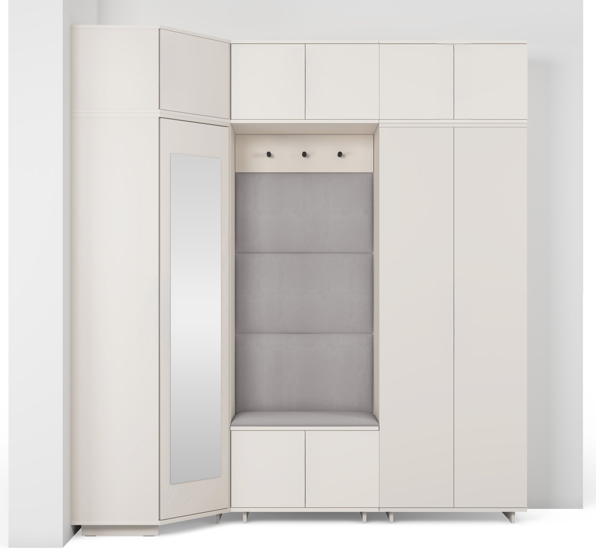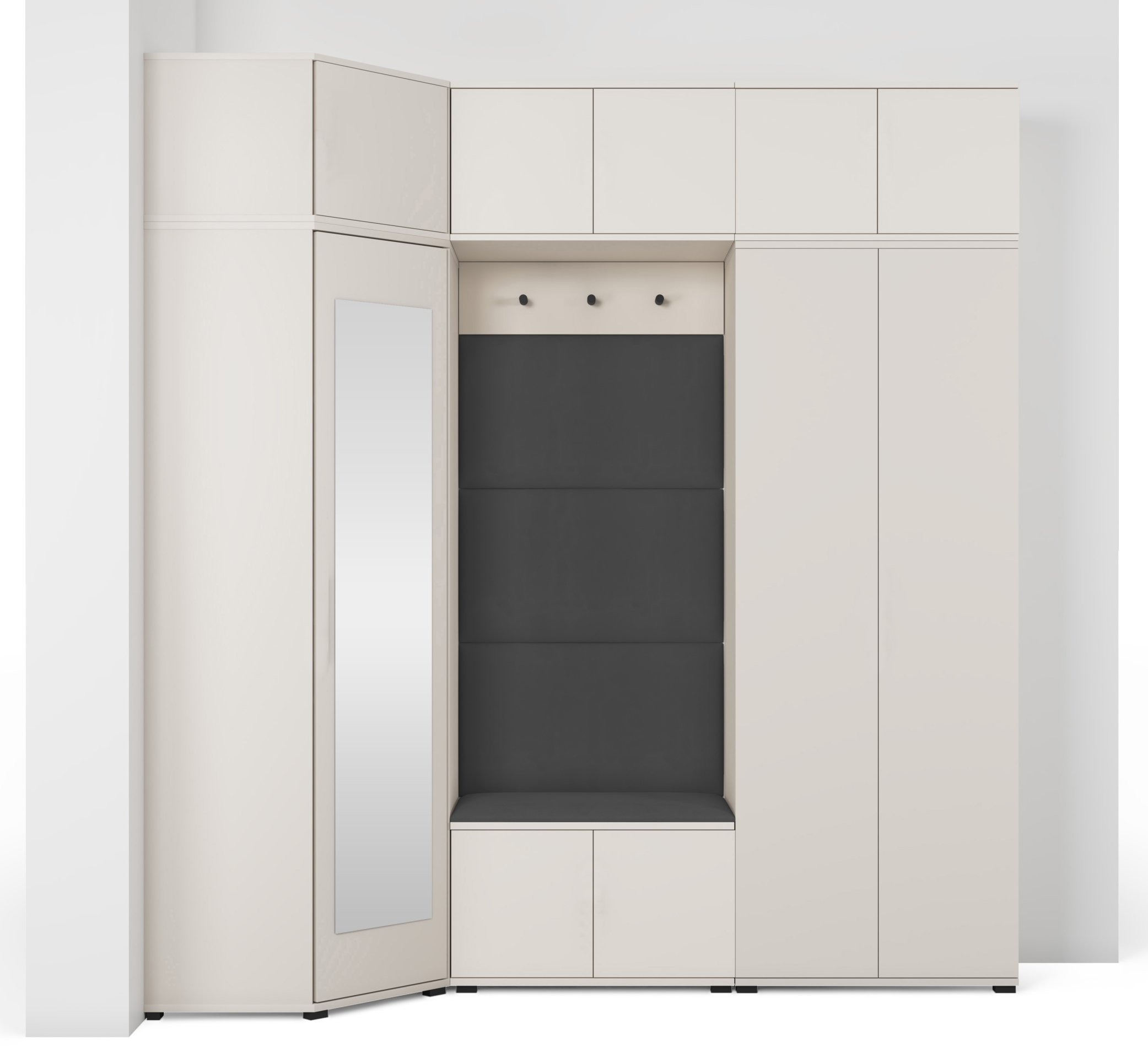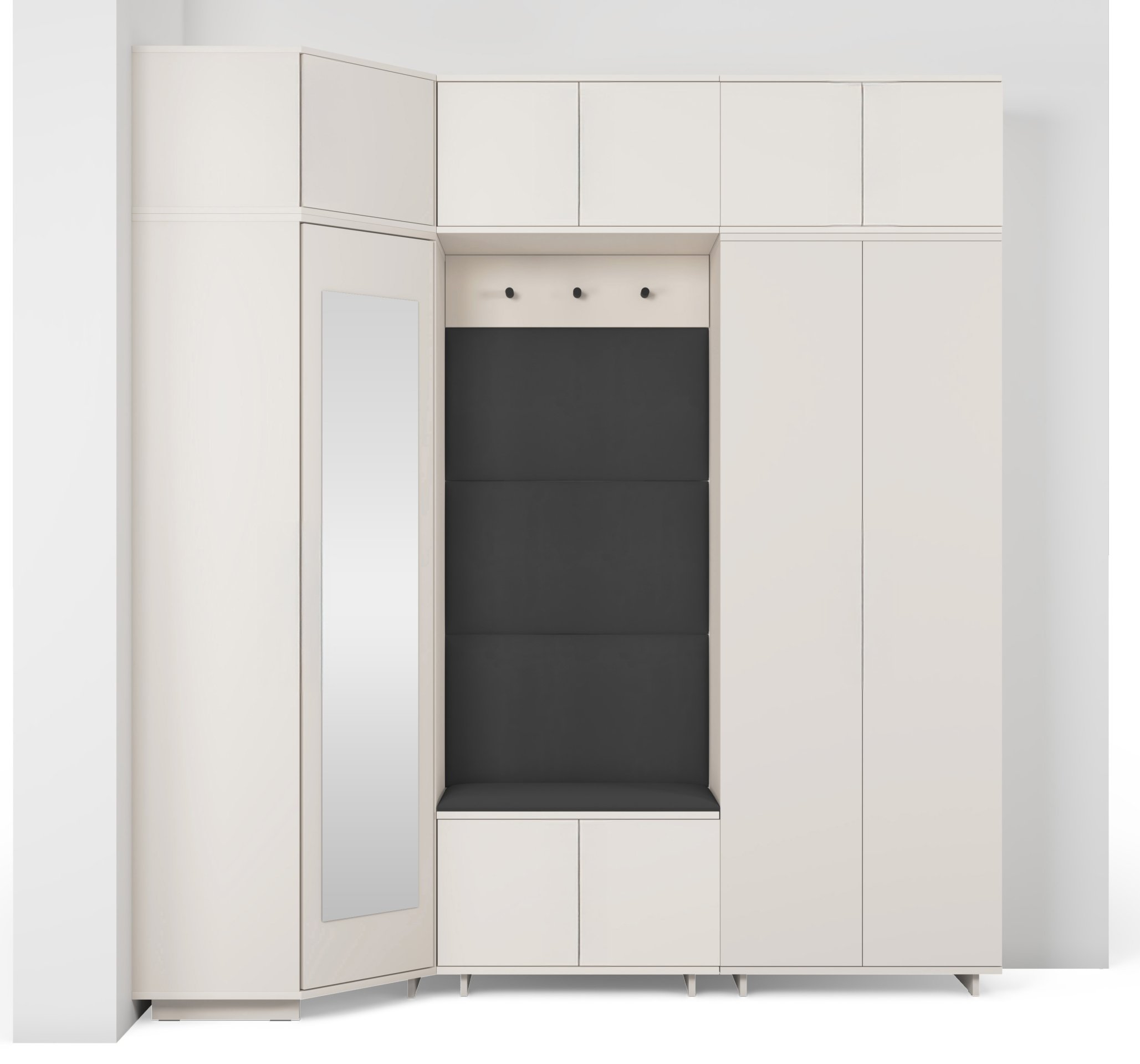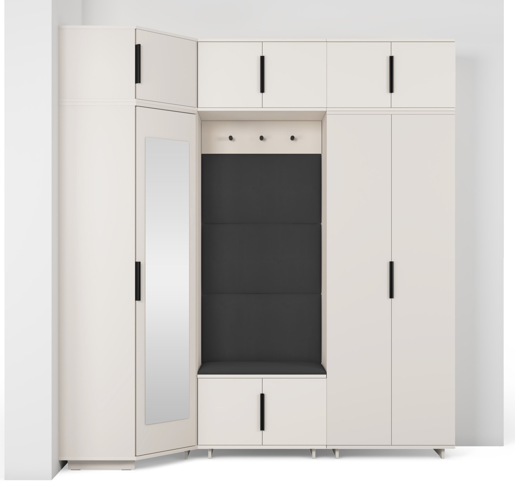 Komplet za hodnik Bianco 20 dizajniran je tako da spaja estetiku i uporabnost. Ogledalo u kutnom ormaru omogućuje brzo provjeravanje izgleda prije izlaska, dok brojni prostori za odlaganje pomažu u održavanju reda. Sjedeći dio pruža udobnost pri obuvanju, a tapecirane ploče osiguravaju ugodan osjećaj i vizualnu toplinu.