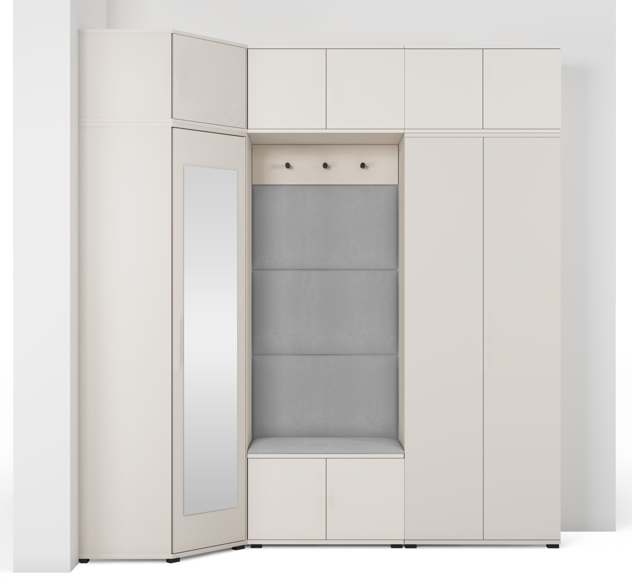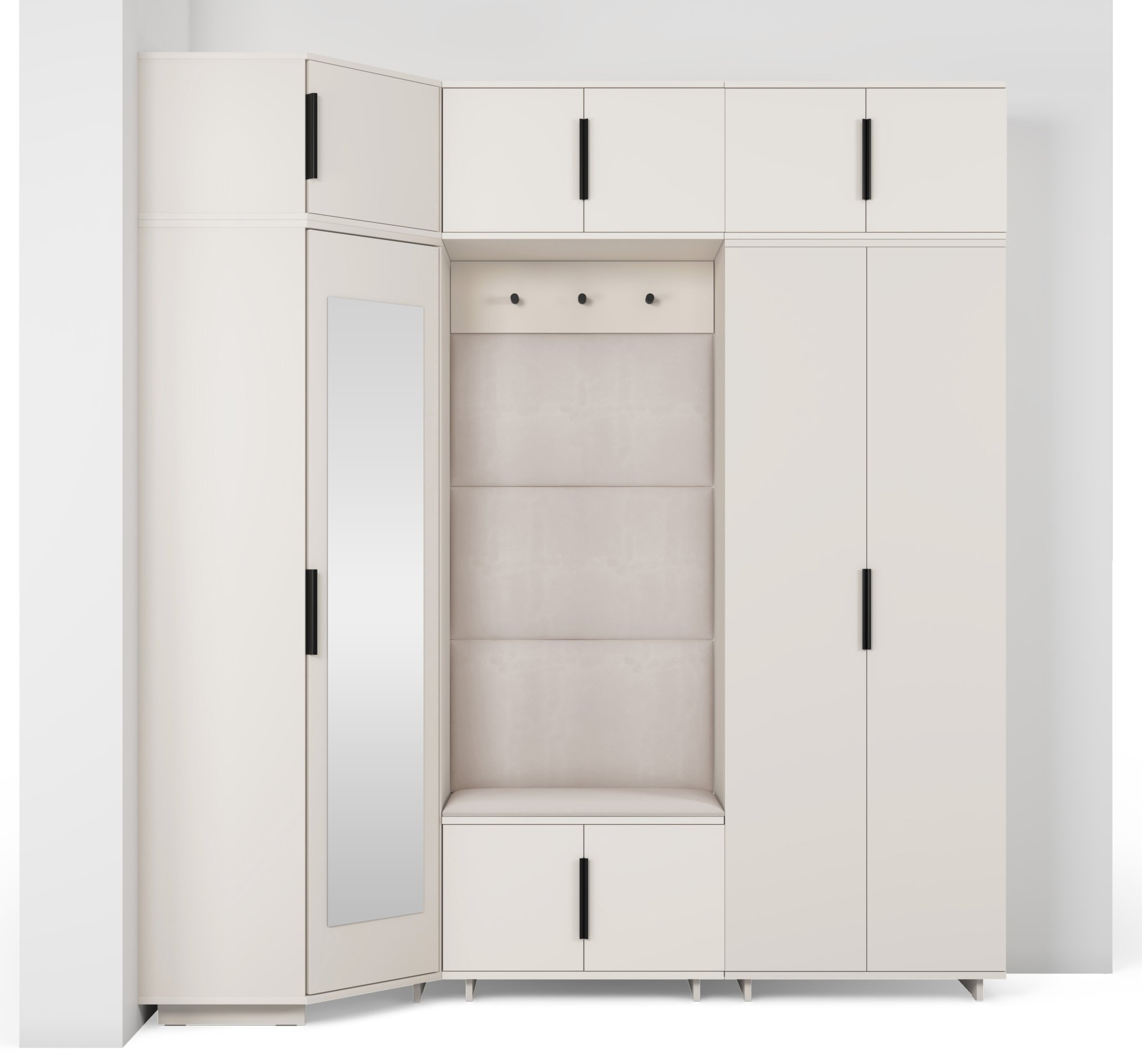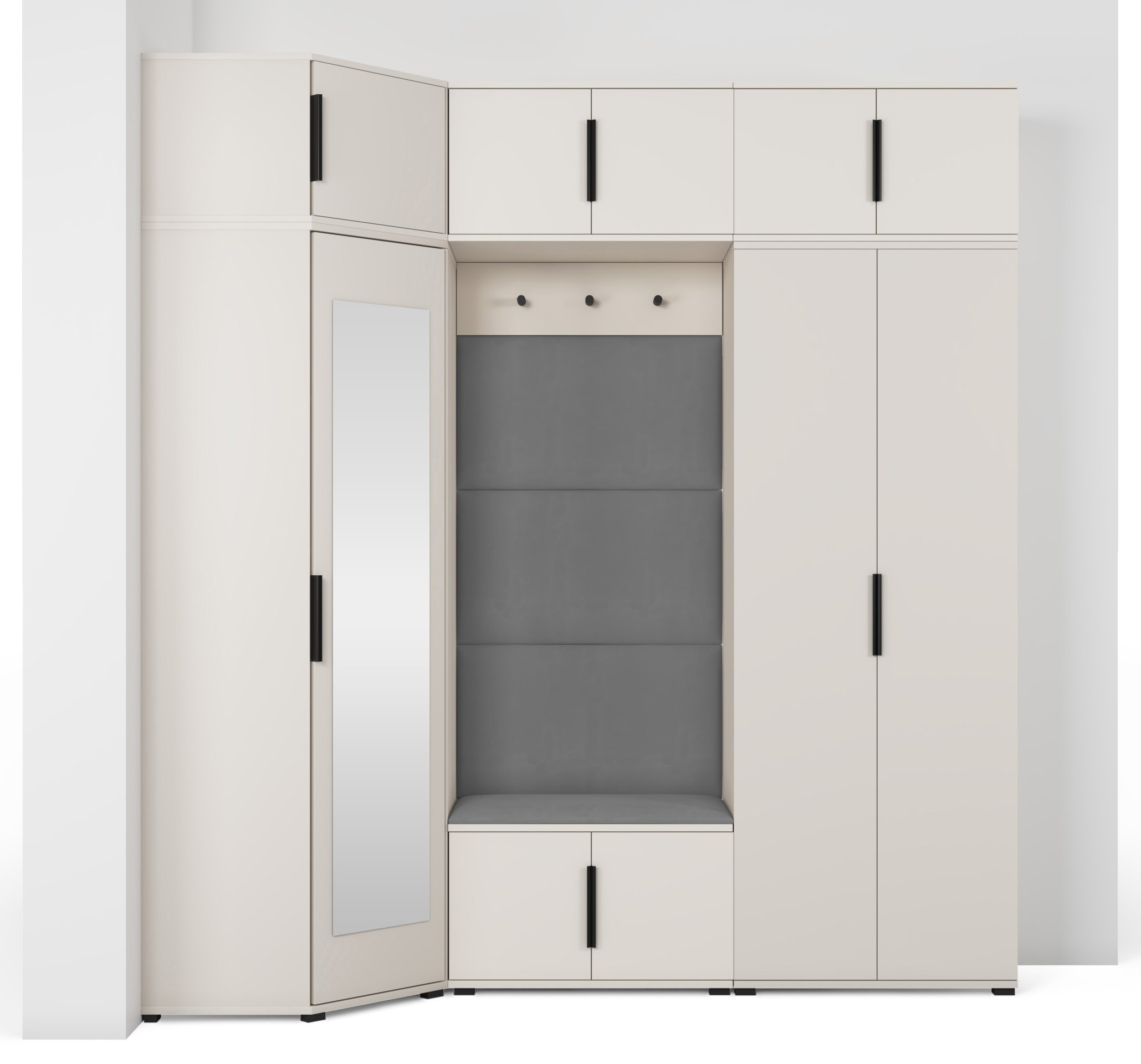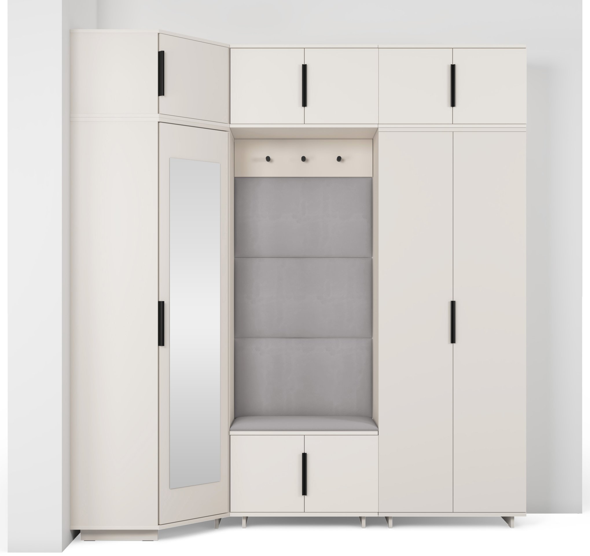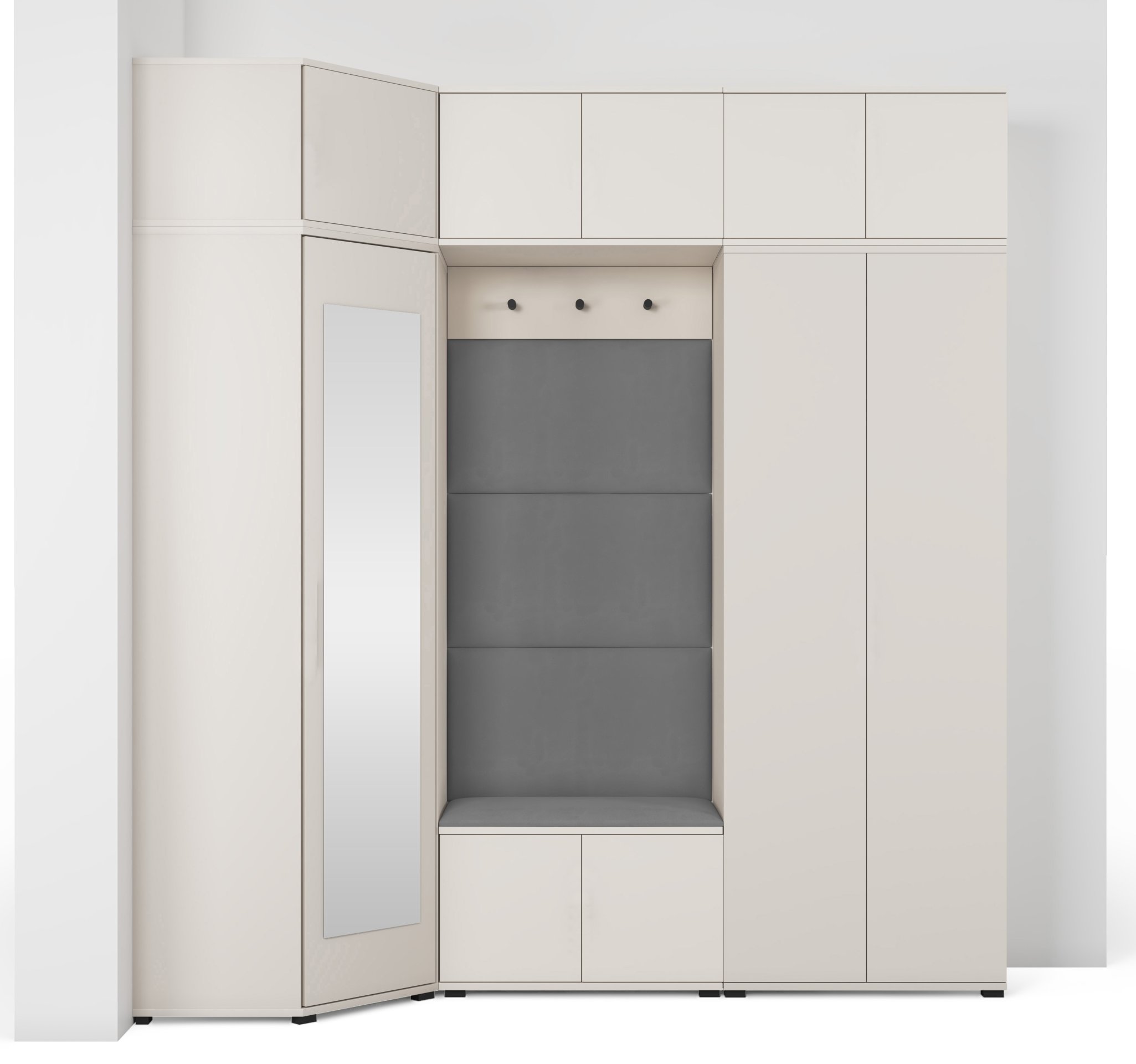 Komplet za hodnik Bianco 20 dizajniran je tako da spaja estetiku i uporabnost. Ogledalo u kutnom ormaru omogućuje brzo provjeravanje izgleda prije izlaska, dok brojni prostori za odlaganje pomažu u održavanju reda. Sjedeći dio pruža udobnost pri obuvanju, a tapecirane ploče osiguravaju ugodan osjećaj i vizualnu toplinu.