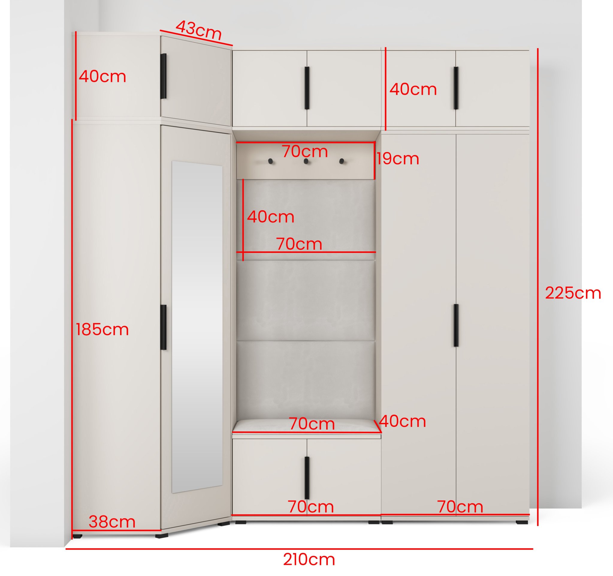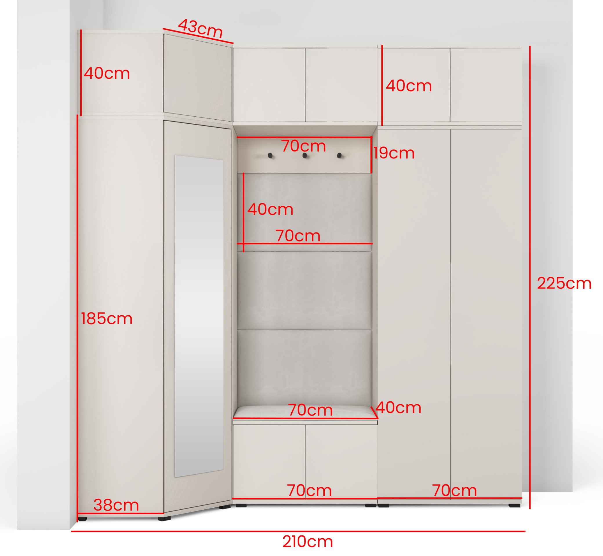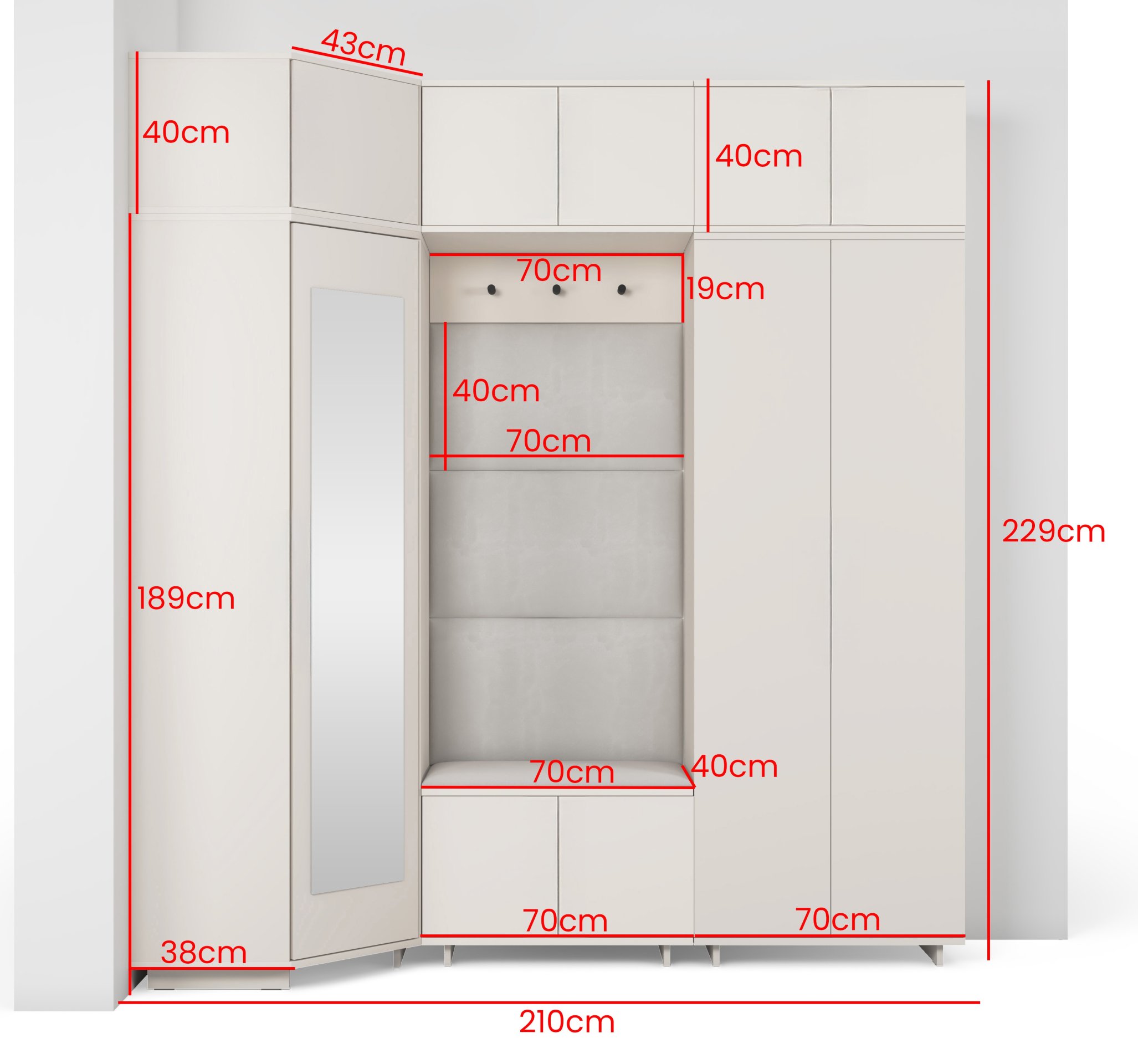 Komplet za hodnik Bianco 20 marke PKMebel predstavlja elegantno i funkcionalno rješenje za uredan hodnik. Svojom toplom kašmir bojom i čistim linijama stvara osjećaj domaćeg ugođaja i urednosti, a istovremeno nudi dovoljno prostora za pohranu. Dimenzije 210 × 40 × 229 cm omogućuju optimalno iskorištavanje prostora i u manjim hodnicima, dok promišljeni sastav elemenata osigurava praktičnu uporabu u svakodnevnom životu.