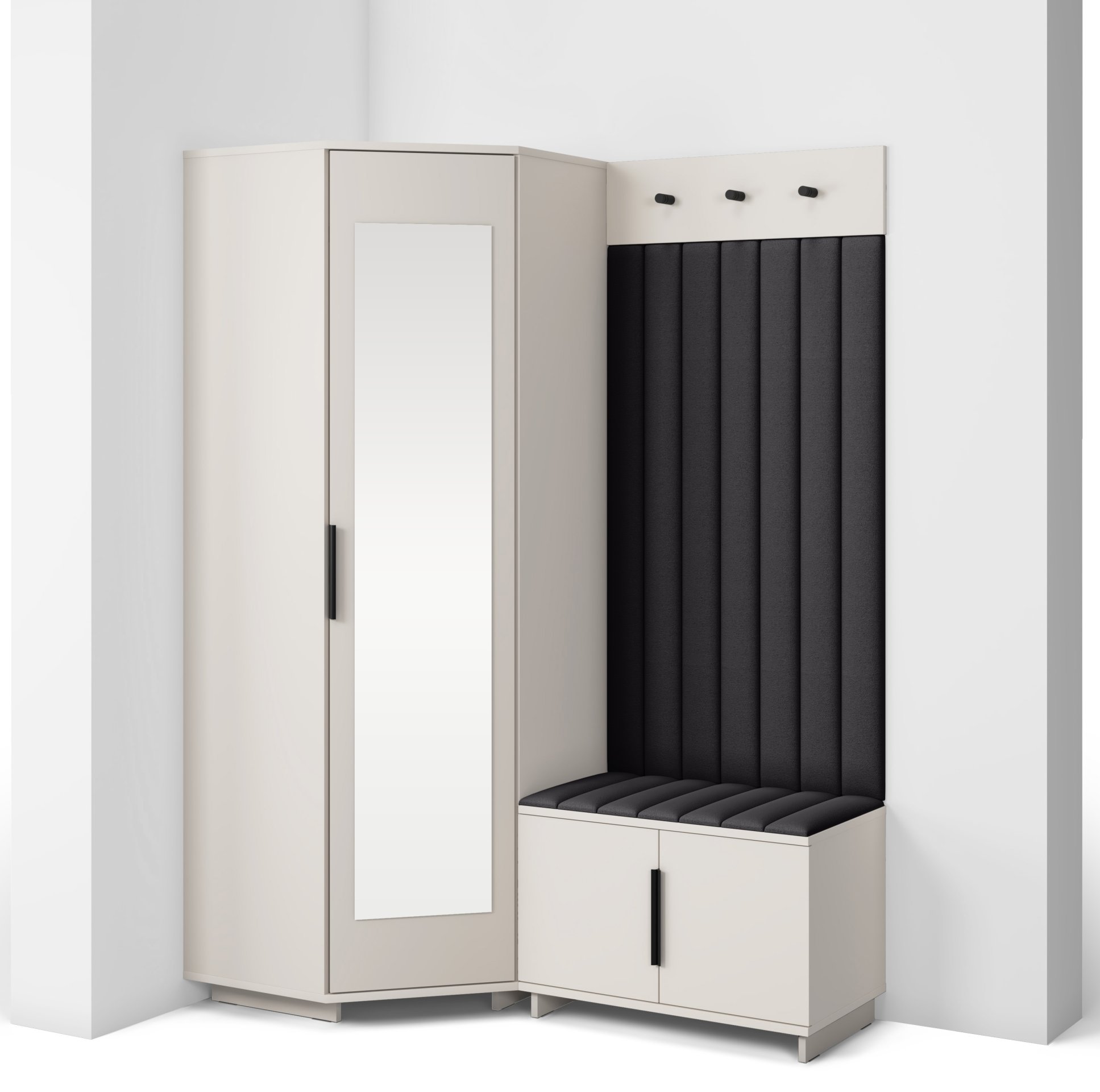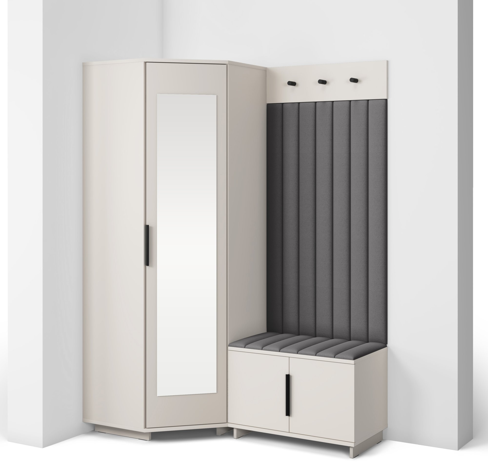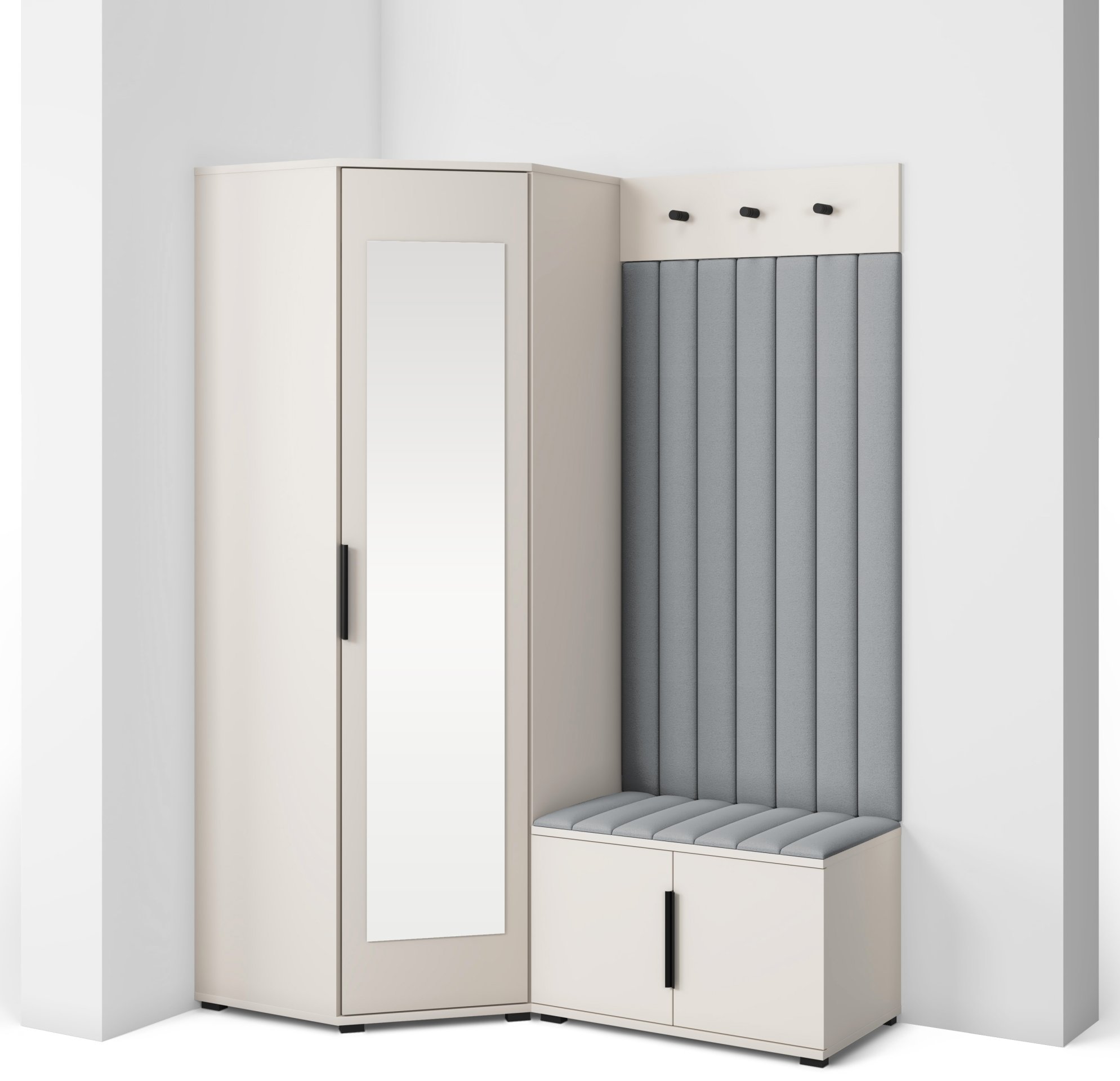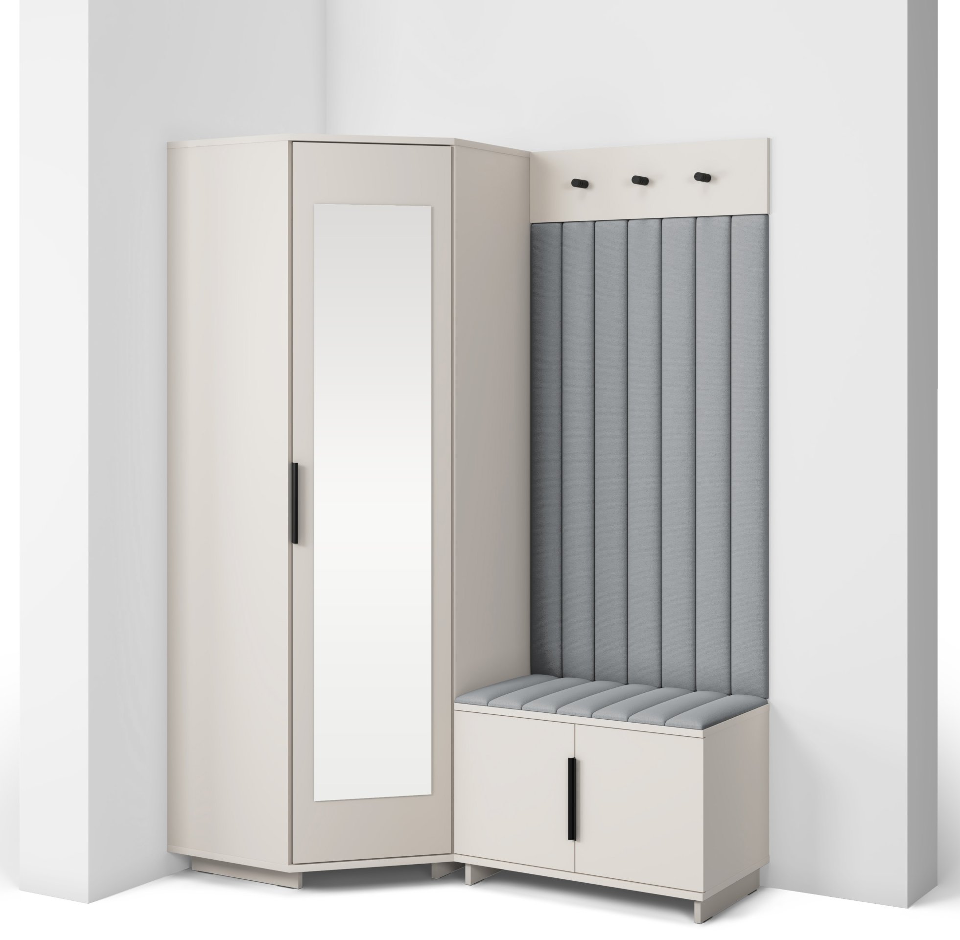 Sustav otvaranja push to open omogućuje jednostavno i tiho korištenje bez klasičnih ručki, dok crne metalne ručke predstavljaju estetski kontrast i dodatnu mogućnost otvaranja prema želji korisnika. Unutarnji raspored pojedinih elemenata omogućuje učinkovitu organizaciju odjeće, obuće i dodataka, što doprinosi urednom i preglednom izgledu hodnika. Tapecirane zidne ploče imaju i praktičnu funkciju – štite zid od trošenja i dodaju osjećaj udobnosti kada se obuvate ili skidate kaput.