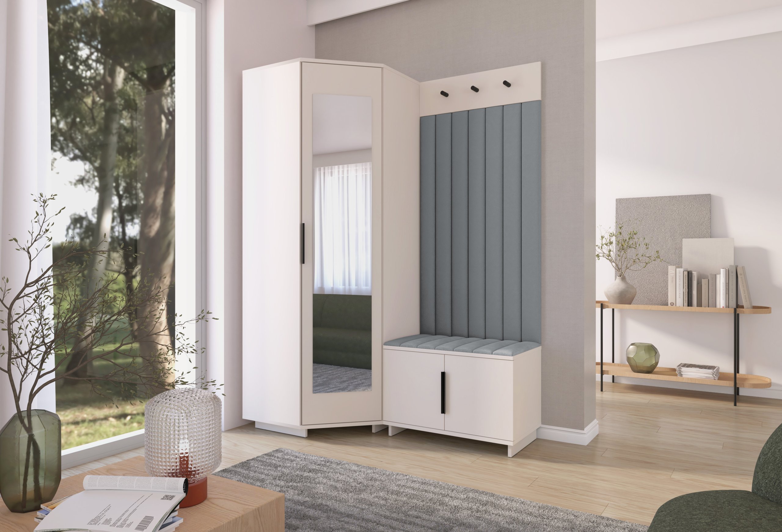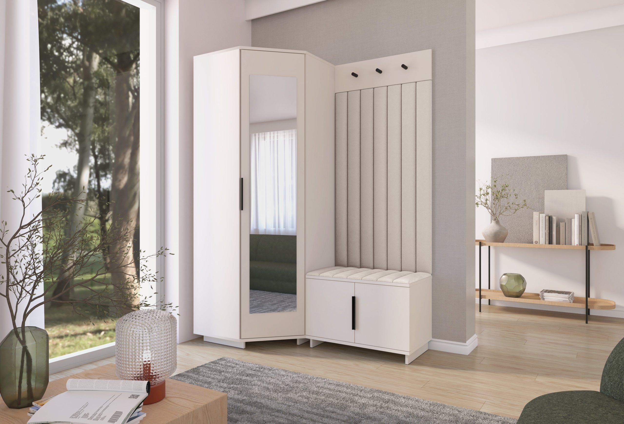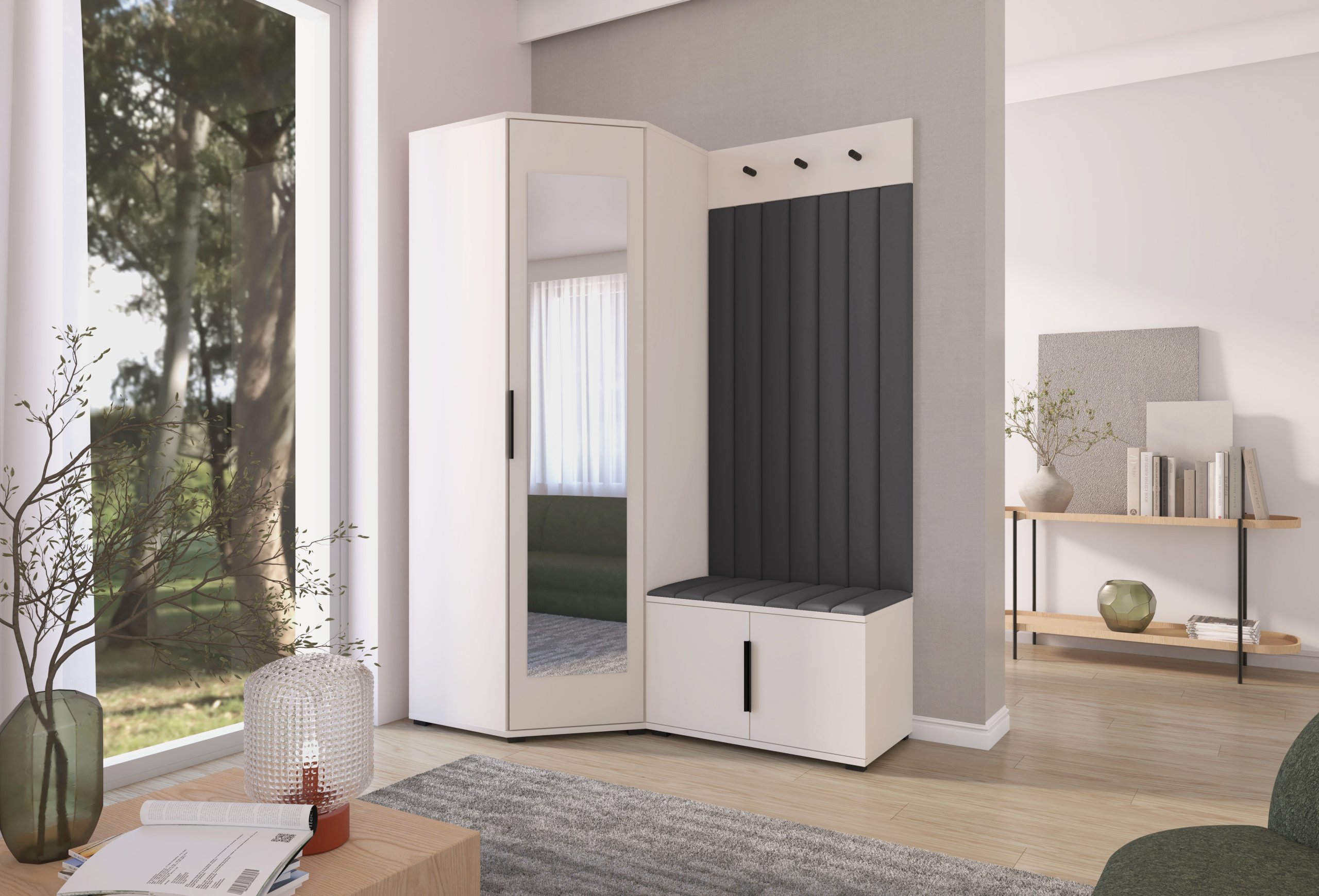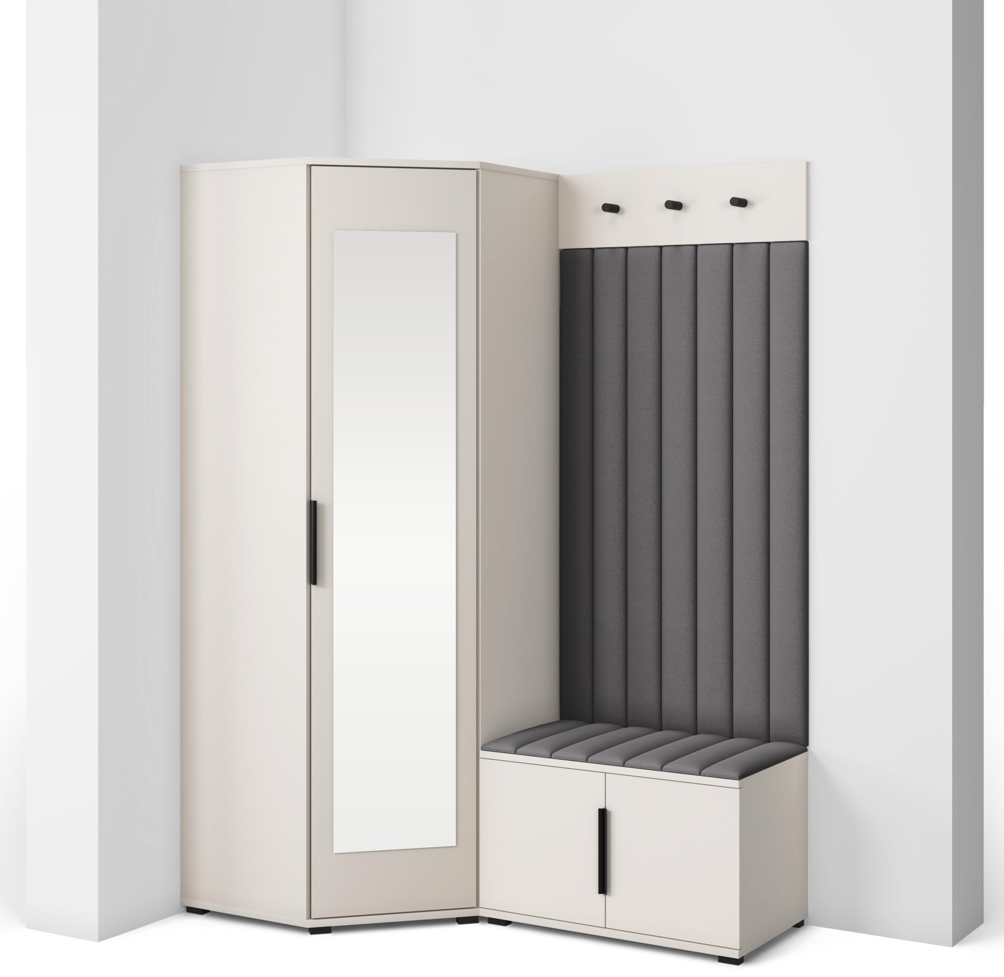 Sustav otvaranja push to open omogućuje jednostavno i tiho korištenje bez klasičnih ručki, dok crne metalne ručke predstavljaju estetski kontrast i dodatnu mogućnost otvaranja prema želji korisnika. Unutarnji raspored pojedinih elemenata omogućuje učinkovitu organizaciju odjeće, obuće i dodataka, što doprinosi urednom i preglednom izgledu hodnika. Tapecirane zidne ploče imaju i praktičnu funkciju – štite zid od trošenja i dodaju osjećaj udobnosti kada se obuvate ili skidate kaput.