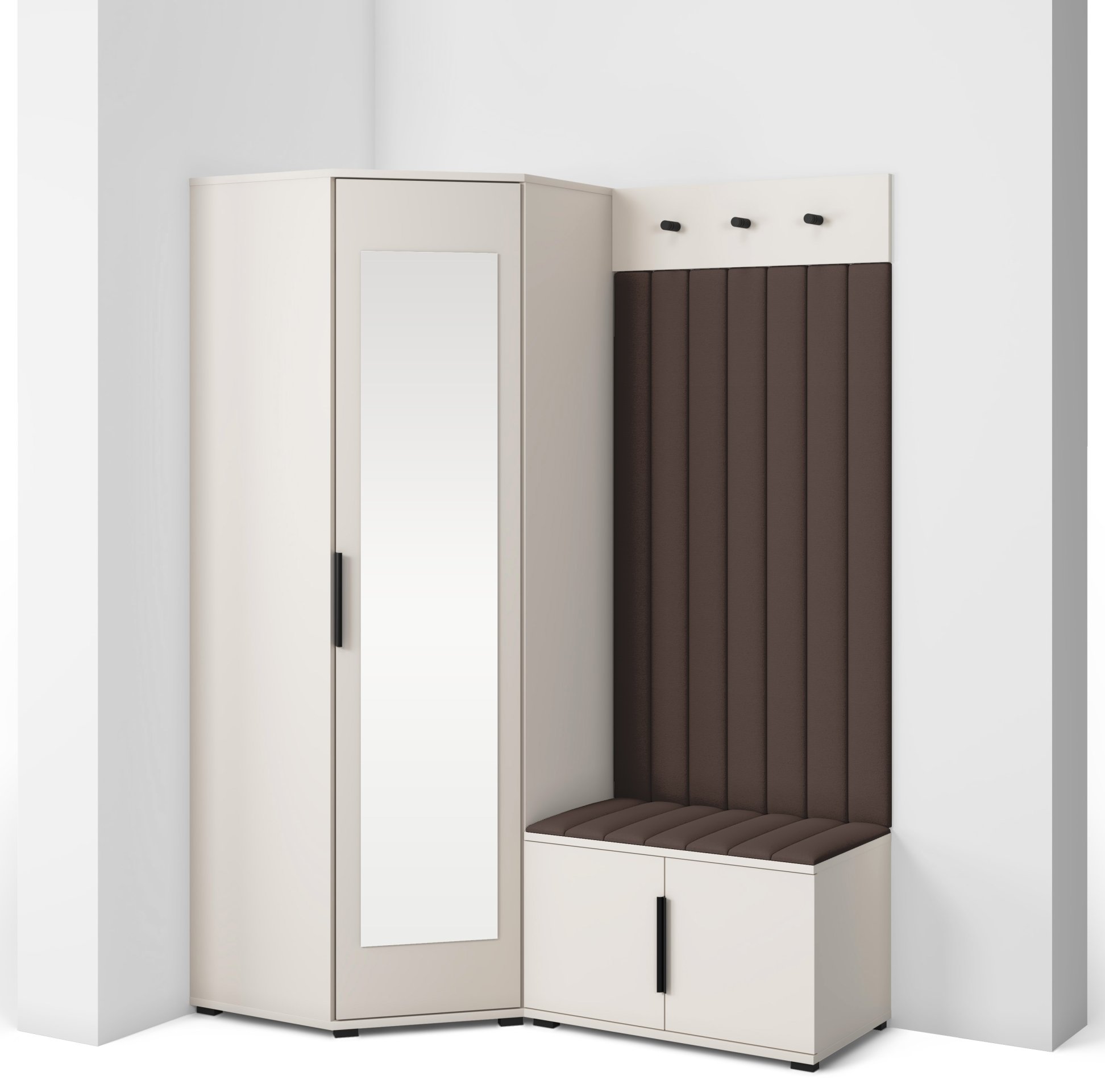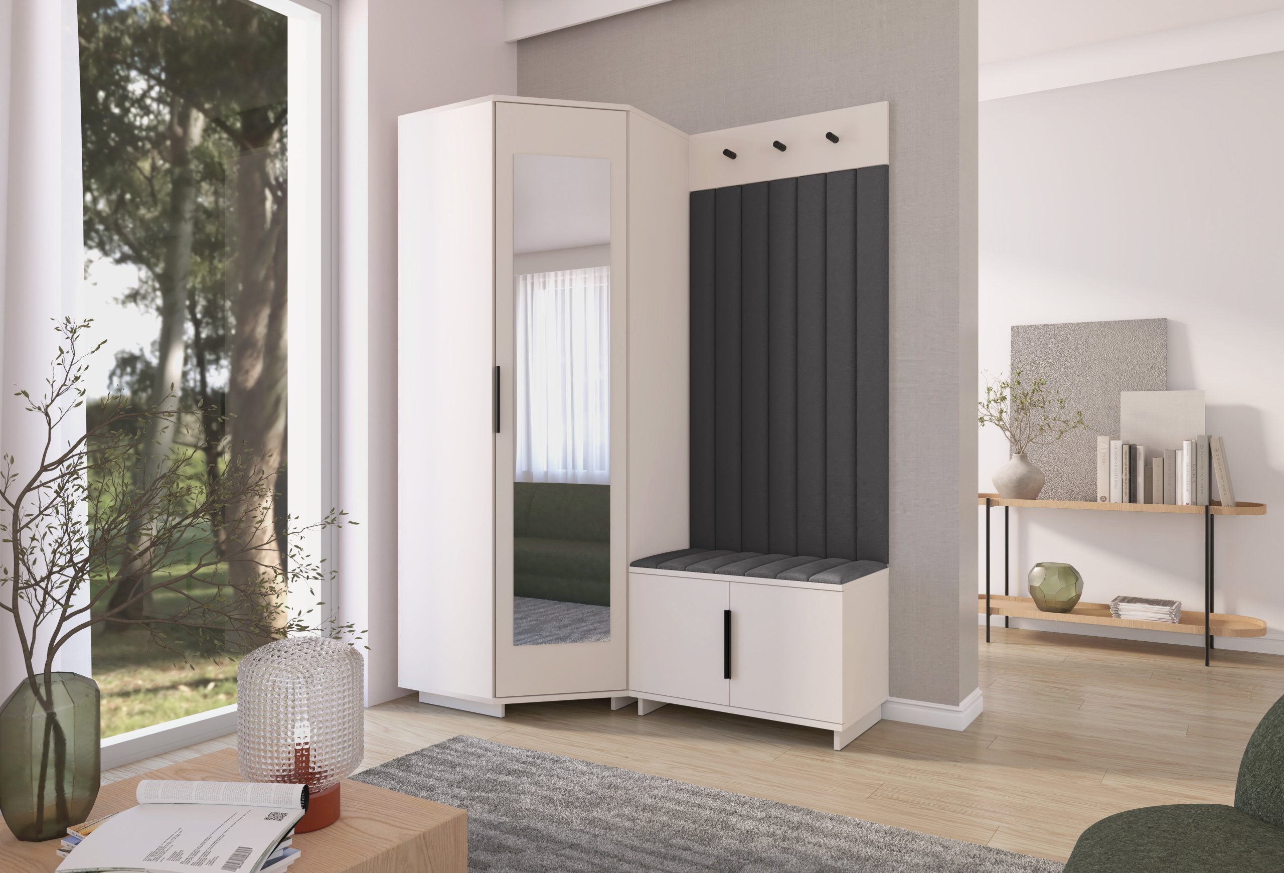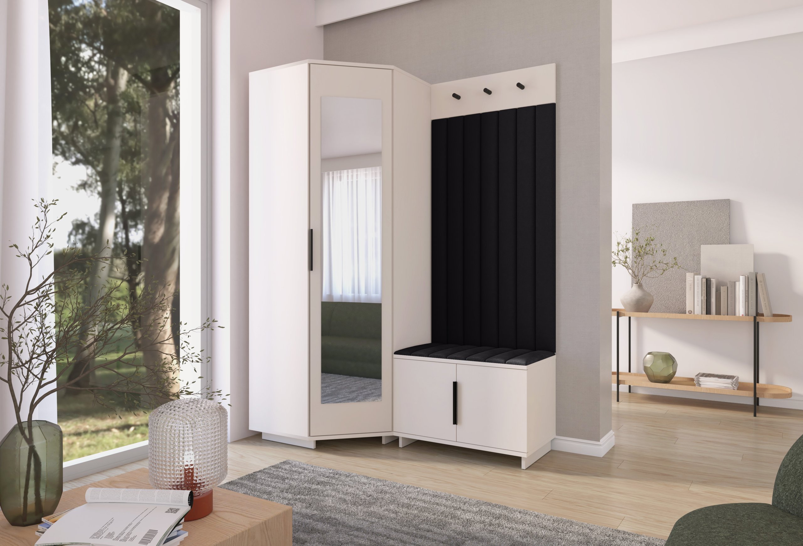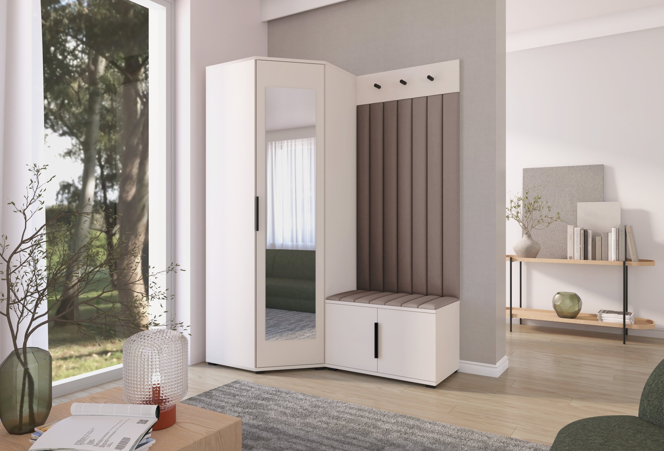 Sustav otvaranja push to open omogućuje jednostavno i tiho korištenje bez klasičnih ručki, dok crne metalne ručke predstavljaju estetski kontrast i dodatnu mogućnost otvaranja prema želji korisnika. Unutarnji raspored pojedinih elemenata omogućuje učinkovitu organizaciju odjeće, obuće i dodataka, što doprinosi urednom i preglednom izgledu hodnika. Tapecirane zidne ploče imaju i praktičnu funkciju – štite zid od trošenja i dodaju osjećaj udobnosti kada se obuvate ili skidate kaput.
