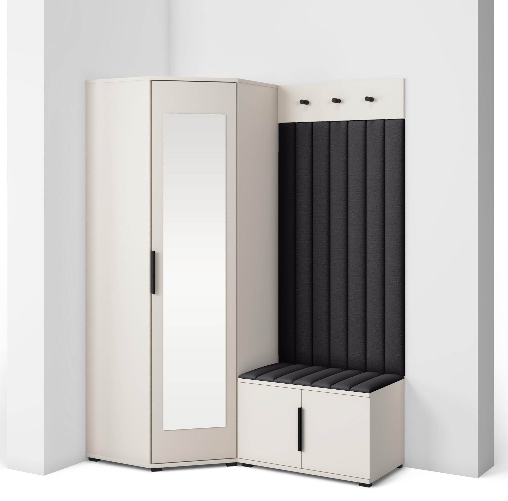 Boja kašmir daje setu Bianco 21 meku toplinu i odlično se slaže i s neutralnim i s izraženijim tonovima zidova ili podnih obloga. Površine su glatke, jednostavne za čišćenje i vizualno rasterećene, što omogućuje osjećaj urednosti i prostranosti čak i u manjim hodnicima. Kombinacija crnih metalnih ručki i suptilnih plastičnih te prizmatičnih nogu u dvije visine – 2 cm (plastične, crne) i 6 cm (prizmatične, kašmir) – daje namještaju stabilnost te dašak modernog minimalizma.