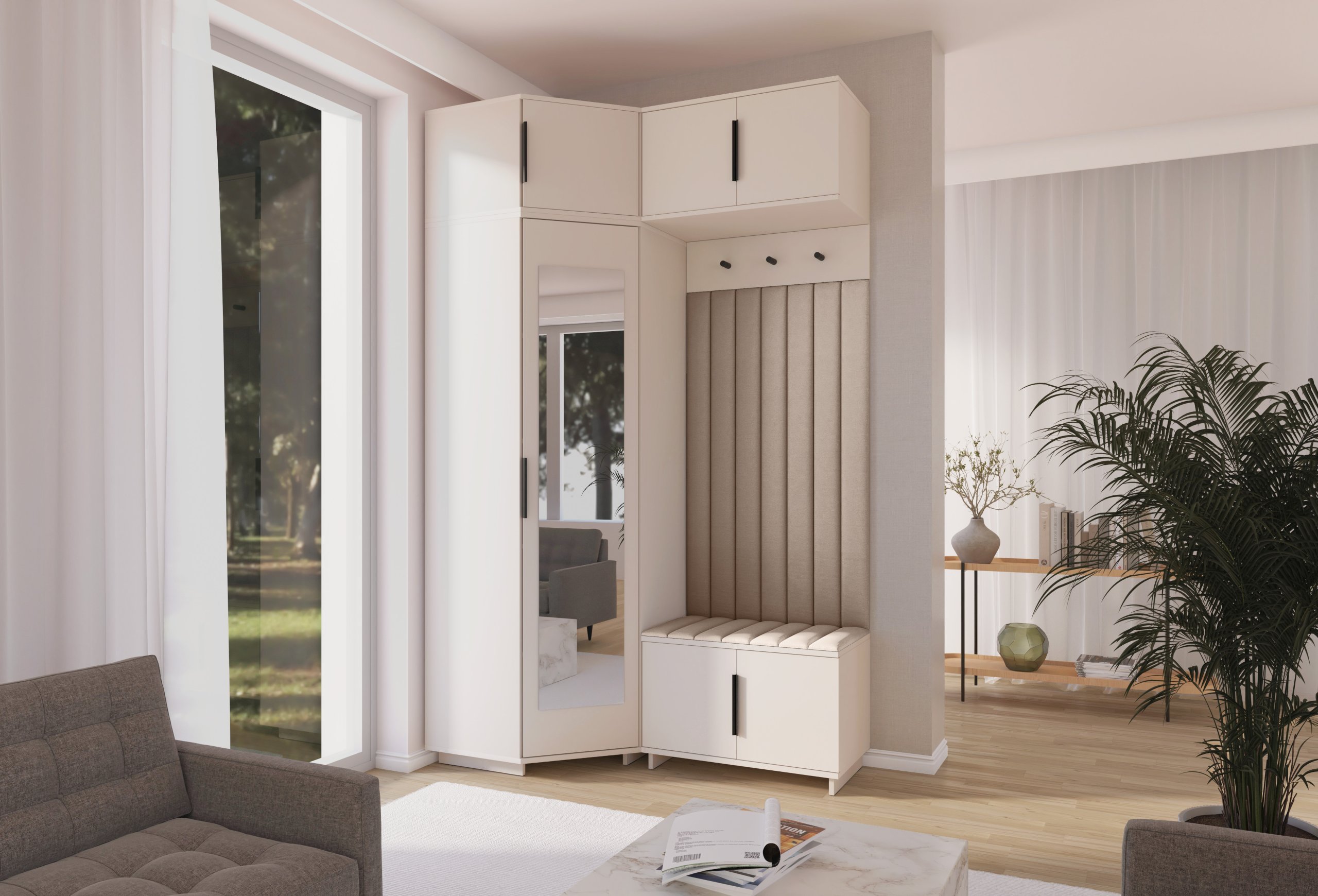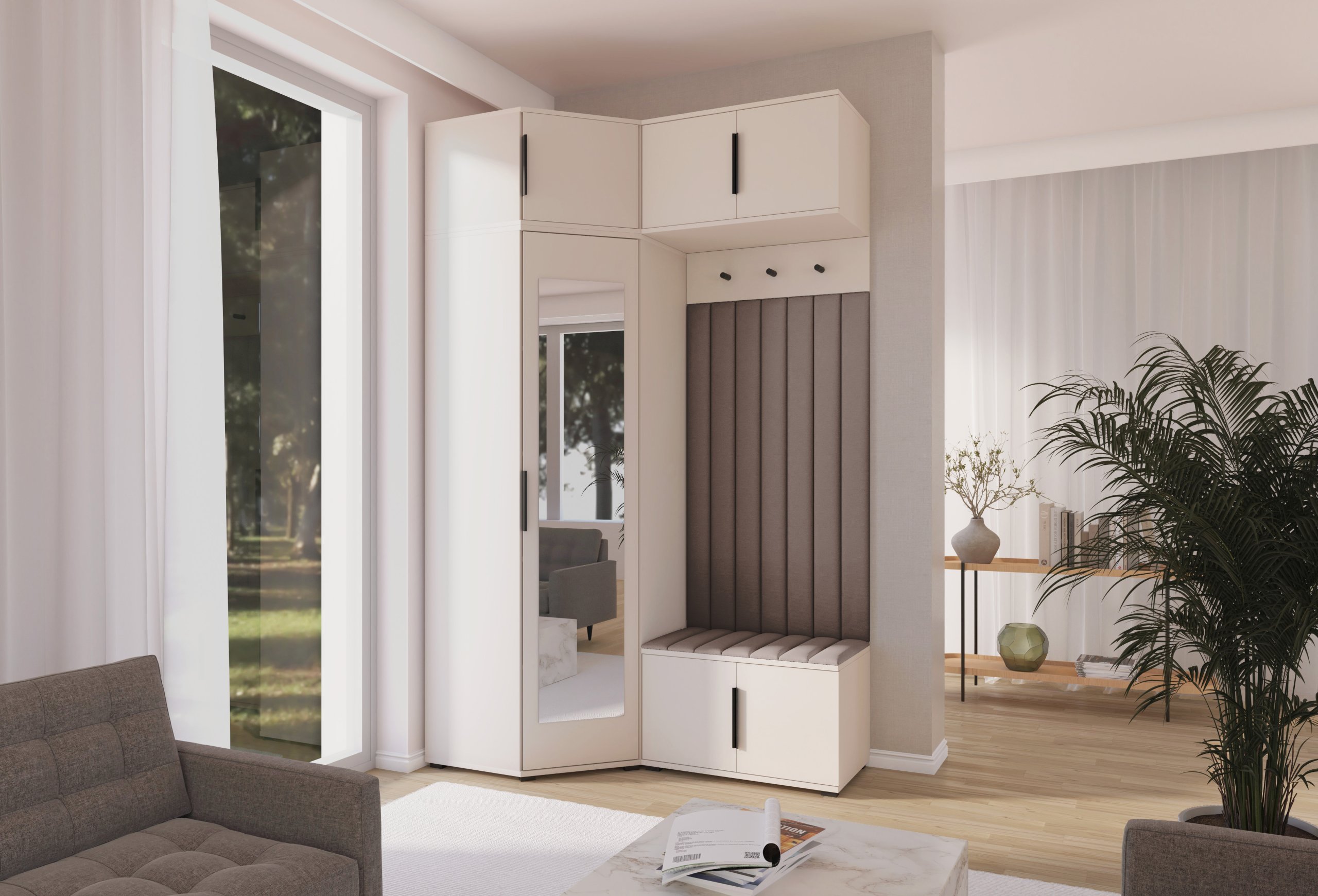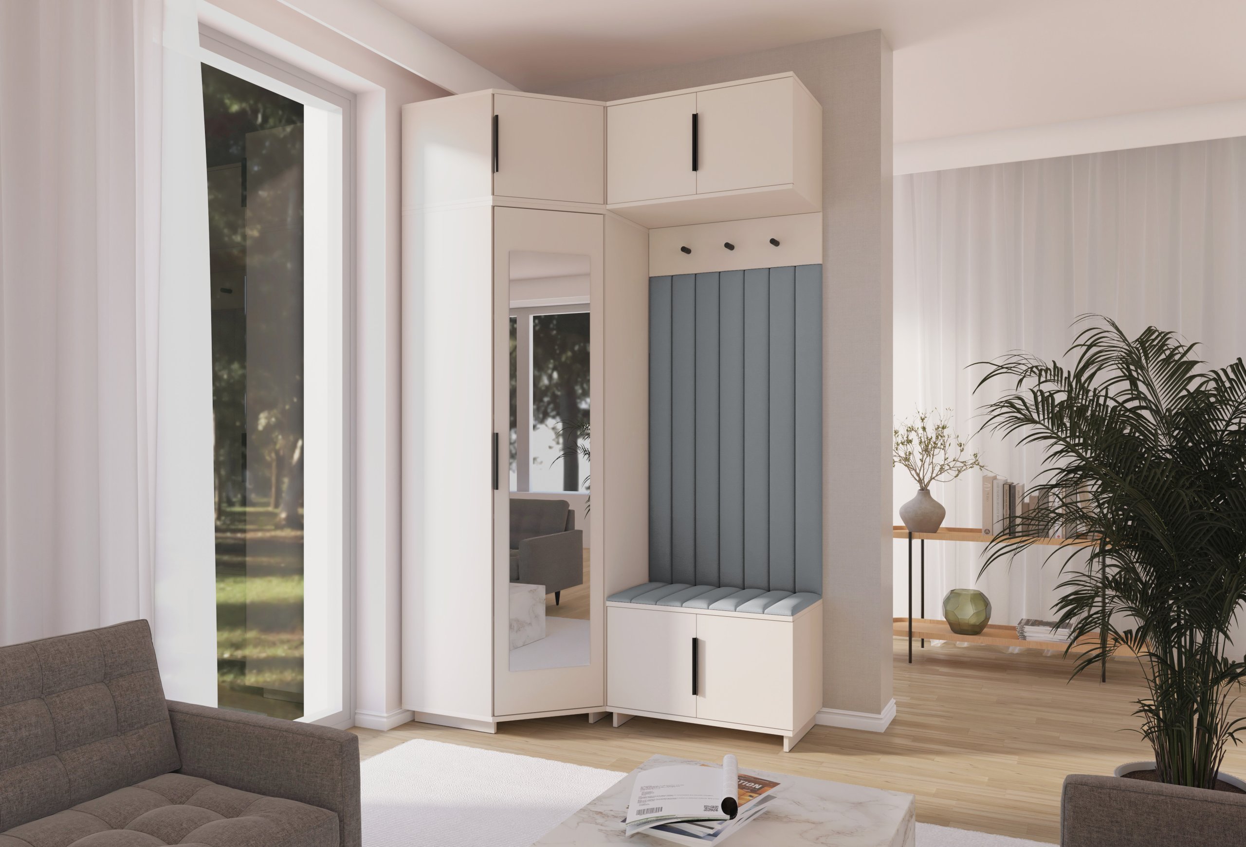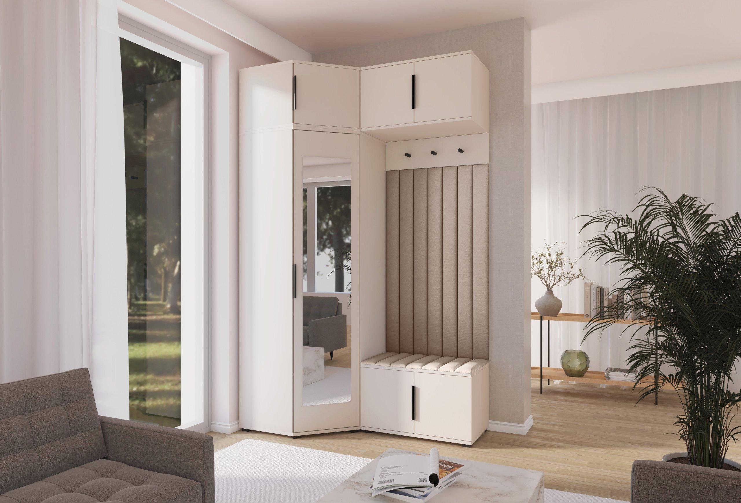 Komplet za predsoblje Bianco 23 – PKMebel dizajniran je za svakodnevnu udobnost. Ormari i vješalice raspoređeni su tako da omogućuju jednostavan pristup odjeći i dodacima, dok tapecirane ploče osiguravaju ugodan osjećaj domaće atmosfere. Sustav elemenata omogućuje modularno postavljanje, pa se komplet prilagođava različitim veličinama i oblicima prostora. Ogledalo u kutnom ormaru dodatno osvjetljava prostor i optički ga povećava, što je posebno korisno u manjim hodnicima.