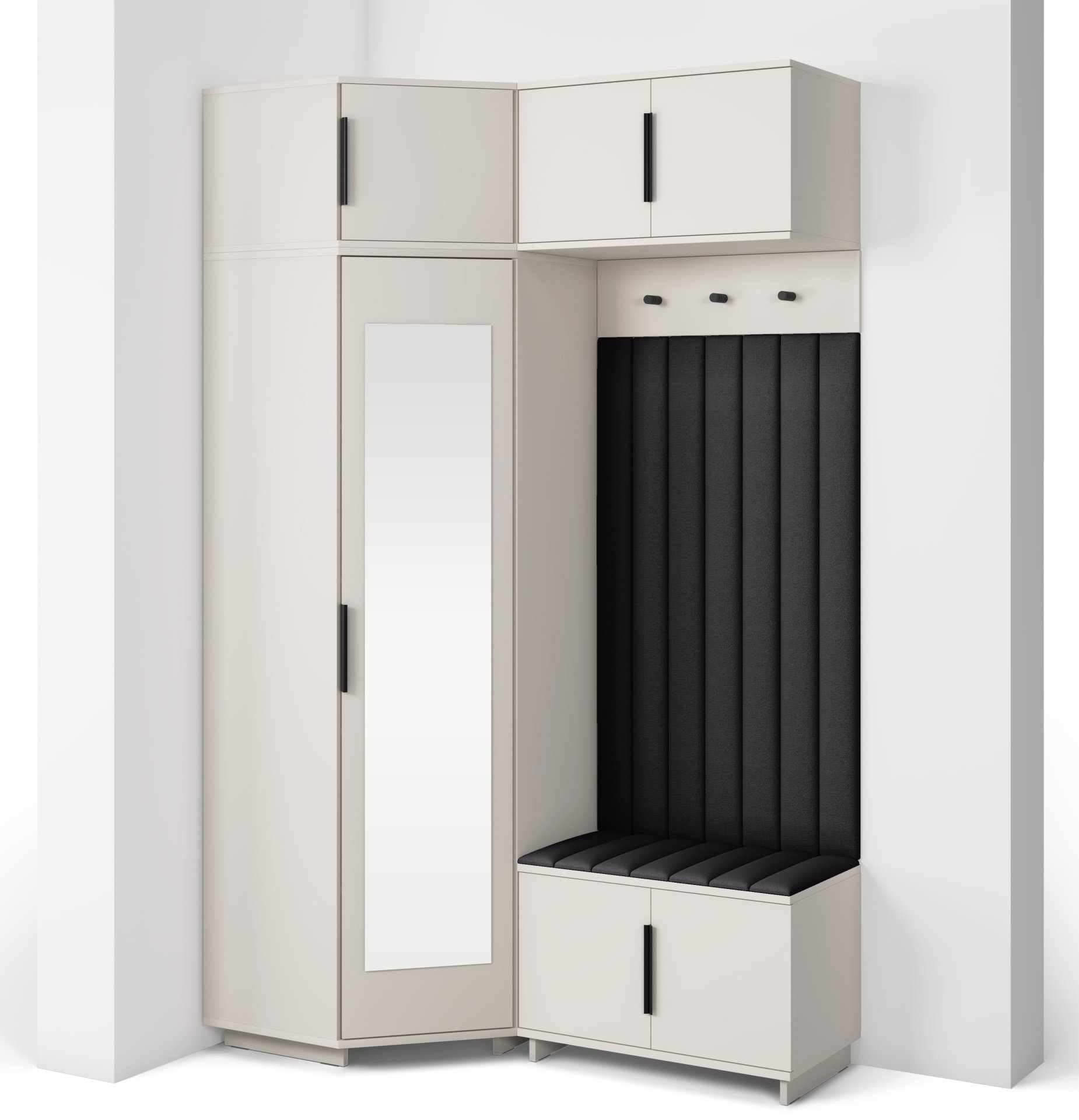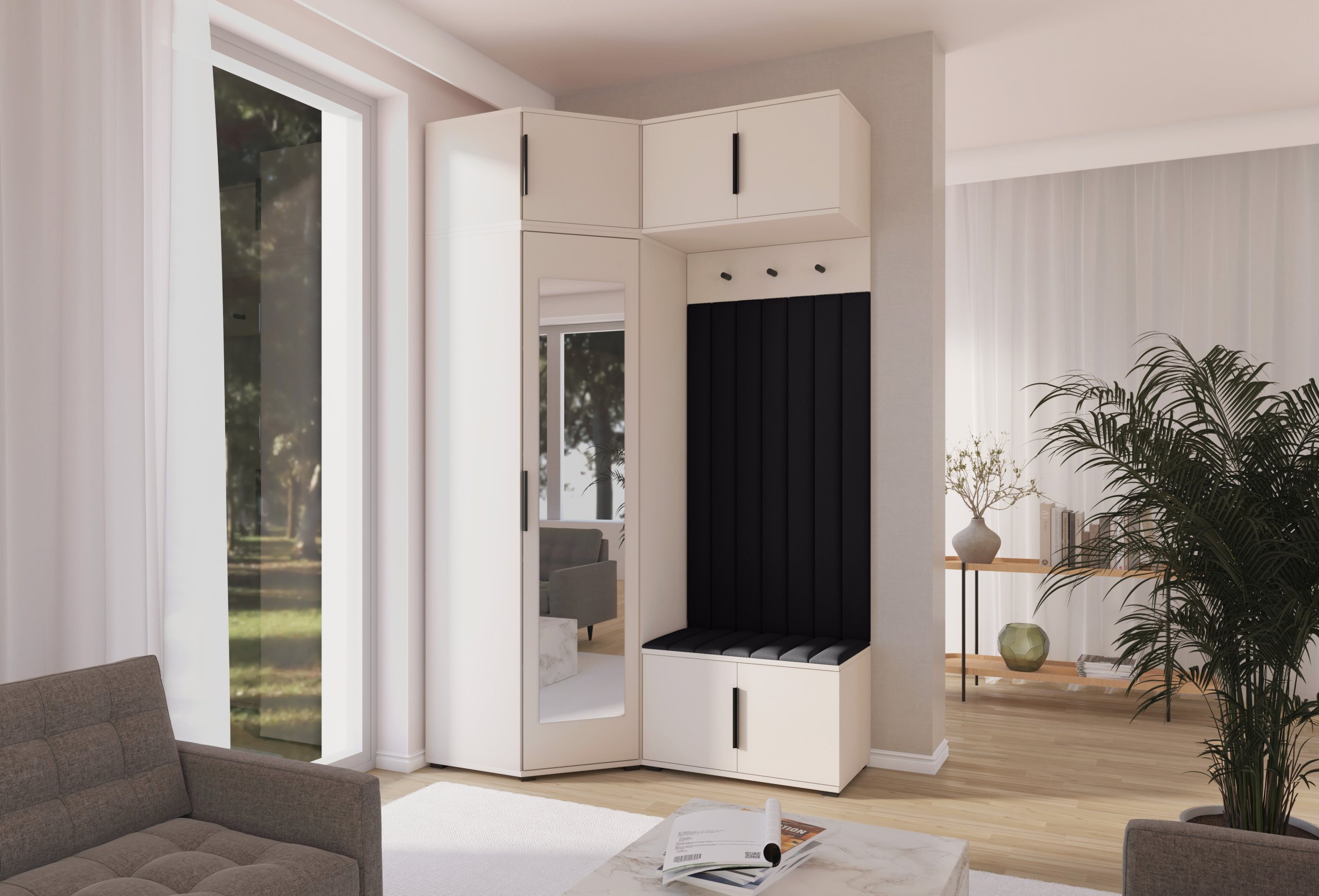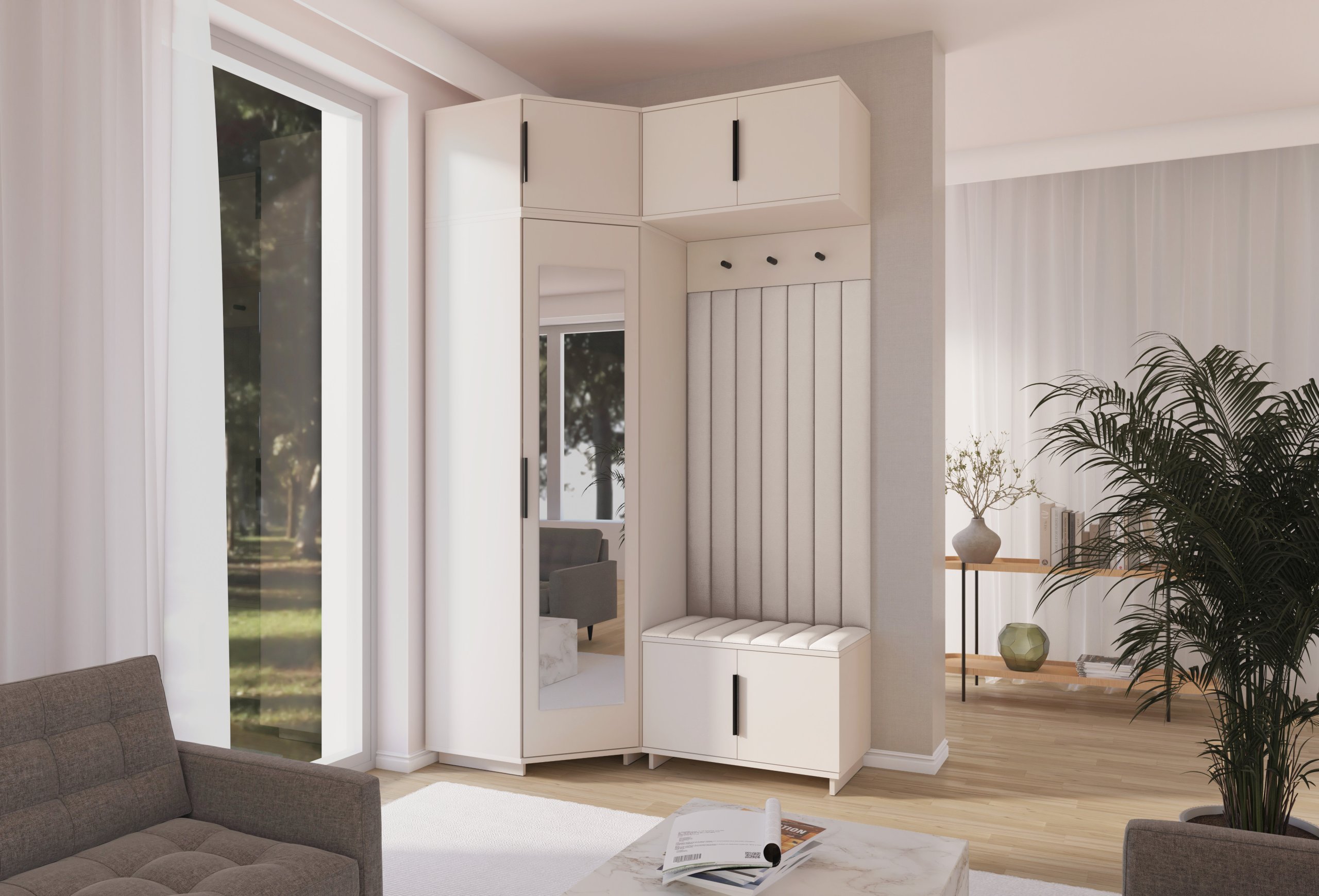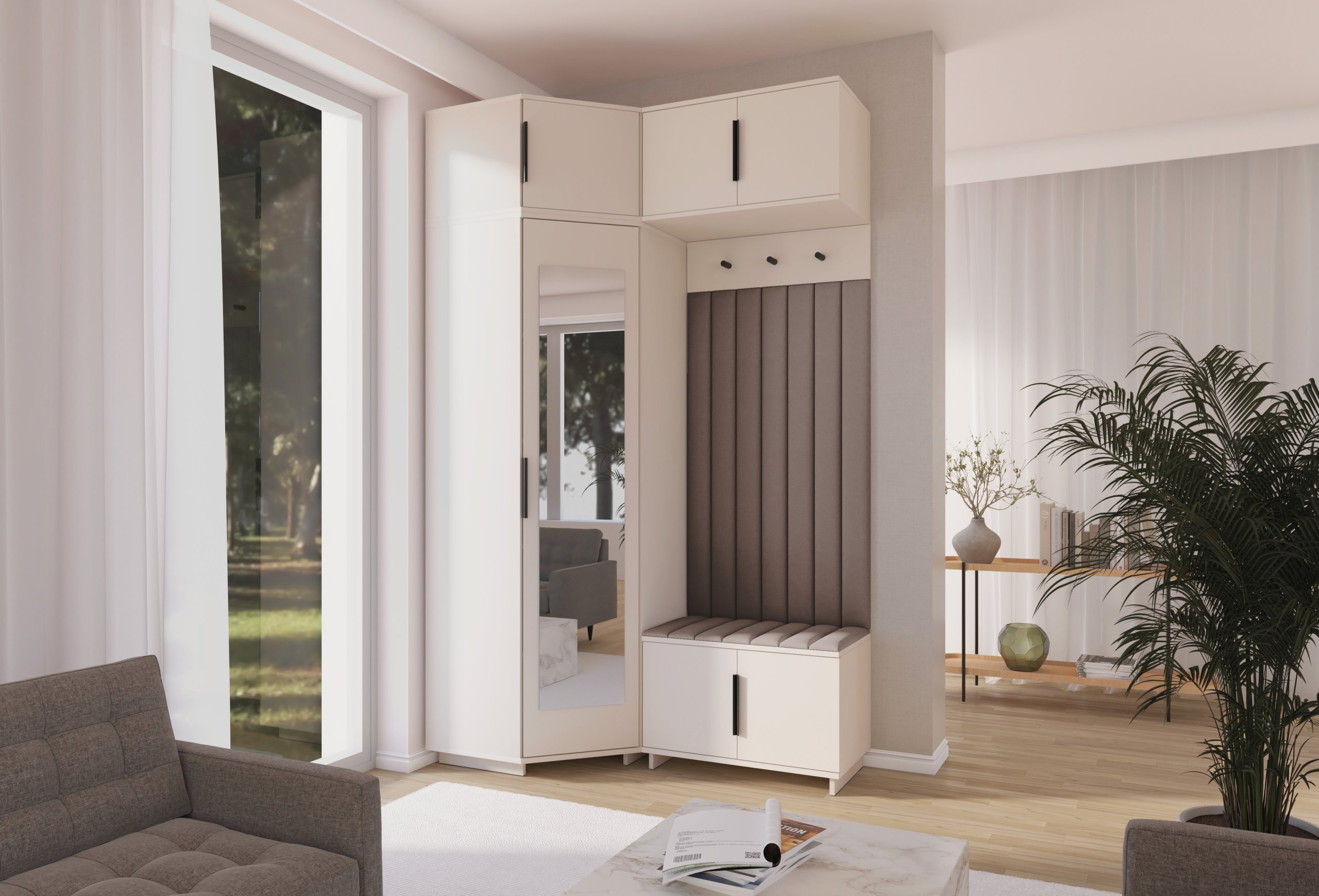Komplet za predsoblje Bianco 23 – PKMebel dizajniran je za svakodnevnu udobnost. Ormari i vješalice raspoređeni su tako da omogućuju jednostavan pristup odjeći i dodacima, dok tapecirane ploče osiguravaju ugodan osjećaj domaće atmosfere. Sustav elemenata omogućuje modularno postavljanje, pa se komplet prilagođava različitim veličinama i oblicima prostora. Ogledalo u kutnom ormaru dodatno osvjetljava prostor i optički ga povećava, što je posebno korisno u manjim hodnicima.