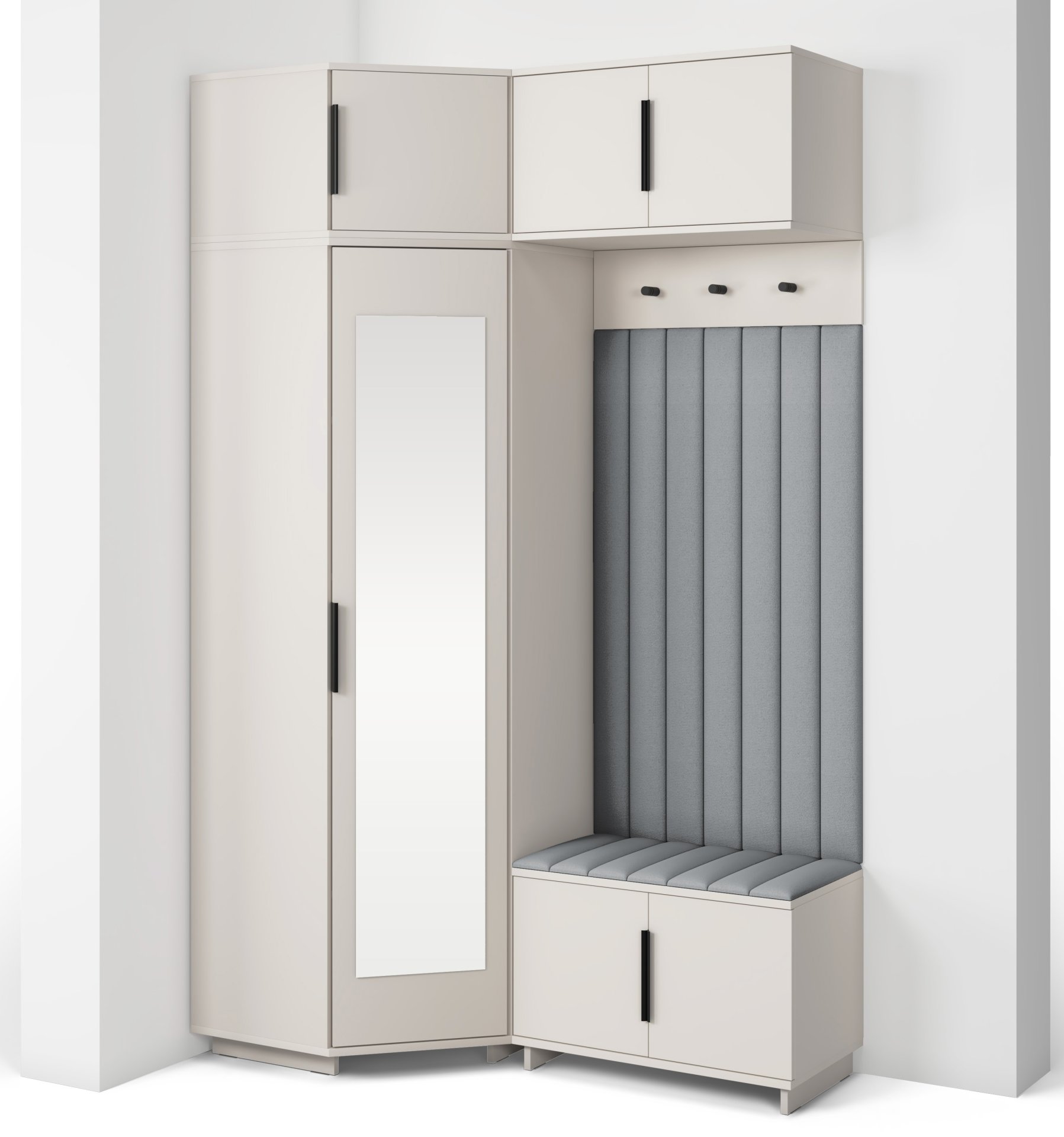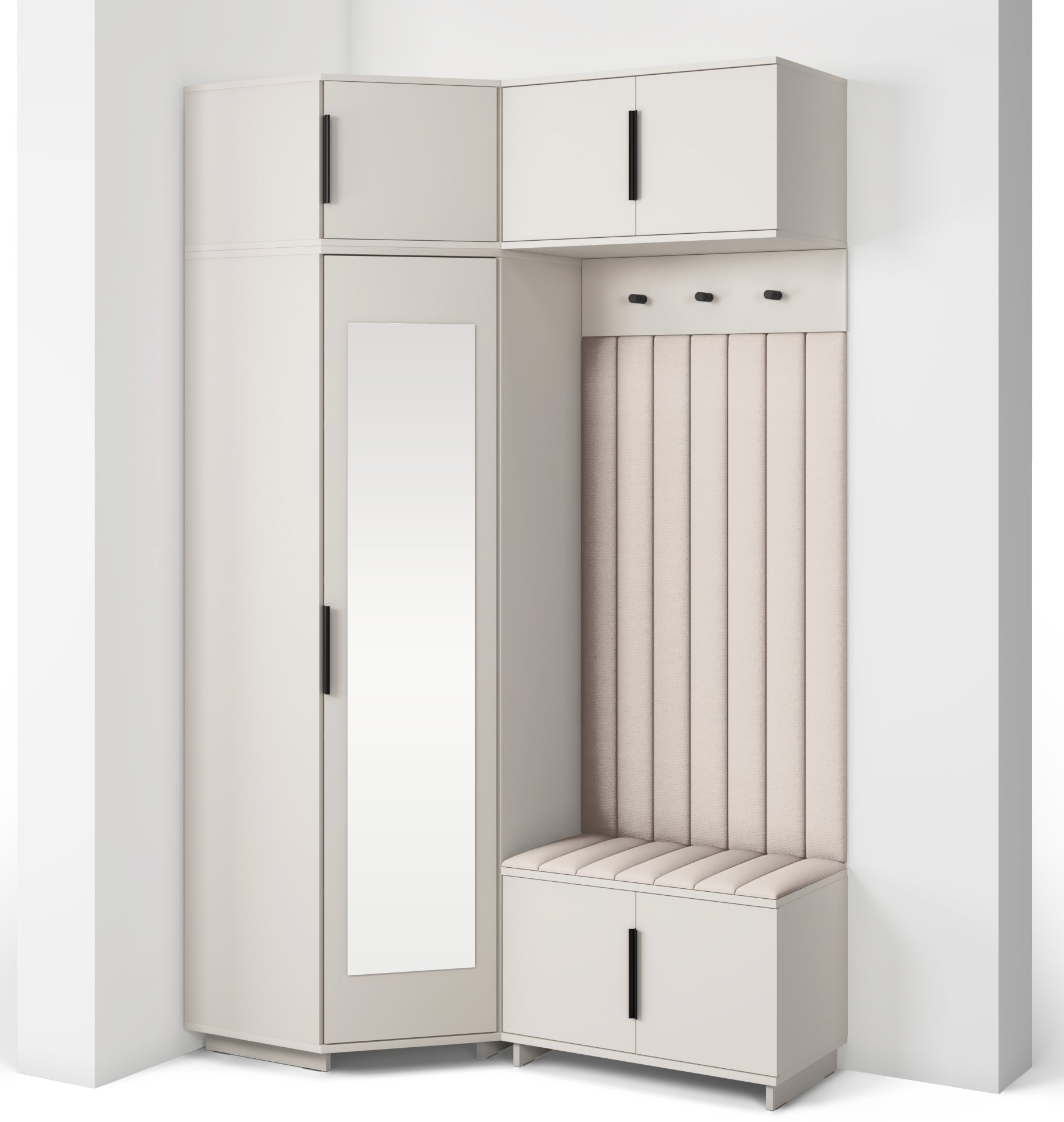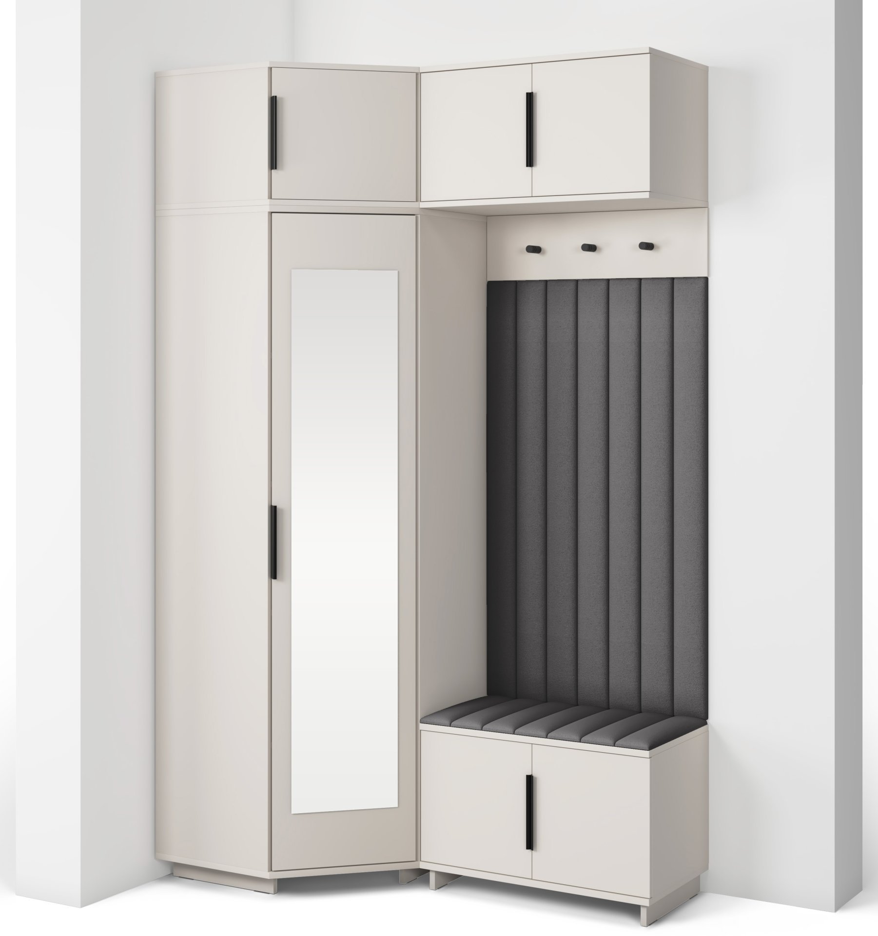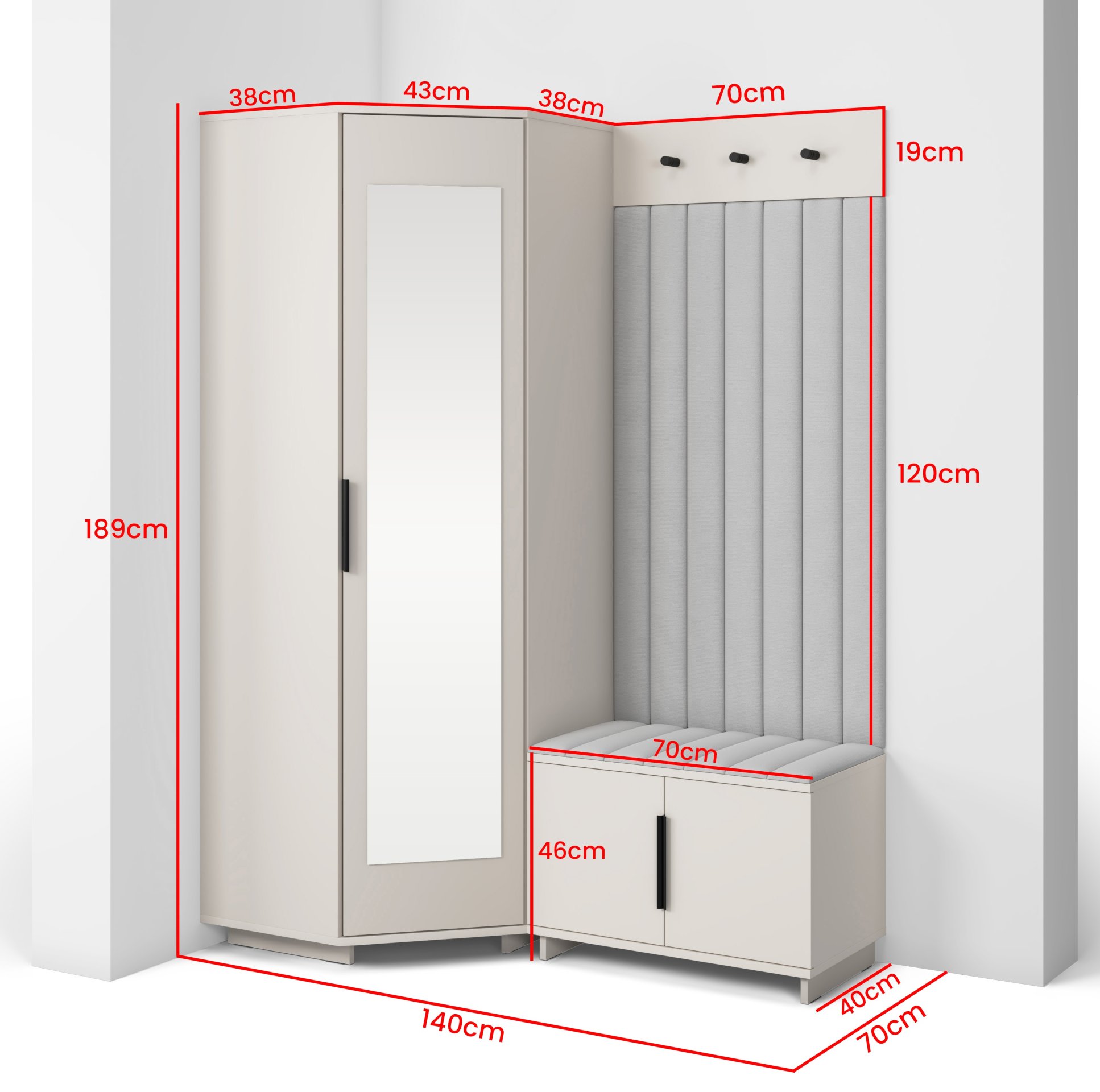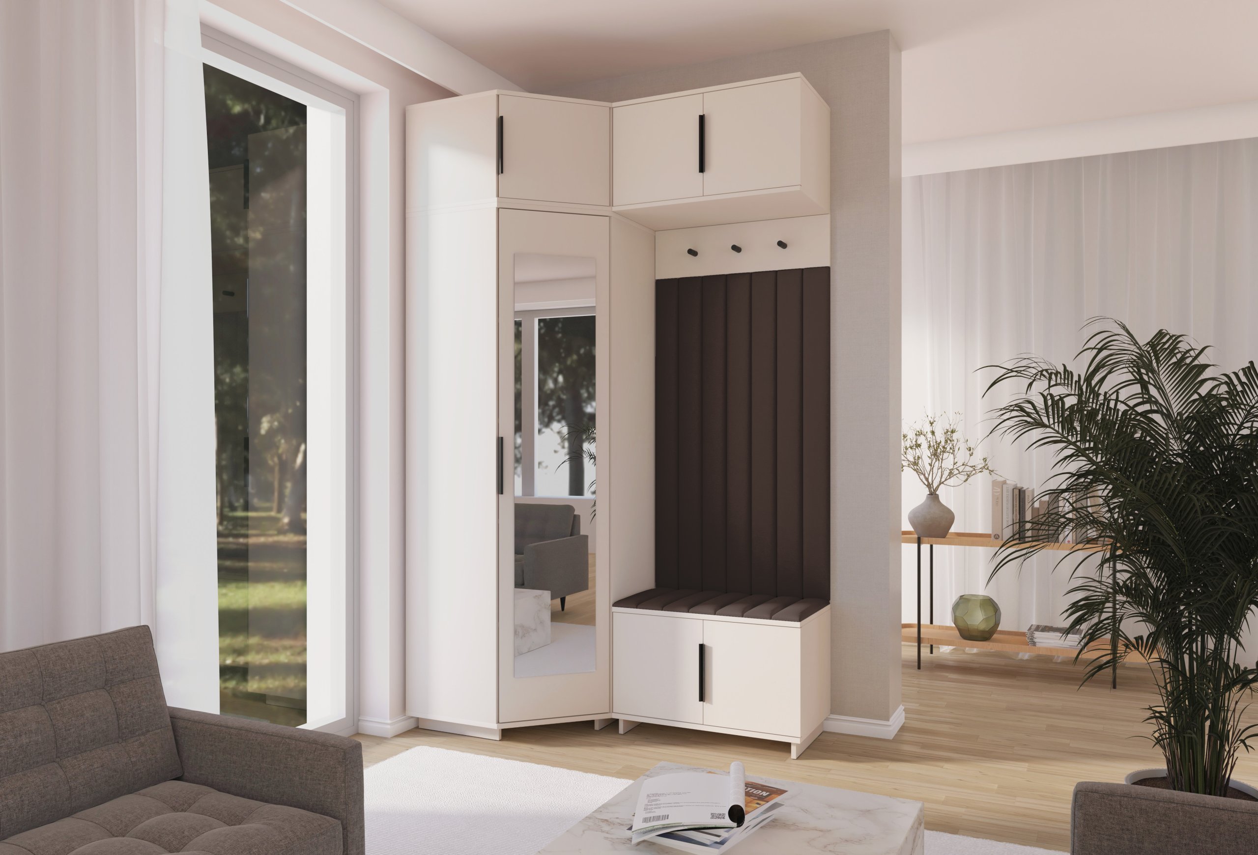 Komplet za predsoblje Bianco 23 – PKMebel dizajniran je za svakodnevnu udobnost. Ormari i vješalice raspoređeni su tako da omogućuju jednostavan pristup odjeći i dodacima, dok tapecirane ploče osiguravaju ugodan osjećaj domaće atmosfere. Sustav elemenata omogućuje modularno postavljanje, pa se komplet prilagođava različitim veličinama i oblicima prostora. Ogledalo u kutnom ormaru dodatno osvjetljava prostor i optički ga povećava, što je posebno korisno u manjim hodnicima.