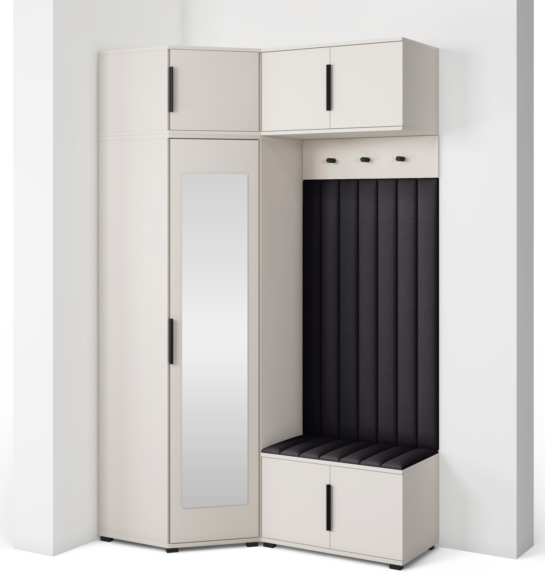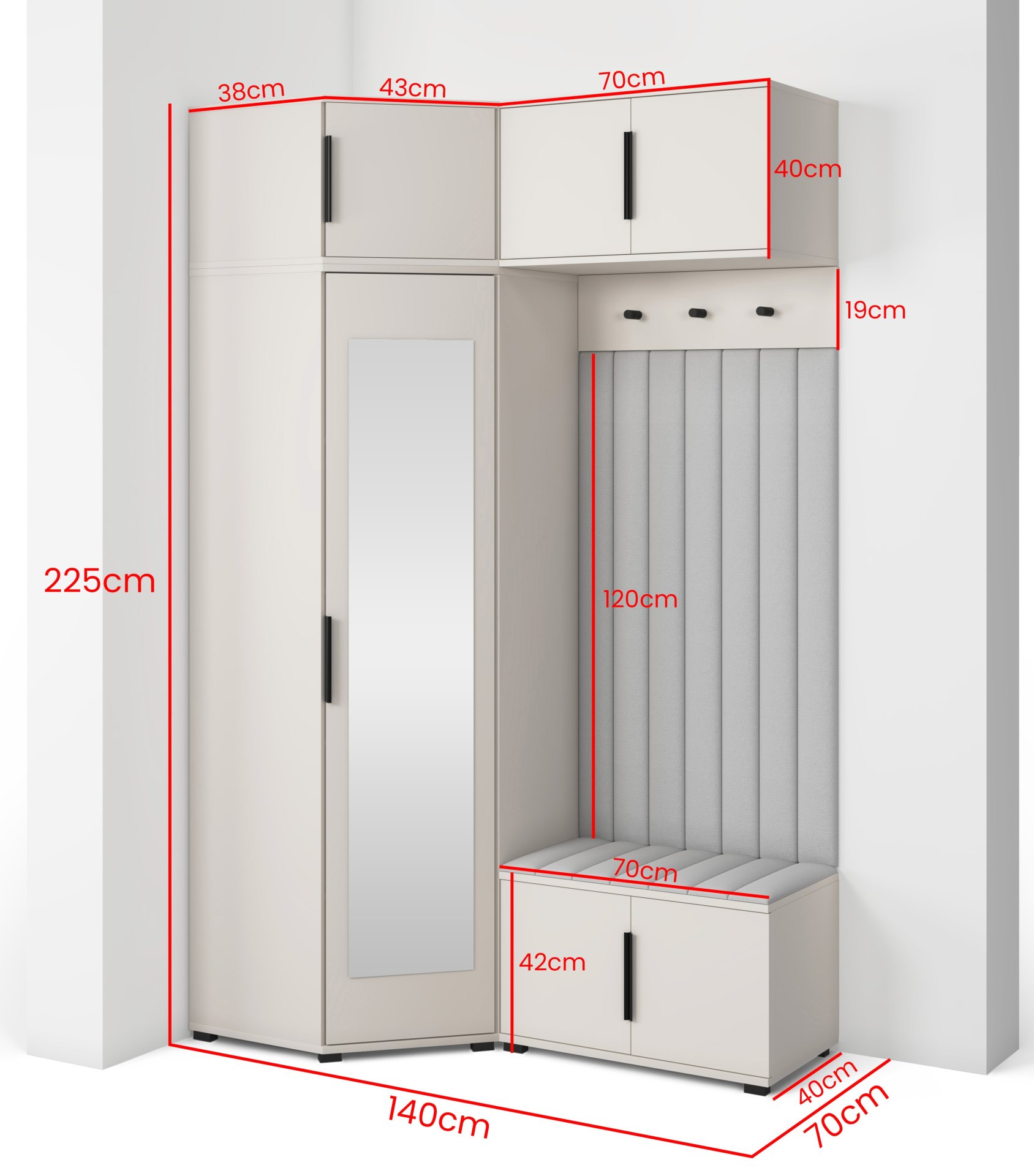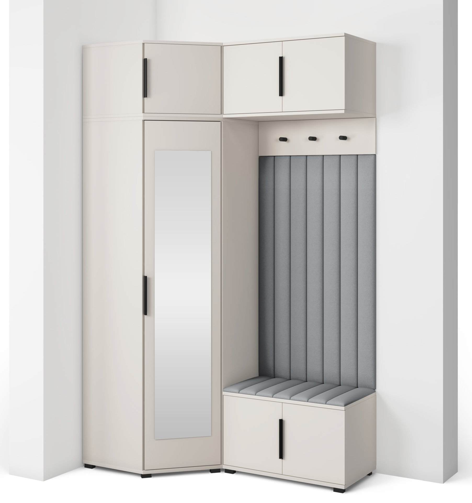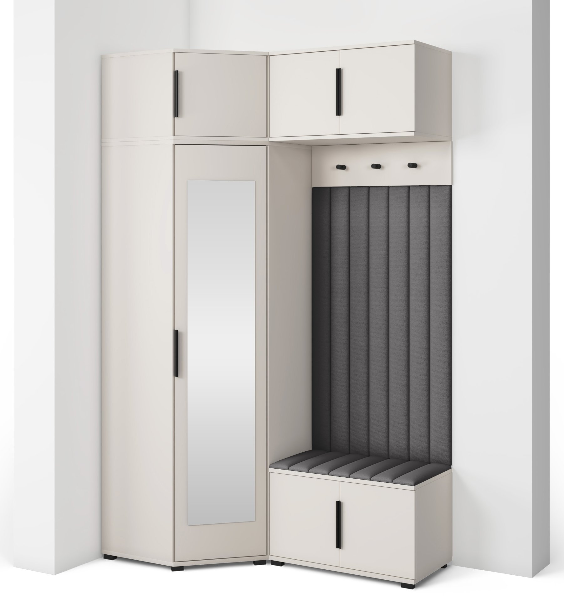 Komplet za predsoblje Bianco 23 – PKMebel dizajniran je za svakodnevnu udobnost. Ormari i vješalice raspoređeni su tako da omogućuju jednostavan pristup odjeći i dodacima, dok tapecirane ploče osiguravaju ugodan osjećaj domaće atmosfere. Sustav elemenata omogućuje modularno postavljanje, pa se komplet prilagođava različitim veličinama i oblicima prostora. Ogledalo u kutnom ormaru dodatno osvjetljava prostor i optički ga povećava, što je posebno korisno u manjim hodnicima.