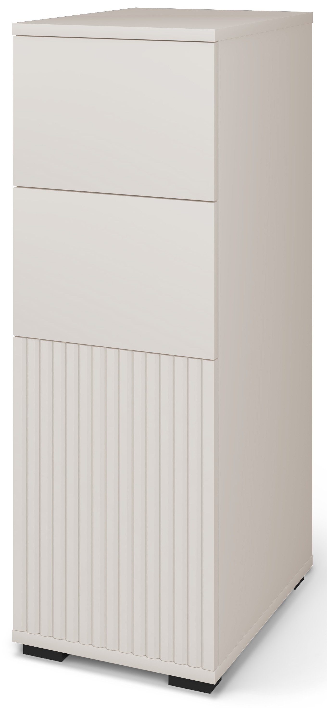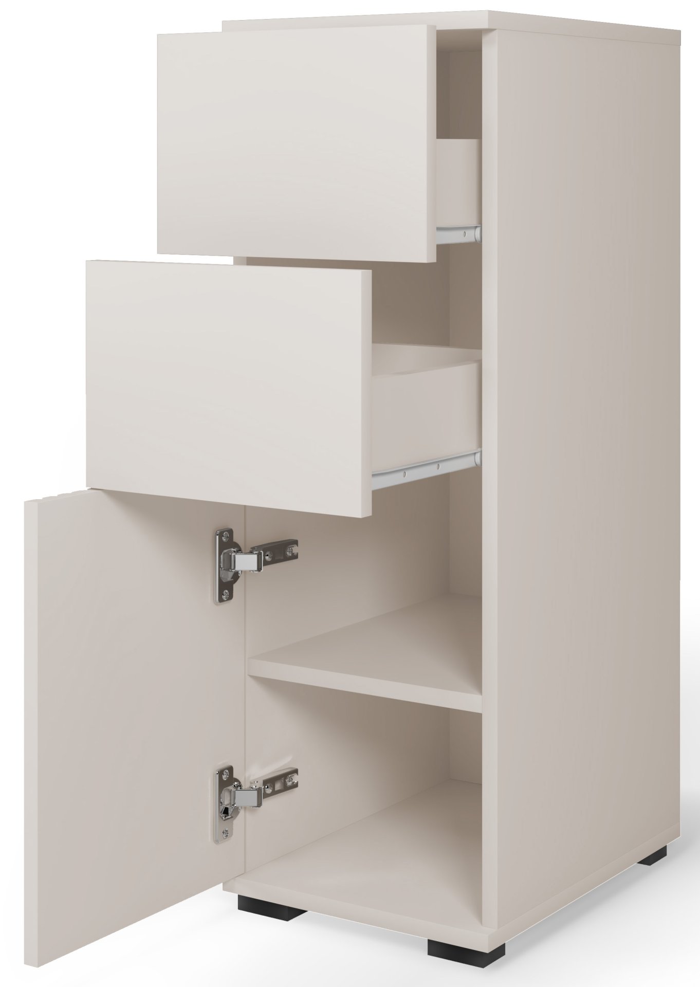 Boja kašmir nježan je, smiren i vrlo popularan izbor u suvremenom interijeru. Komoda Rayo u toj nijansi djeluje neutralno, pa se bez poteškoća kombinira s drugim bojama namještaja ili dodataka. Površina laminirane ploče otporna je na svakodnevna opterećenja, jednostavna za čišćenje i zadržava svoj izgled i nakon više godina uporabe. Zahvaljujući tome, komoda je prikladna i za dnevne sobe, spavaće sobe, predsoblja ili urede.