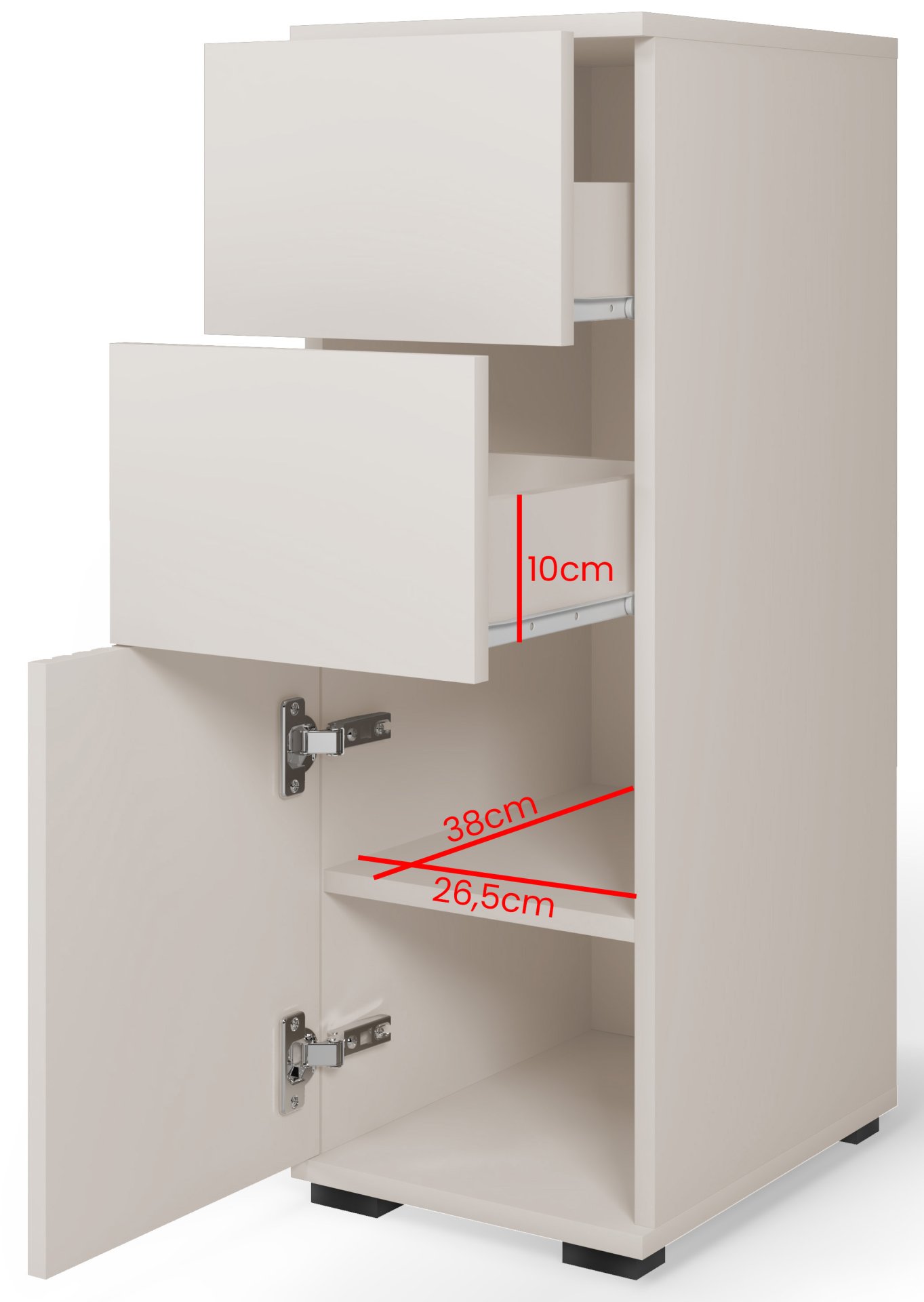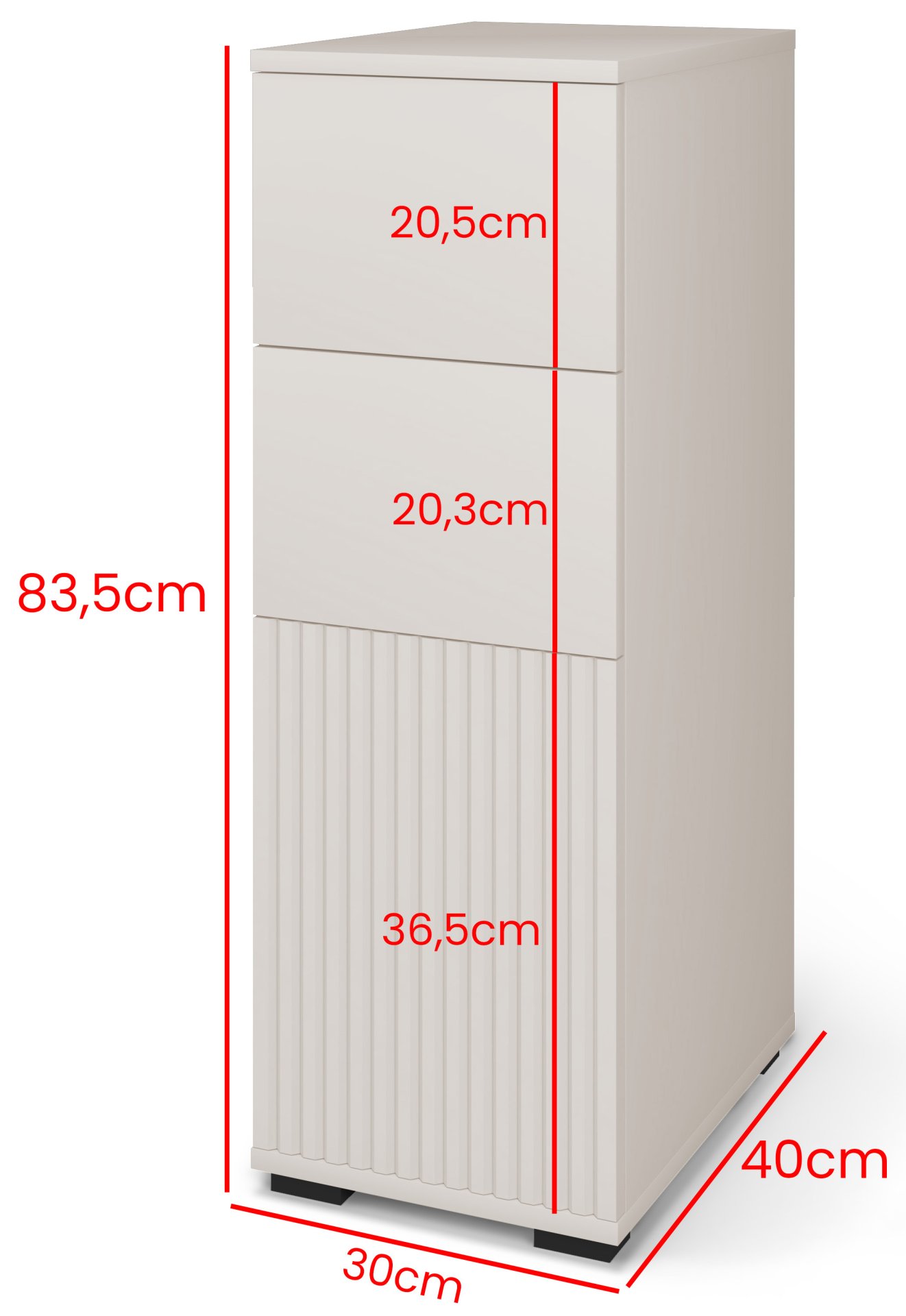 Dimenzije 30x40x83,5 cm omogućuju da komoda zauzme malo prostora, a istovremeno ponudi dovoljno prostora za pohranu. Zbog svoje visine može se koristiti i kao pomoćna odlagalna površina uz zid ili kao dodatak većem komadu namještaja. Takva veličina idealna je za manje prostore, garsonijere ili hodnike, gdje je važna svaka dobivena površina.