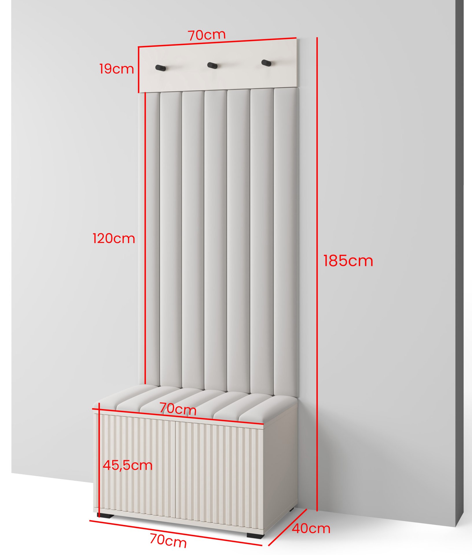 Cijeli komplet ima dimenzije 70x40x185 cm. Kompaktna širina omogućuje postavljanje i u manja predsoblje, dok visina od 185 cm osigurava dovoljno prostora za vješanje odjeće i pohranu cipela. Maksimalna nosivost kompleta je 200 kg, što potvrđuje kvalitetnu izradu i stabilnost konstrukcije.
