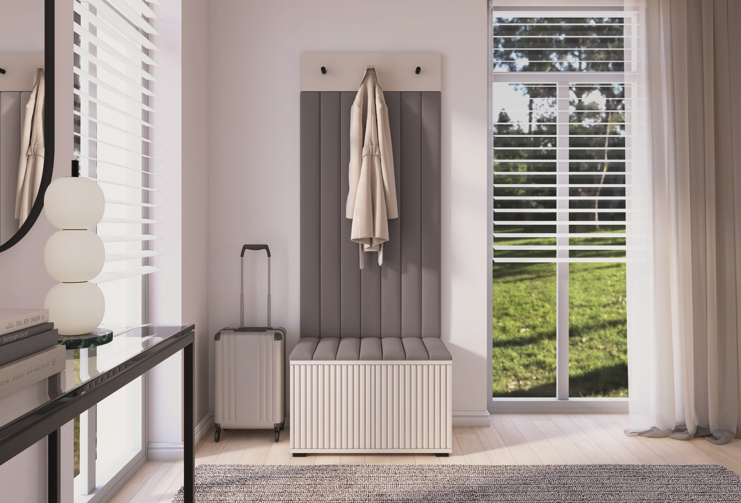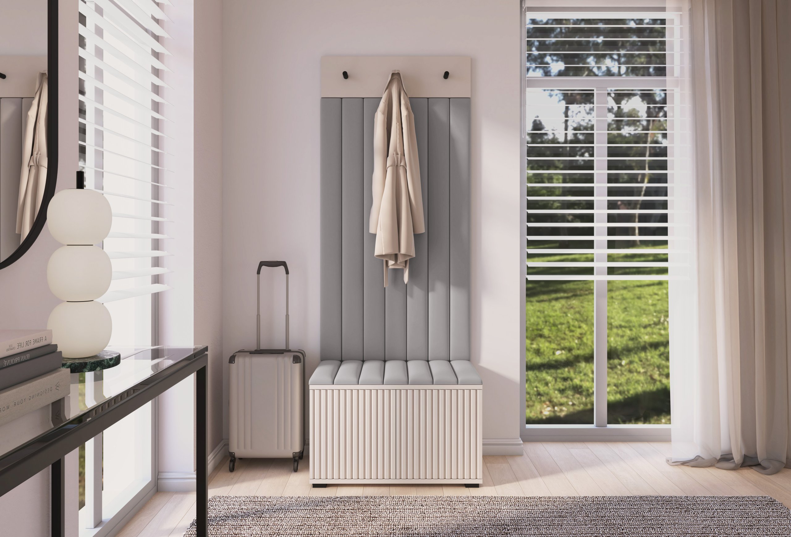 Komplet za hodnik Rayo 6 – PKMebel spaja eleganciju, funkcionalnost i kvalitetnu izradu. U boji cashmere i s tekstilnim panelima Trinity 02 vaše će predsoblje postati uredan, ugodan i privlačan prostor. S promišljenom kombinacijom materijala, jednostavnim otvaranjem i stabilnom konstrukcijom, ovaj komplet predstavlja idealan izbor za sve koji žele moderan, praktičan i estetski dovršen hodnik.