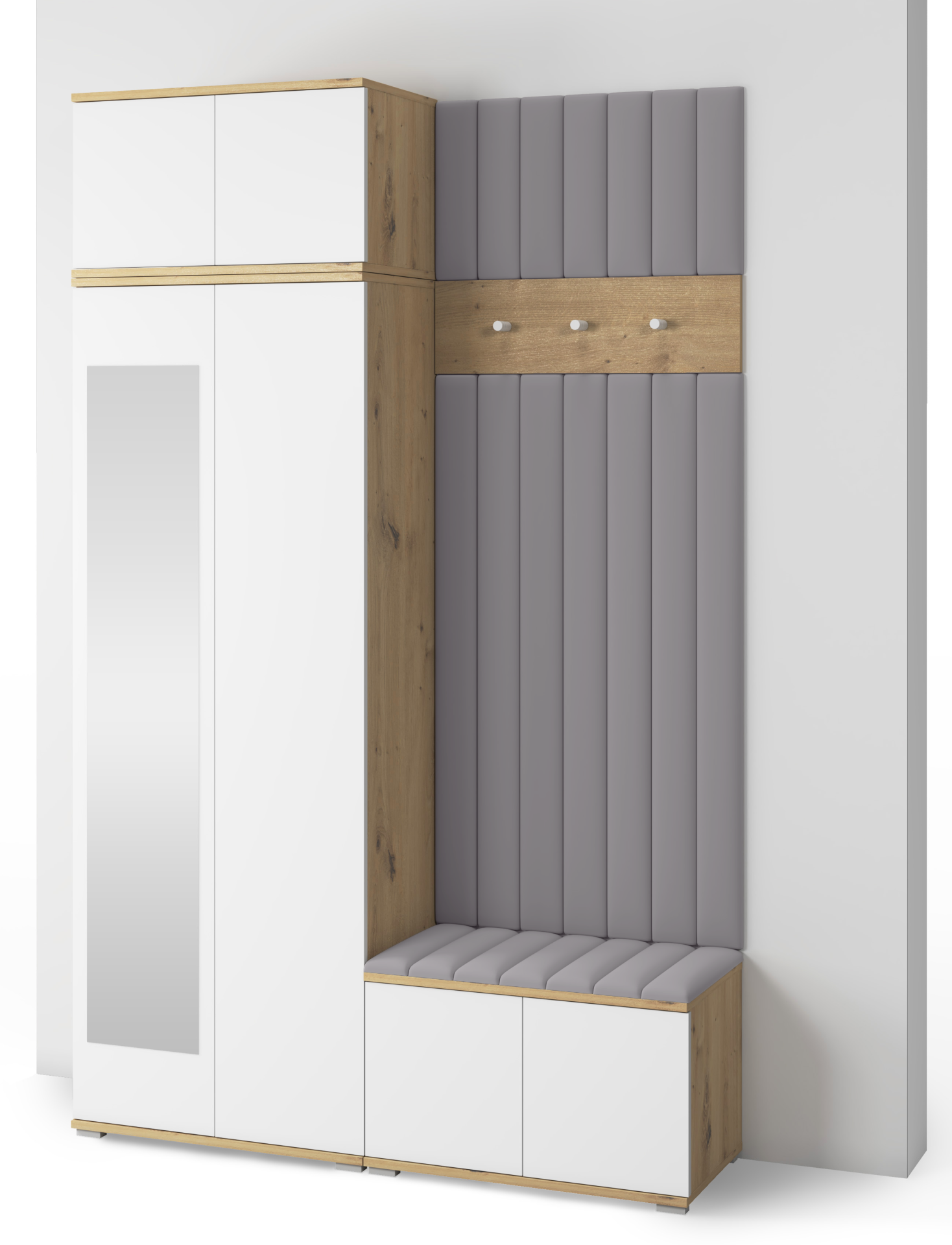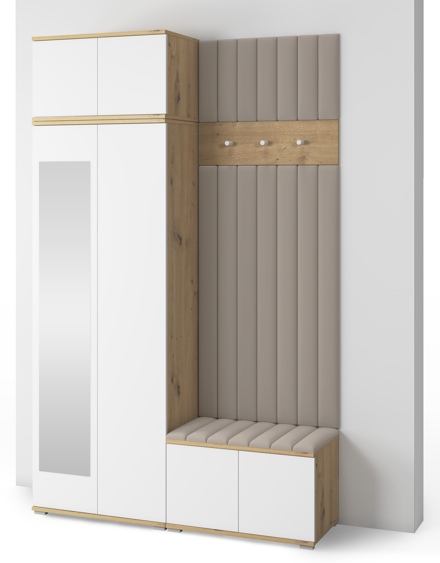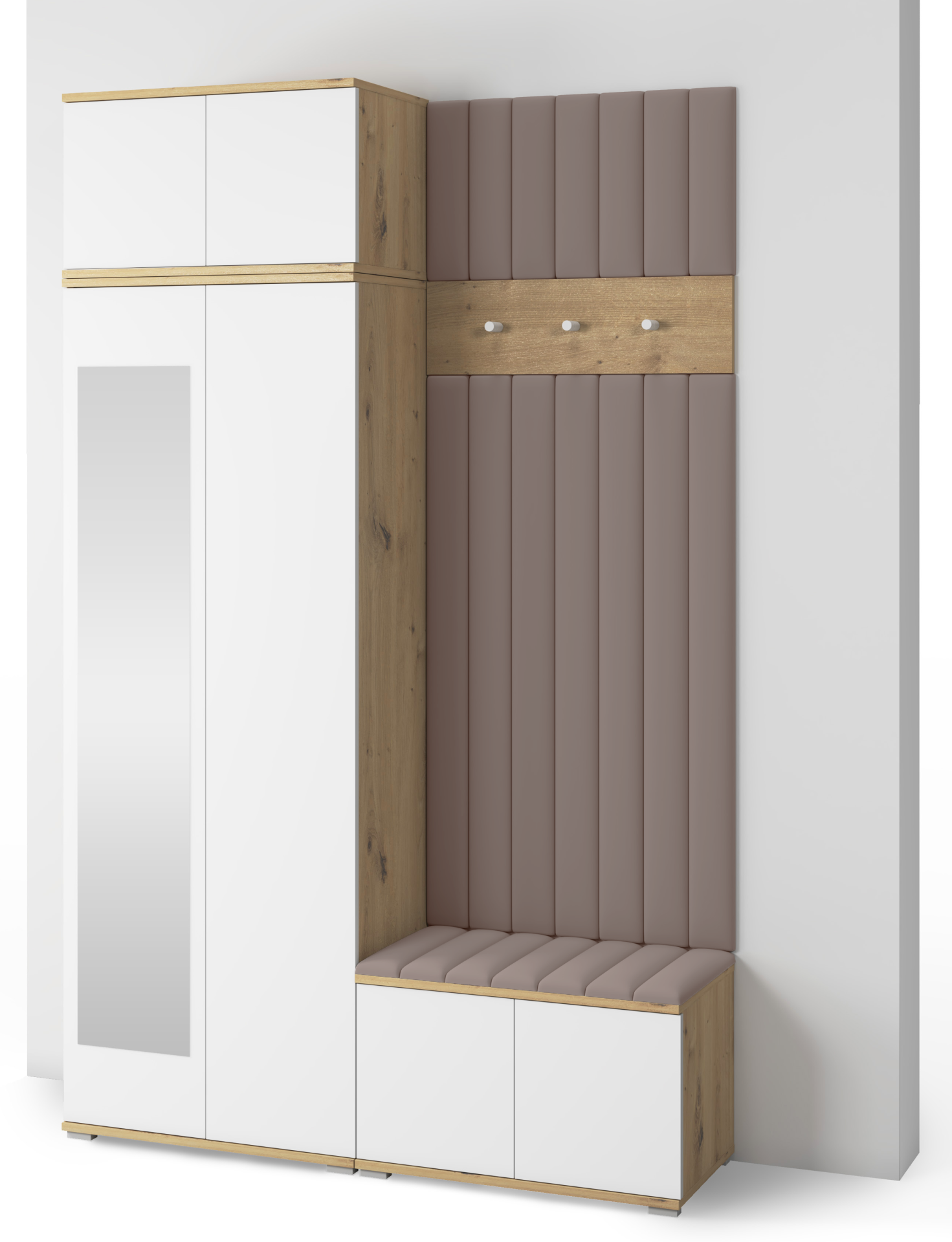 Korpus u nijansi hrasta artisan ističe prirodni karakter prostora, dok bijele fronte vizualno proširuju hodnik i dodaju mu svježinu. Minimalistički izgled bez ručki, koji omogućuje sustav otvaranja na pritisak, pridonosi suvremenoj estetici i jednostavnoj upotrebi. Za stabilnost i lakoću konstrukcije brinu plastične nogice u srebrnoj boji, visoke 2 cm, koje ujedno omogućuju lakše čišćenje poda ispod namještaja.