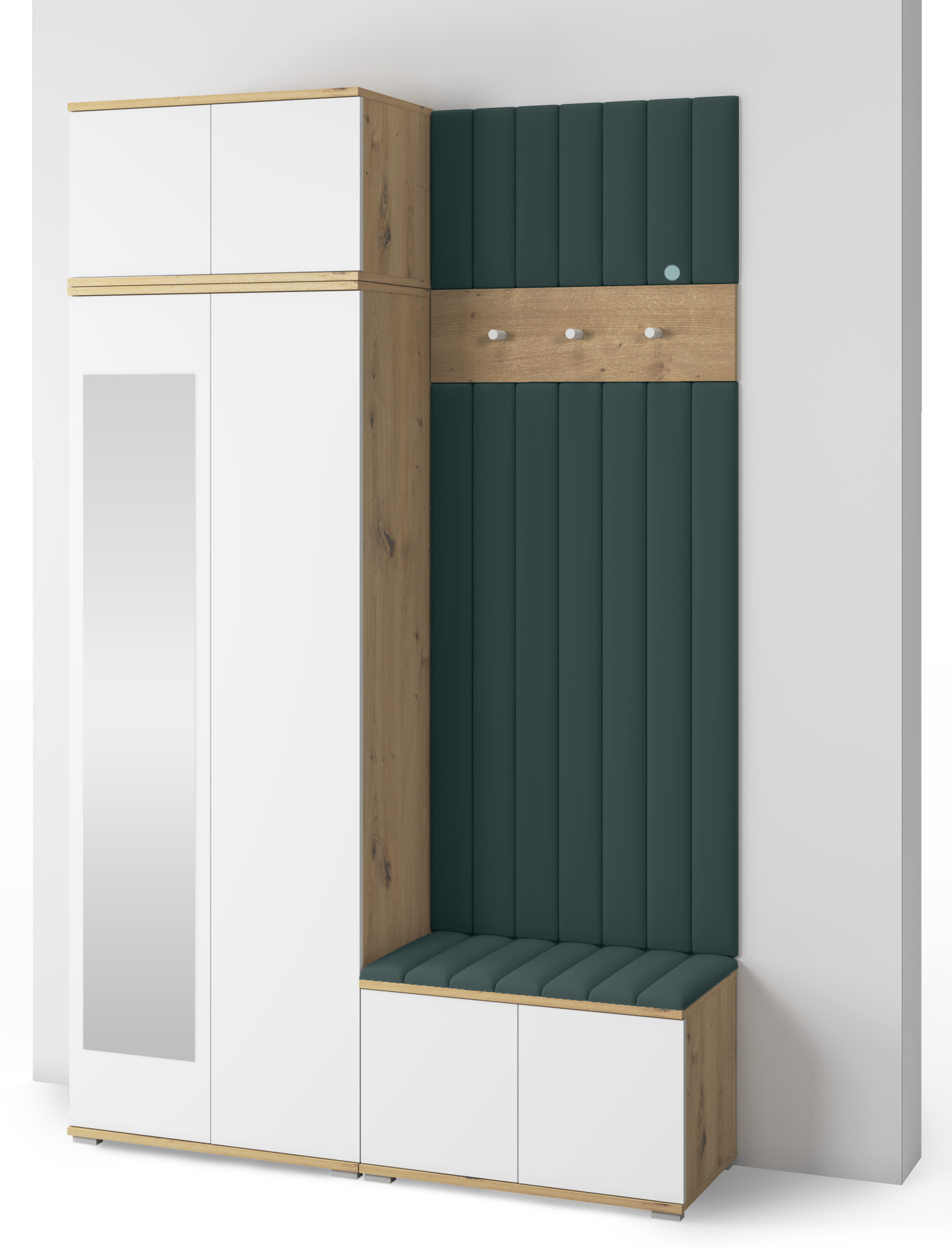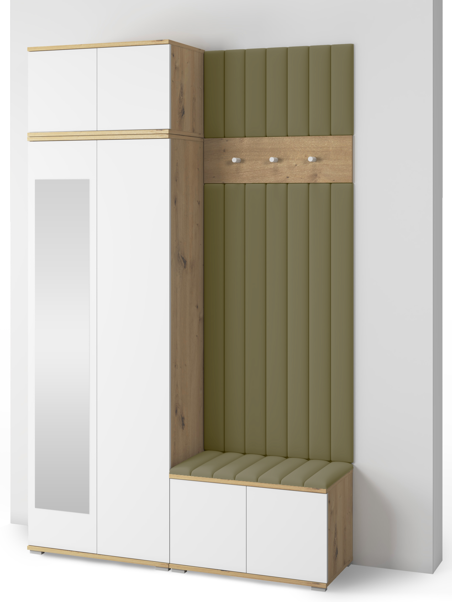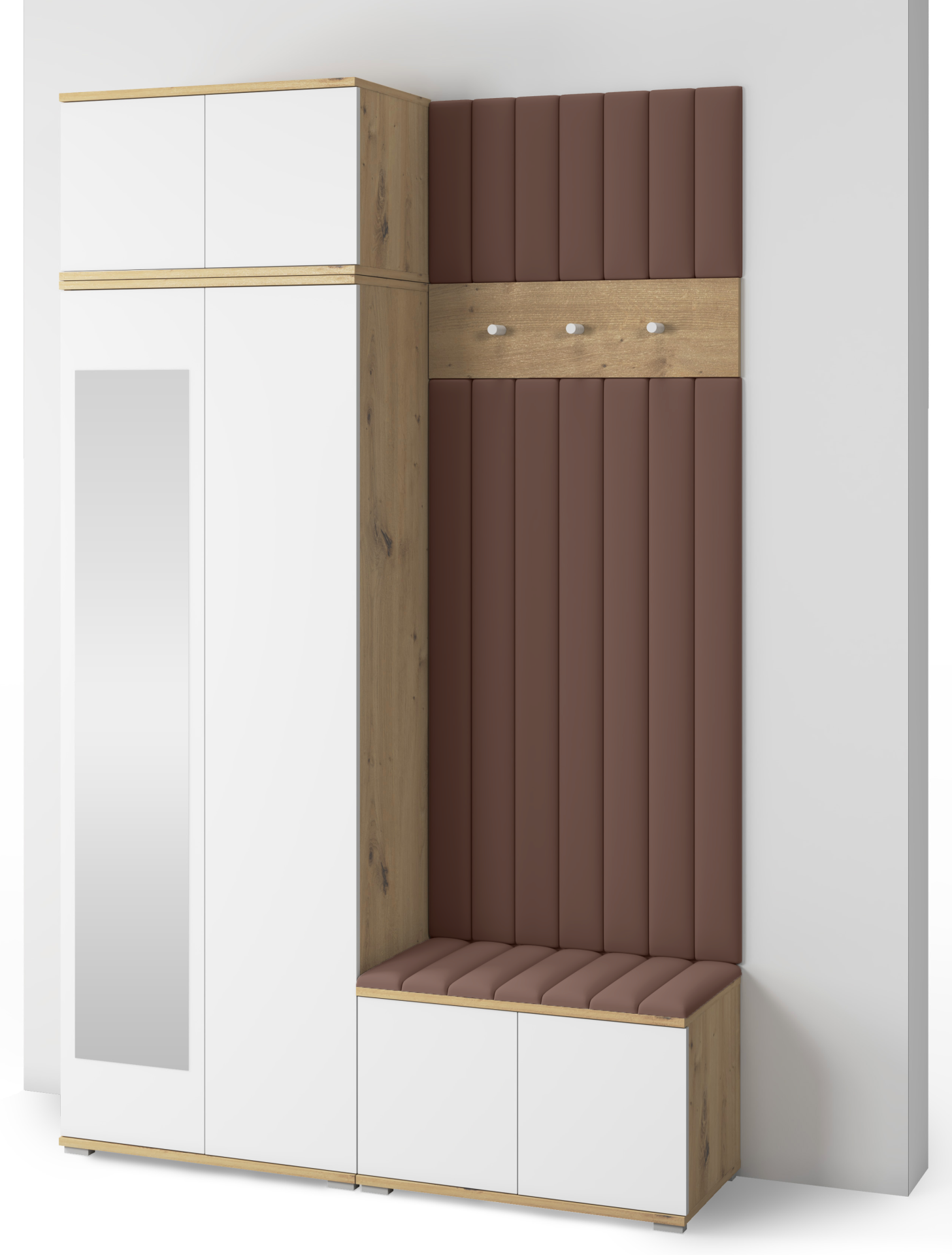 Korpus u nijansi hrasta artisan ističe prirodni karakter prostora, dok bijele fronte vizualno proširuju hodnik i dodaju mu svježinu. Minimalistički izgled bez ručki, koji omogućuje sustav otvaranja na pritisak, pridonosi suvremenoj estetici i jednostavnoj upotrebi. Za stabilnost i lakoću konstrukcije brinu plastične nogice u srebrnoj boji, visoke 2 cm, koje ujedno omogućuju lakše čišćenje poda ispod namještaja.