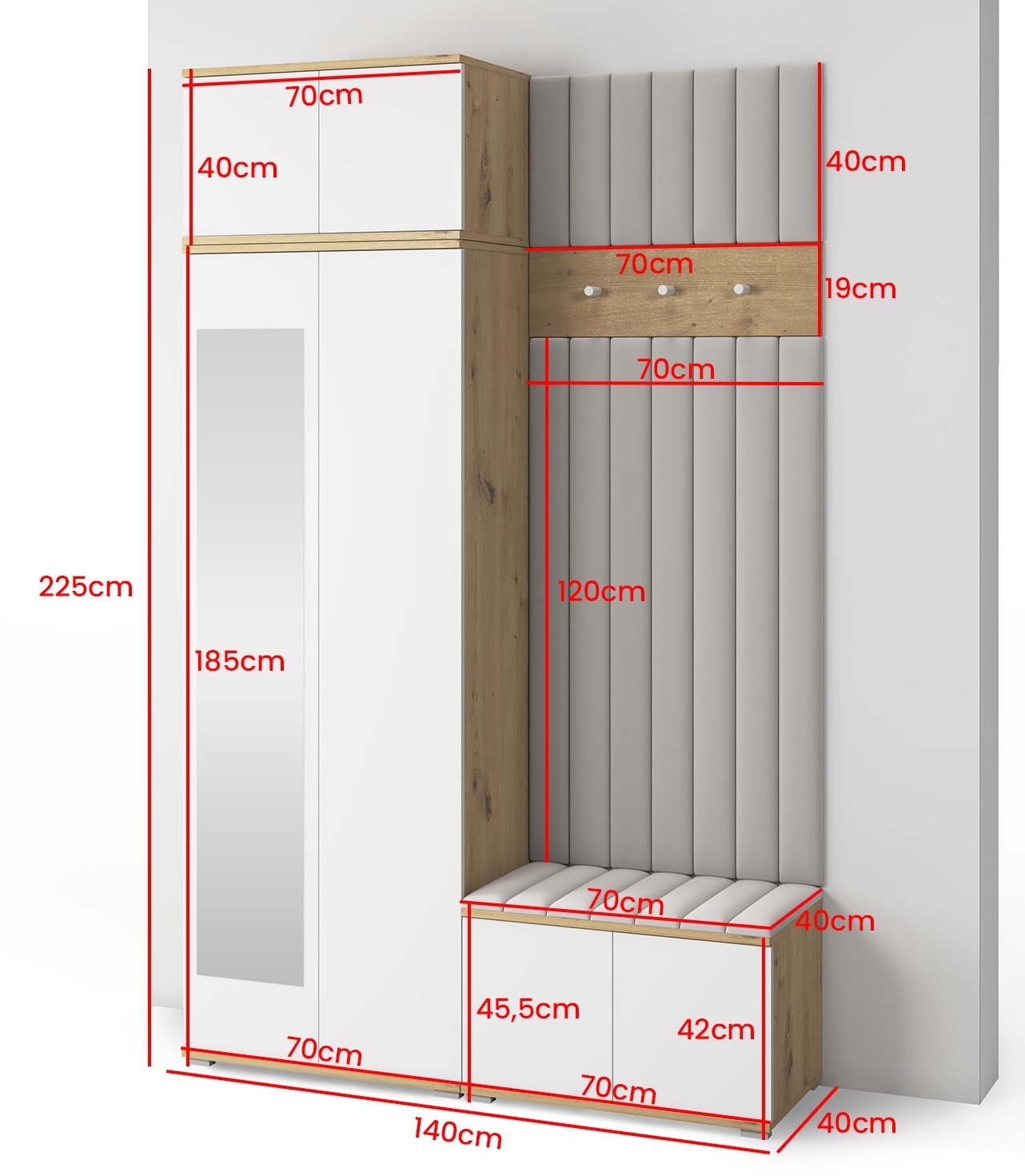 Cijeli komplet sa svojim dimenzijama 140x40x225 cm omogućuje optimalno prilagođavanje različitim tlocrtima hodnika. Omogućuje postavljanje uz glavni zid, gdje sve komponente mogu djelovati kao cjelina, ili modularno raspoređivanje pojedinih dijelova prema potrebama prostora. Visina od 225 cm osigurava dovoljno prostora za vješanje duže odjeće, dok širina i dubina nude dovoljno površina za pohranu, a da pritom vizualno ne opterete prostor.
