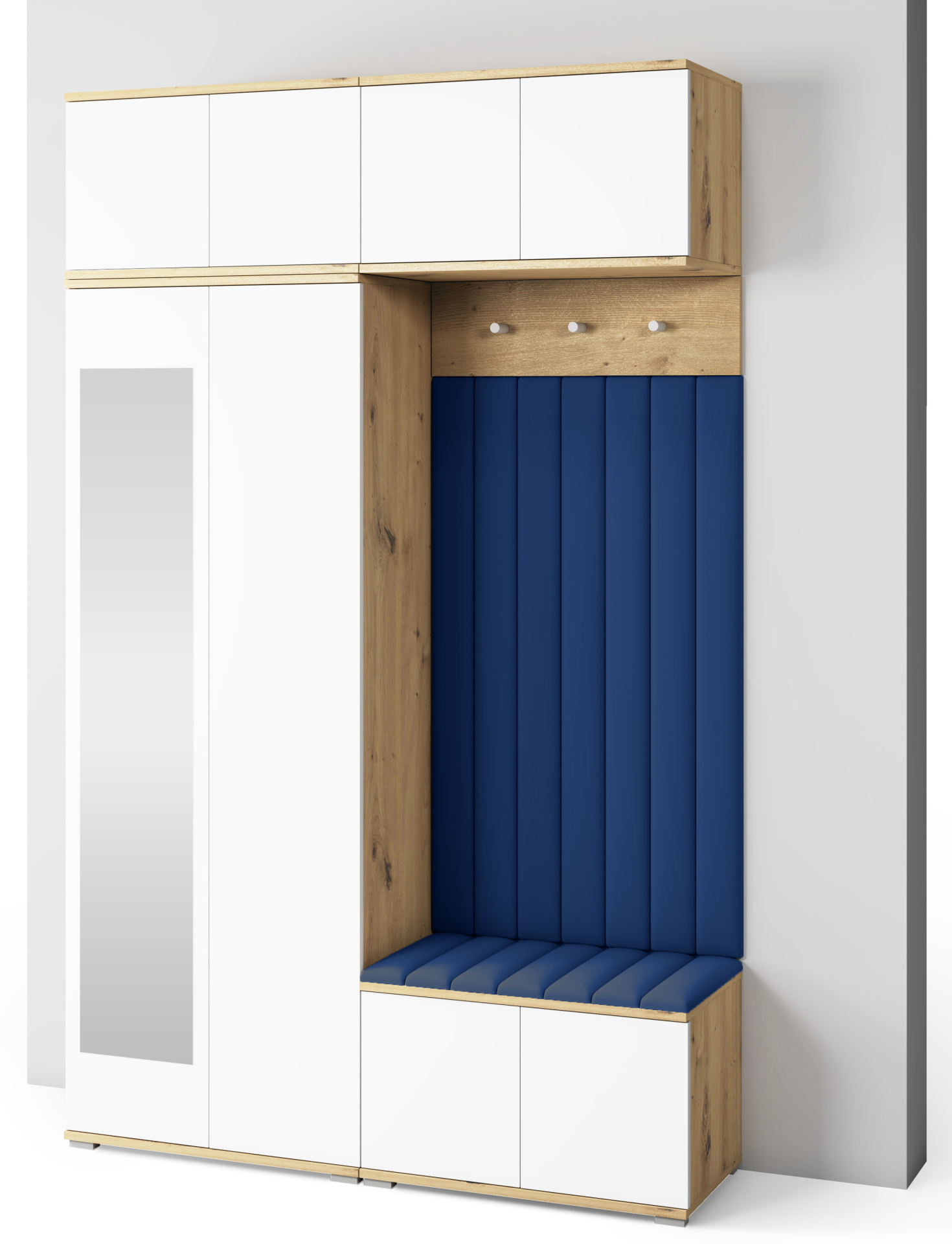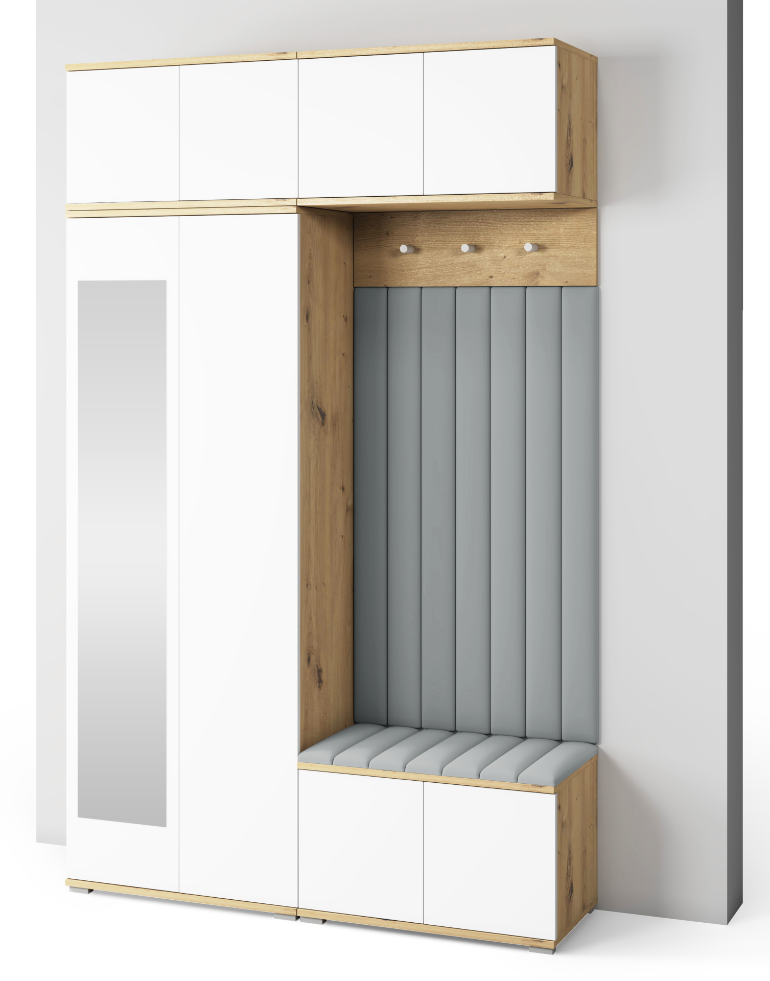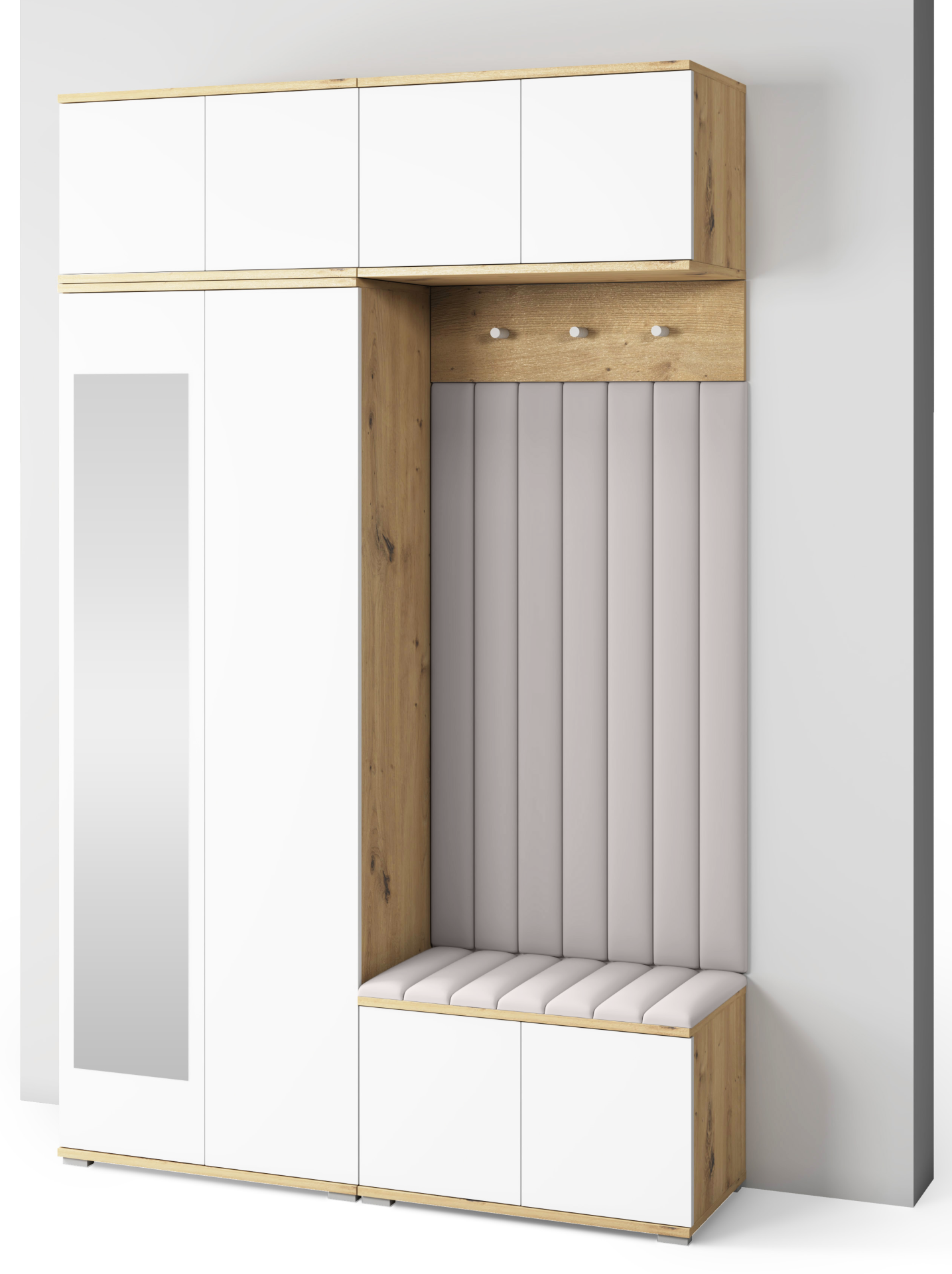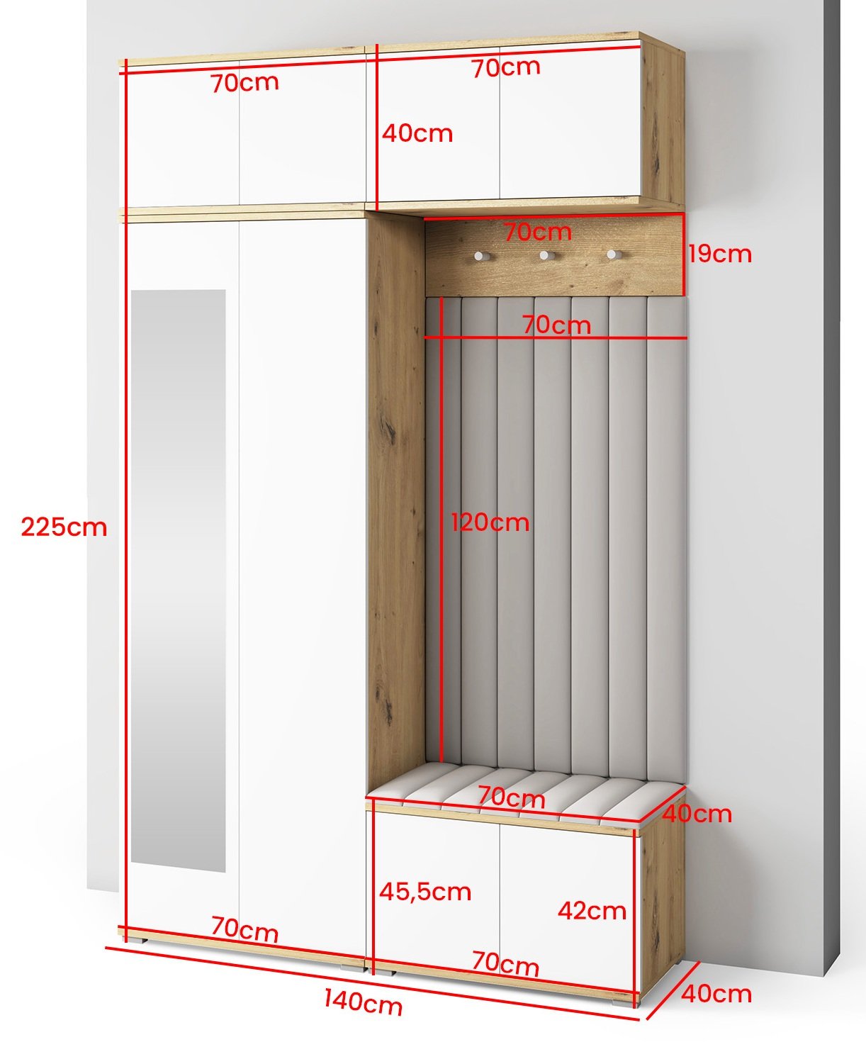 Komplet za hodnik Sevilla 9 marke PKMebel spaja moderan dizajn, praktičnost i kvalitetnu izradu. Svojim dimenzijama 140x40x225 cm prikladan je za većinu hodnika, gdje nudi dovoljno prostora za pohranu i uredan izgled. Kombinacija korpusa u boji hrasta artisan i bijelih fronti stvara svijetao, topao i istovremeno elegantan dojam, koji se lijepo uklapa u različite unutarnje stilove – od modernog minimalizma do klasične topline domaćeg ambijenta.