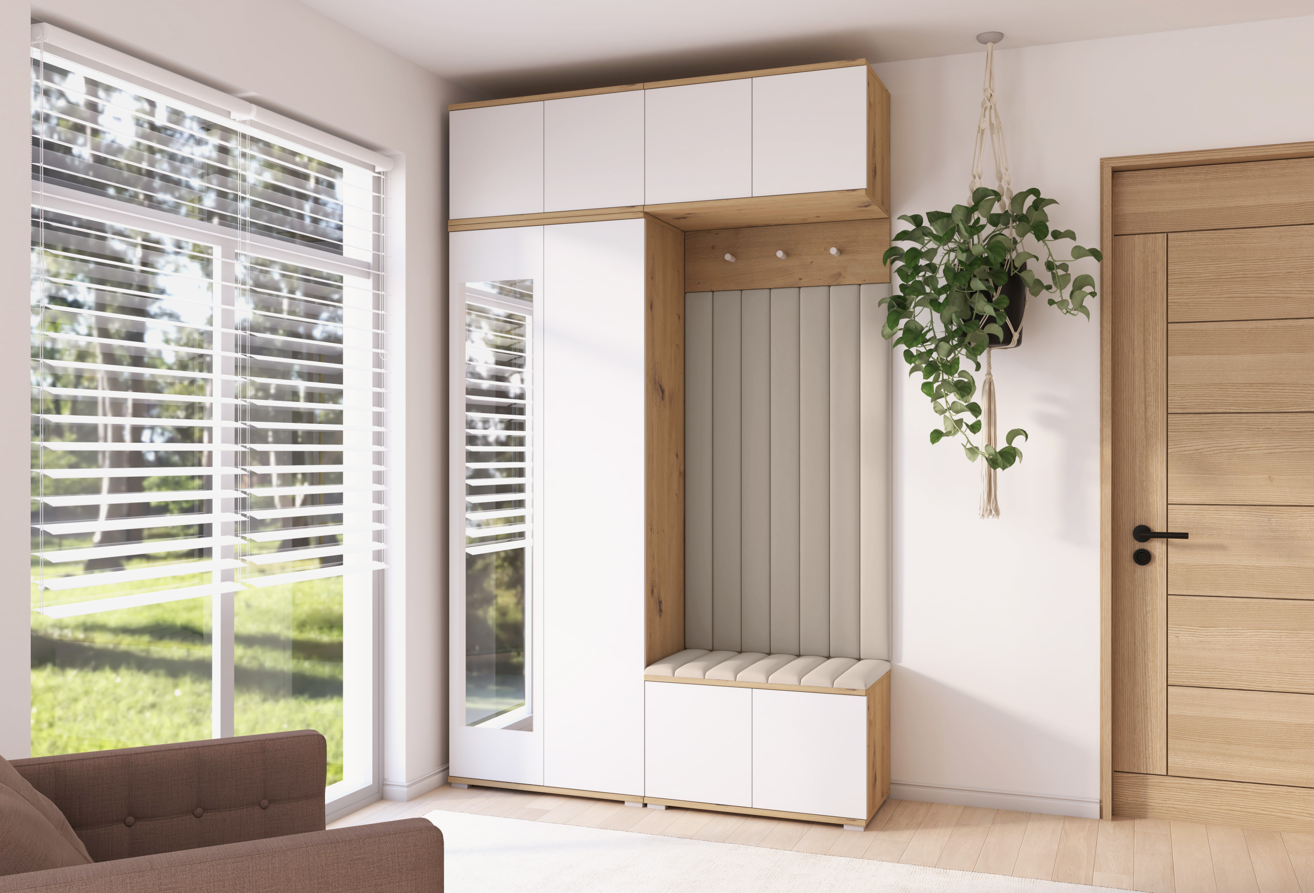 Kombinacija hrasta artisan i bijele boje aktualna je i bezvremenska. Svijetle fronte vizualno povećavaju prostor, dok topli tonovi drva dodaju osjećaj domaćeg ugođaja. Takva kombinacija boja lako se usklađuje s različitim podnim oblogama i dodacima, pa je komplet Sevilla 9 izvrstan izbor za svaki moderan hodnik.