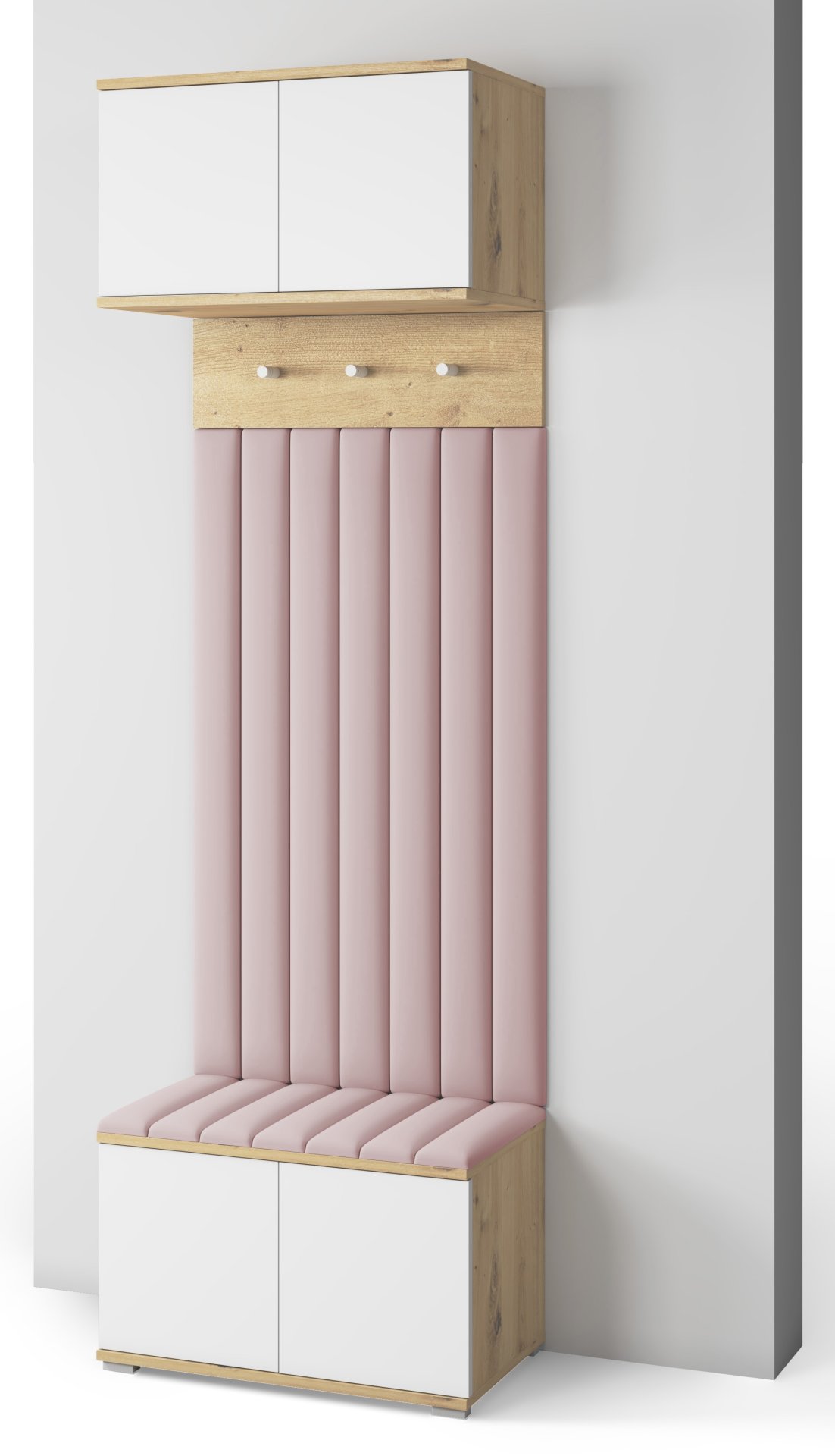 Kombinacija hrasta artisan i bijele boje stvara uravnotežen kontrast koji se lijepo uklapa u brojne stilove uređenja – od minimalističkog do skandinavskog ili modernog. Bijela boja vizualno povećava prostor, dok topli tonovi hrasta donose osjećaj domaćeg ugođaja. Tapecirane ploče dodaju teksturu i vizualnu razigranost, pa komplet nije samo praktičan, već i dekorativan element prostora.