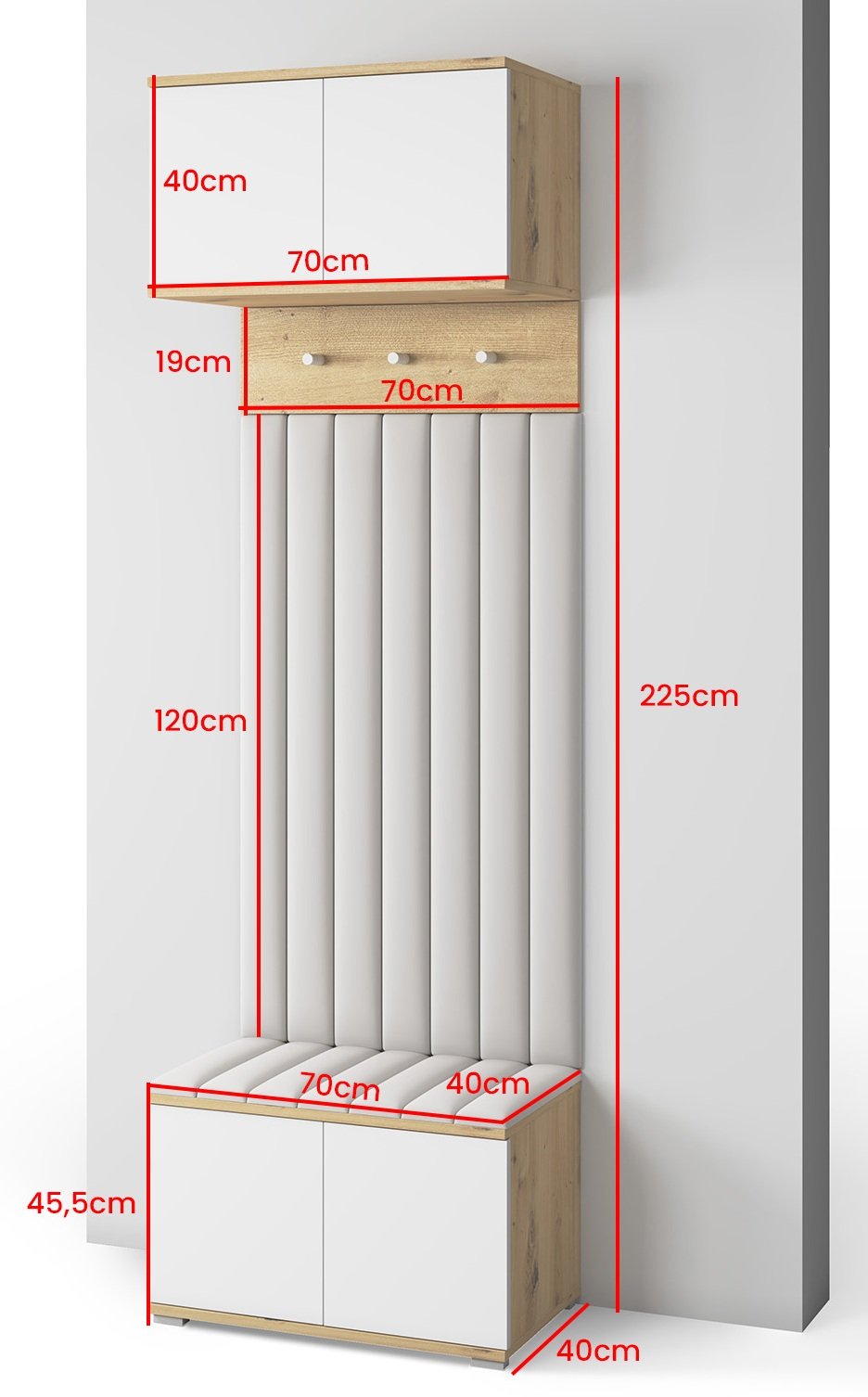 Dimenzije su osmišljene tako da omogućuju učinkovito iskorištavanje prostora, bez obzira na veličinu hodnika. Visina od 225 cm omogućuje dovoljno prostora za pohranu, dok dubina od 40 cm osigurava da komplet ne zauzima previše mjesta u prolaznom dijelu doma.