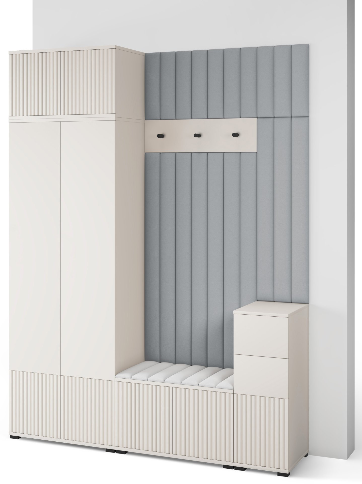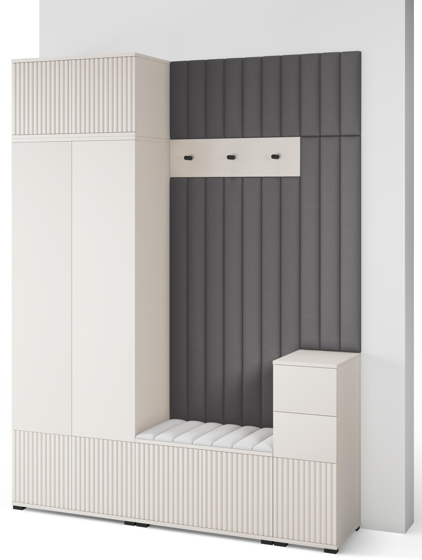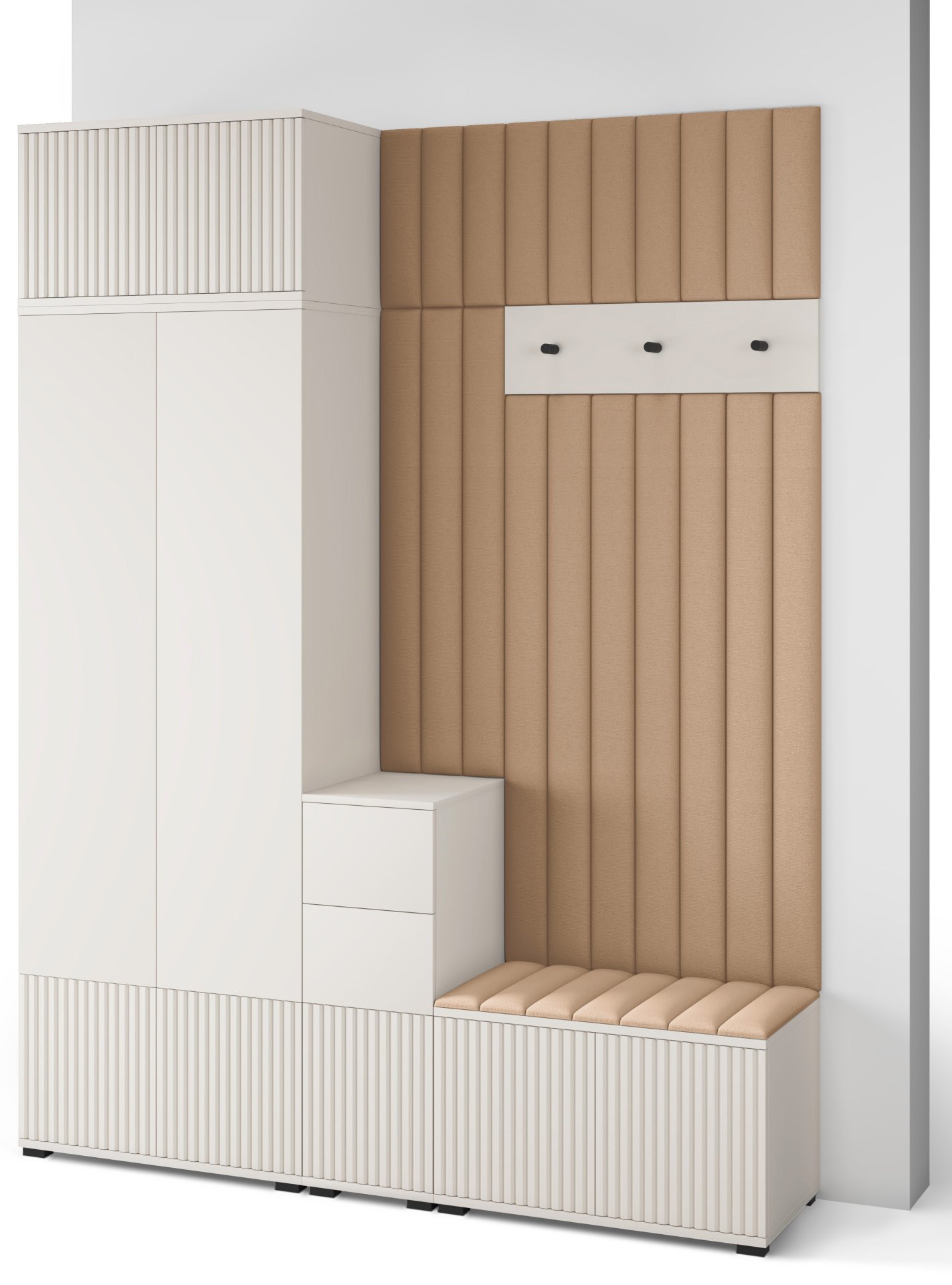 Posebnost kompleta Rayo 8 su dekorativni tapecirani paneli u nježnoj nijansi tkanine Trinity 02. Paneli se postavljaju izravno na zid ili na ormar pomoću ljepila, što omogućuje brzu i čistu montažu. Osim estetske funkcije, osiguravaju i djelomičnu zvučnu izolaciju te poboljšavaju akustiku prostora. Zbog meke površine praktični su i kao zaštita zida od habanja ili kao udoban naslon pri obuvanju.