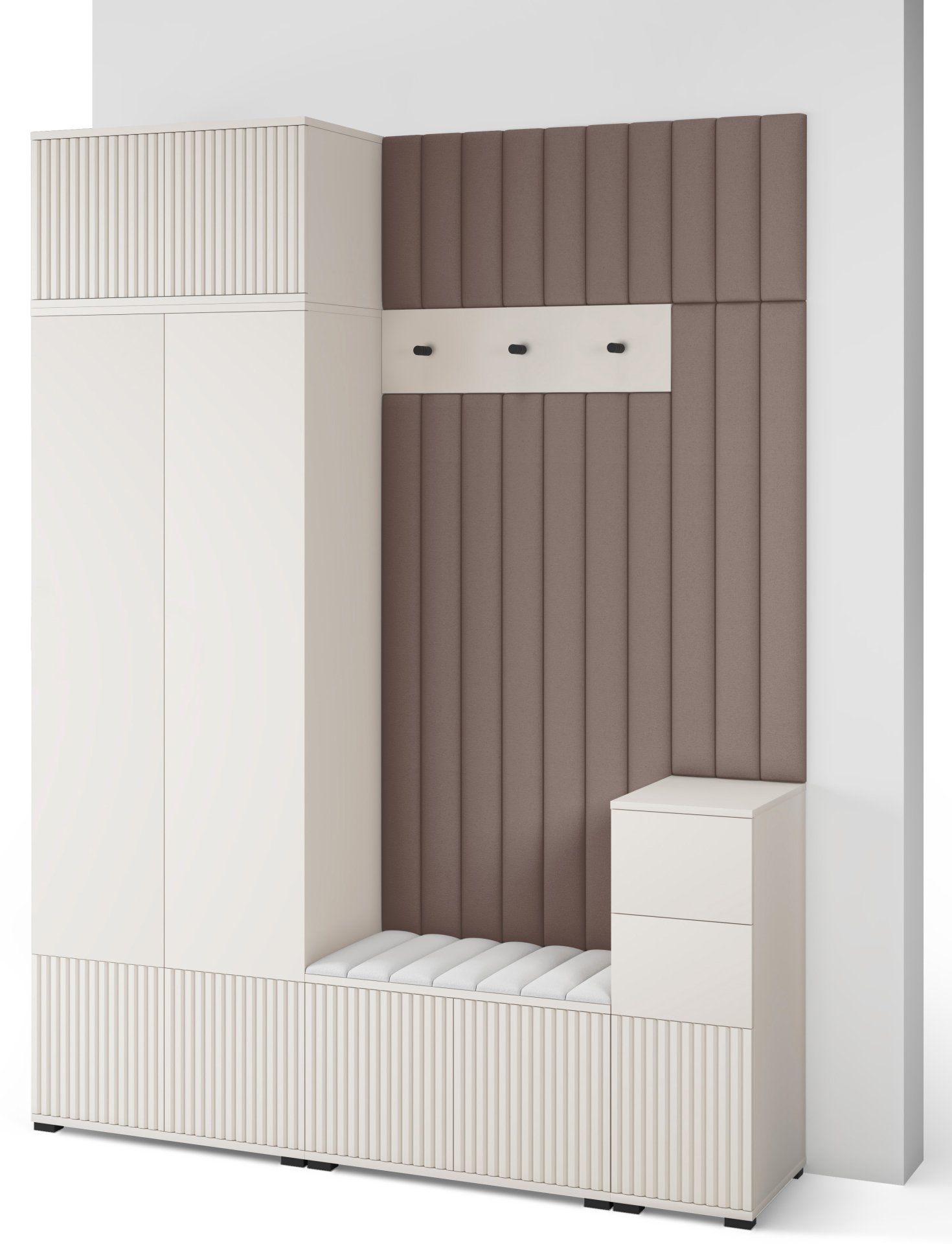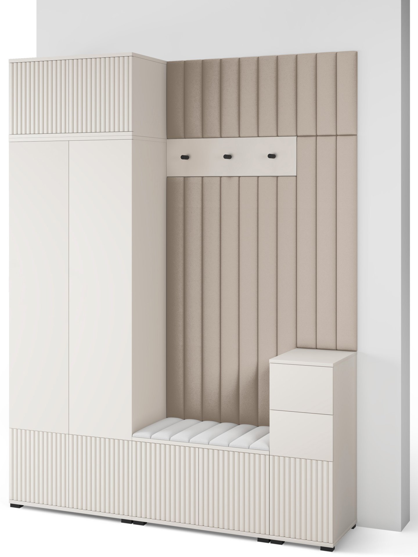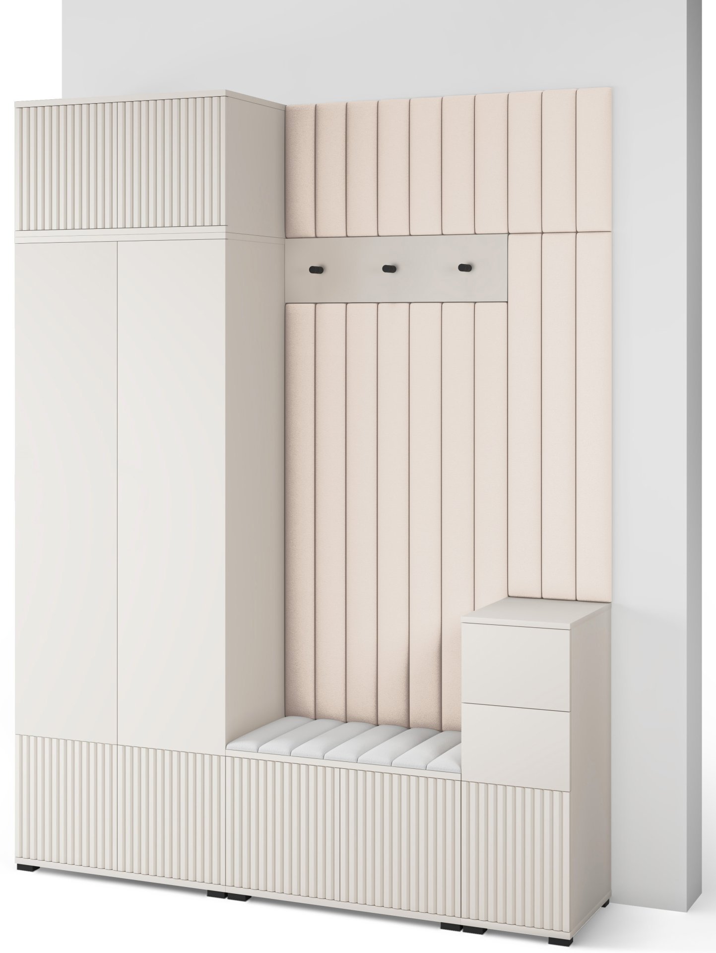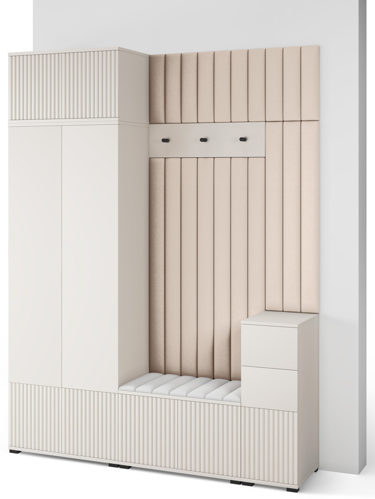 Posebnost kompleta Rayo 8 su dekorativni tapecirani paneli u nježnoj nijansi tkanine Trinity 02. Paneli se postavljaju izravno na zid ili na ormar pomoću ljepila, što omogućuje brzu i čistu montažu. Osim estetske funkcije, osiguravaju i djelomičnu zvučnu izolaciju te poboljšavaju akustiku prostora. Zbog meke površine praktični su i kao zaštita zida od habanja ili kao udoban naslon pri obuvanju.