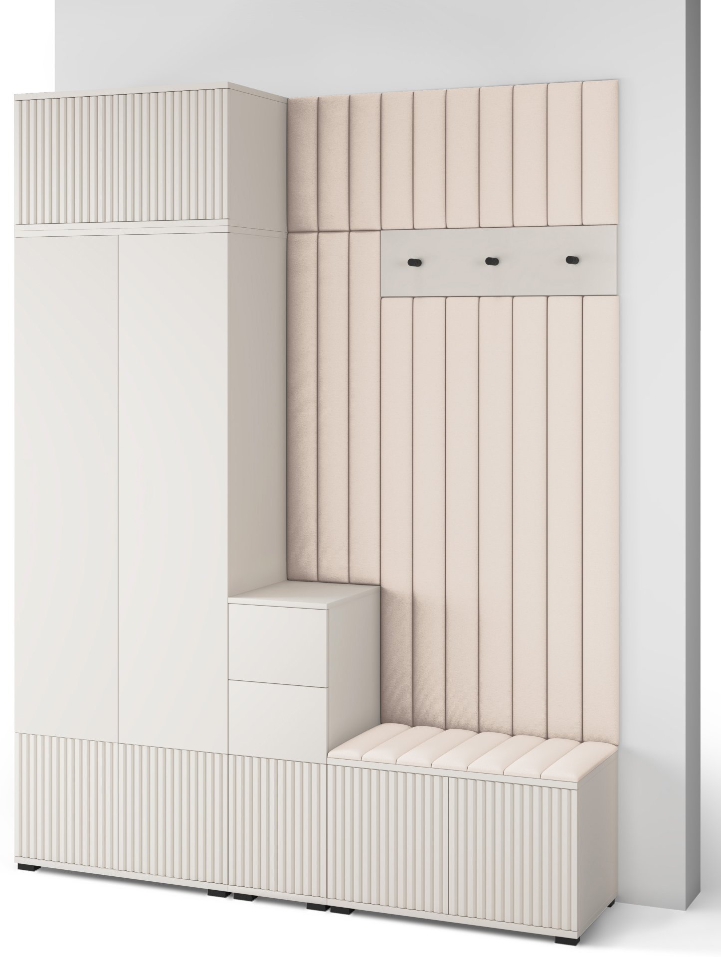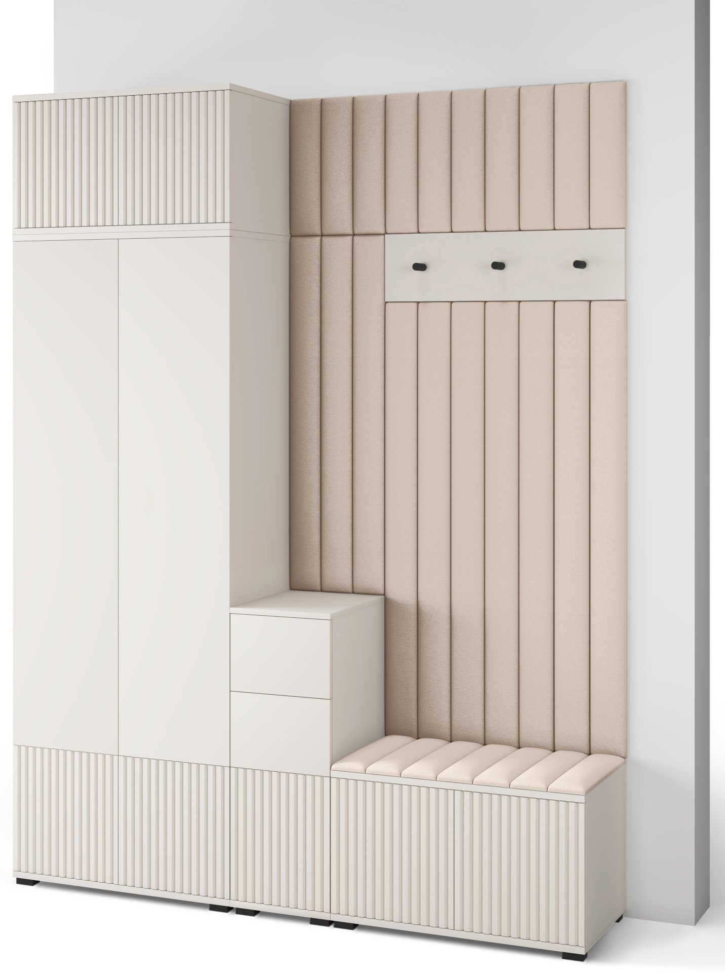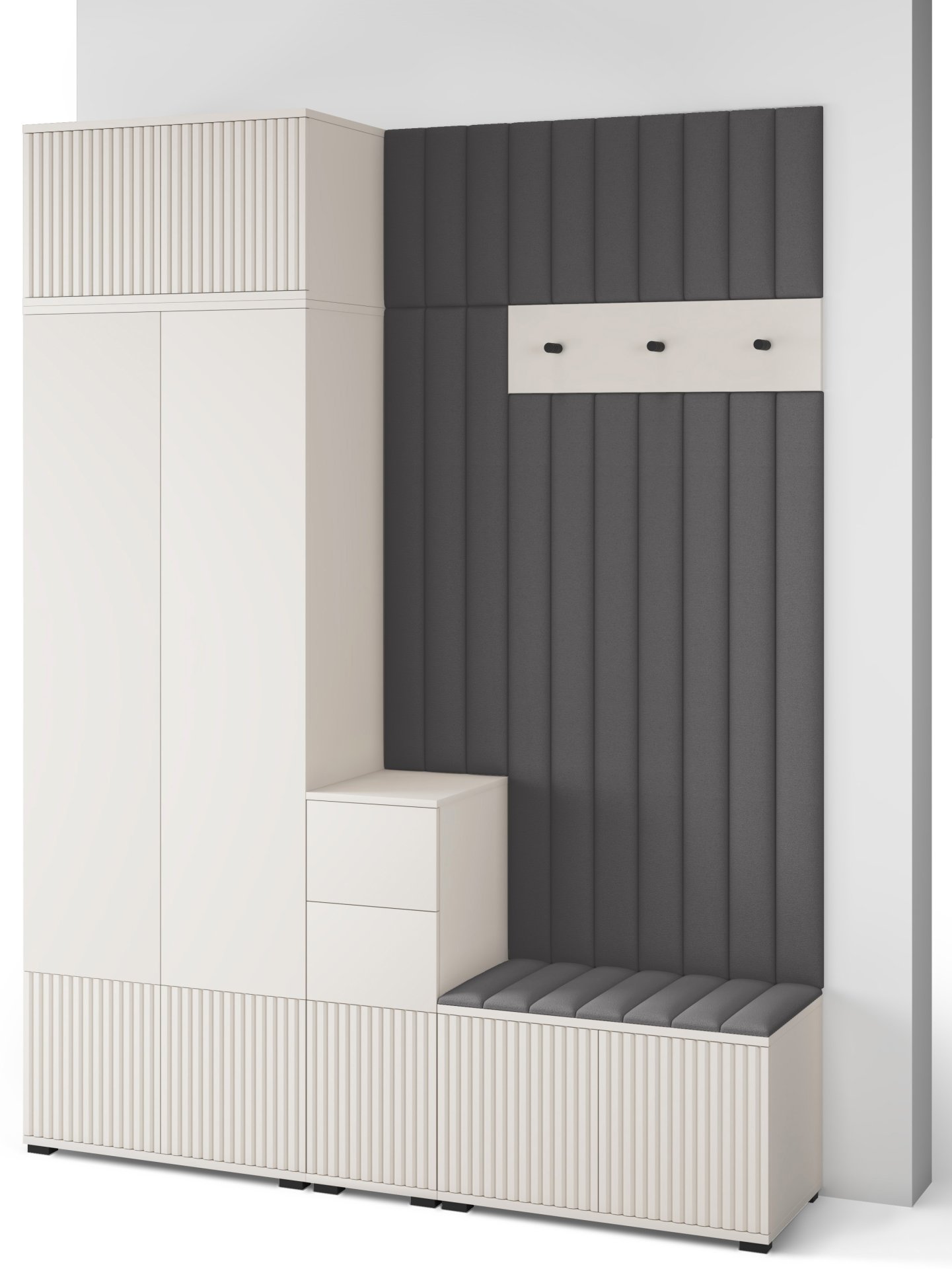 Komplet Rayo 8 osmišljen je tako da nudi sve što vam je potrebno za praktično i estetski dovršeno predsoblje. U njemu su spojeni elementi koji omogućuju učinkovito spremanje odjeće, obuće i dodataka, a istovremeno prostor vizualno povezuju u harmoničnu cjelinu. Meki tapecirani paneli u tkanini Trinity 02 dodaju toplinu i ugodan osjećaj na dodir, a ujedno služe kao dekorativni naglasak.