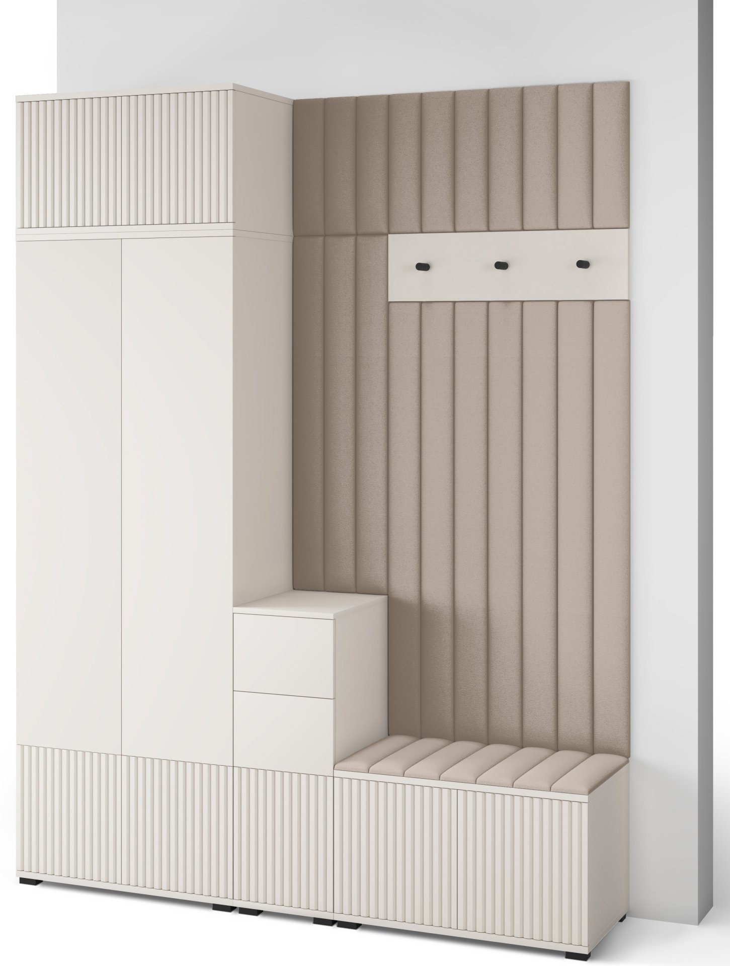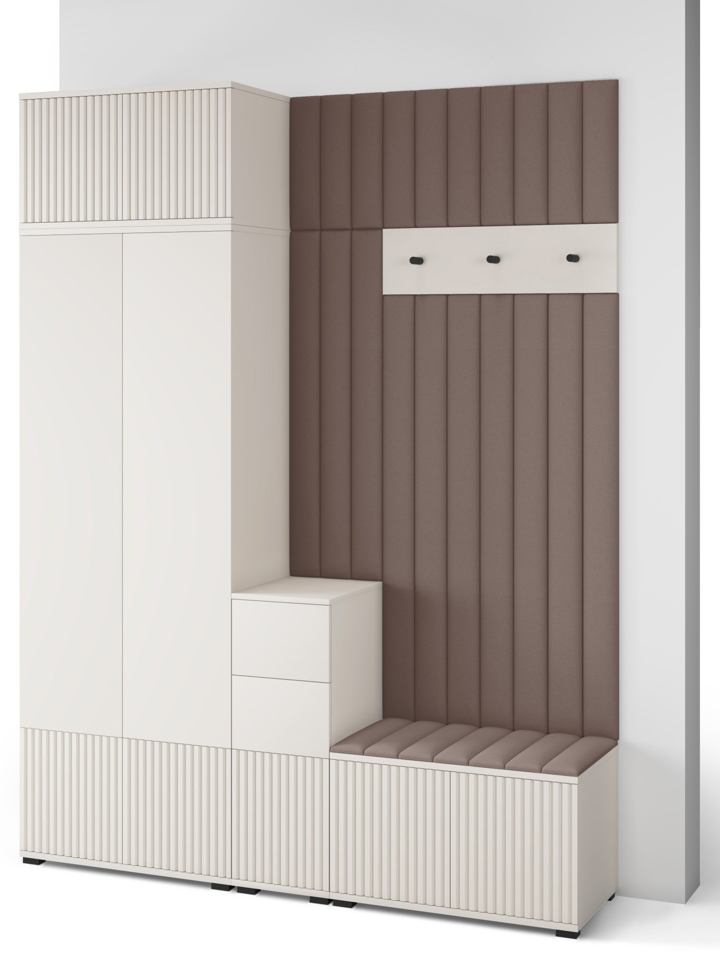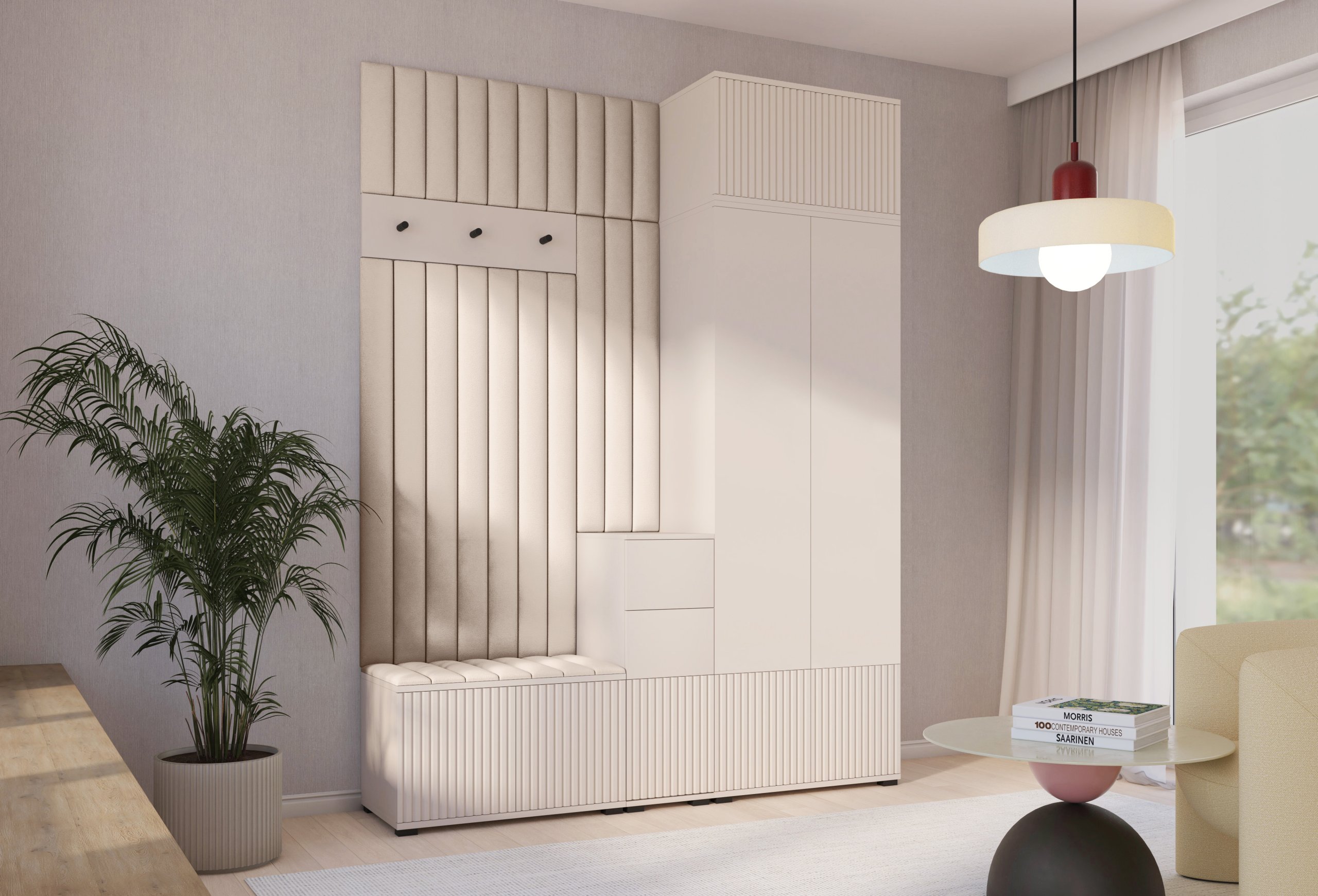 Komplet Rayo 8 osmišljen je tako da nudi sve što vam je potrebno za praktično i estetski dovršeno predsoblje. U njemu su spojeni elementi koji omogućuju učinkovito spremanje odjeće, obuće i dodataka, a istovremeno prostor vizualno povezuju u harmoničnu cjelinu. Meki tapecirani paneli u tkanini Trinity 02 dodaju toplinu i ugodan osjećaj na dodir, a ujedno služe kao dekorativni naglasak.