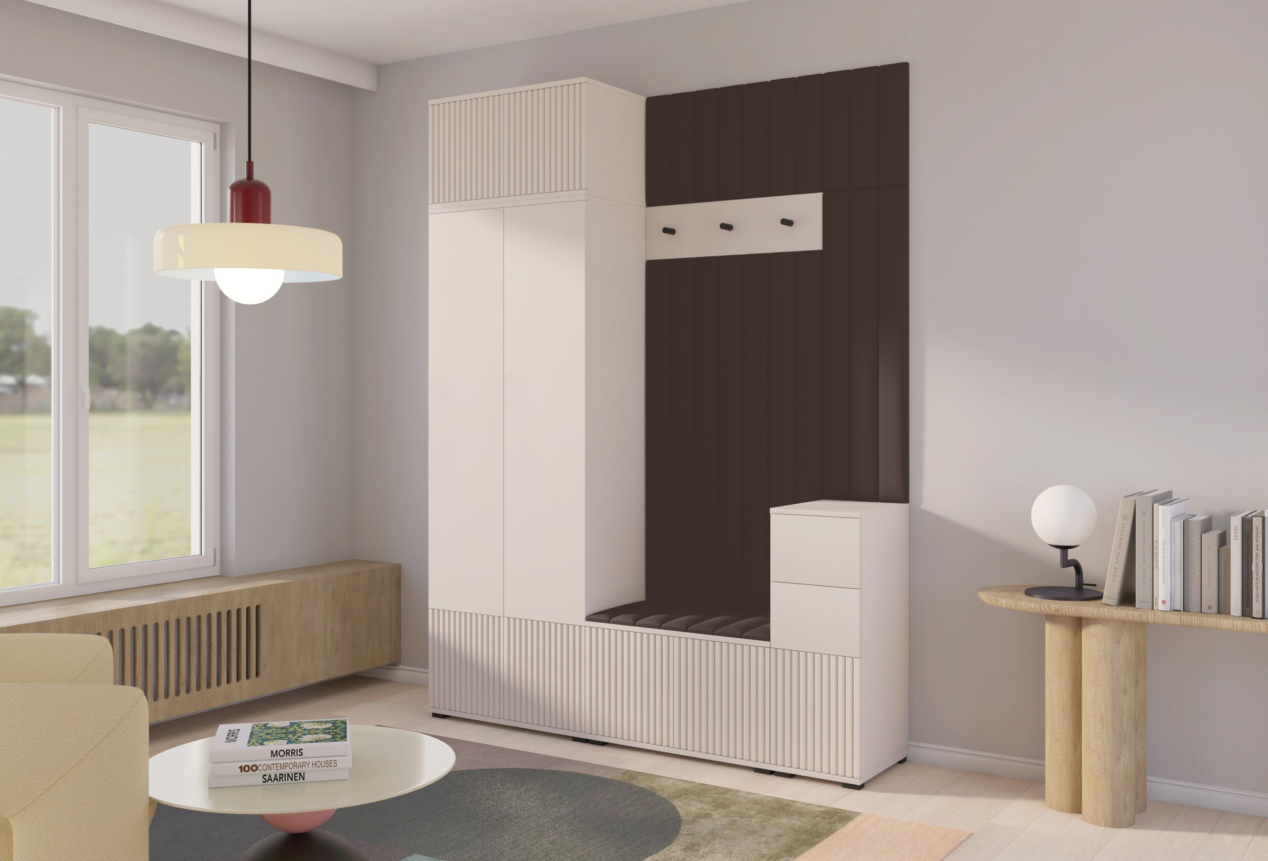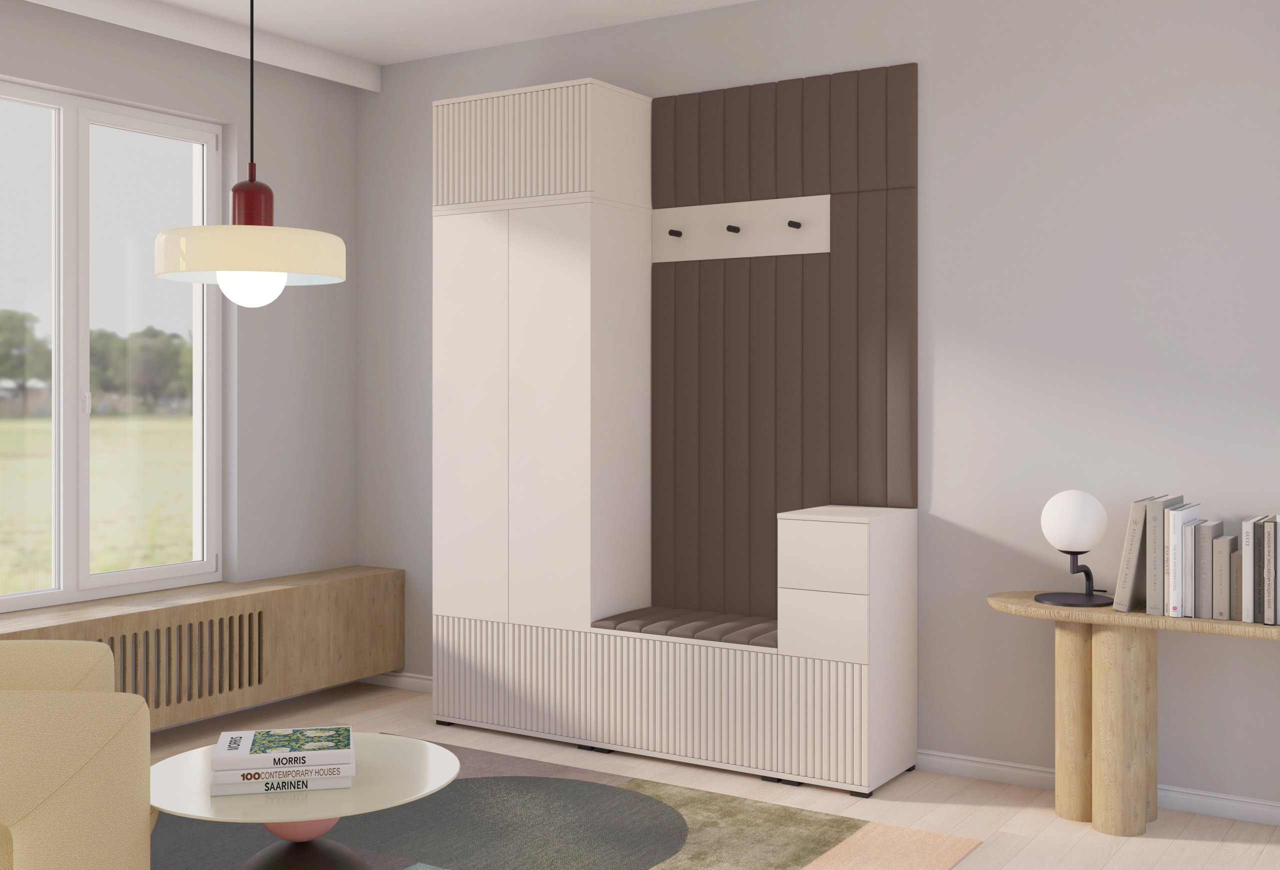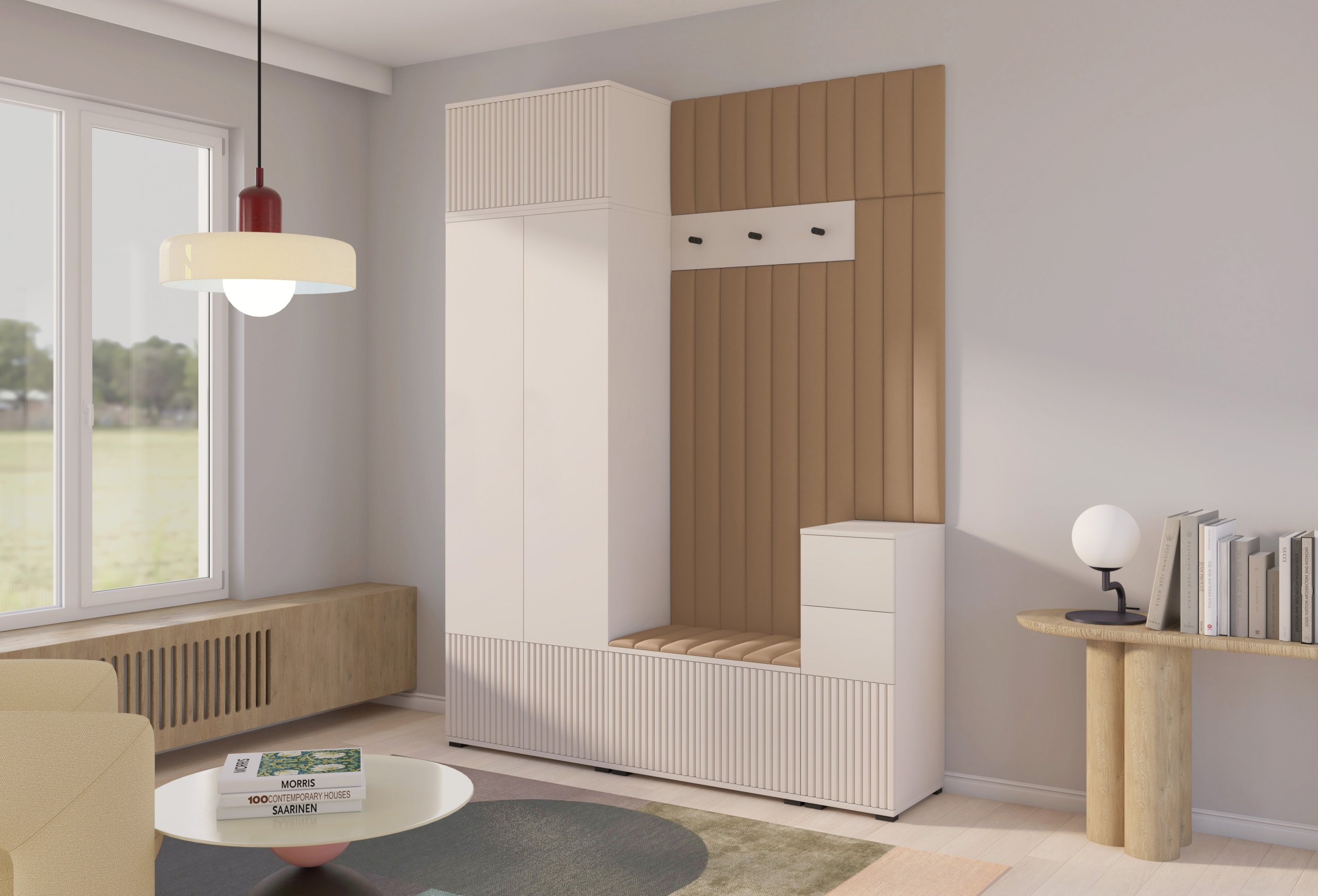Svi elementi zajedno stvaraju uravnotežen sastav koji spaja praktičnost i dekorativnu vrijednost. Tapecirani paneli u nježnoj nijansi Trinity dodaju prostoru mekoću te ugodan osjećaj pri ulasku u dom.